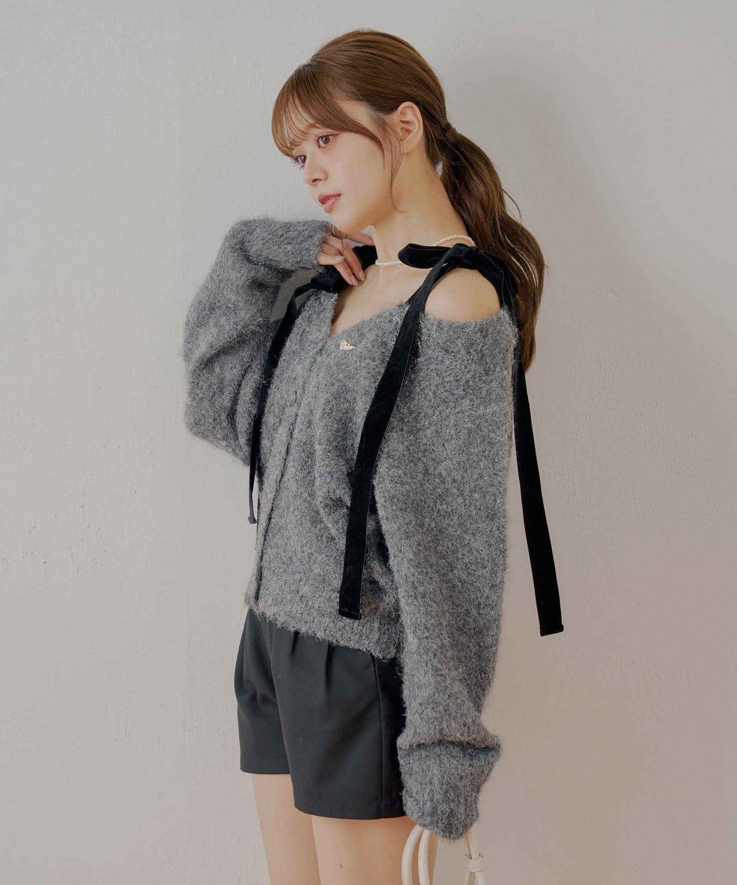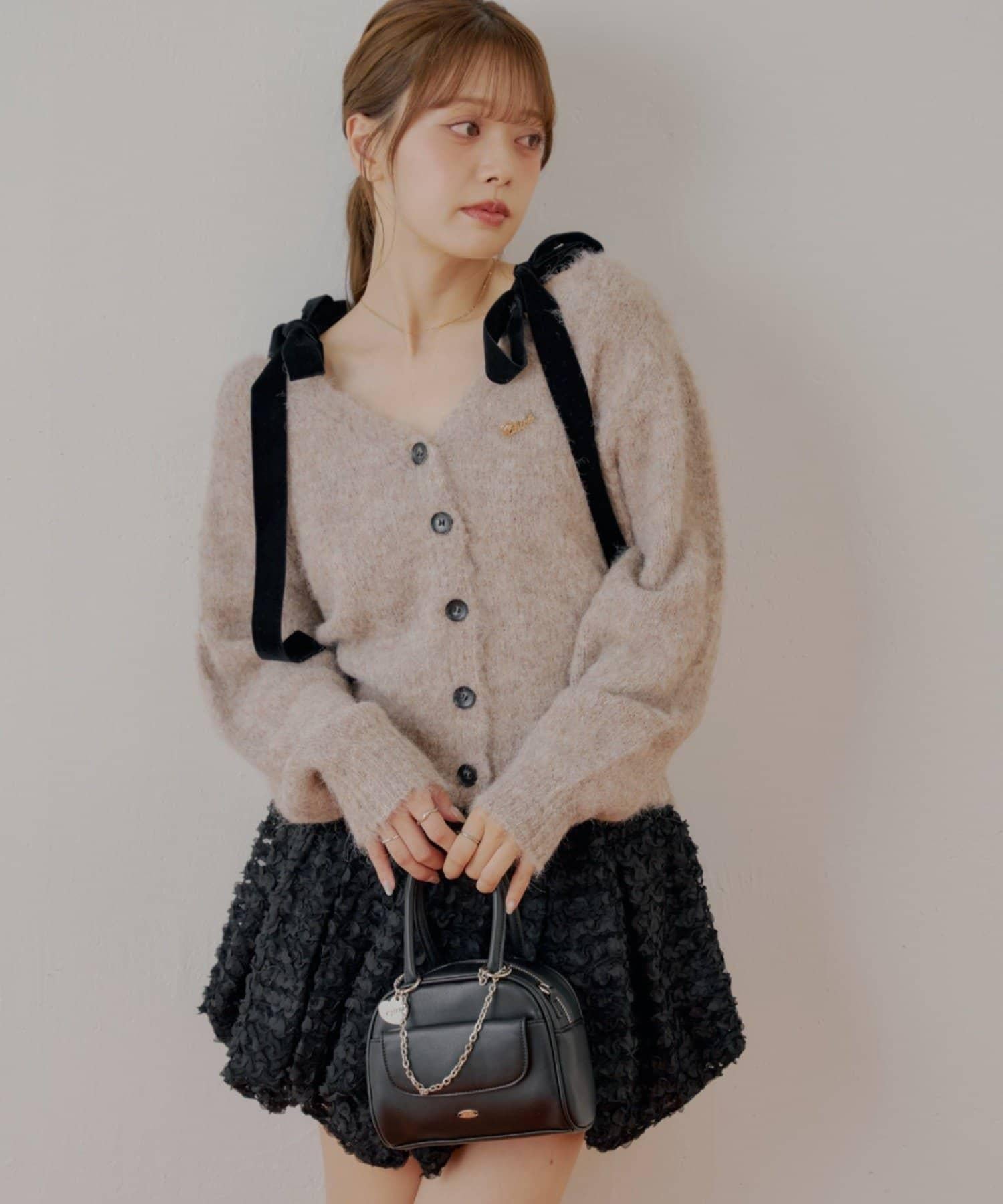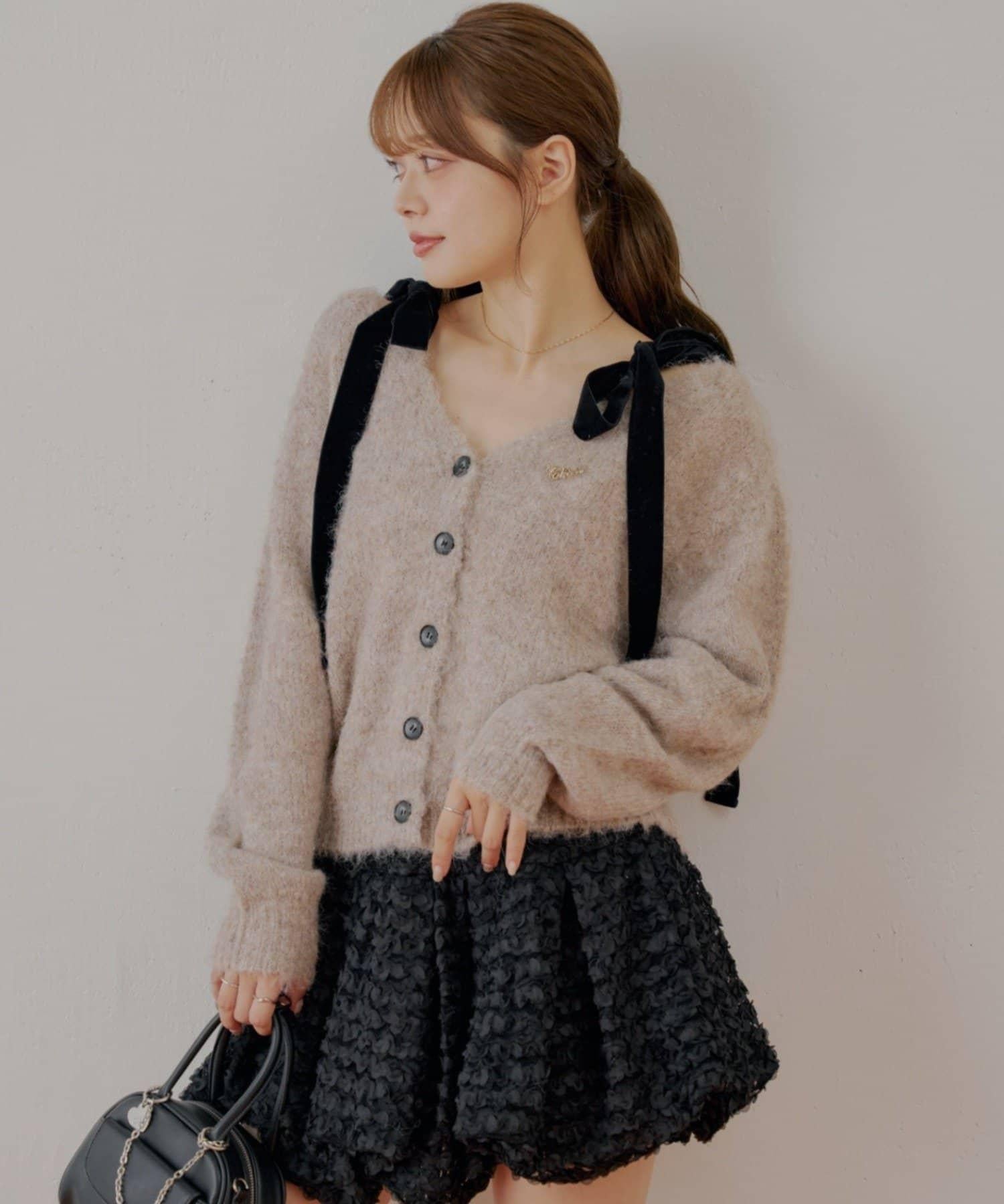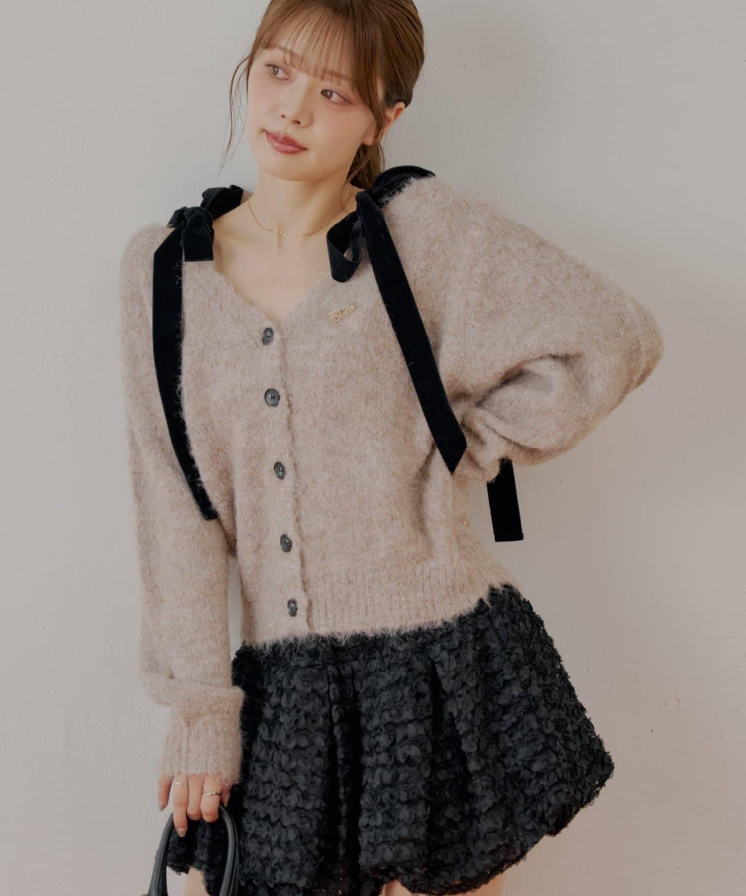 【可拆卸胸針】天鵝絨蝴蝶結寬鬆針織開衫