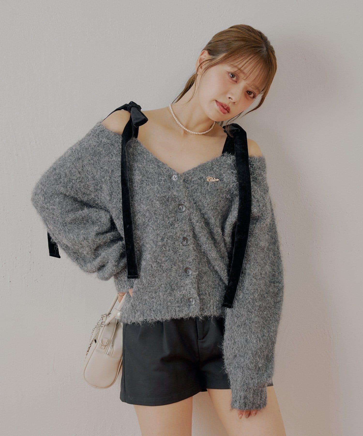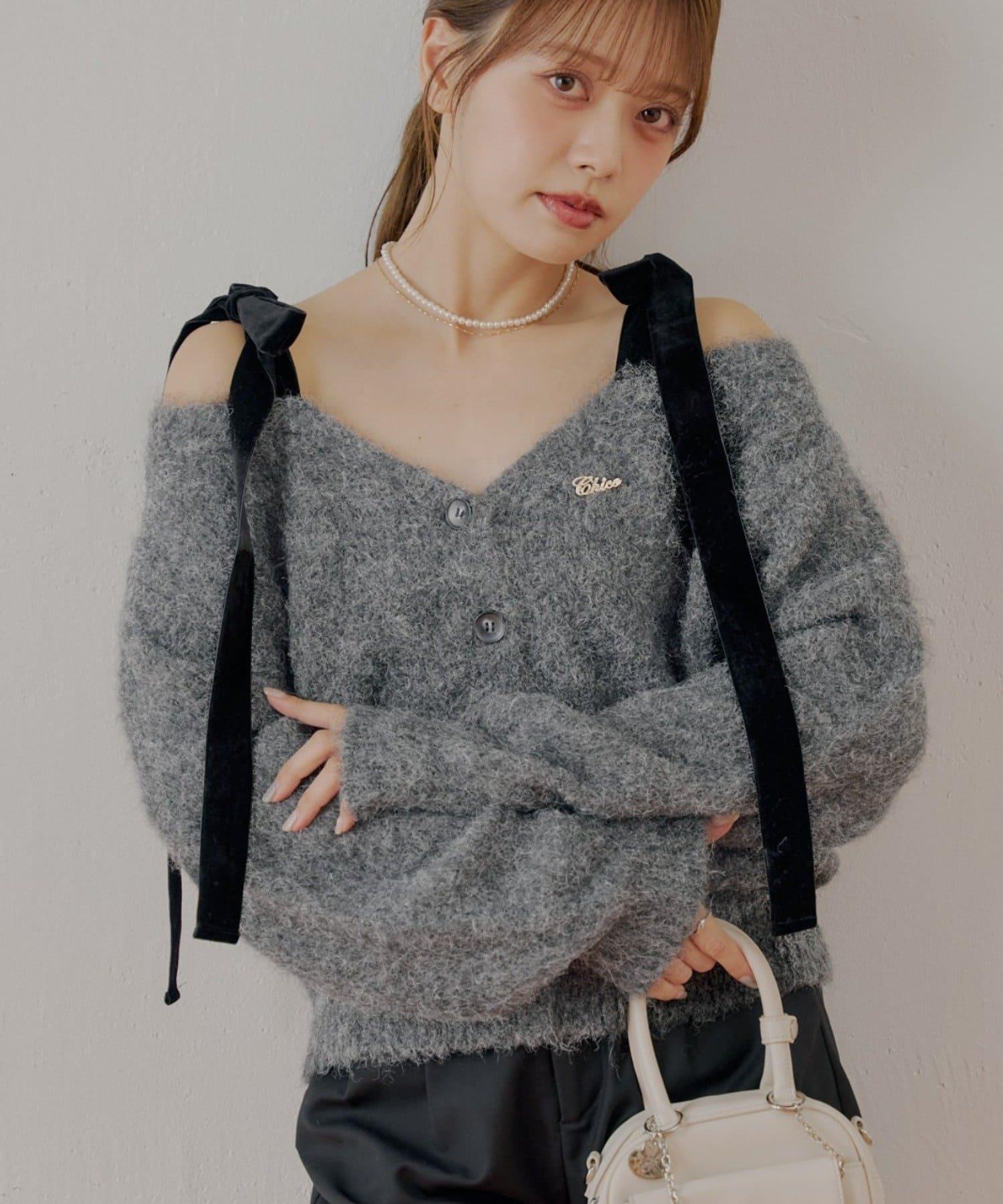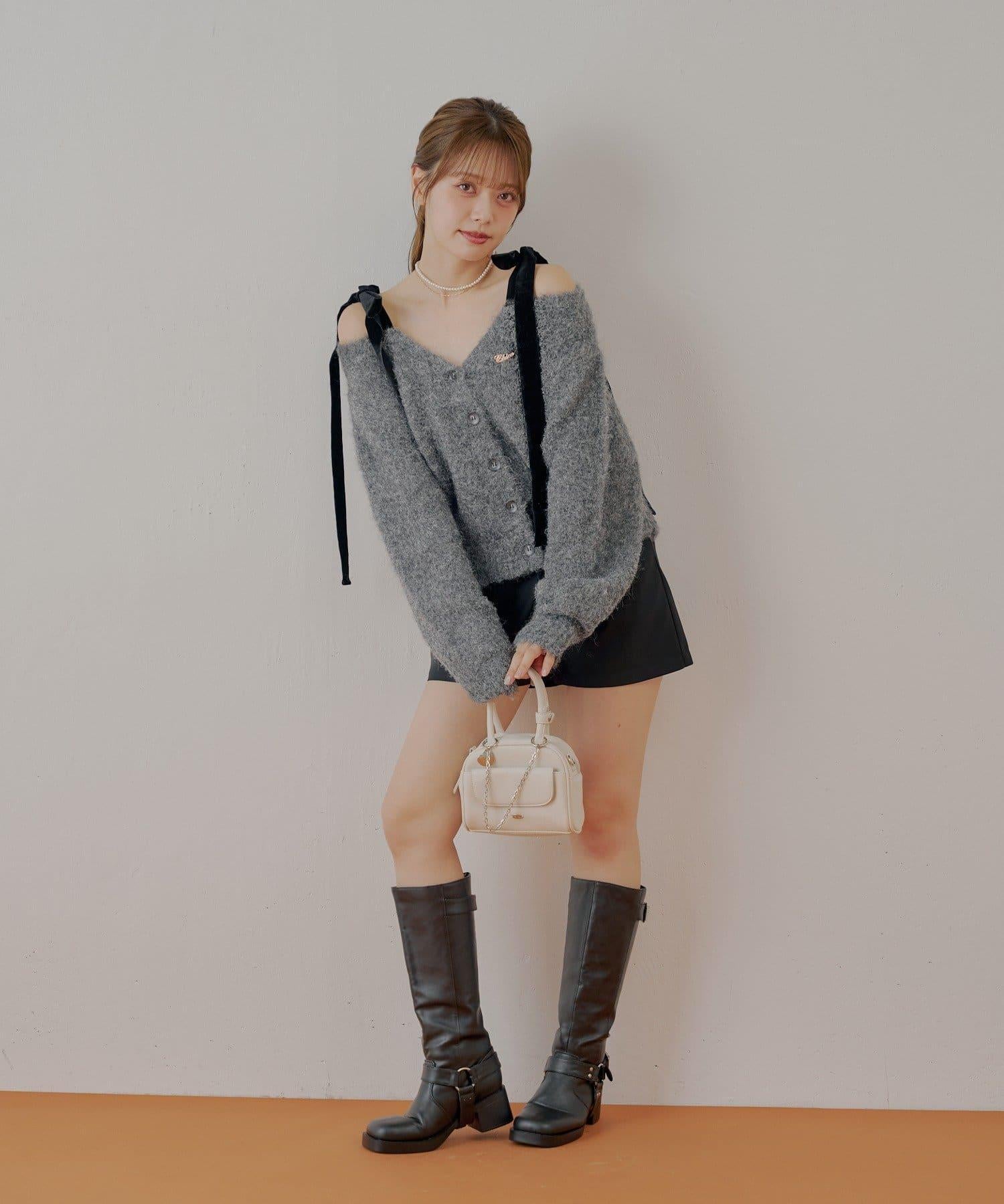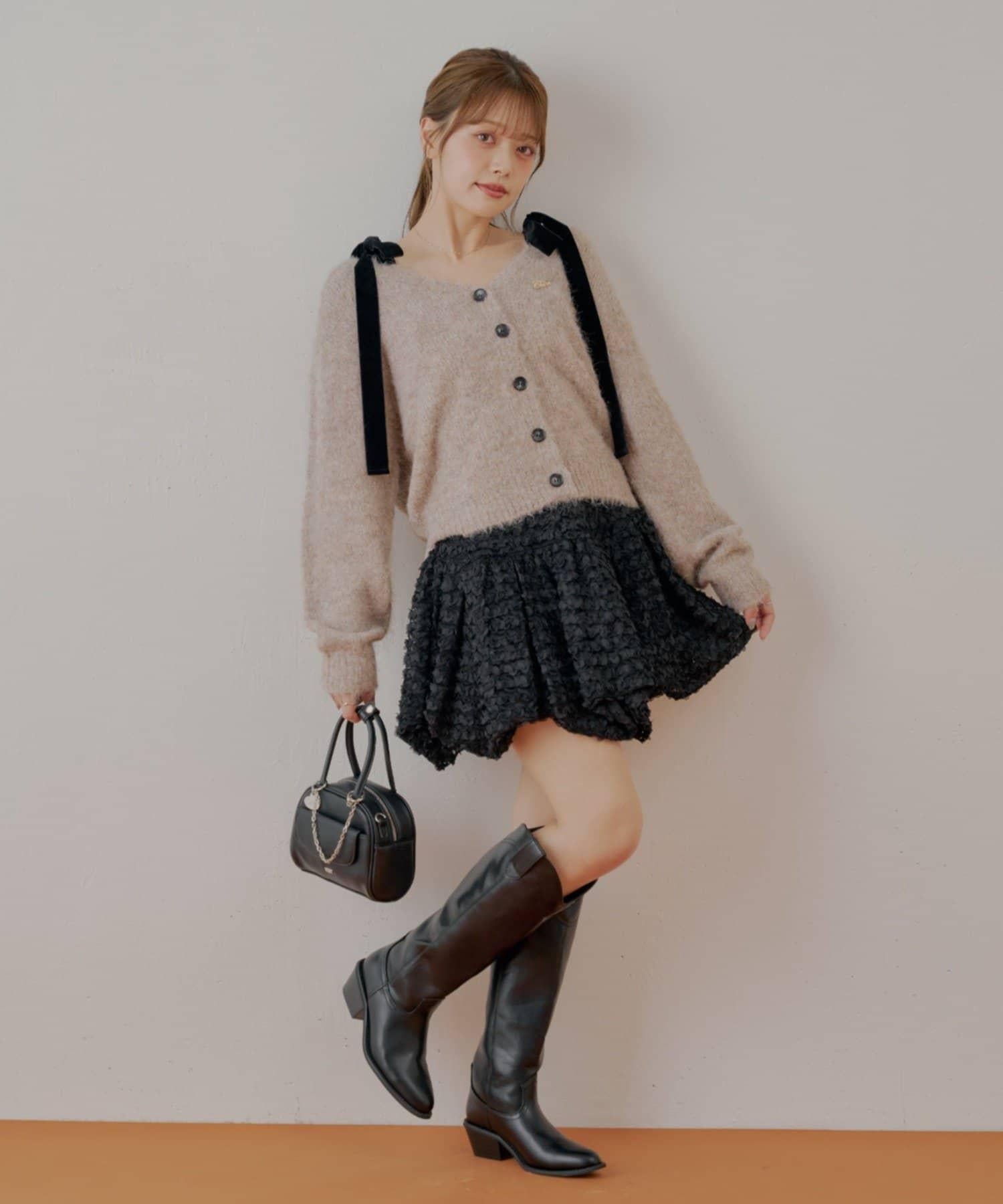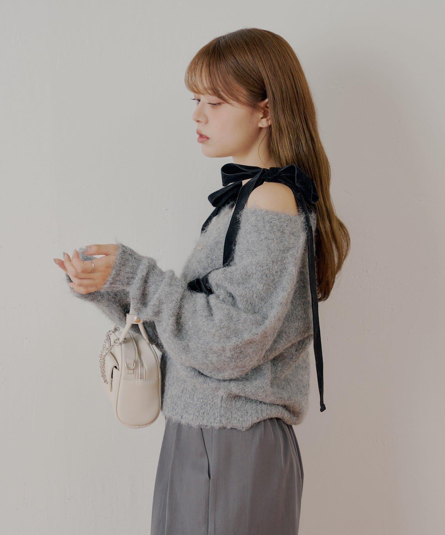 【可拆卸胸針】天鵝絨蝴蝶結寬鬆針織開衫