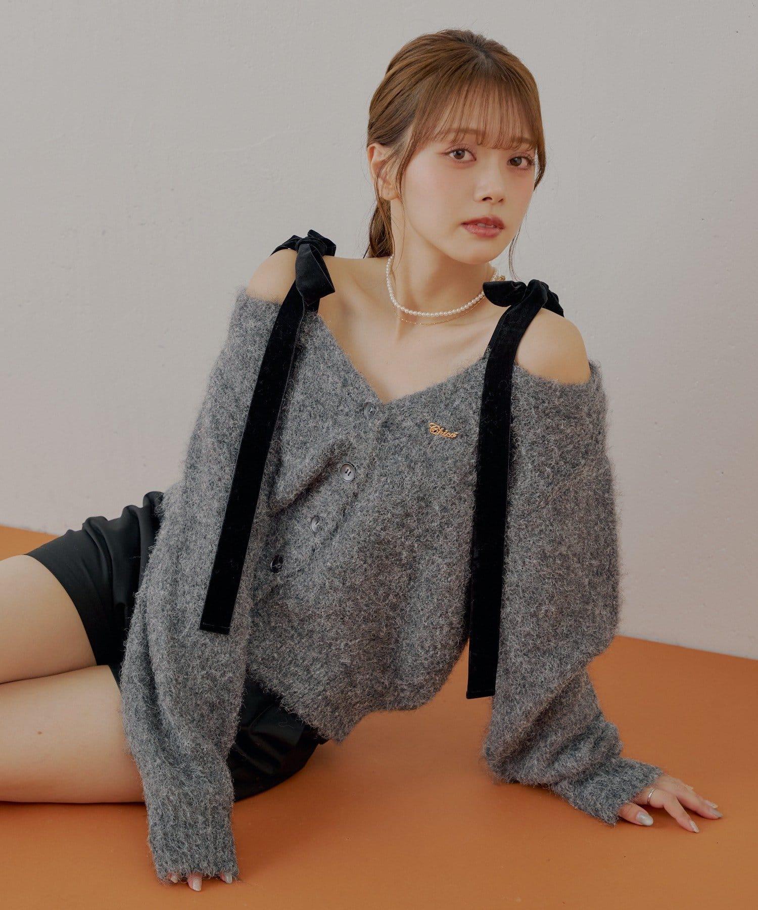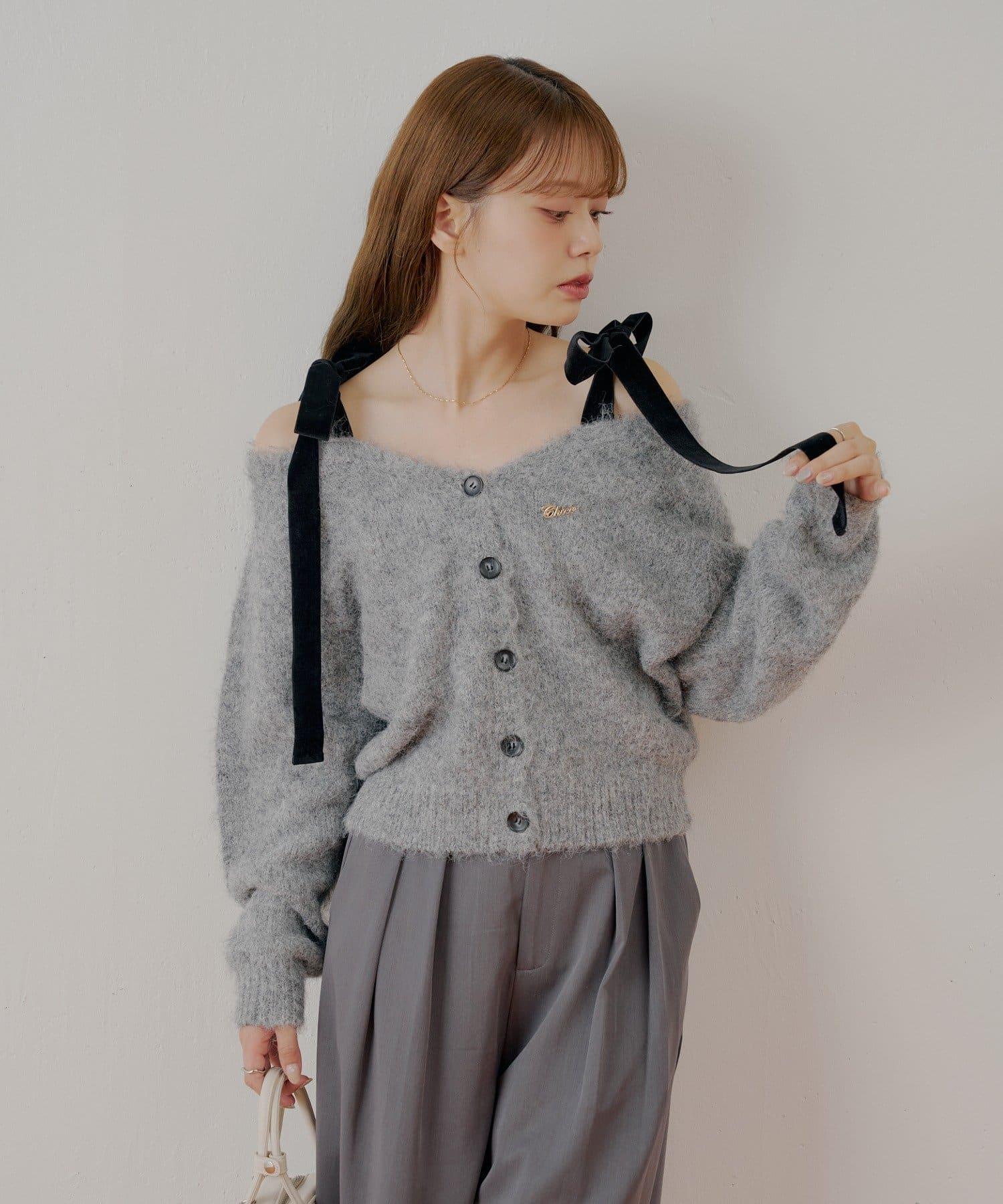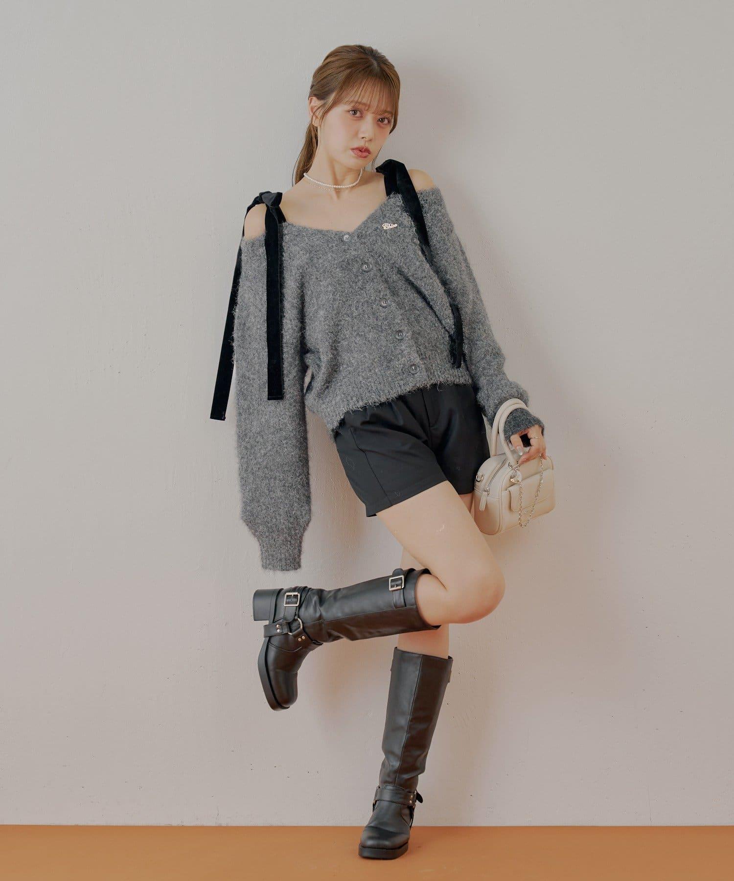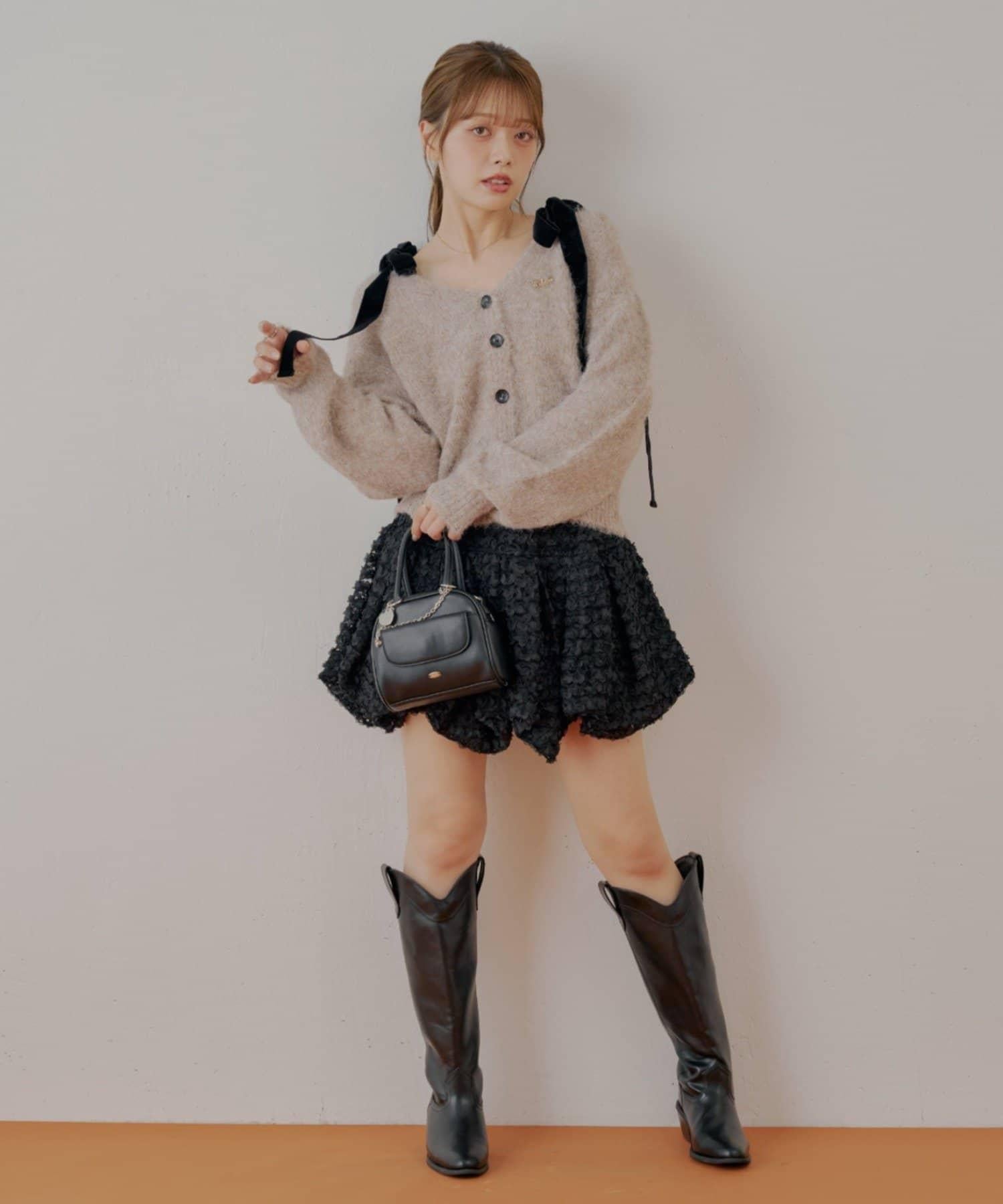 【可拆卸胸針】天鵝絨蝴蝶結寬鬆針織開衫