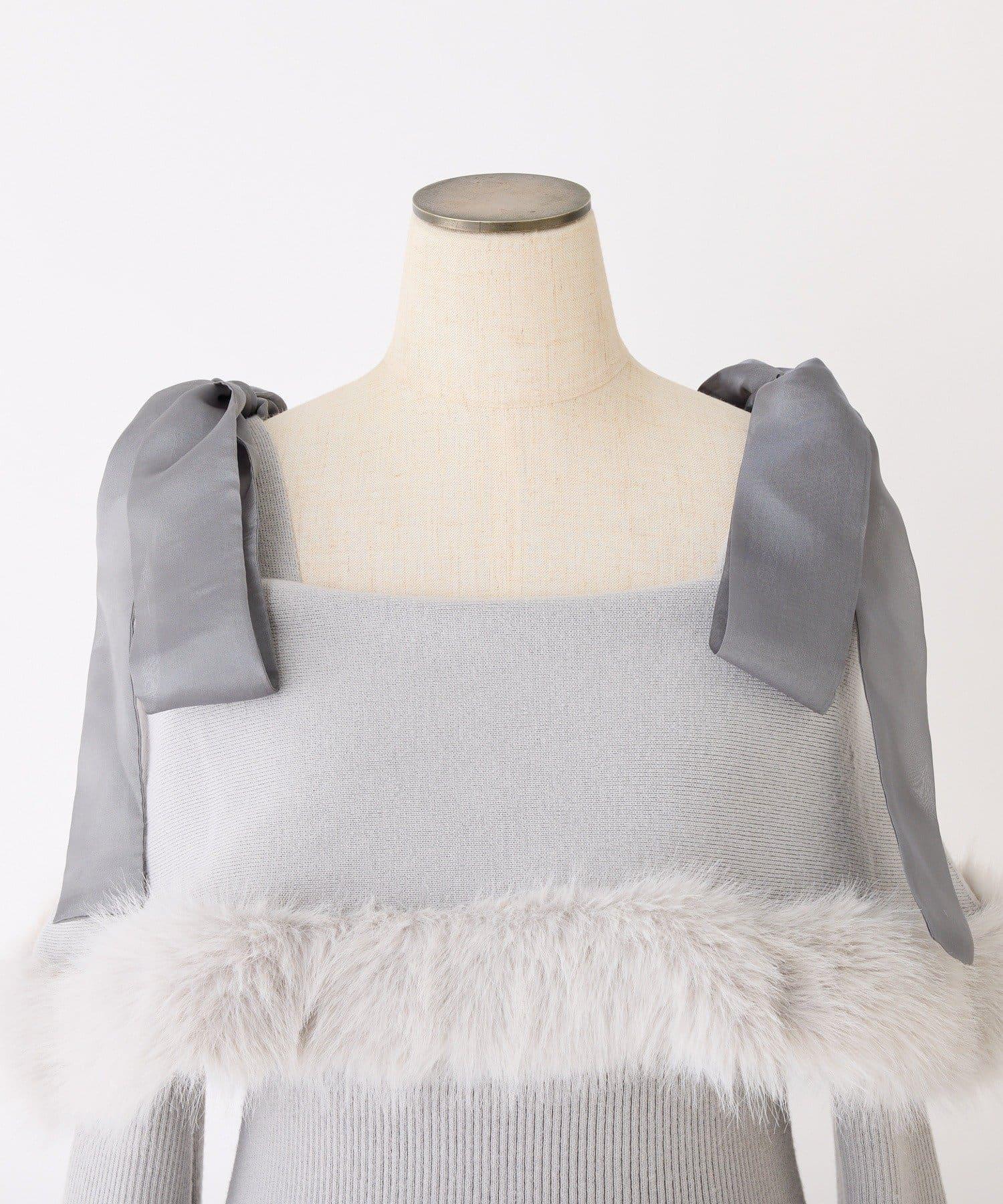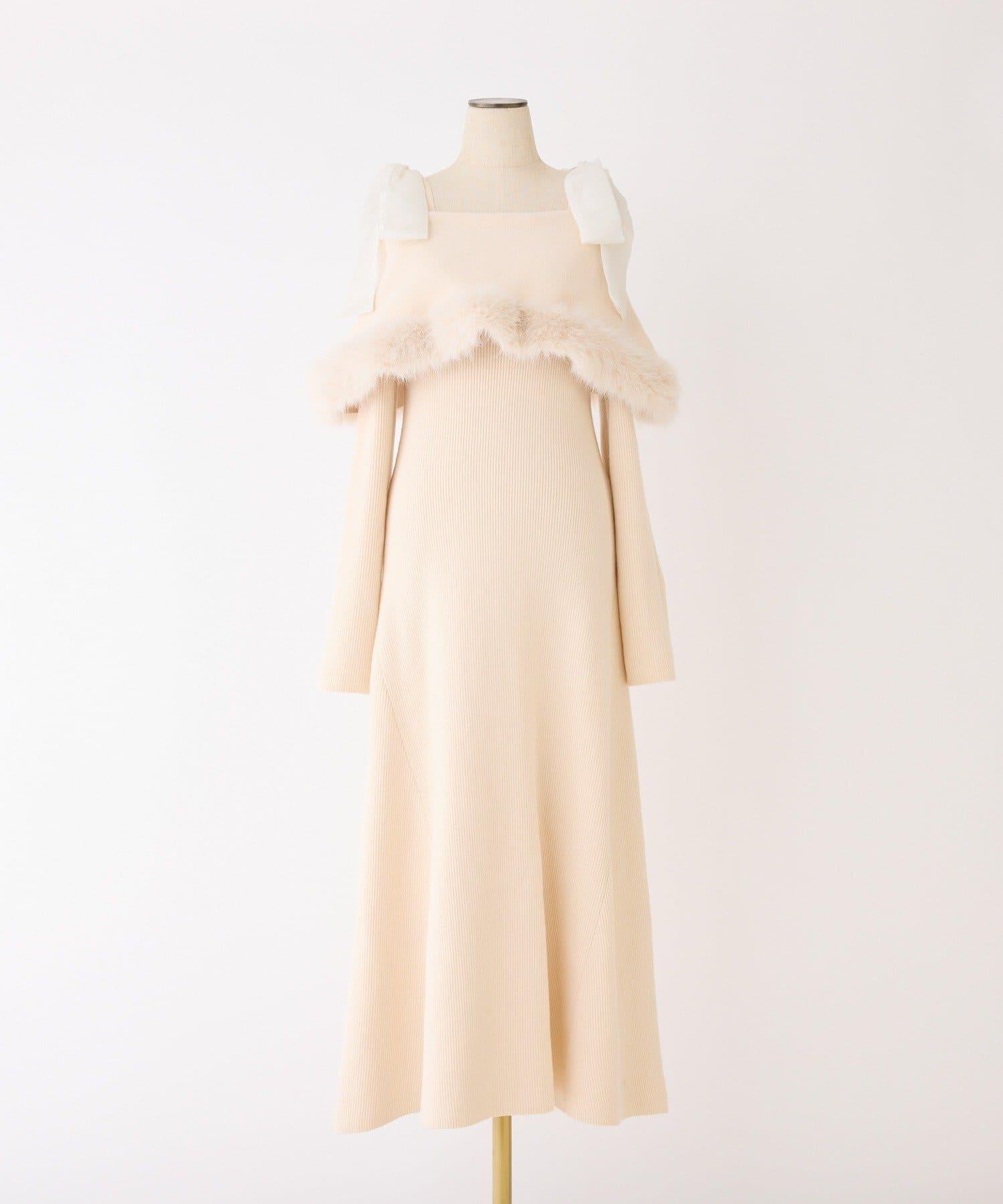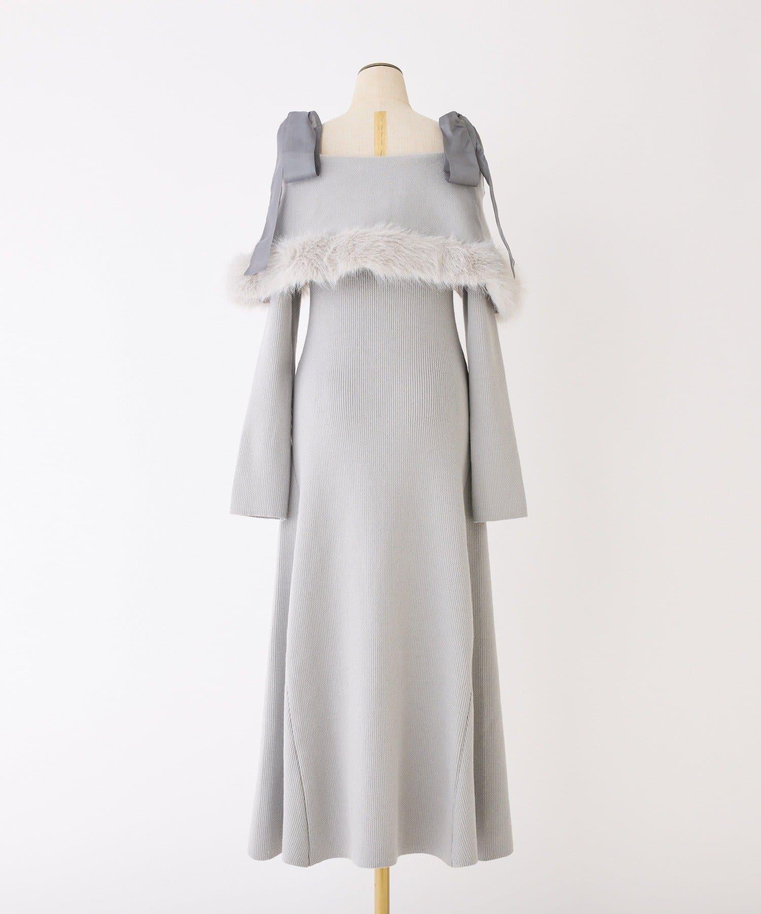可拆卸蝴蝶結一字肩毛絨針織連衣裙