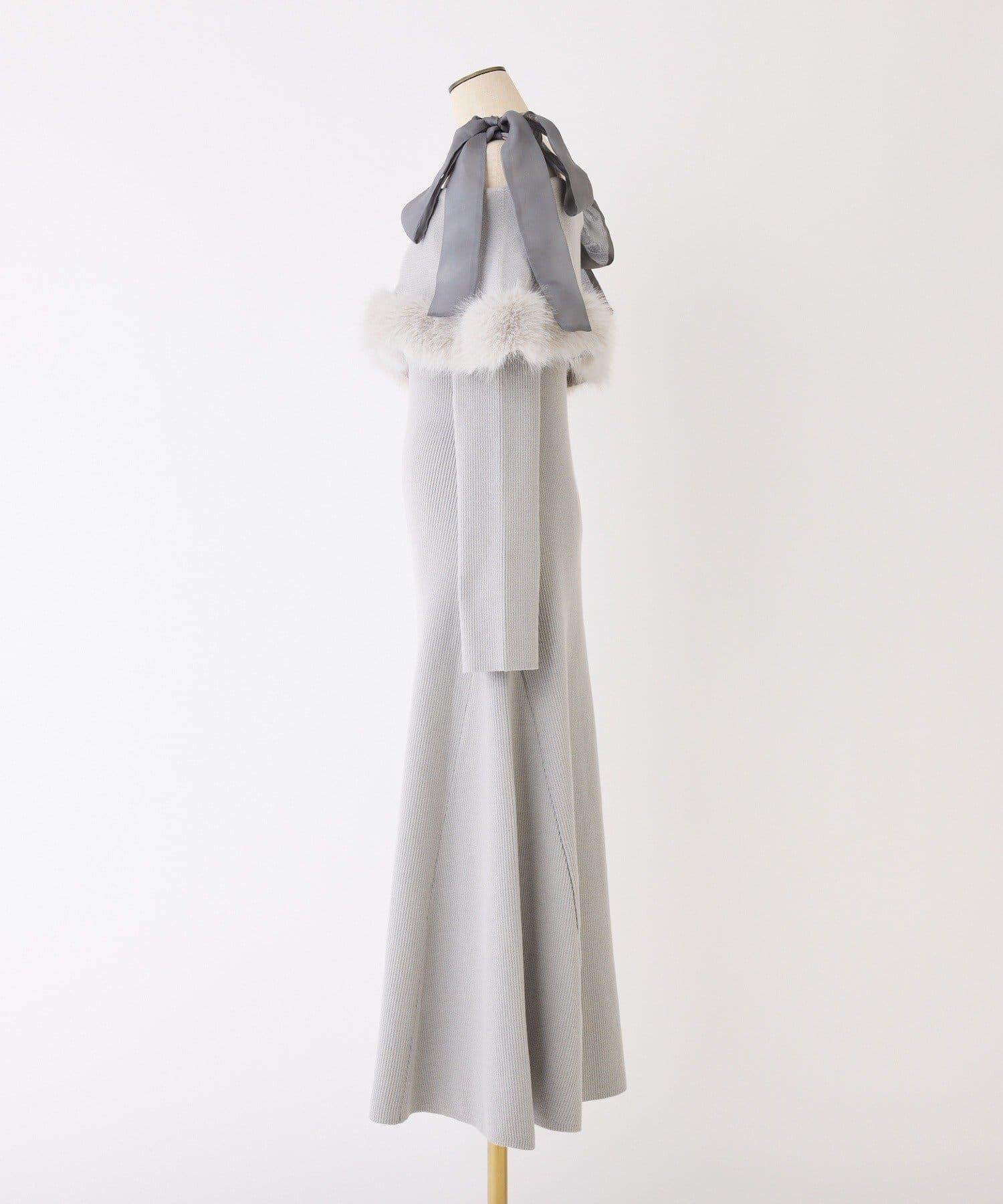 針織長裙,肩部蝴蝶結和露肩設計。
