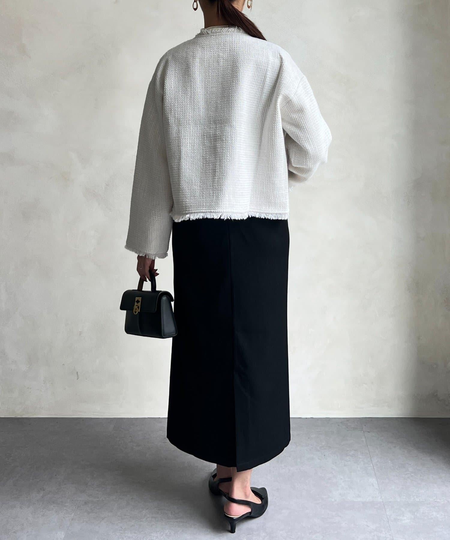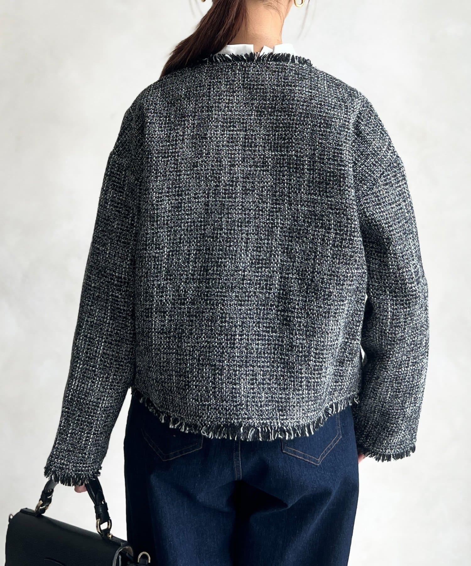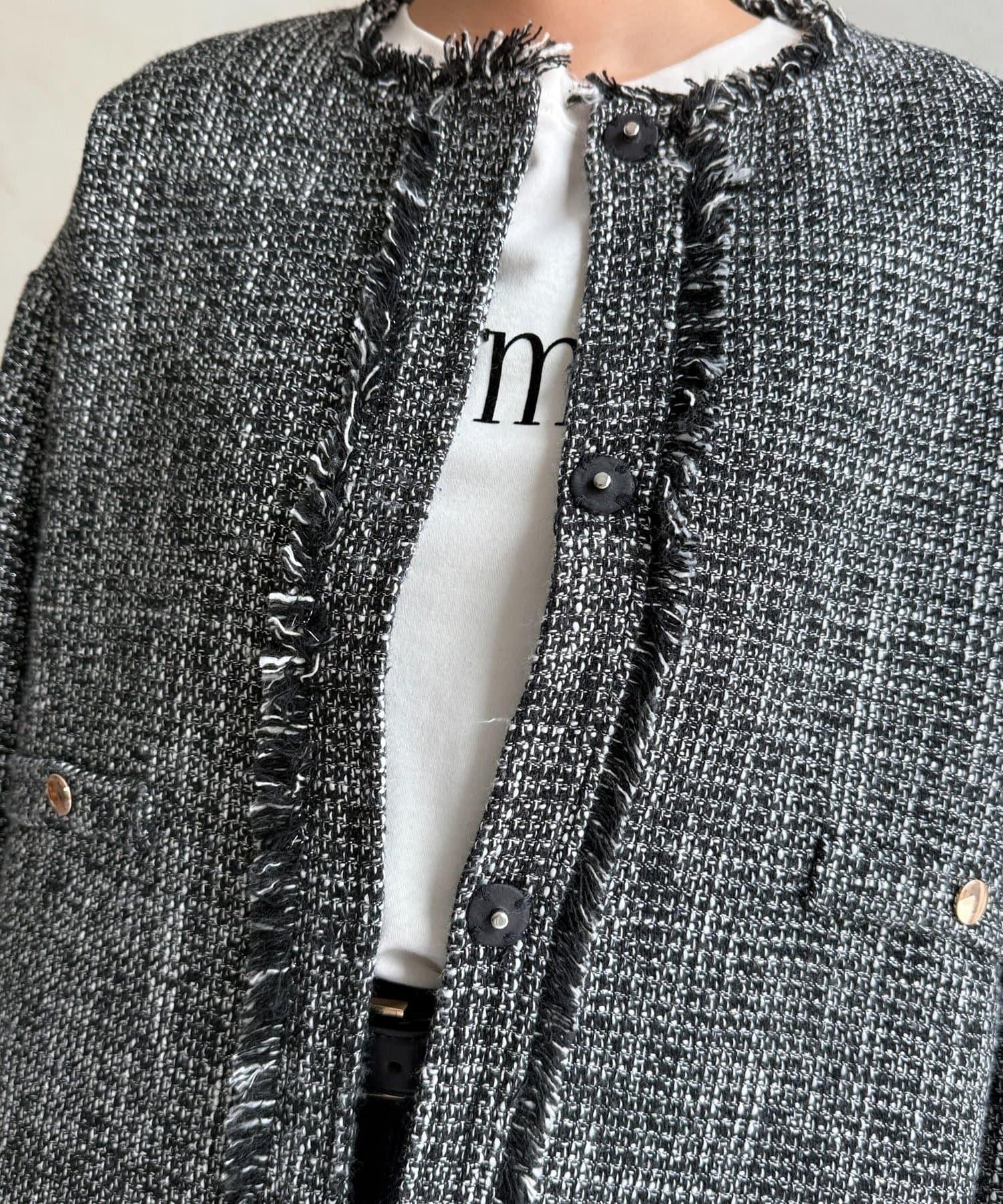 夾克長度適中,採用無領設計,給人一種乾淨利落的感覺!
