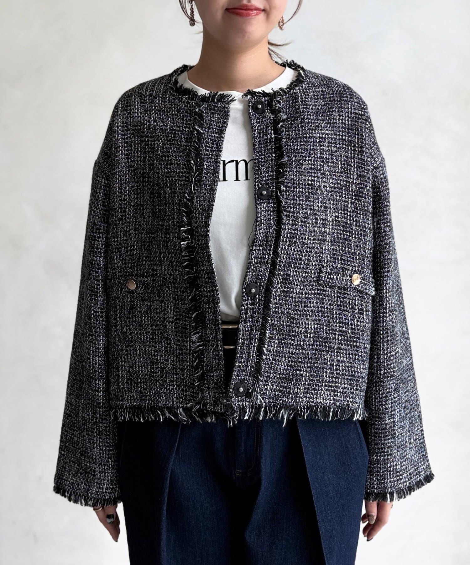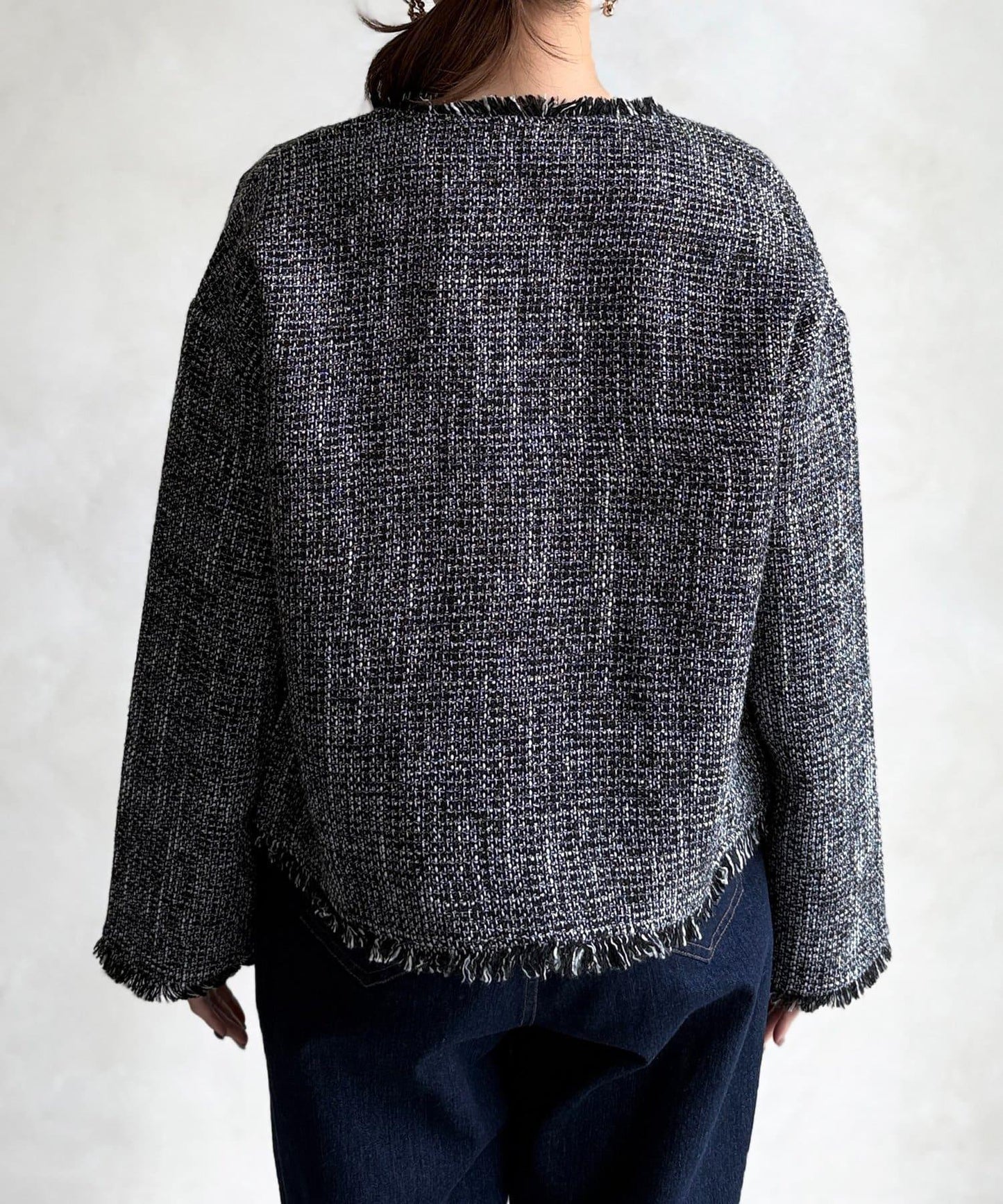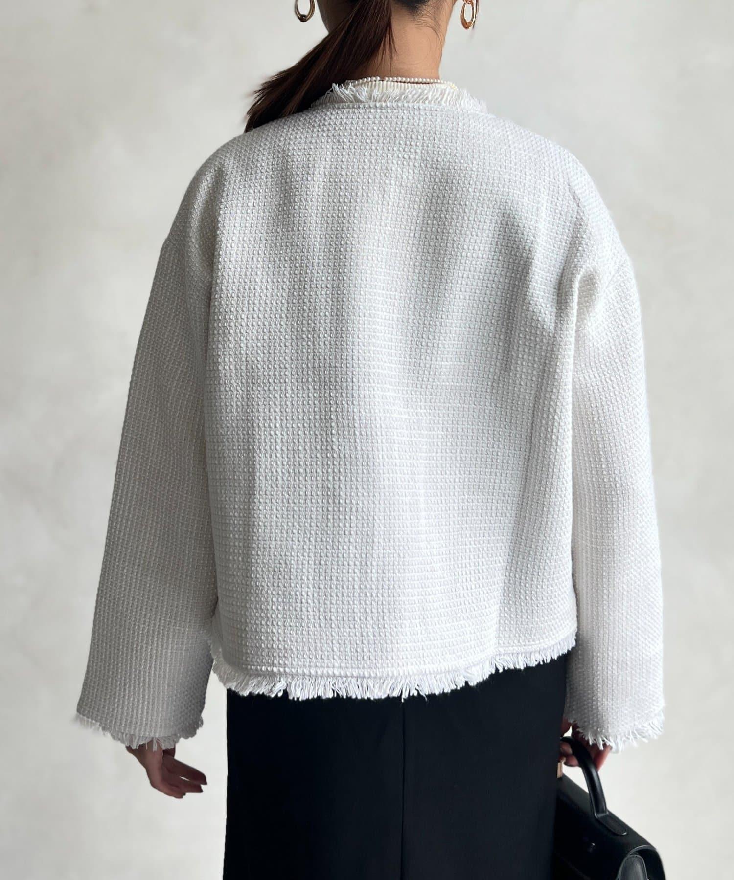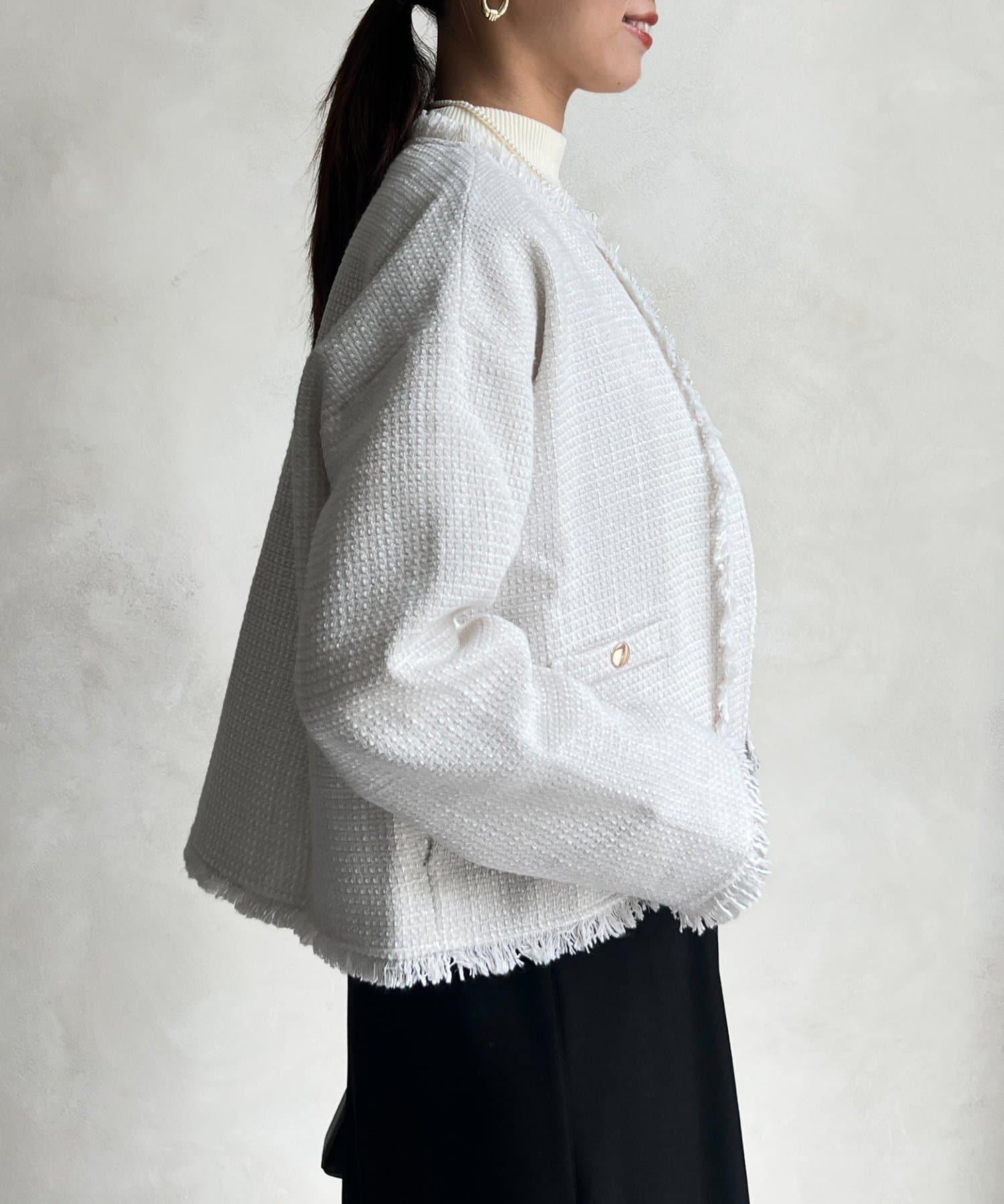 夾克長度適中,採用無領設計,給人一種乾淨利落的感覺!
