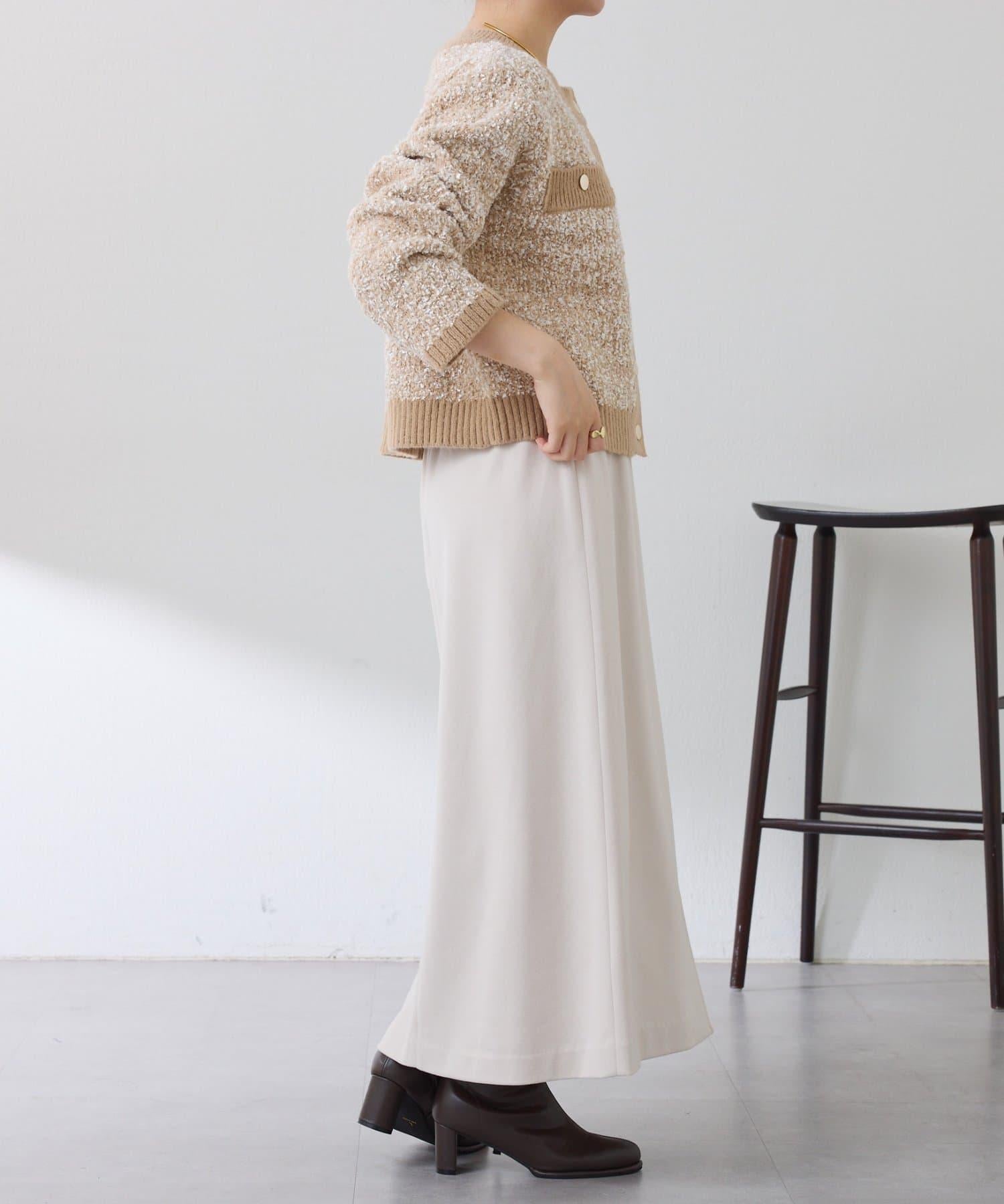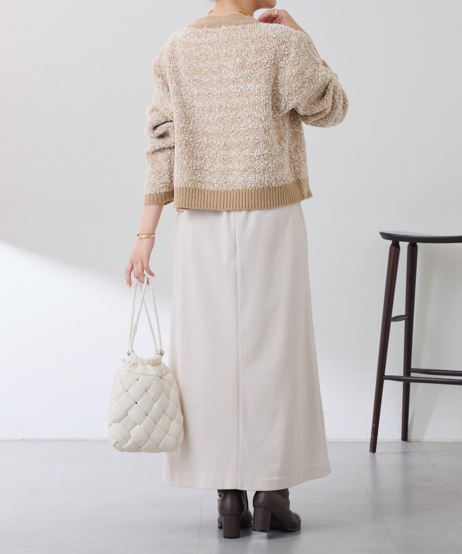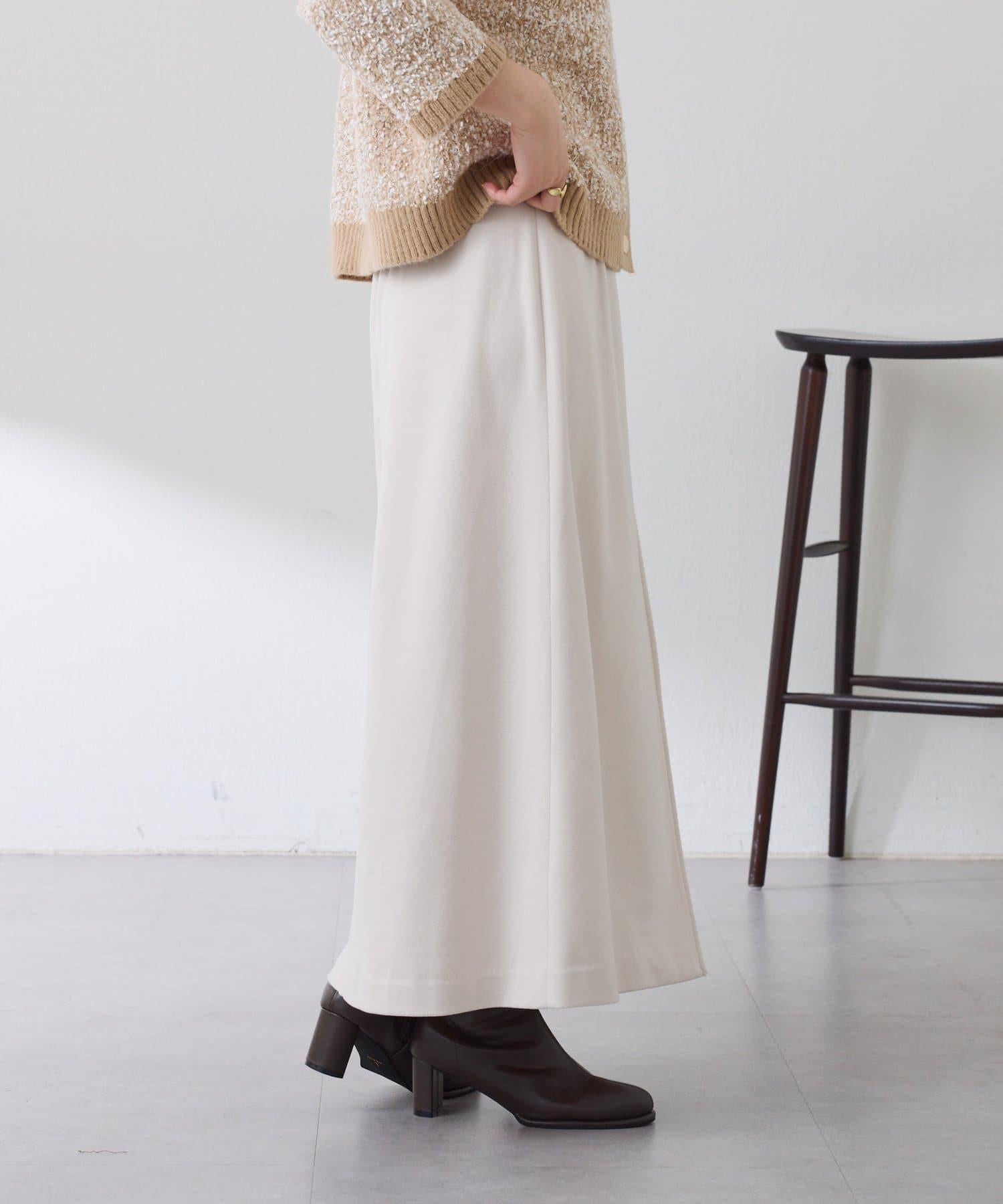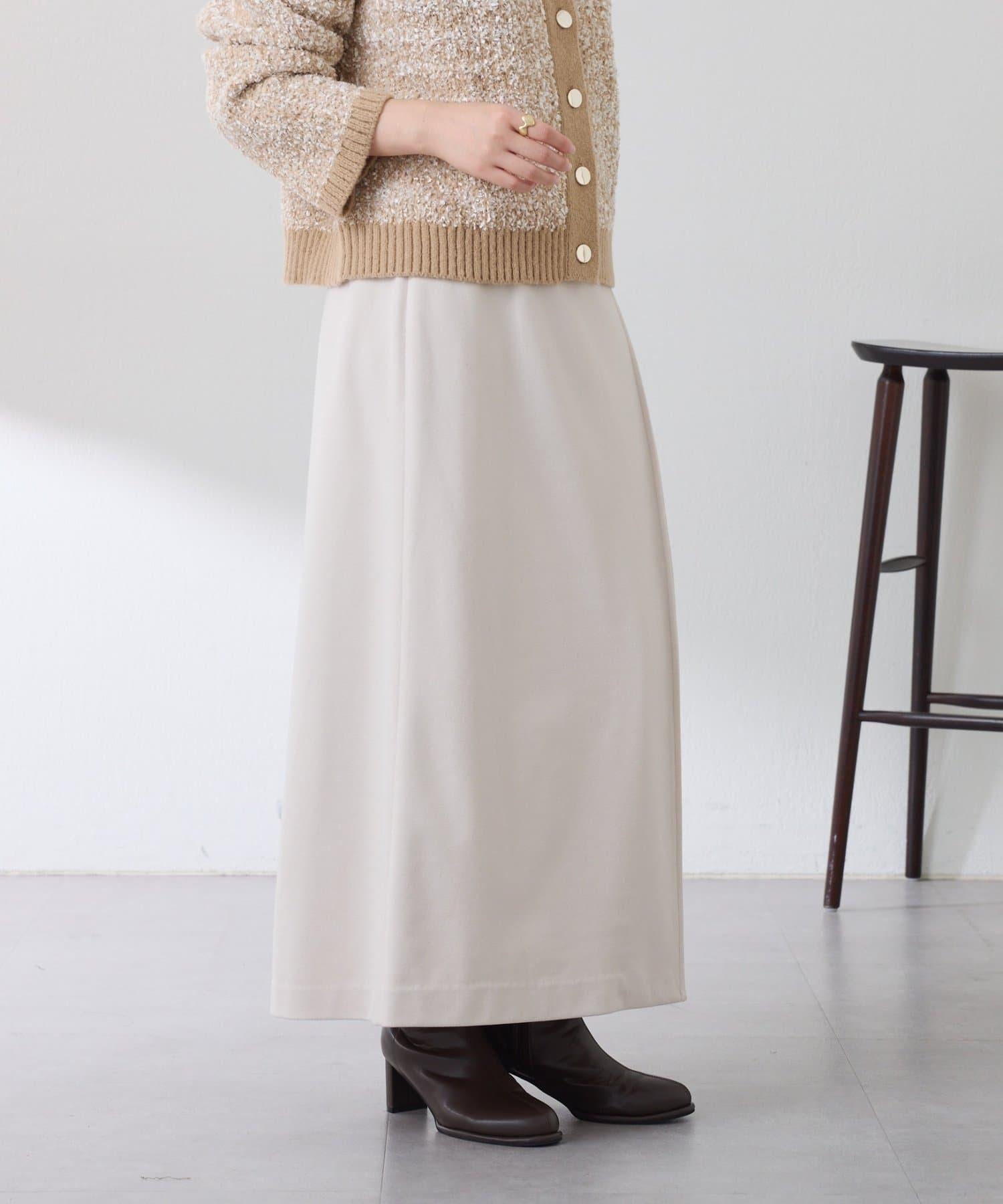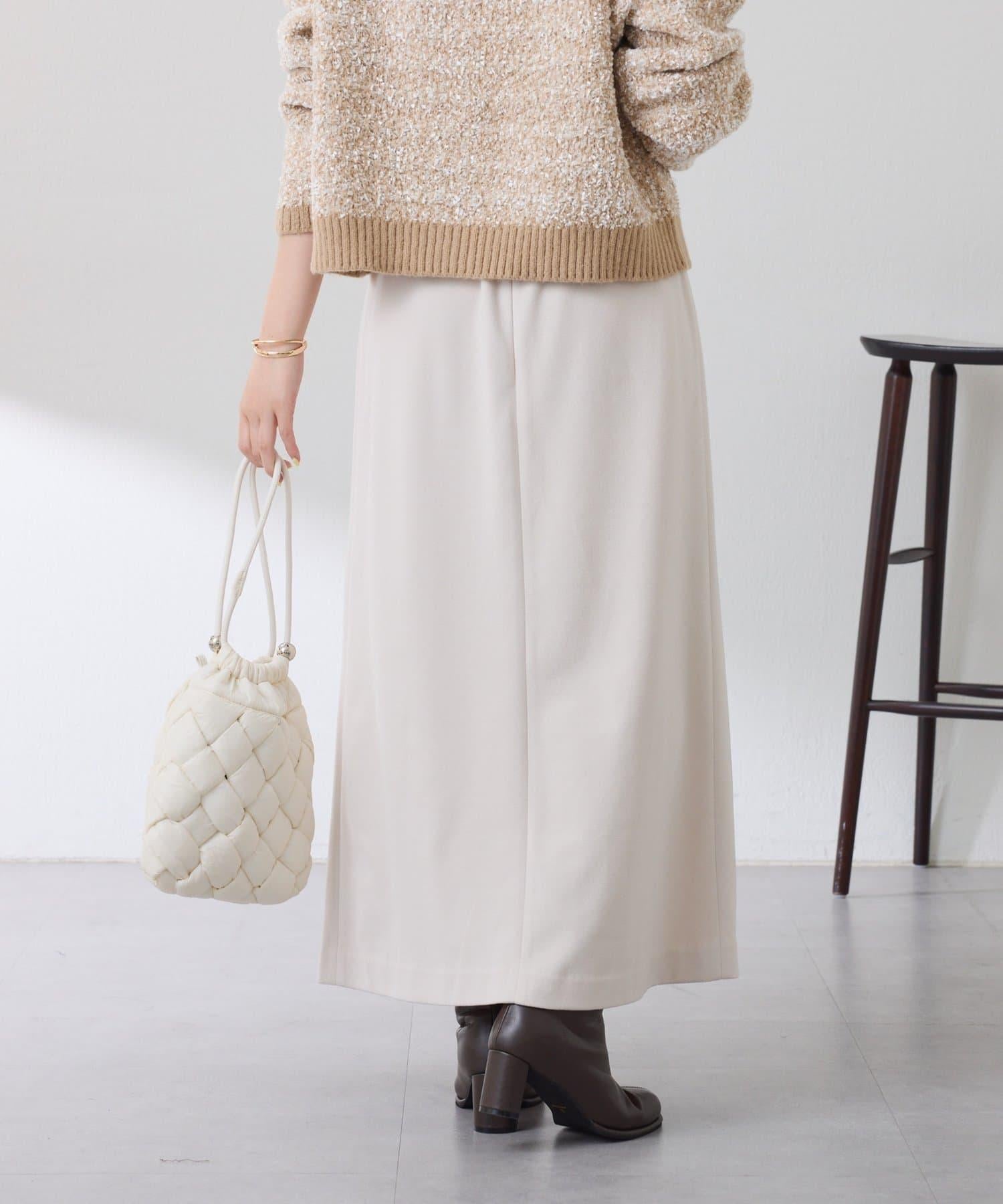 這款裙子採用凸起的材質,因此能提升溫暖秋冬的格調。米白色的材質也不透明。