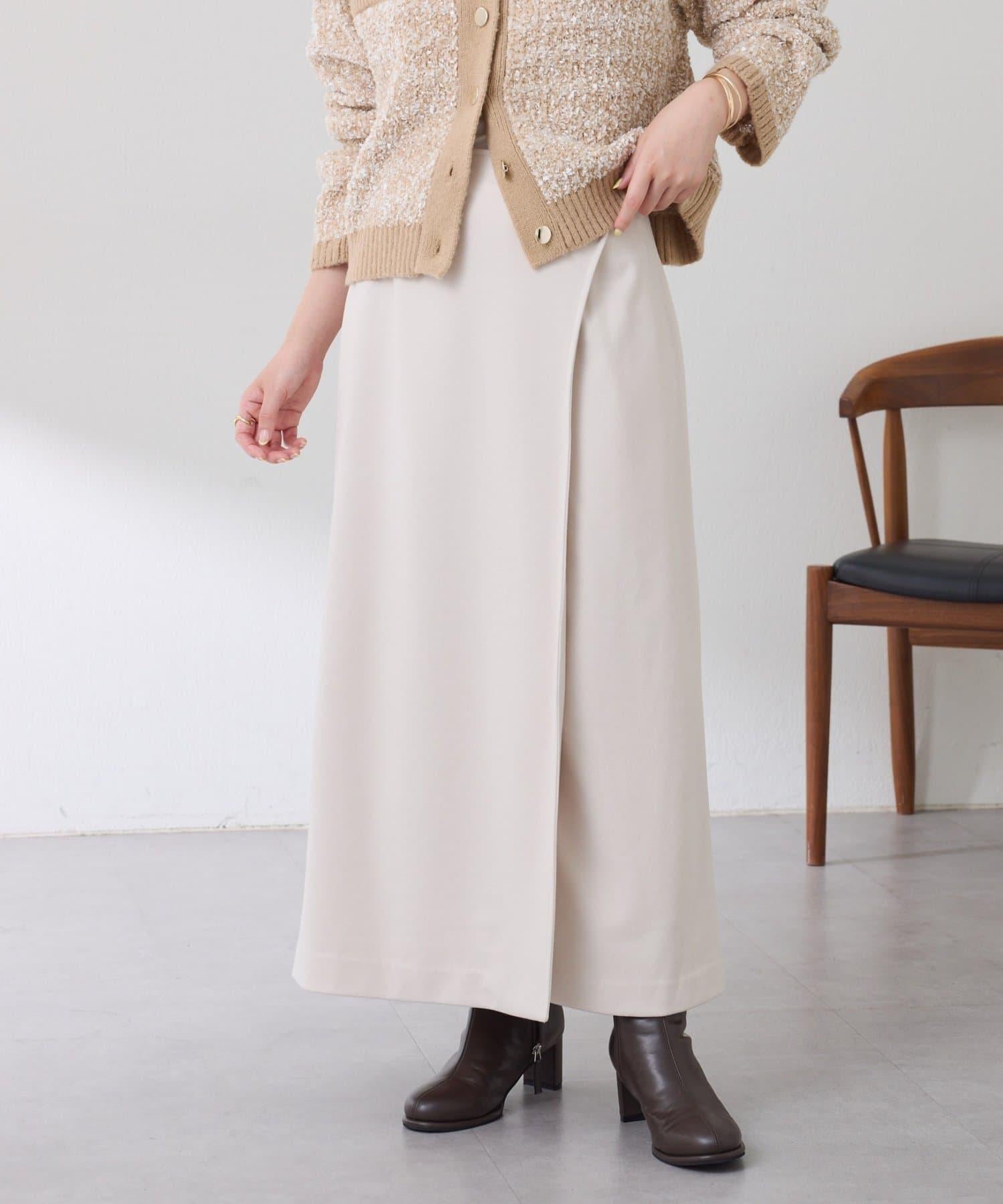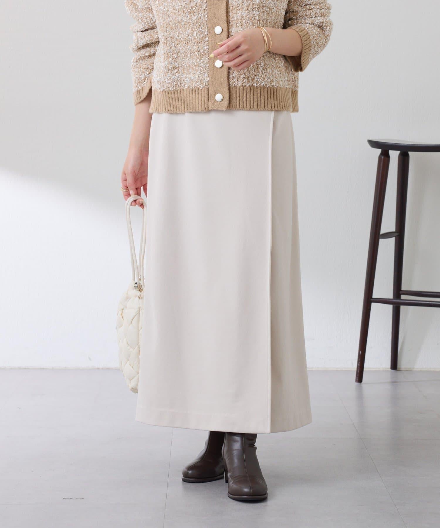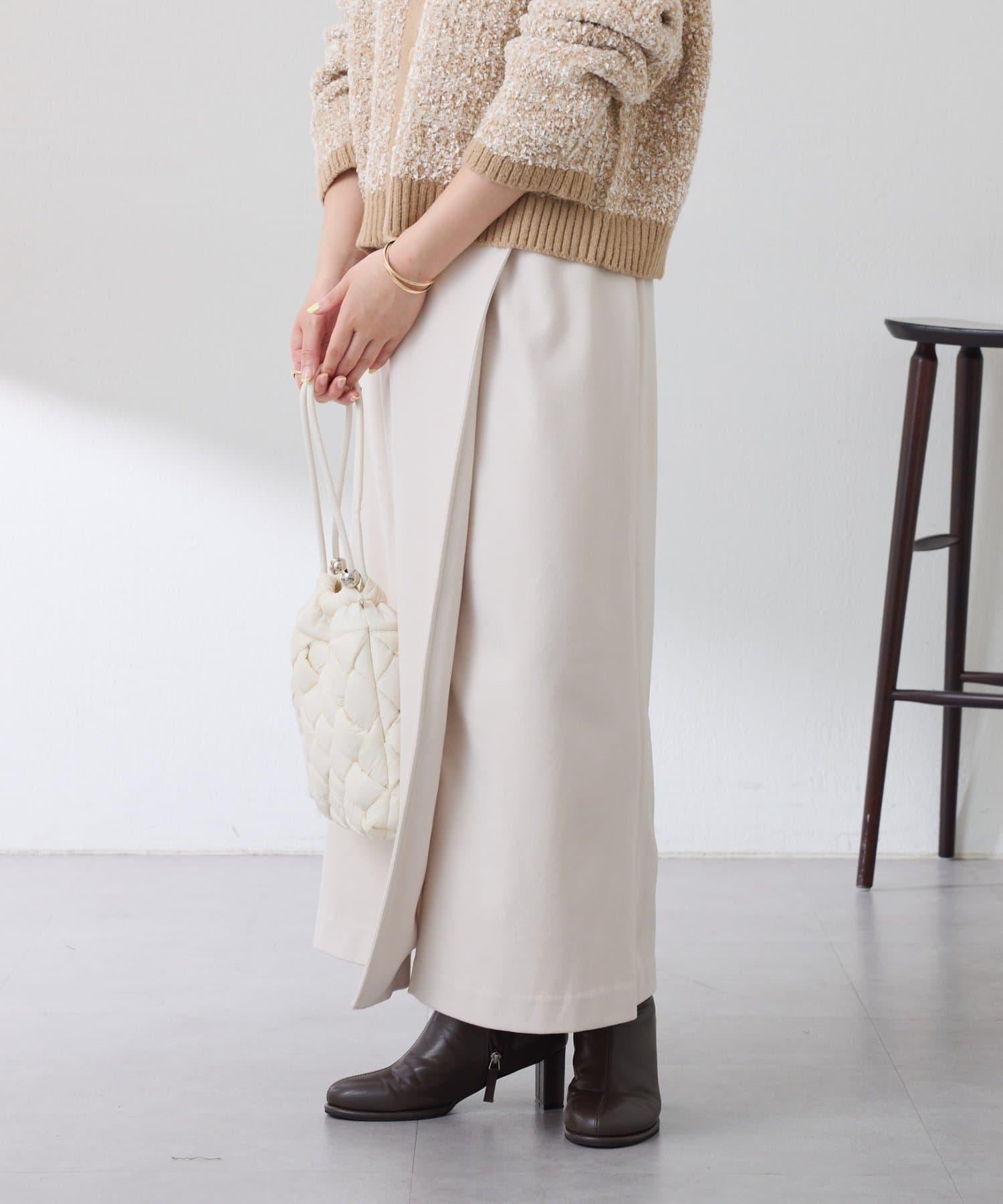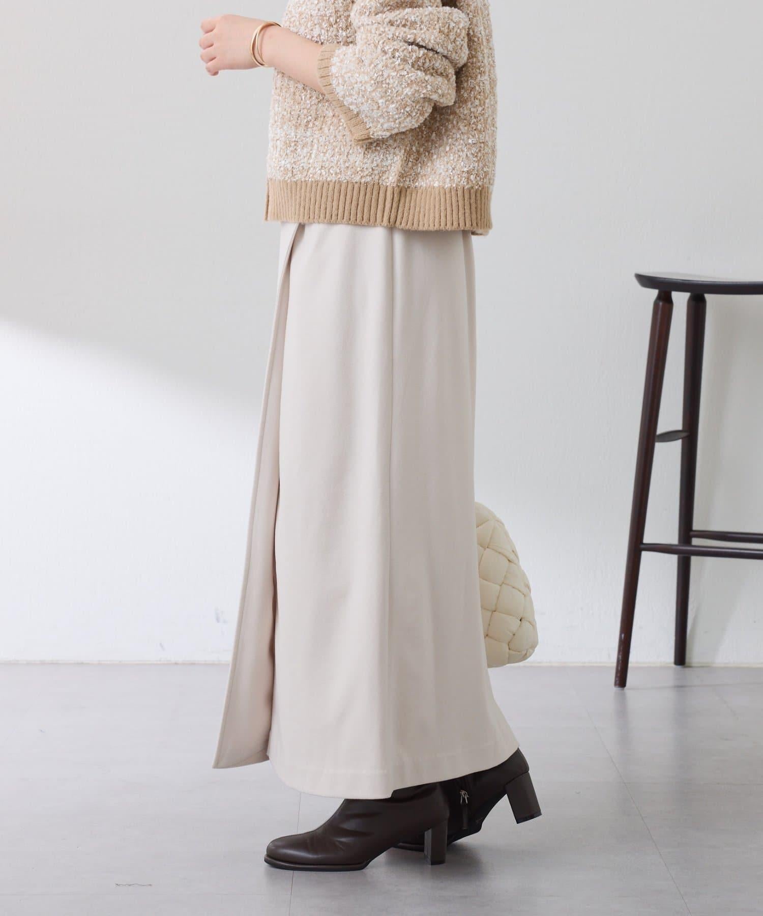 這款裙子採用凸起的材質,因此能提升溫暖秋冬的格調。米白色的材質也不透明。