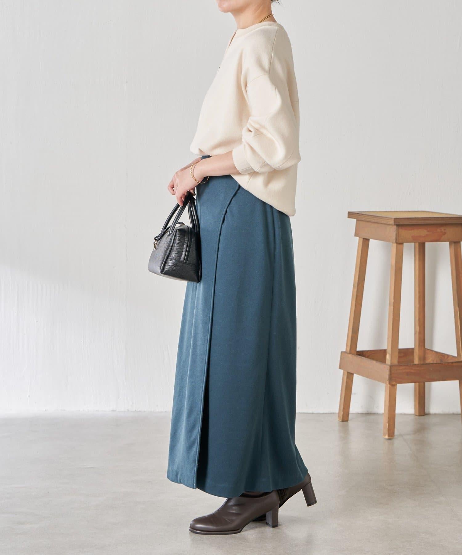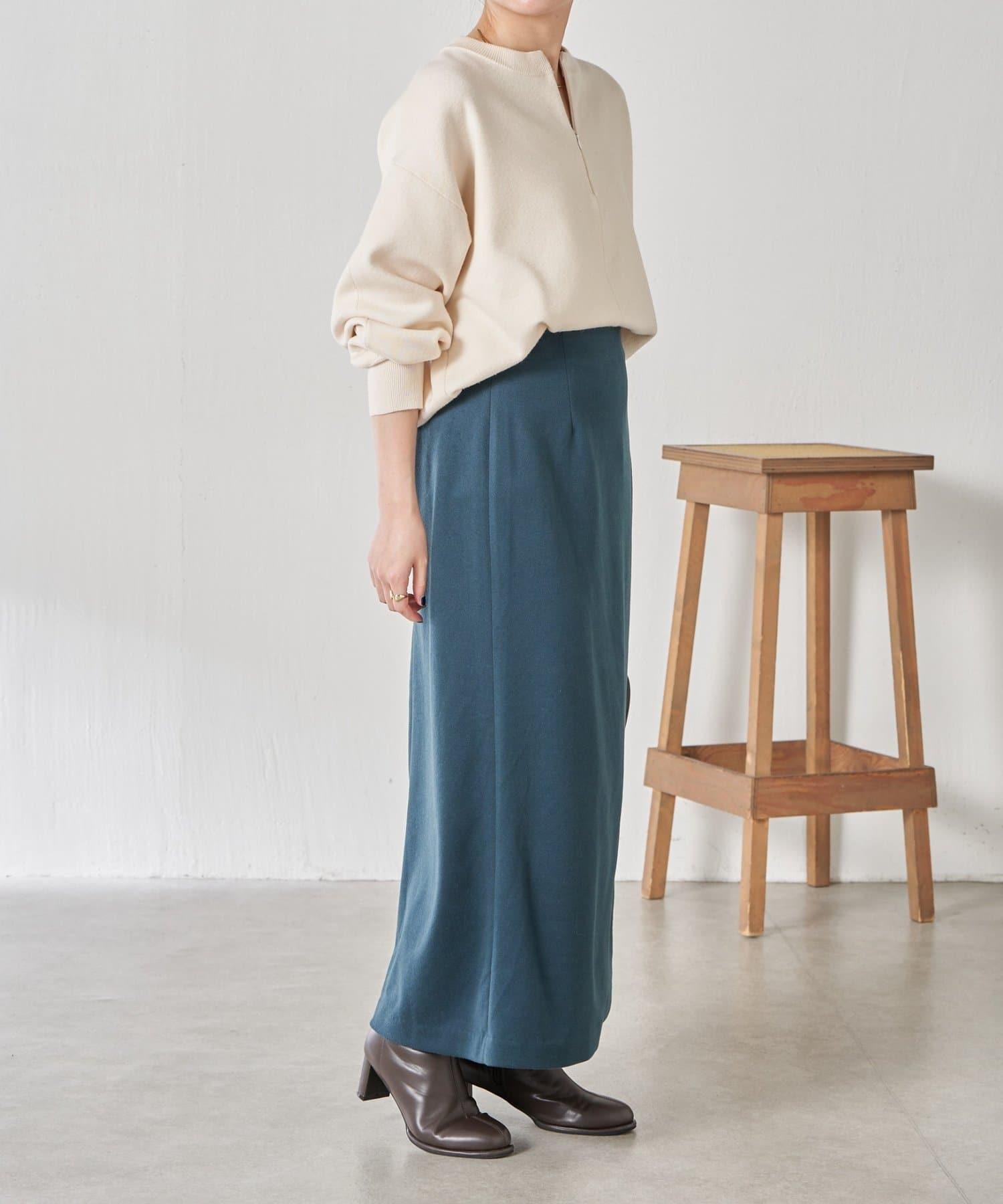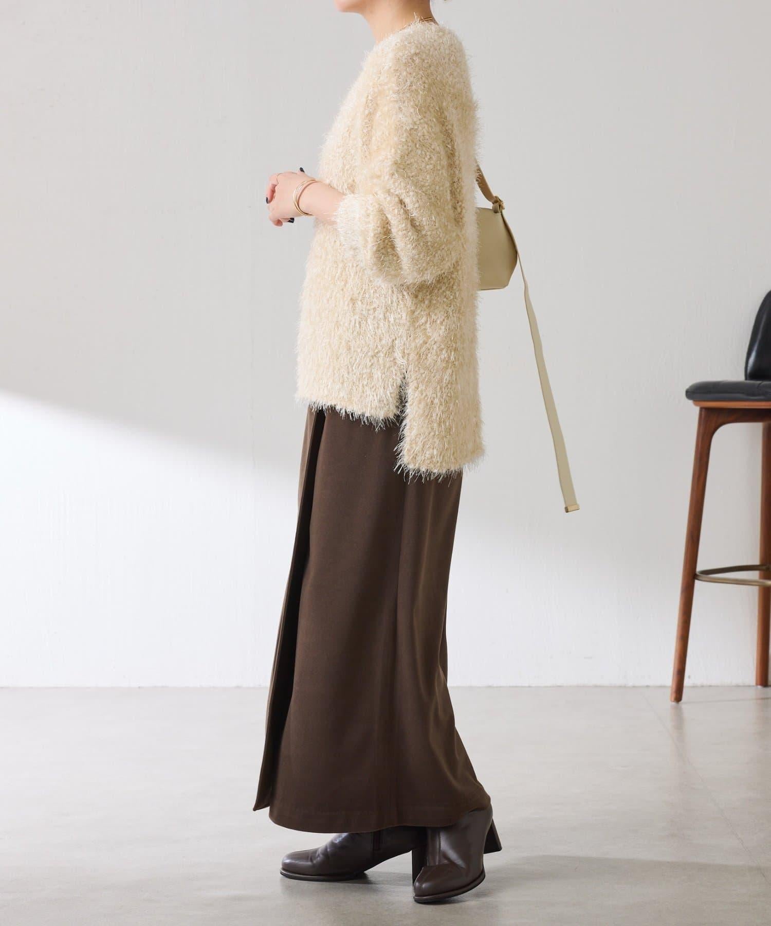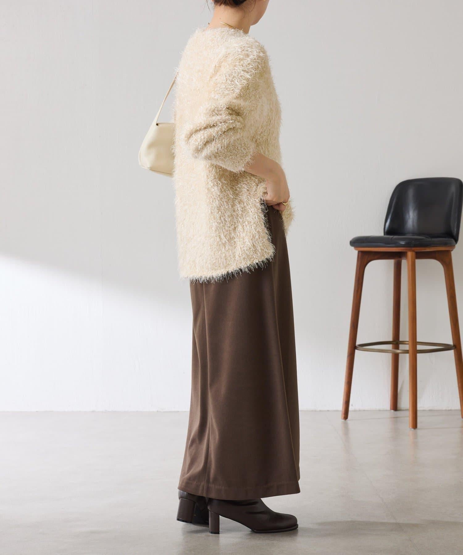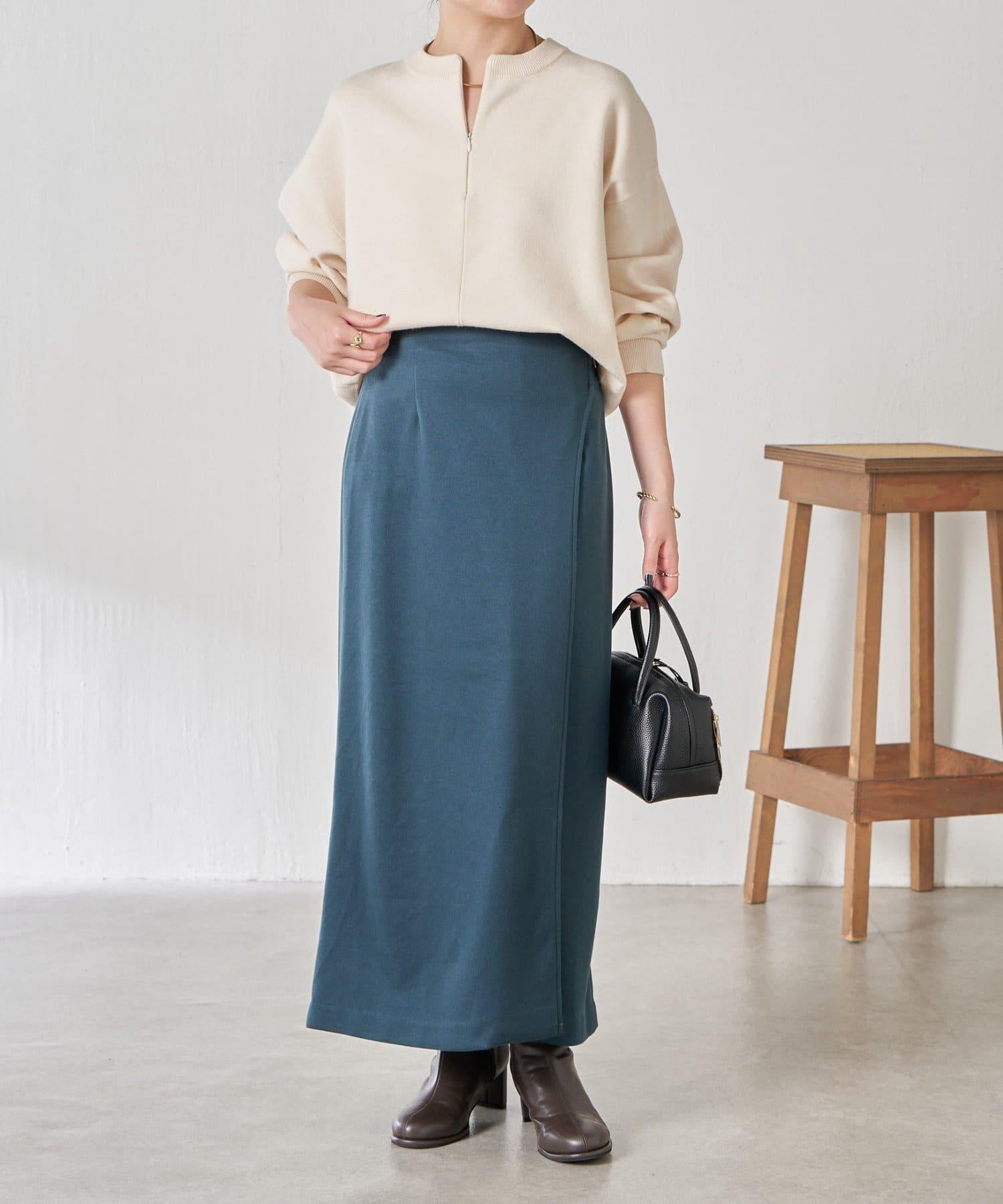 這款裙子採用凸起的材質,因此能提升溫暖秋冬的格調。米白色的材質也不透明。