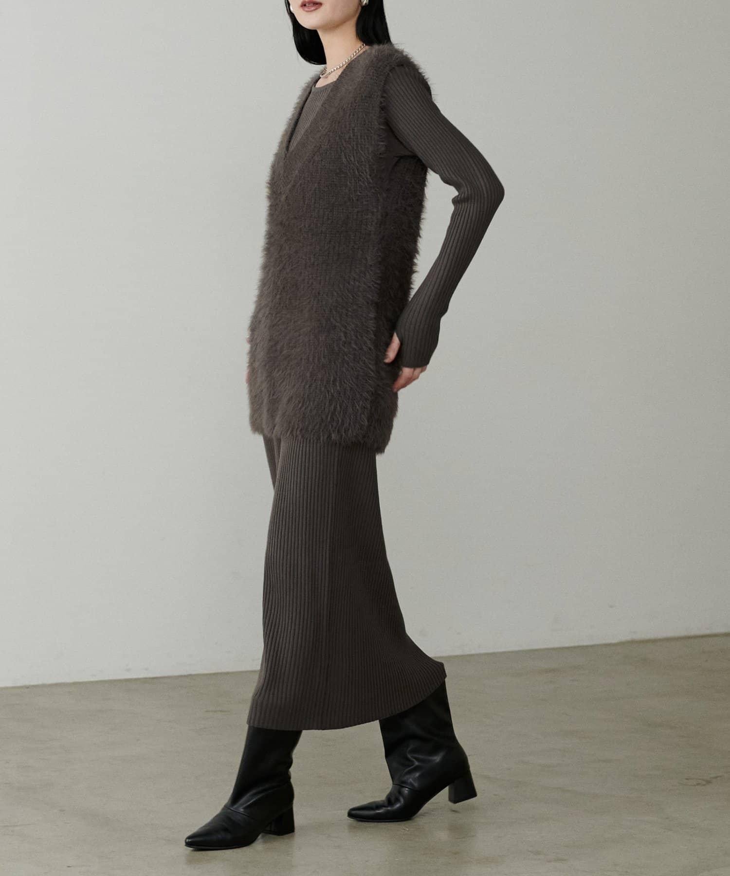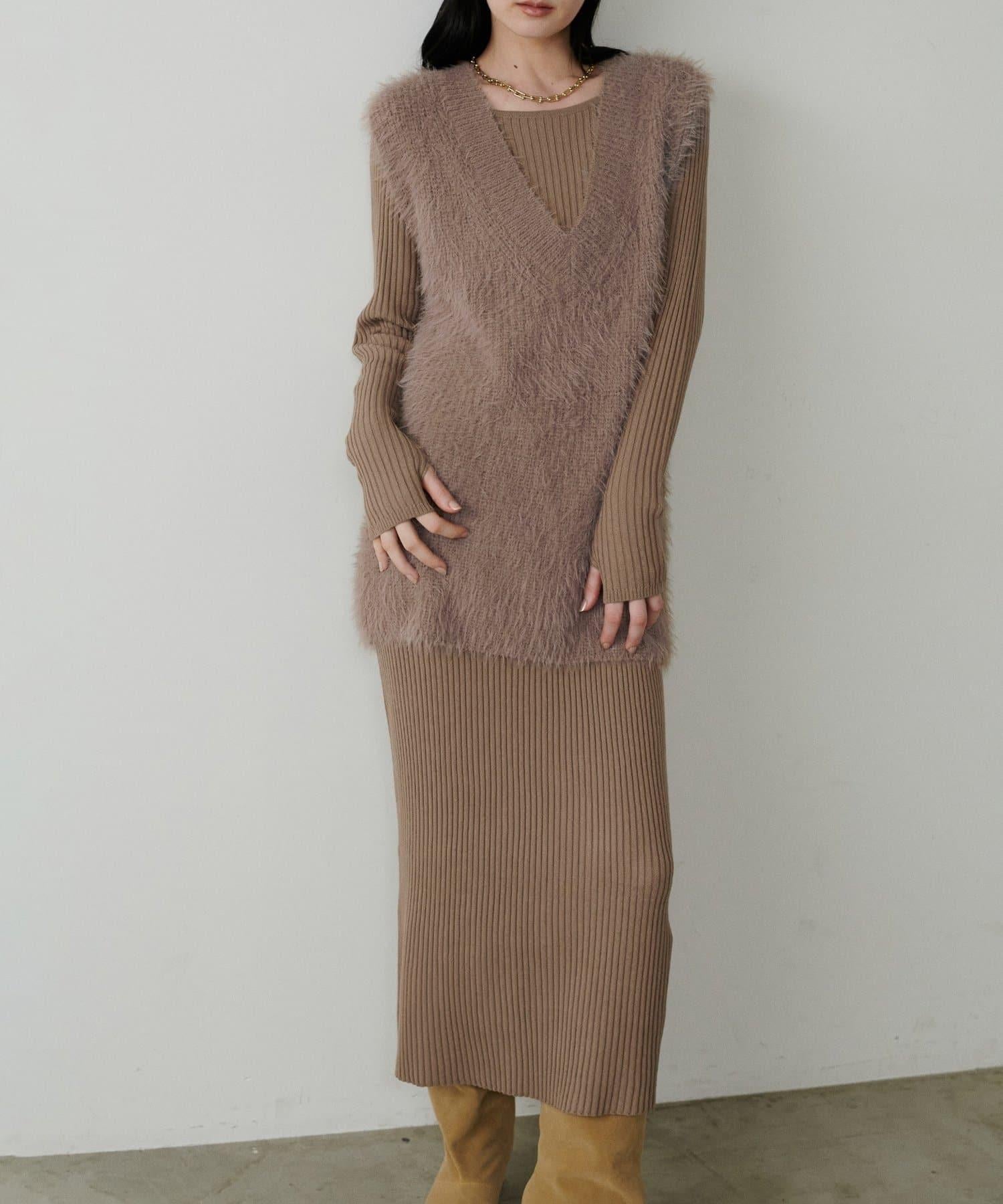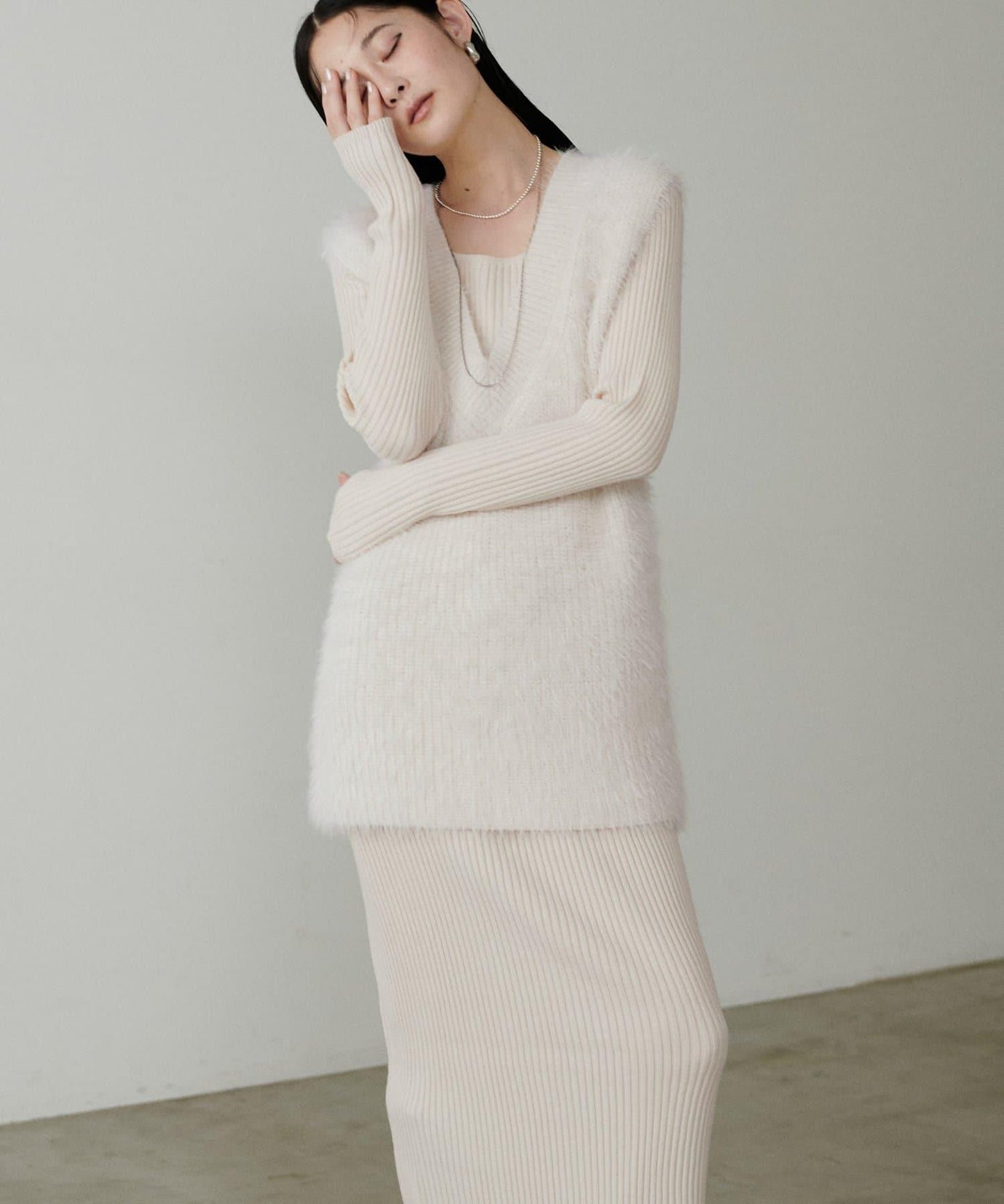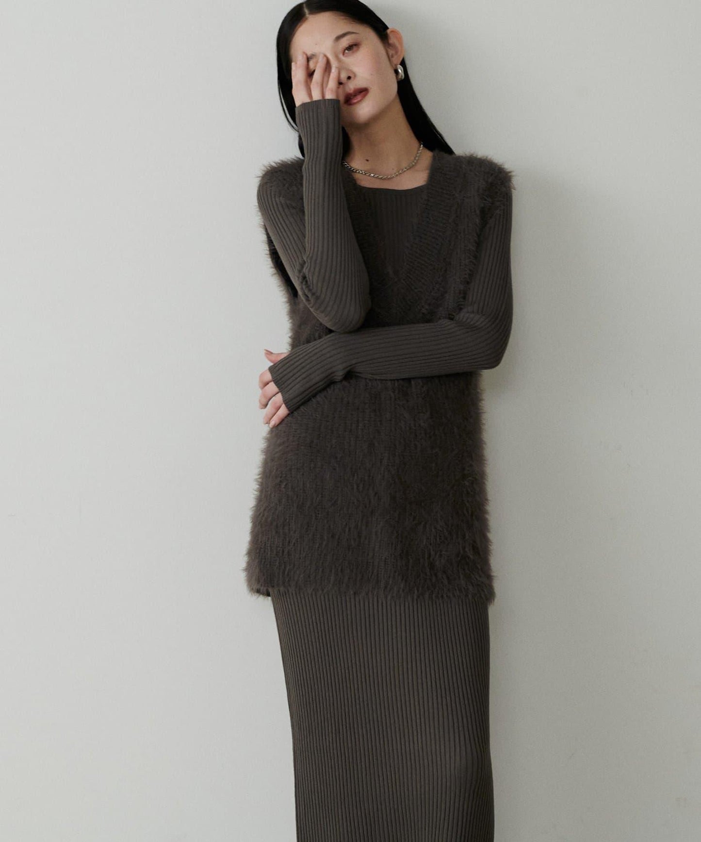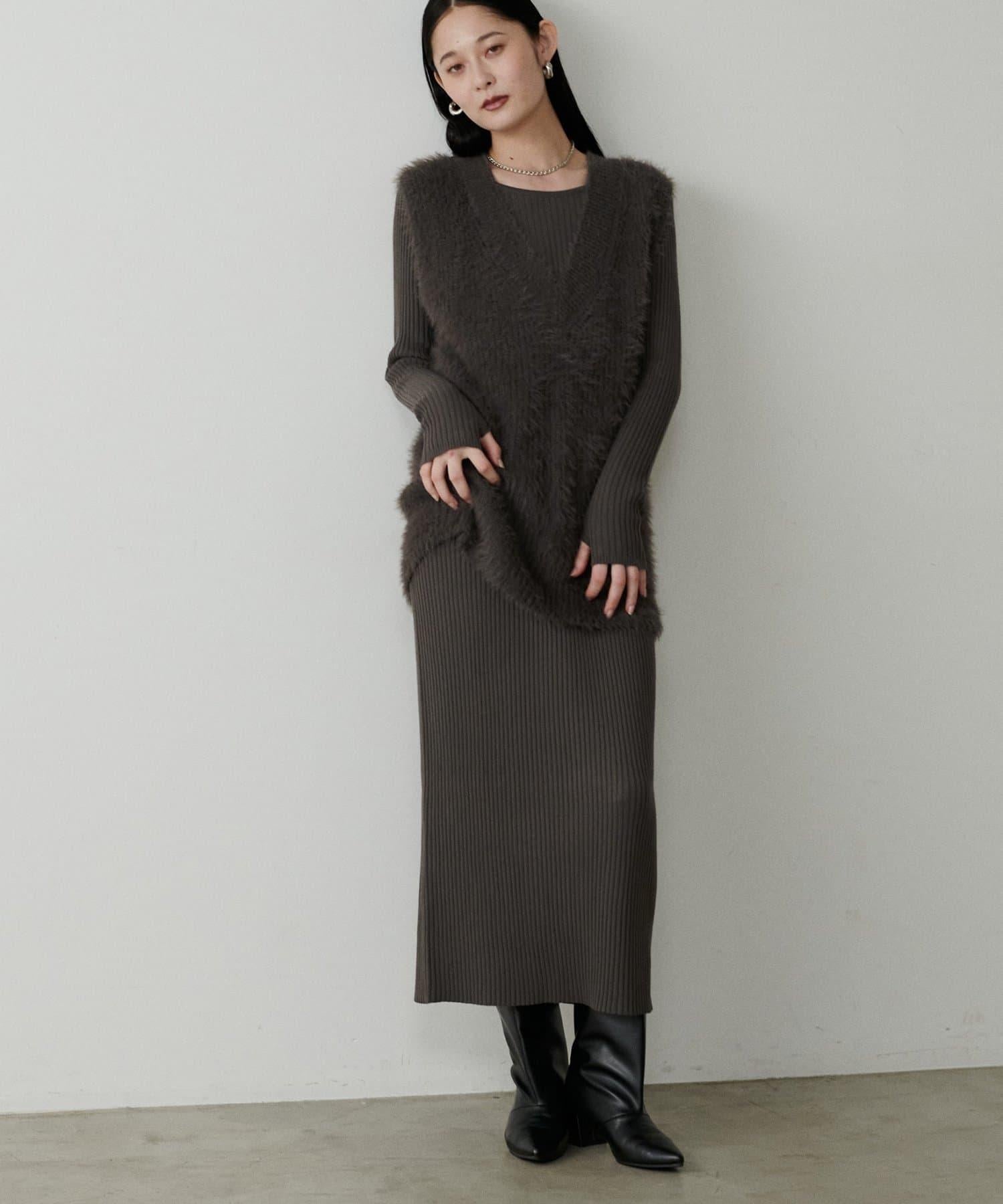 這款單品由一件簡單的羅紋針織連身裙和一件同色羽毛馬甲組成。