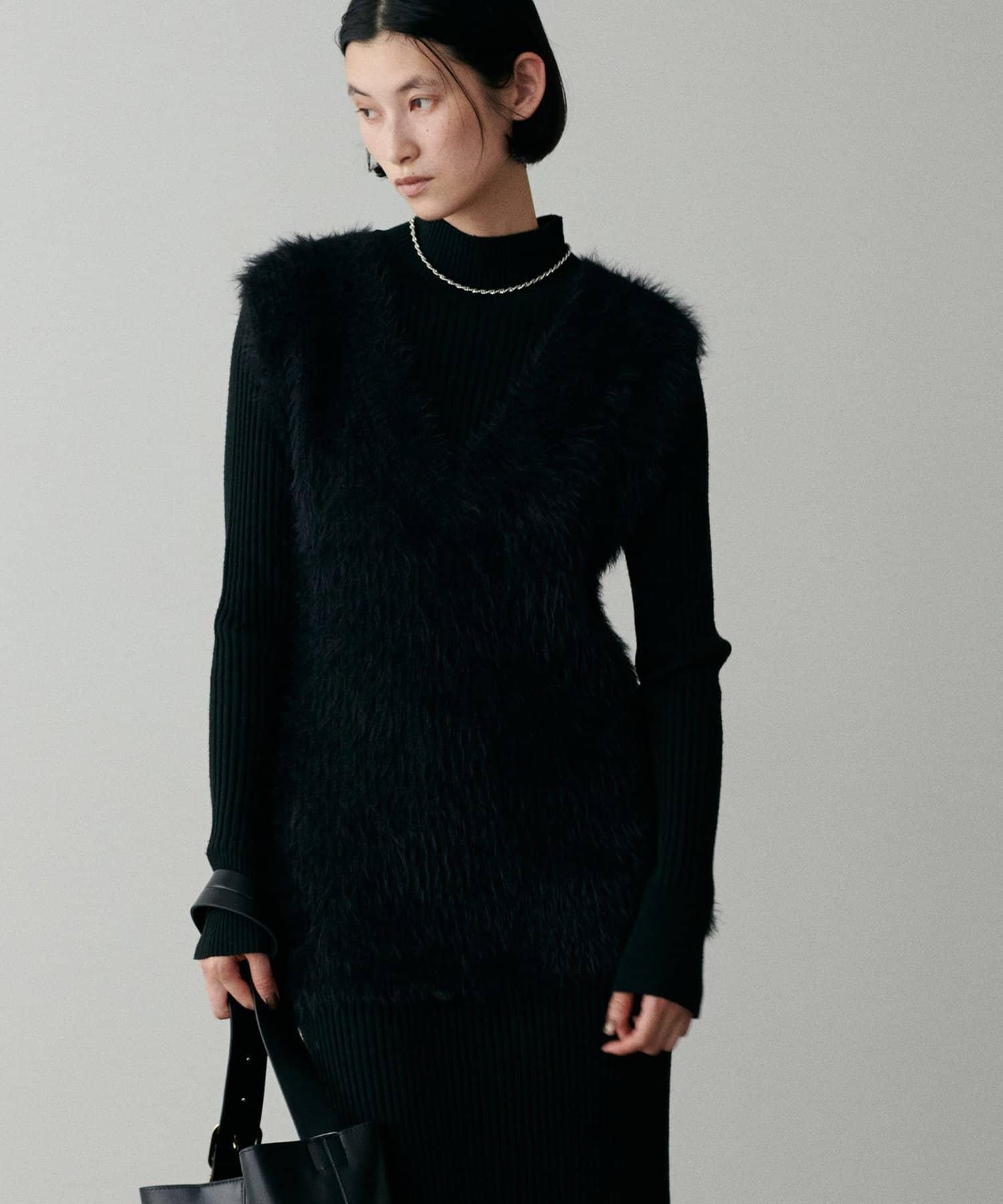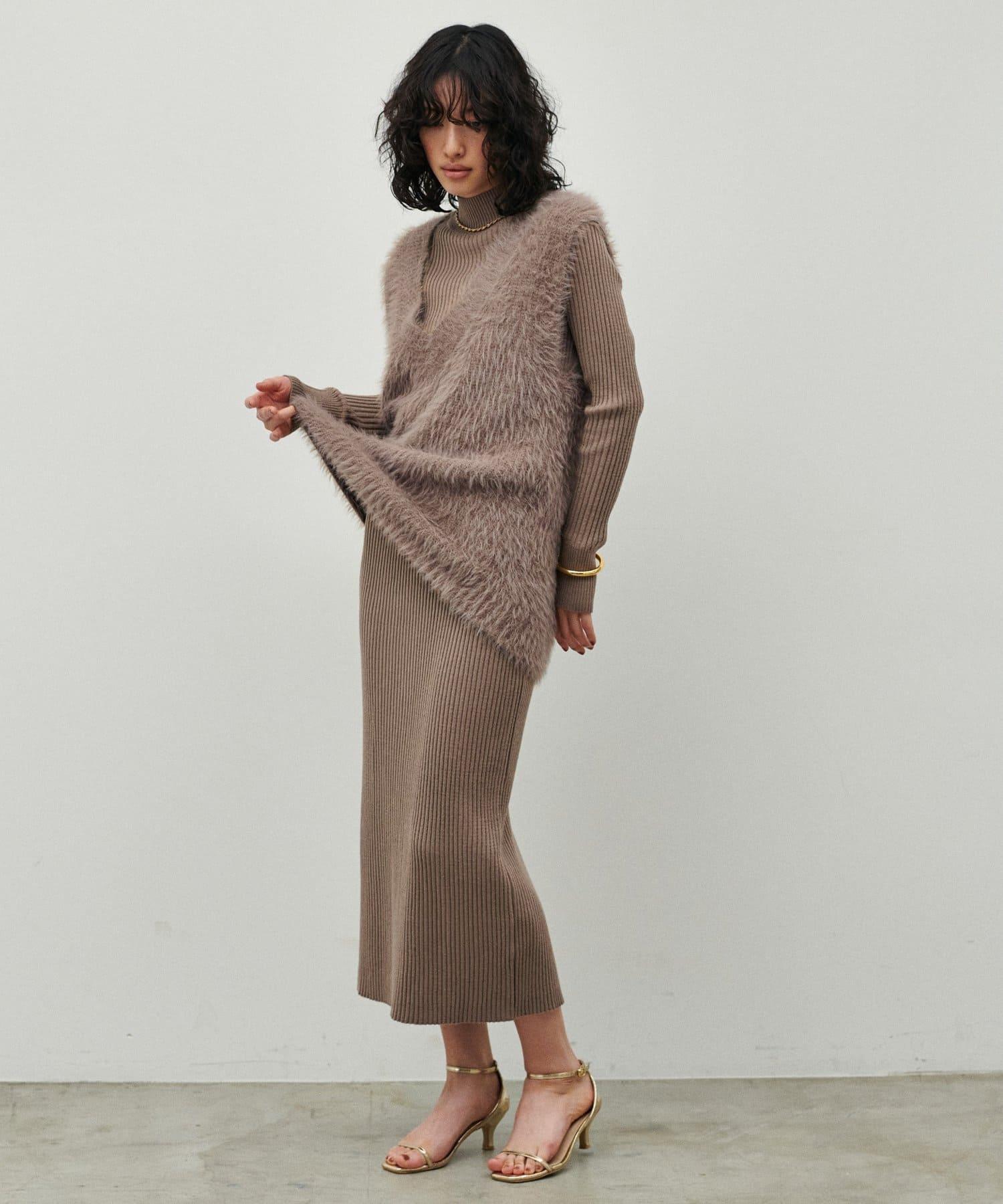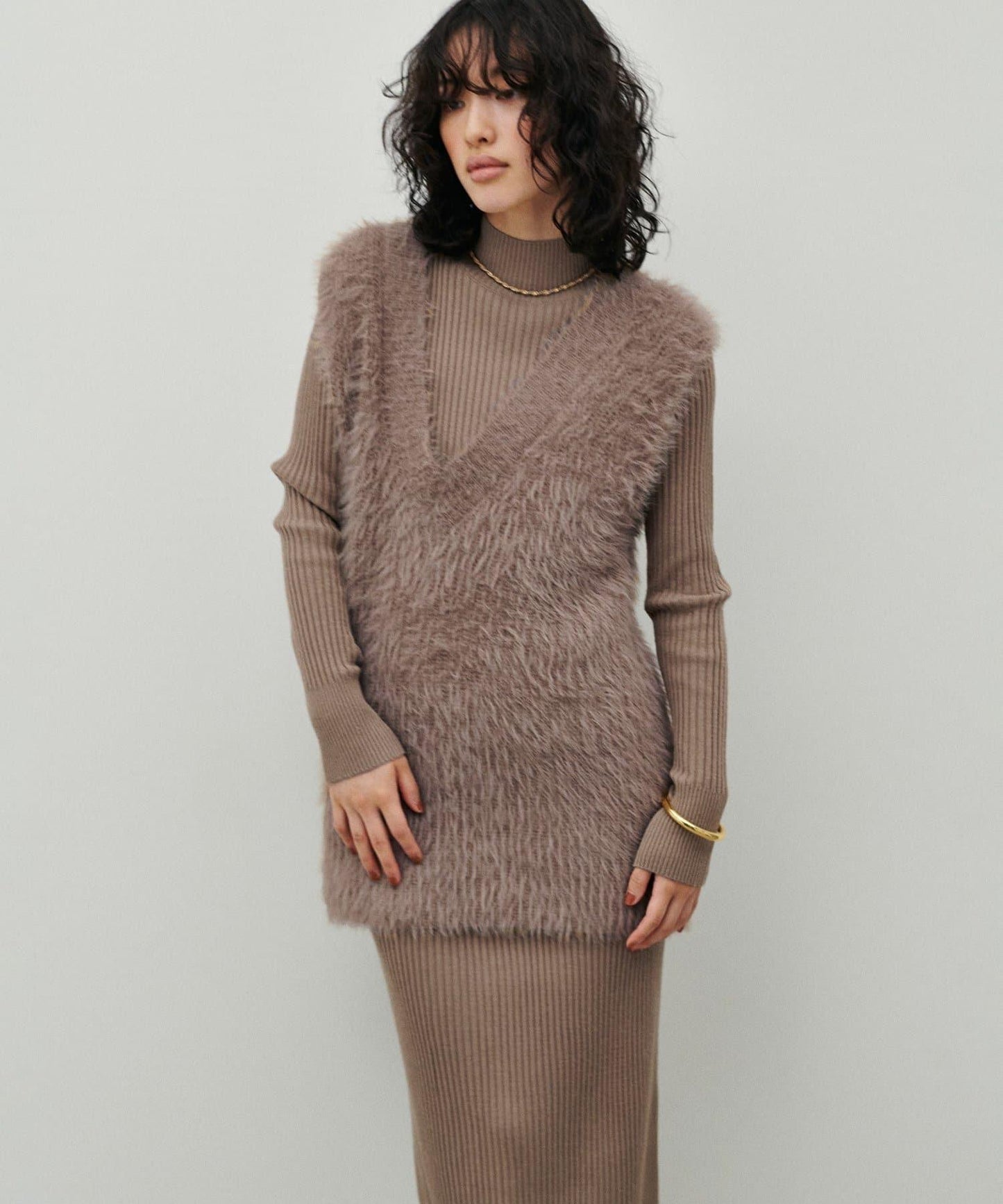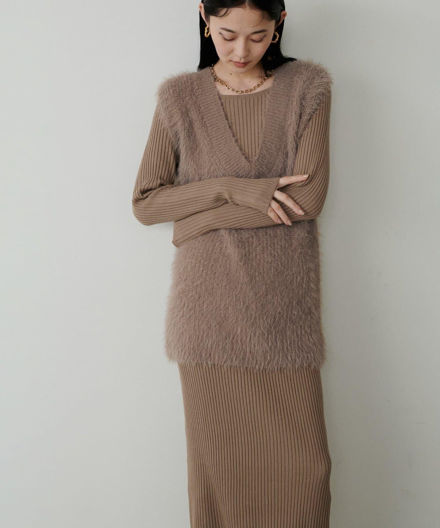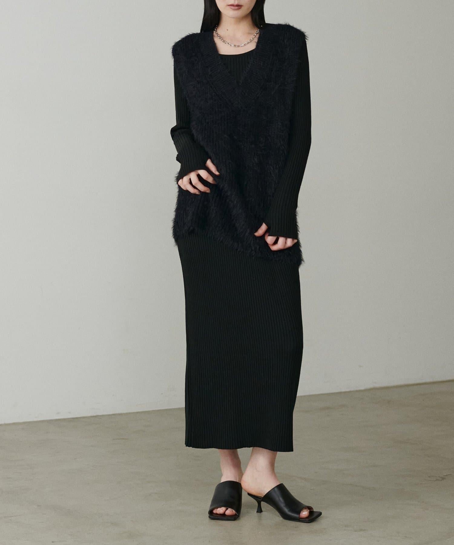 這款單品由一件簡單的羅紋針織連身裙和一件同色羽毛馬甲組成。