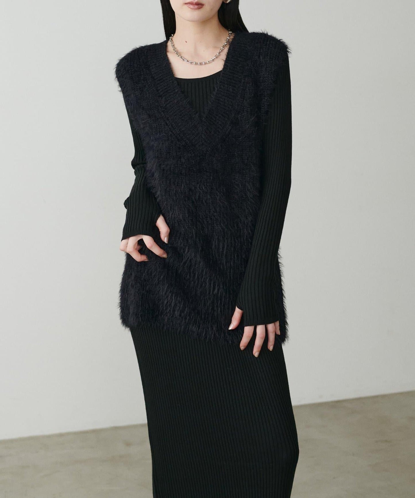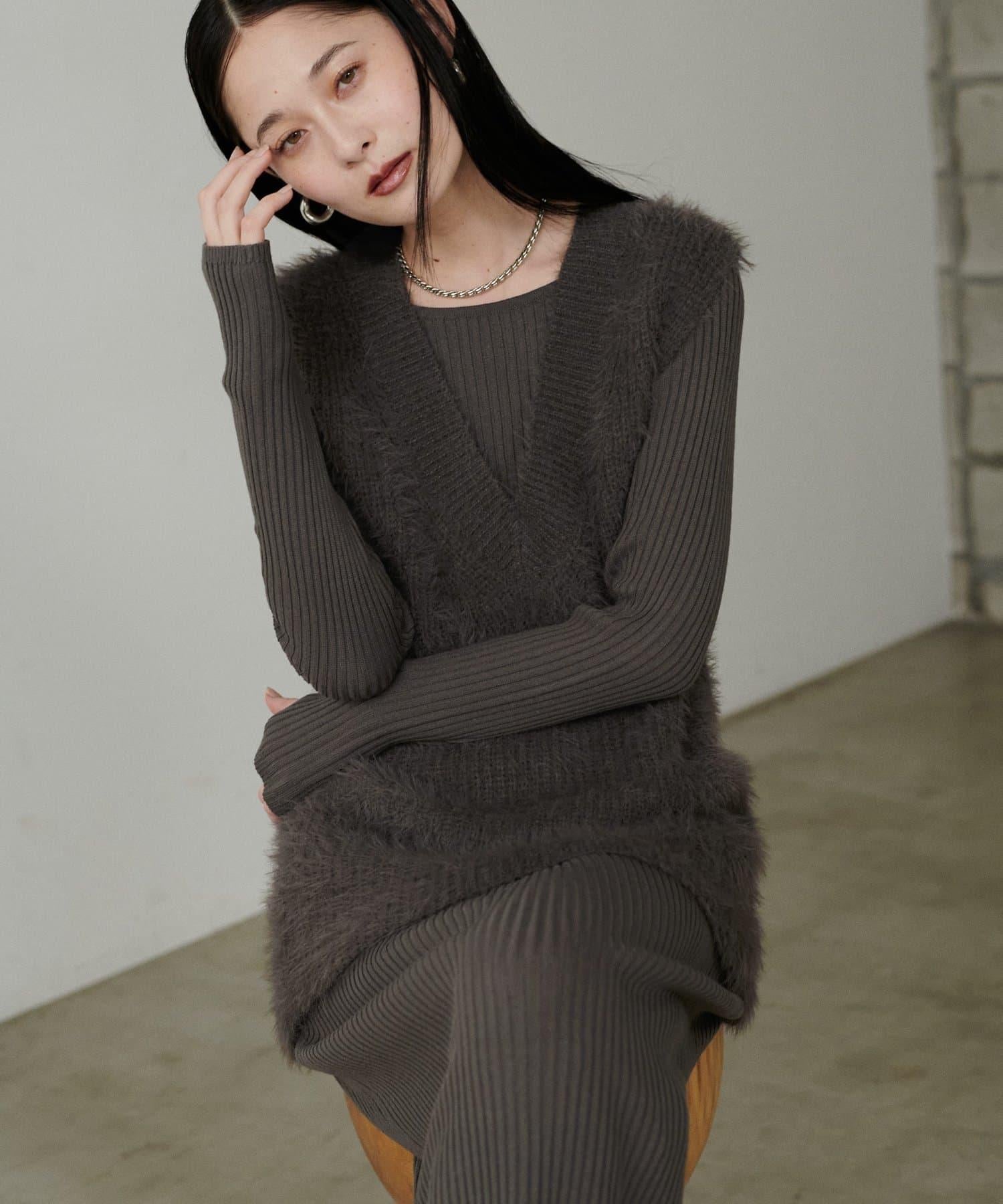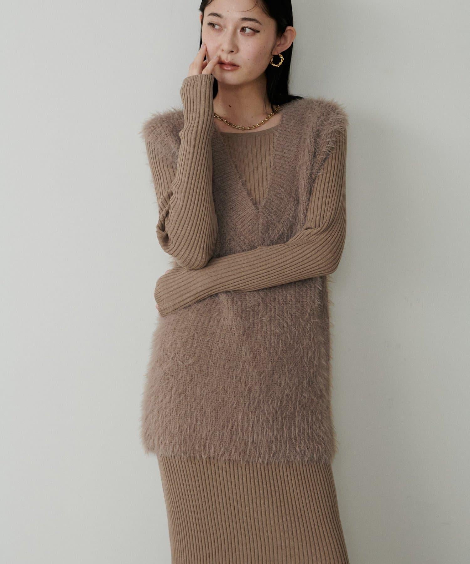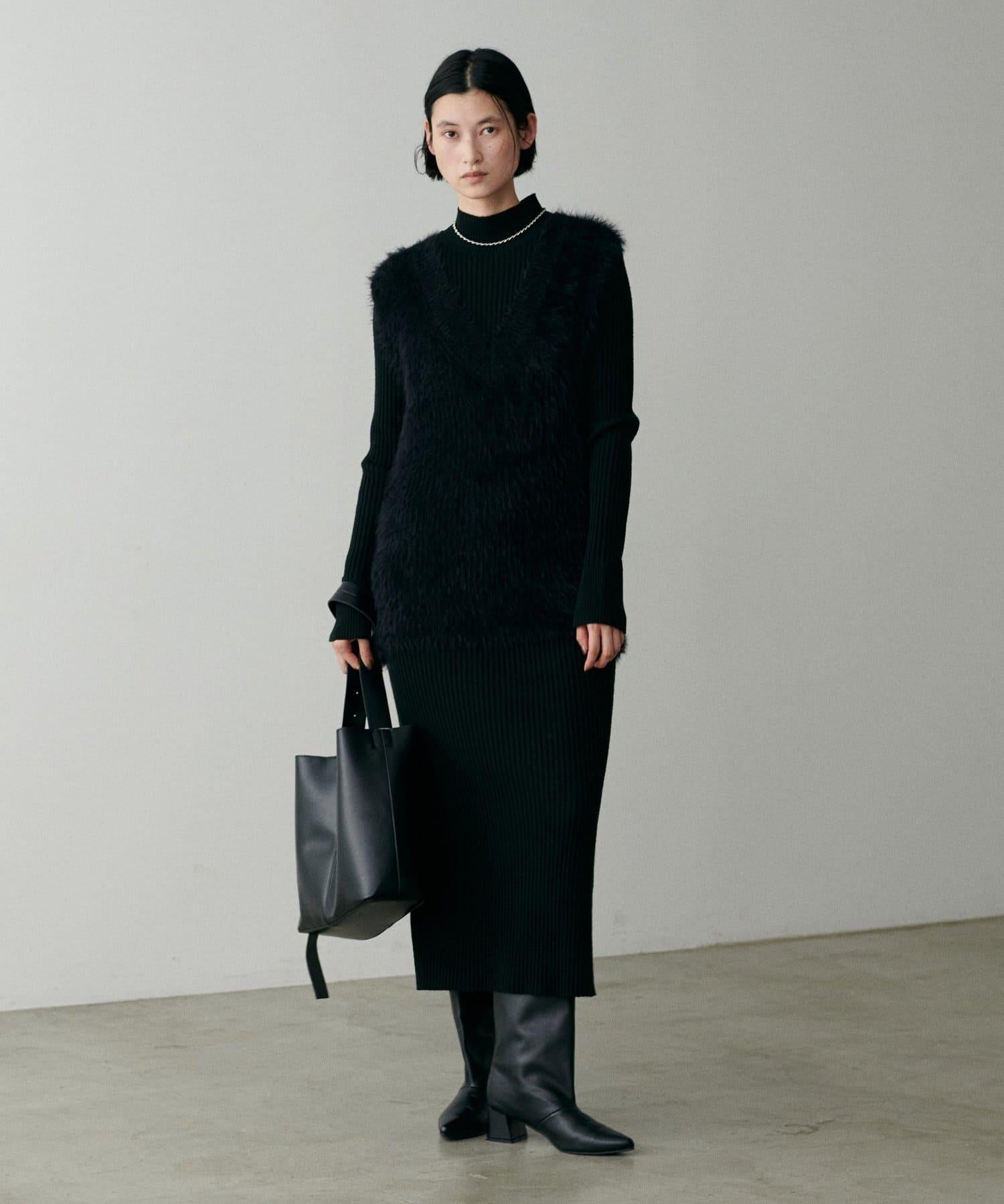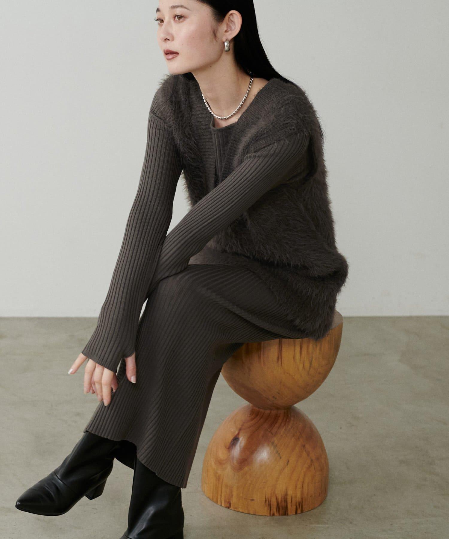這款單品由一件簡單的羅紋針織連身裙和一件同色羽毛馬甲組成。