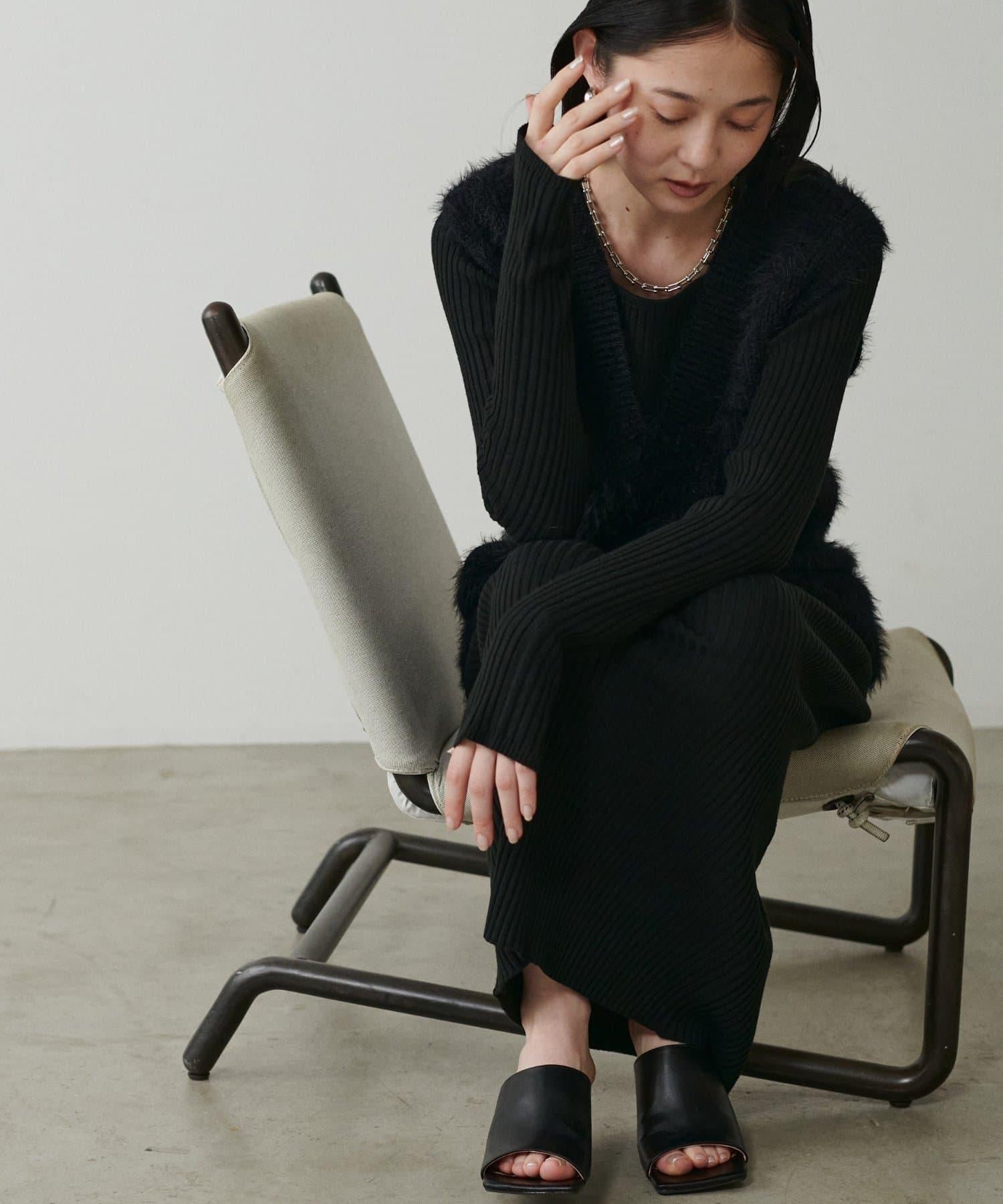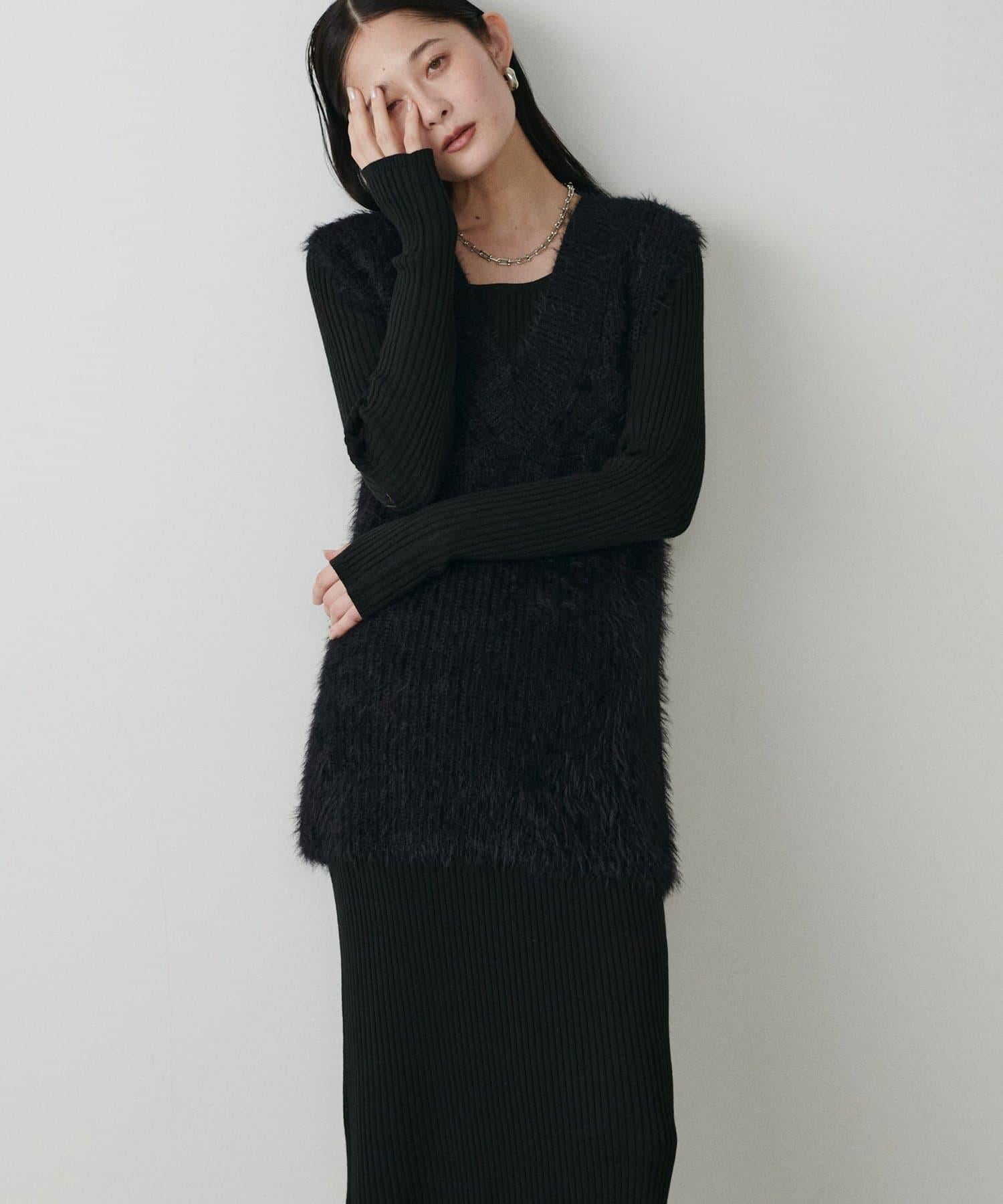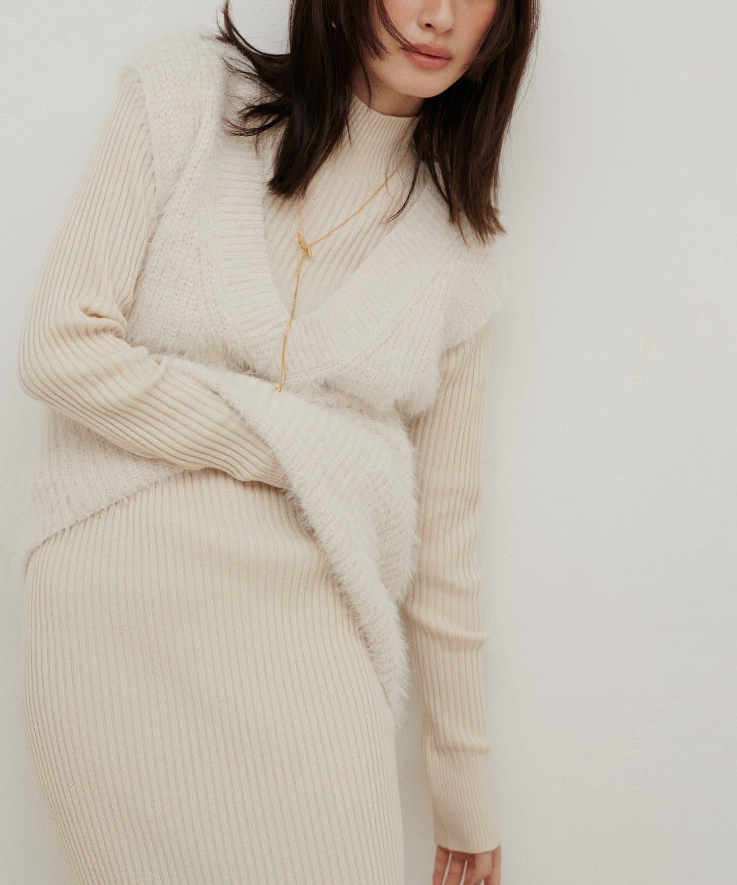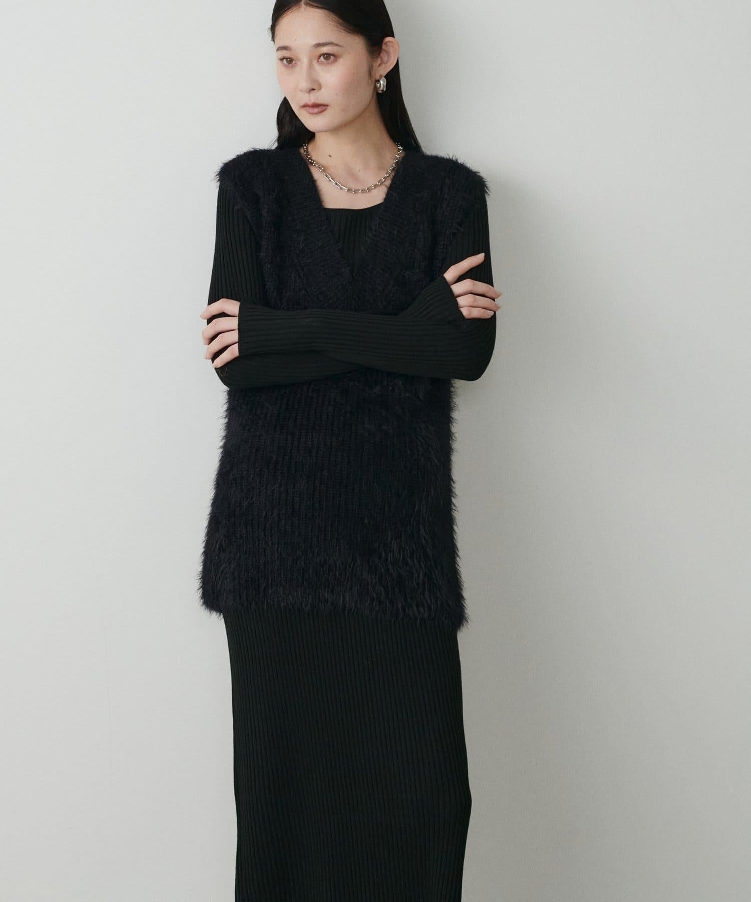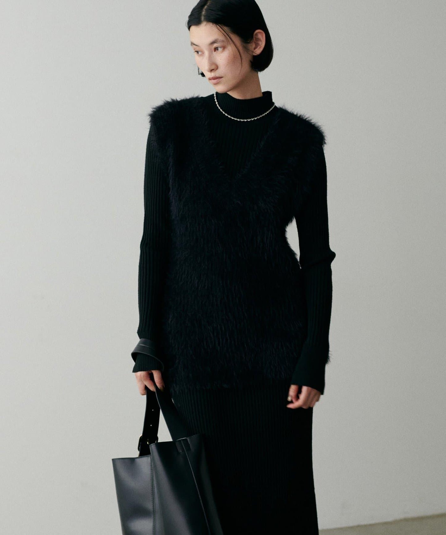 這款單品由一件簡單的羅紋針織連身裙和一件同色羽毛馬甲組成。