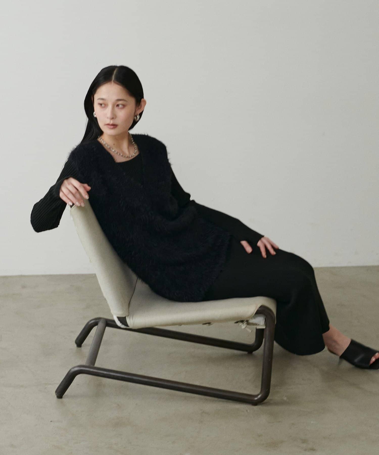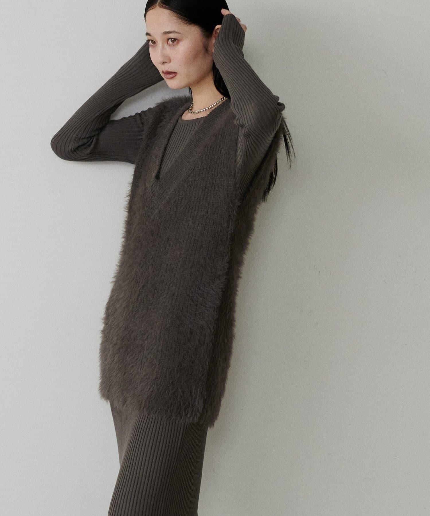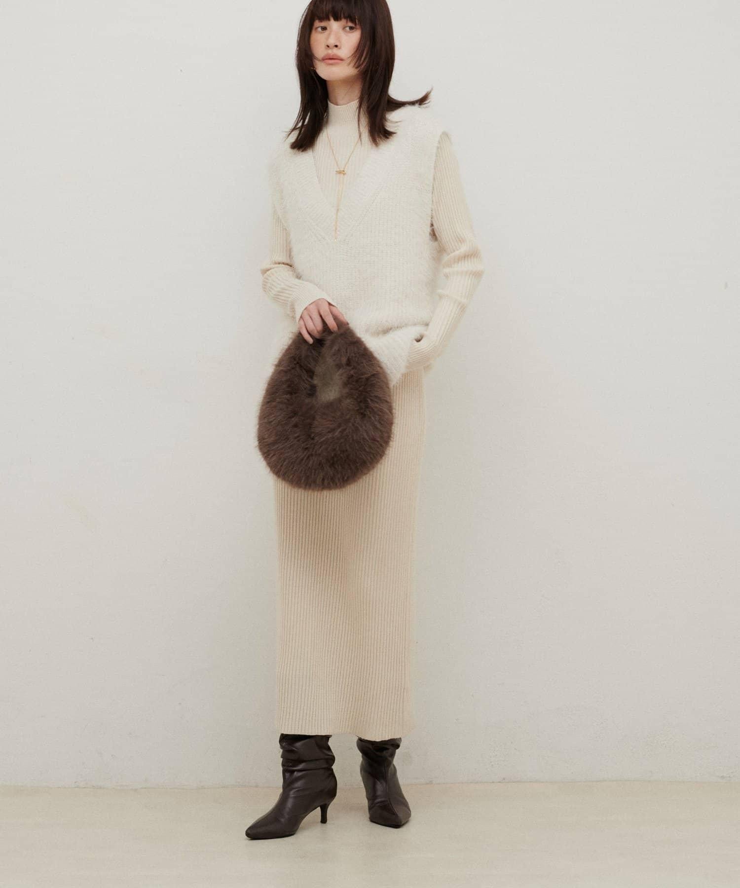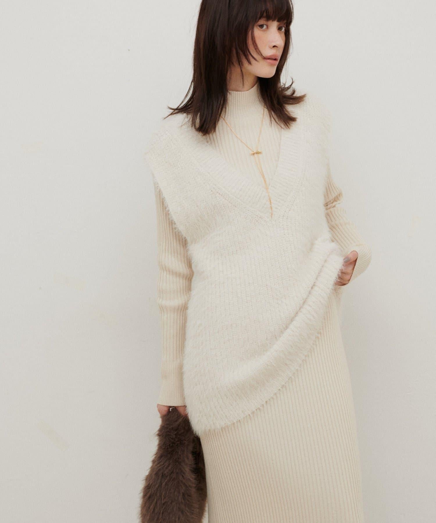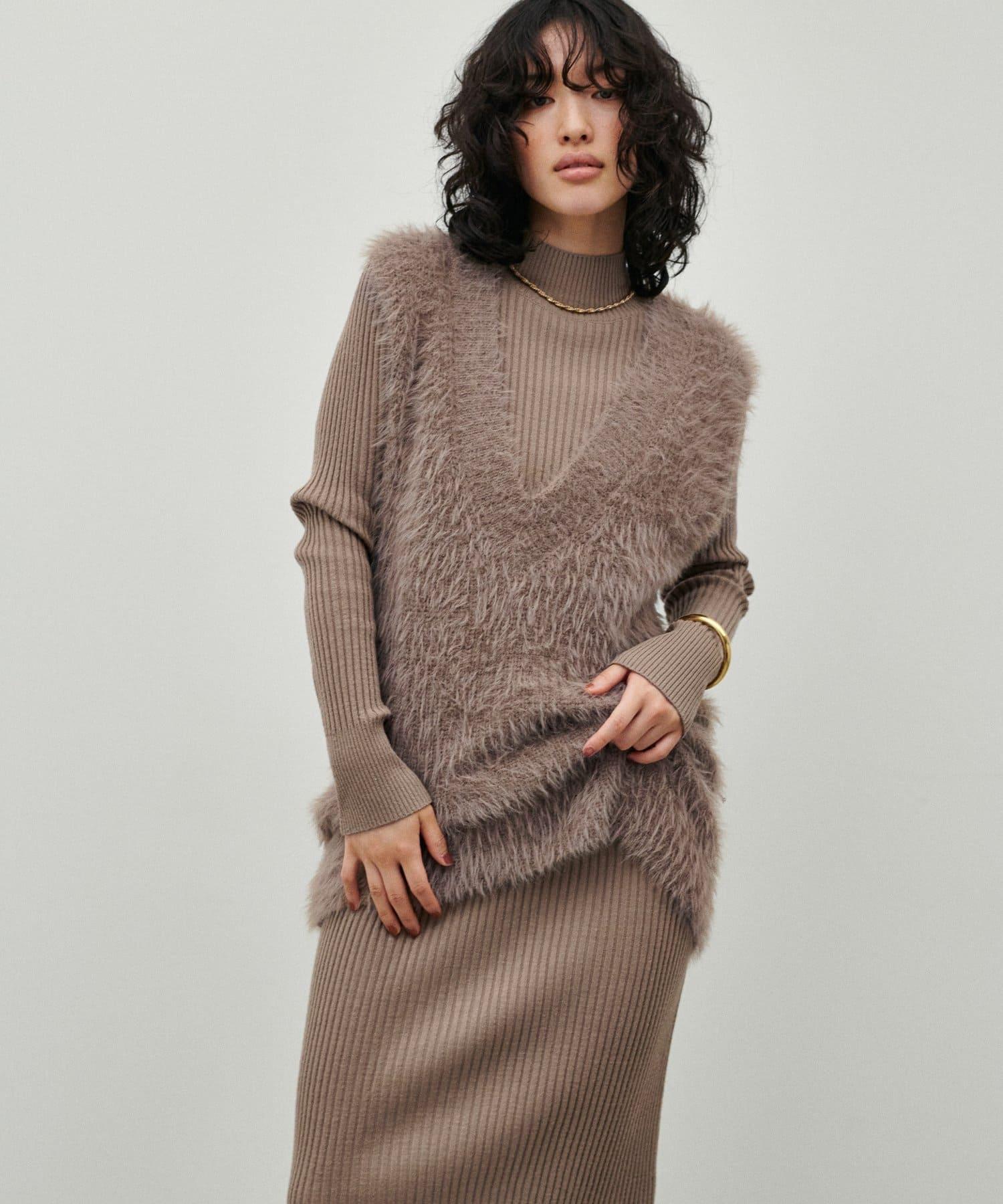 這款單品由一件簡單的羅紋針織連身裙和一件同色羽毛馬甲組成。