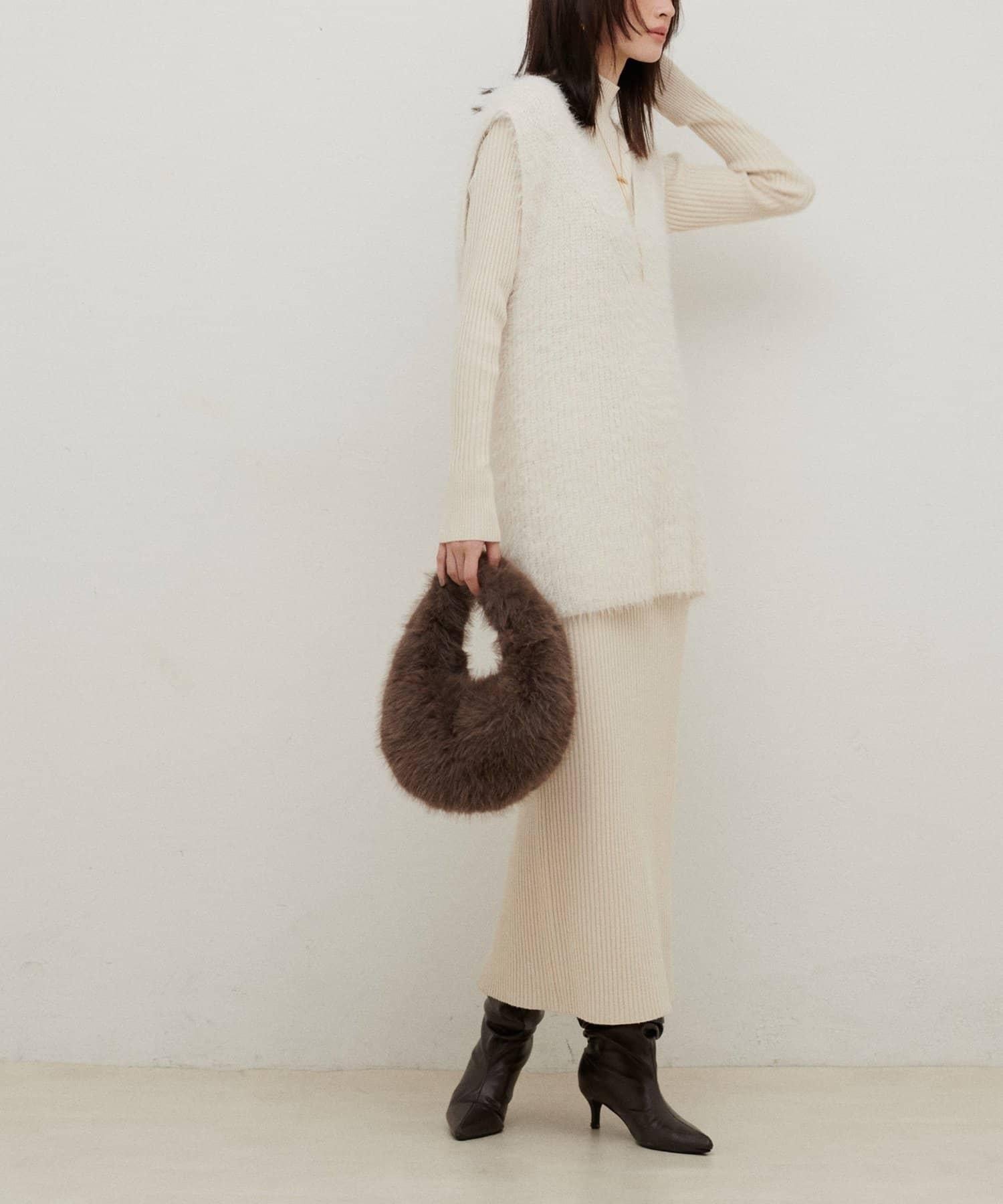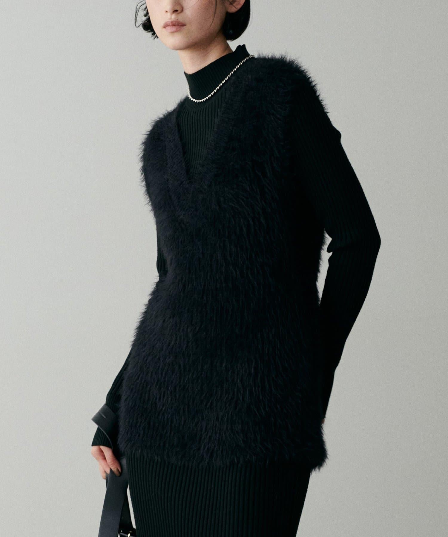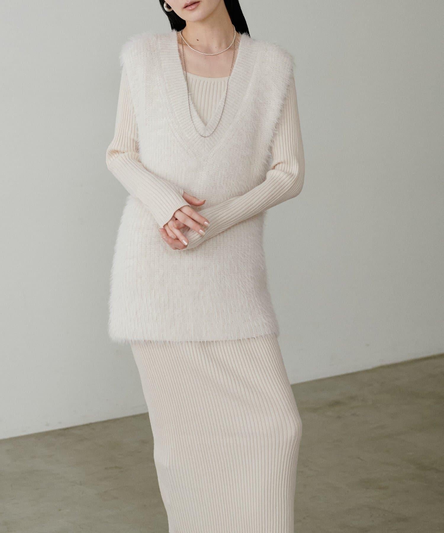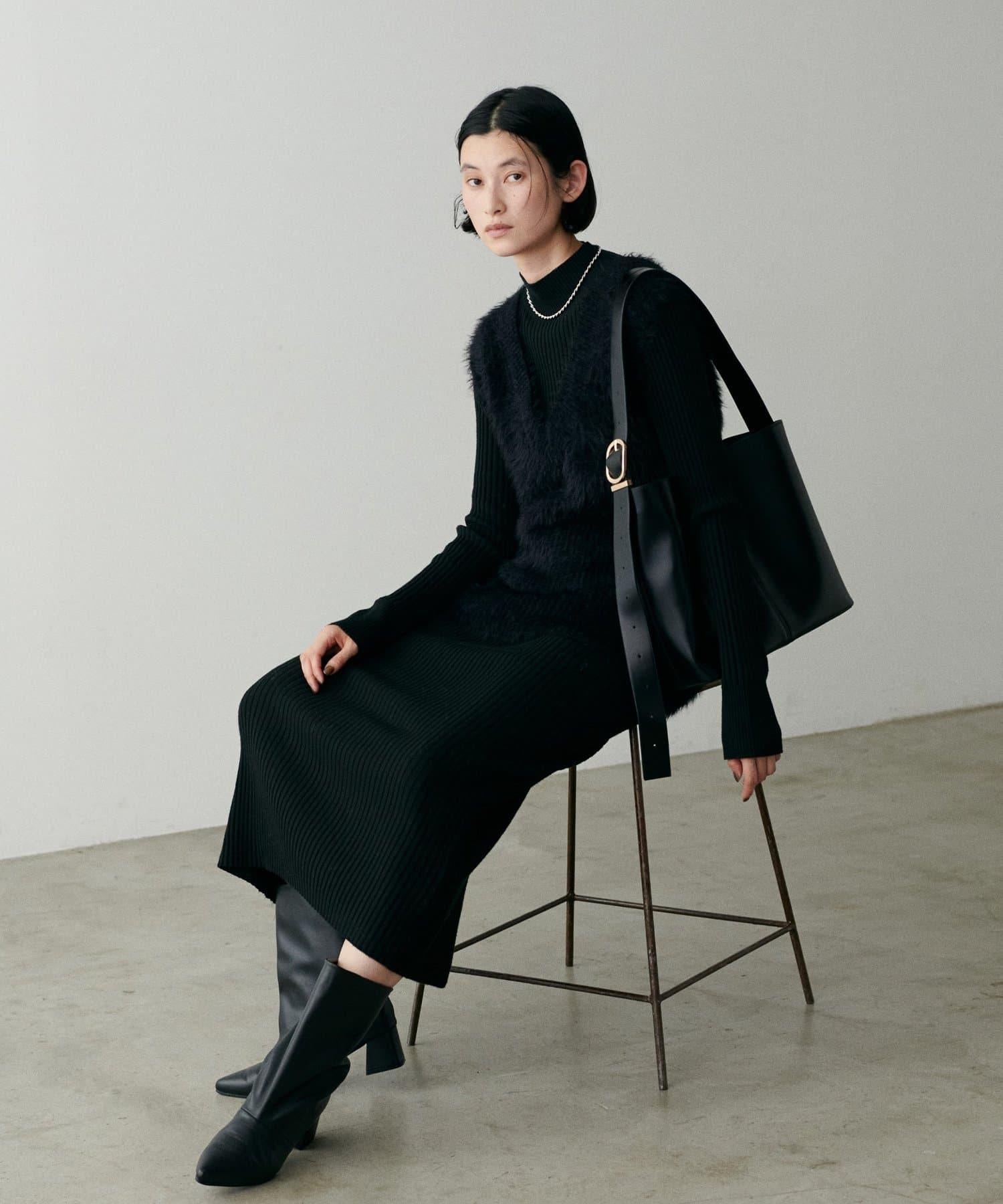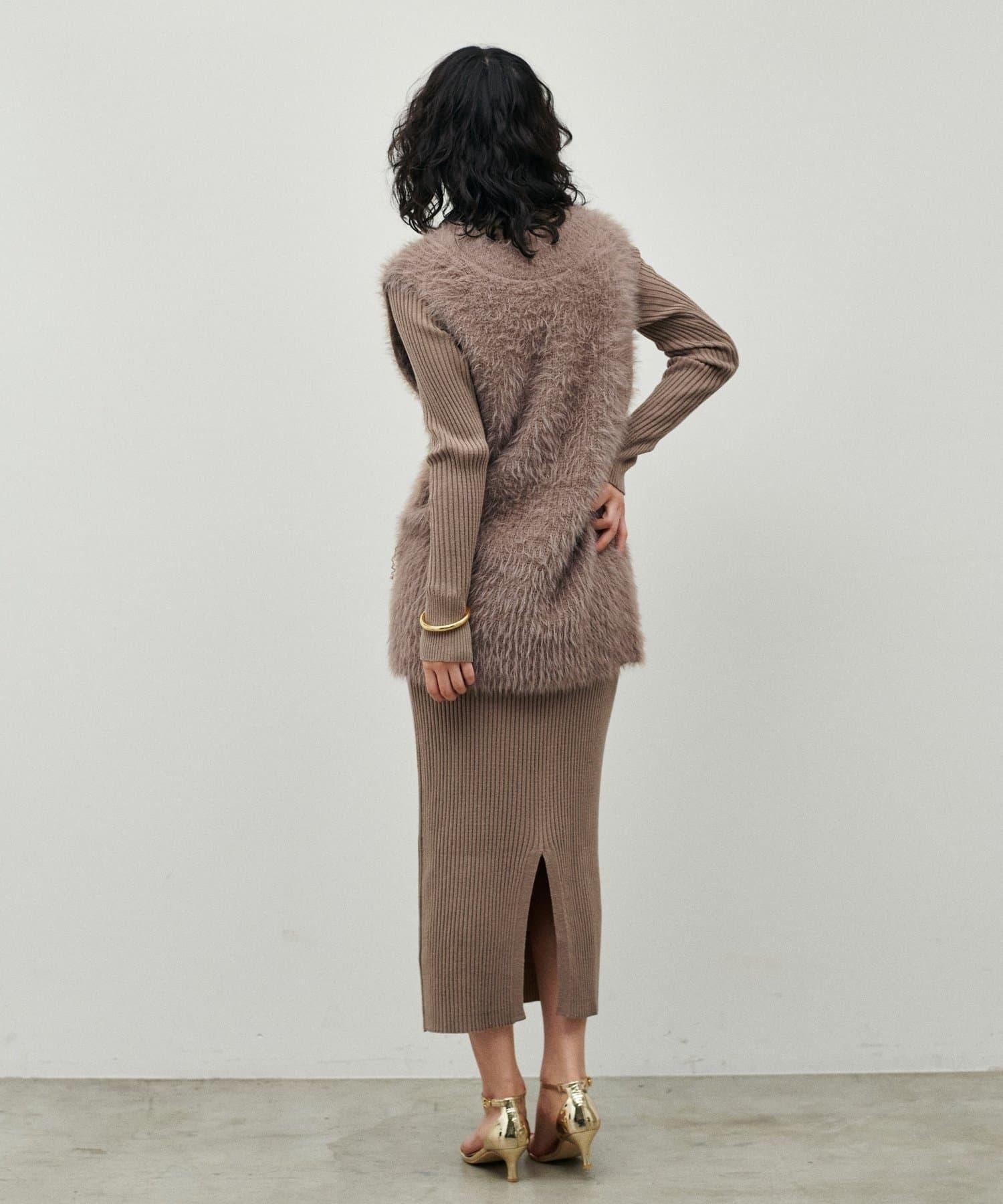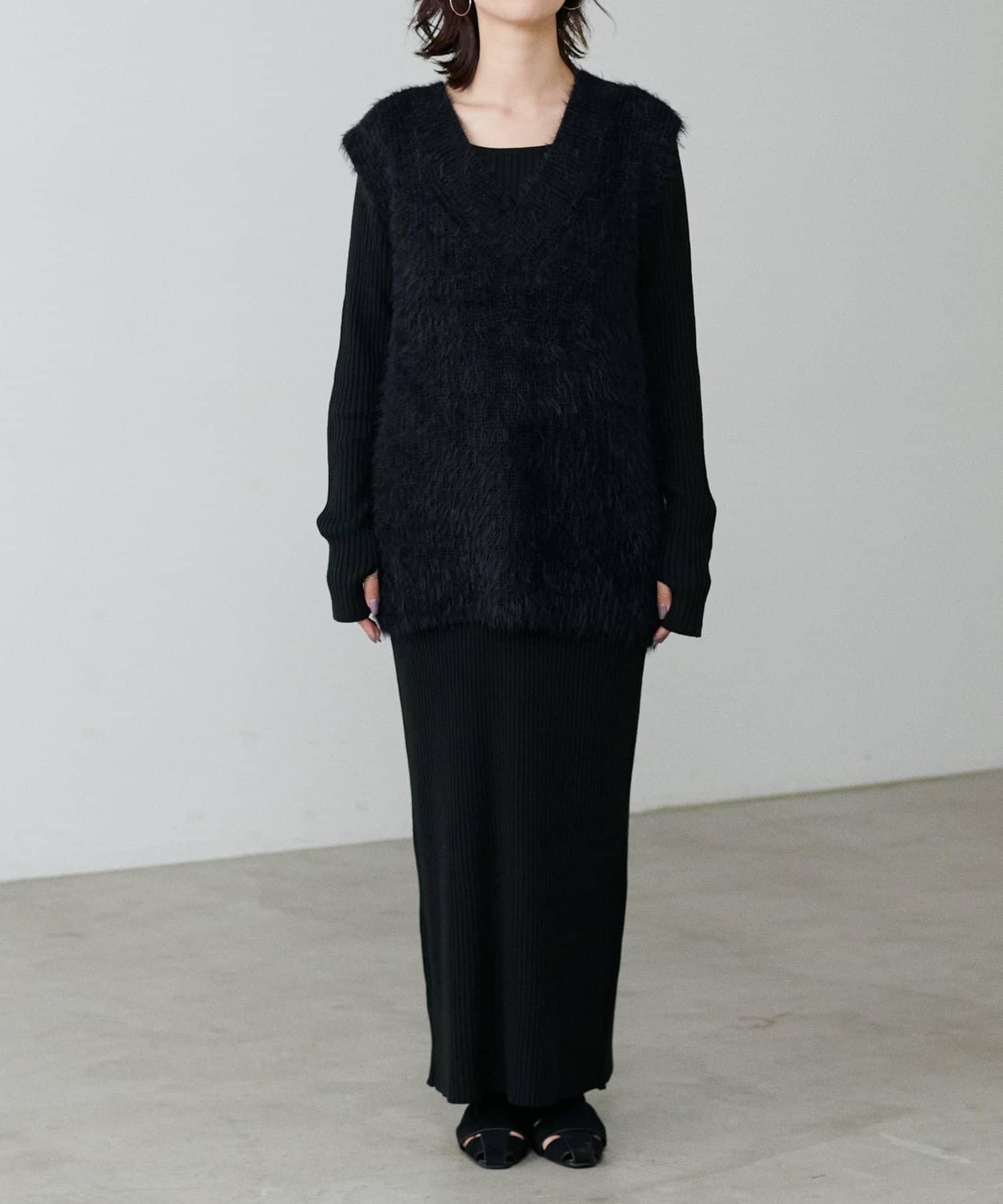 這款單品由一件簡單的羅紋針織連身裙和一件同色羽毛馬甲組成。