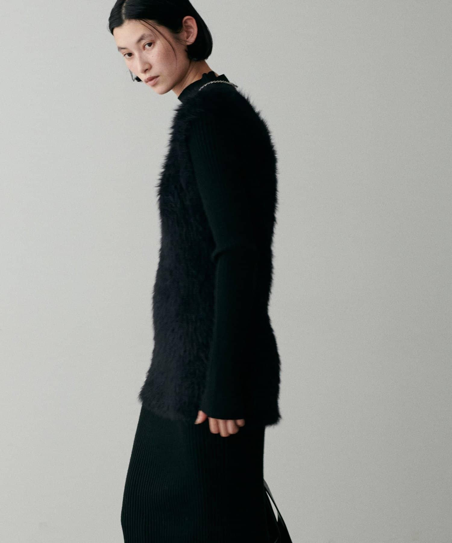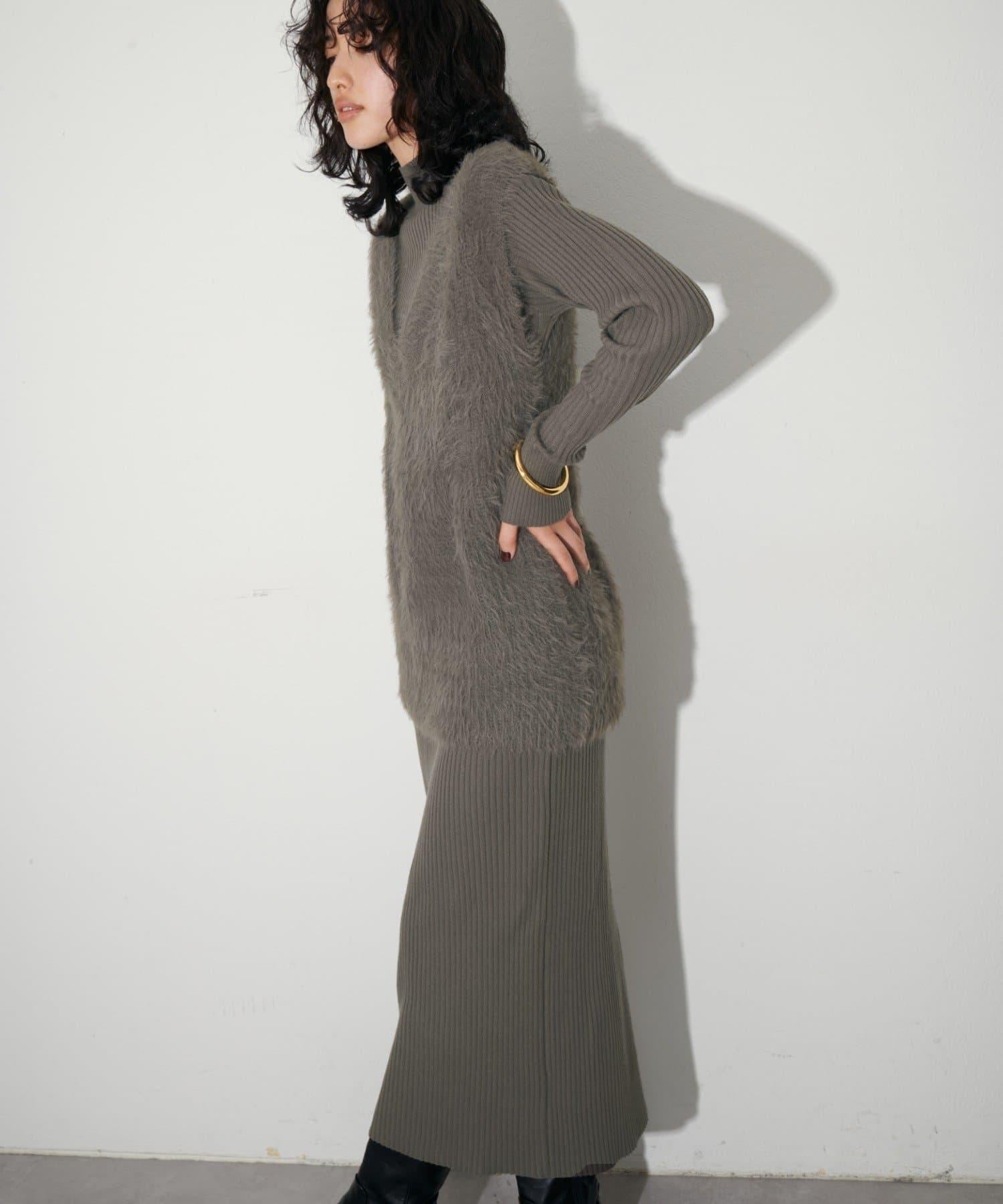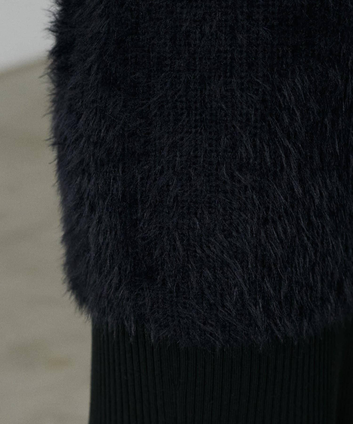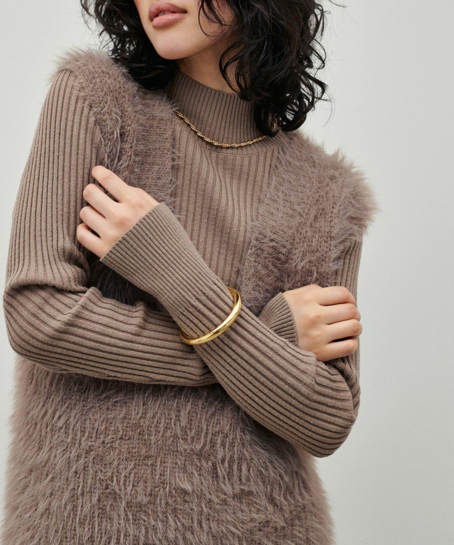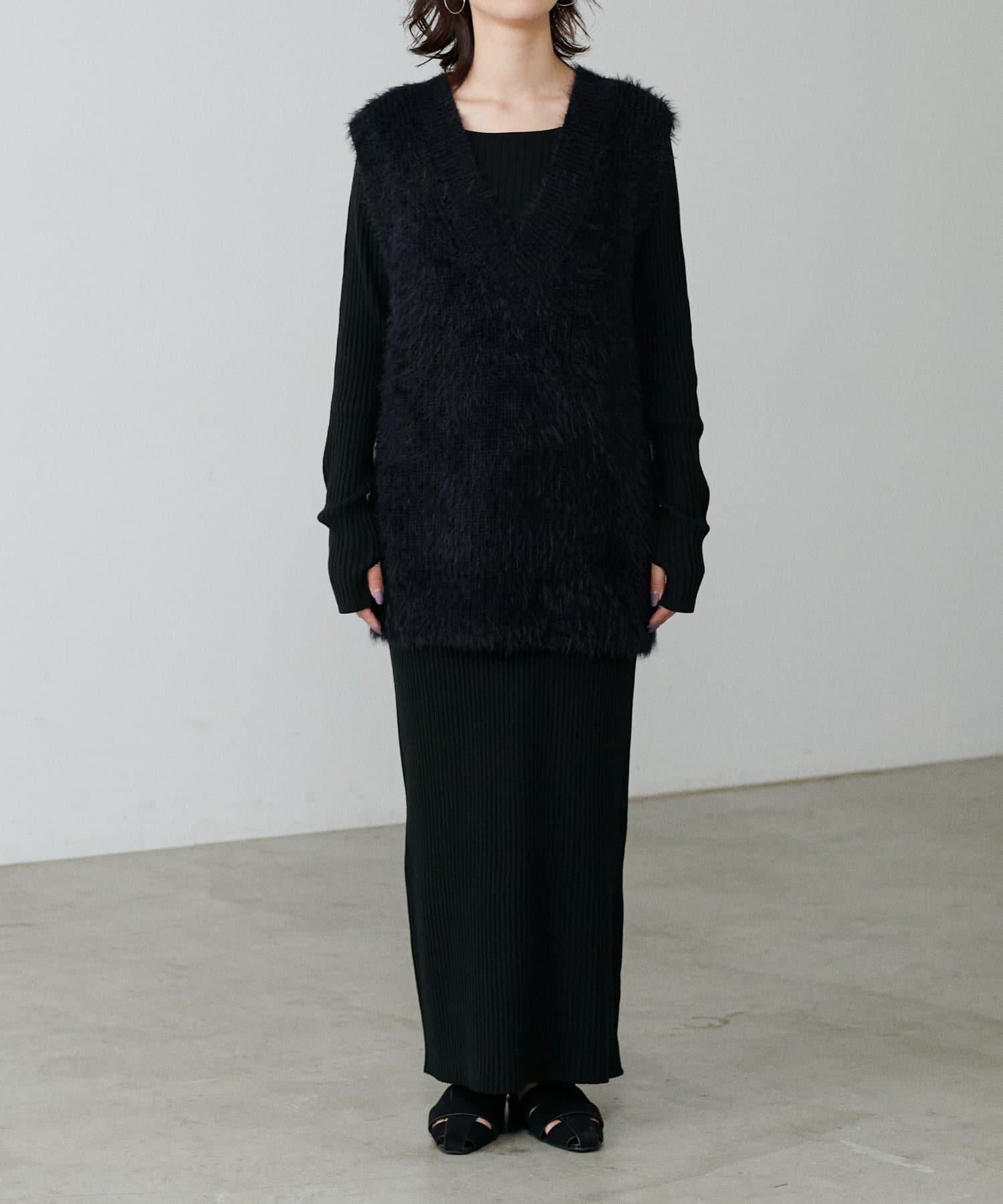 這款單品由一件簡單的羅紋針織連身裙和一件同色羽毛馬甲組成。