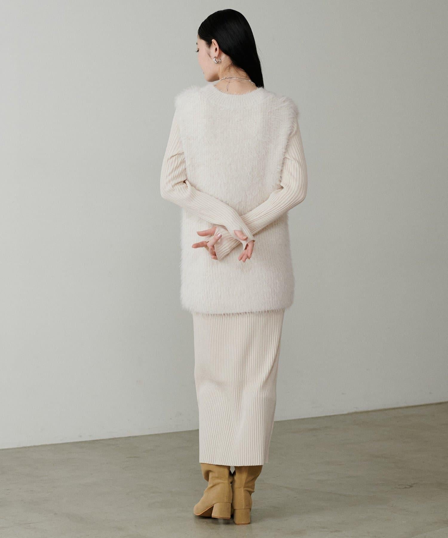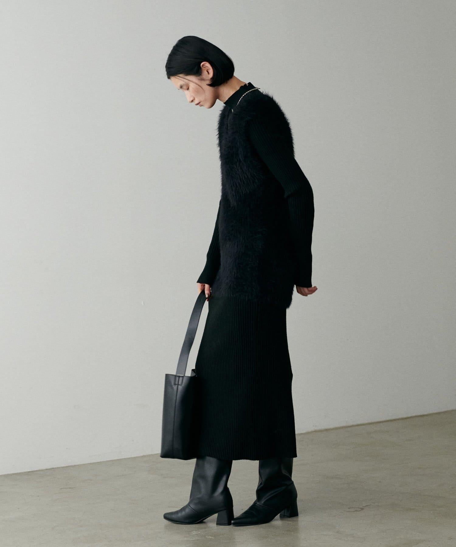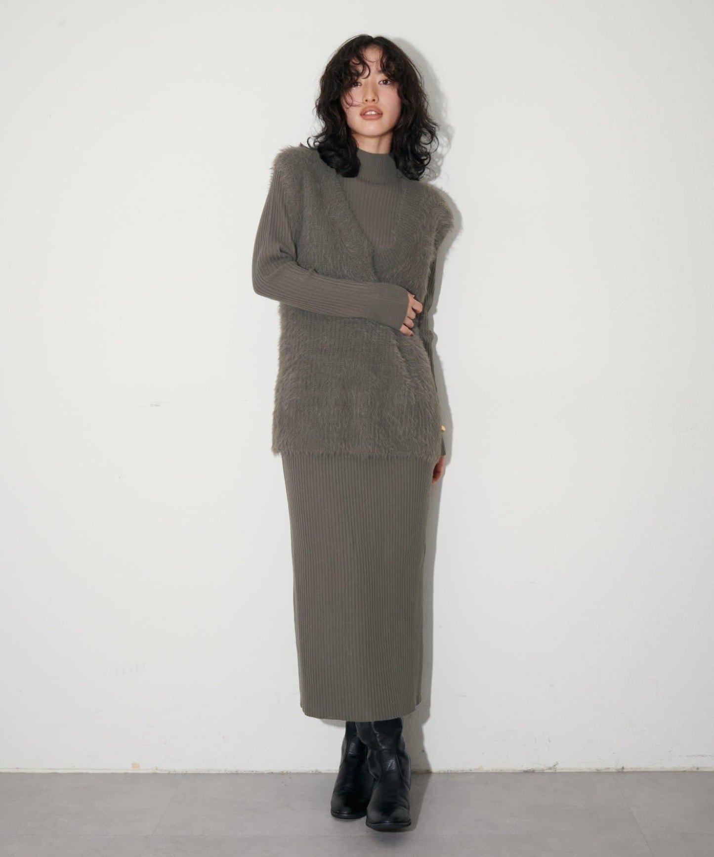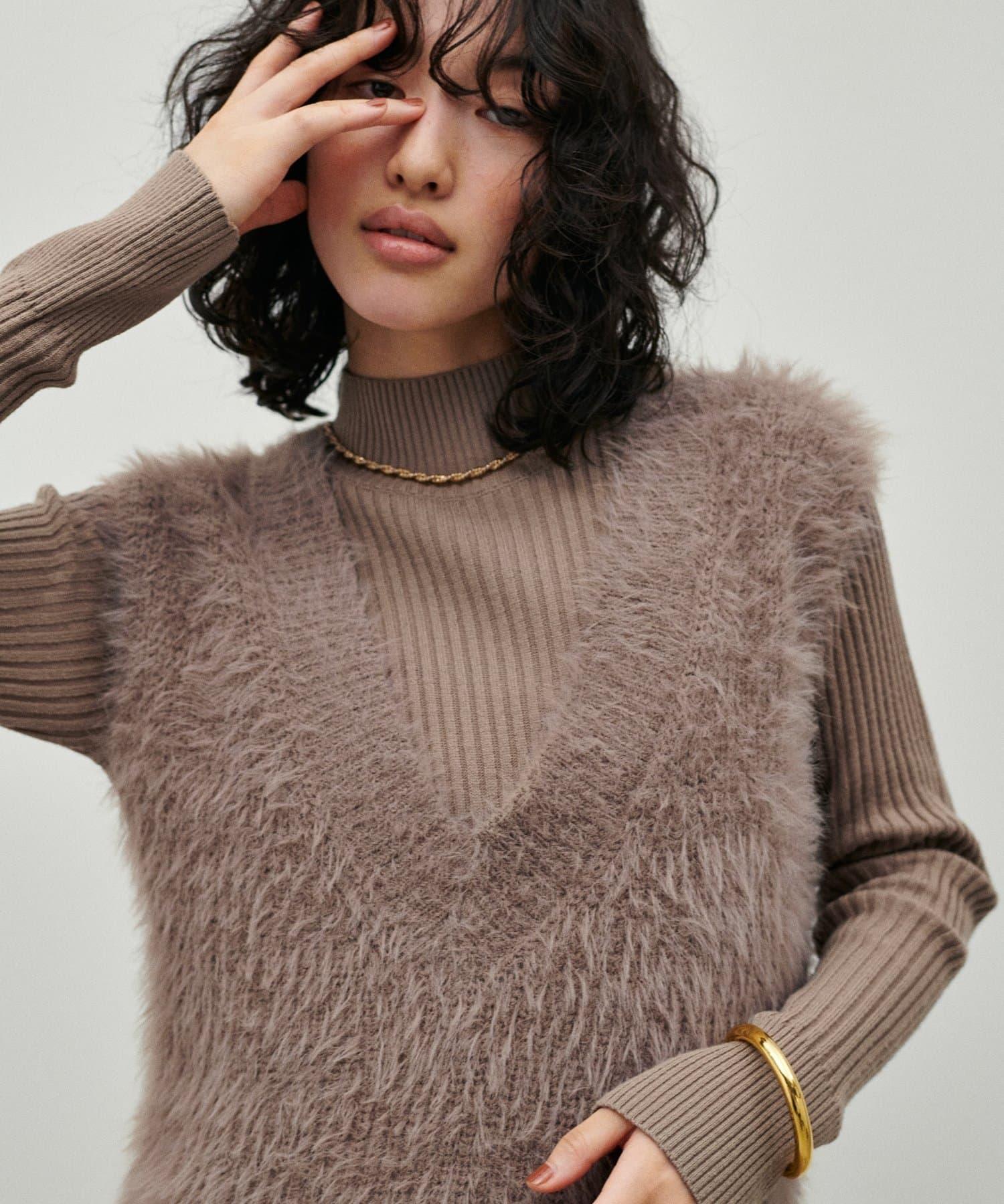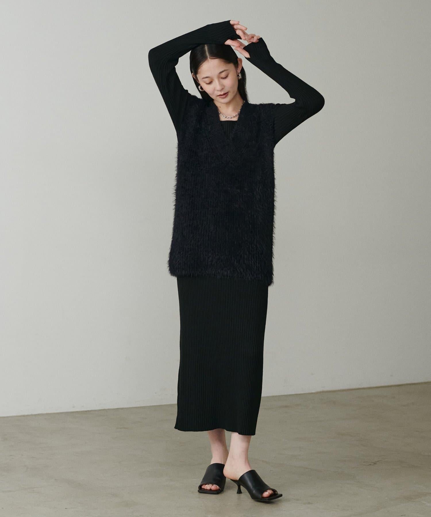 這款單品由一件簡單的羅紋針織連身裙和一件同色羽毛馬甲組成。
