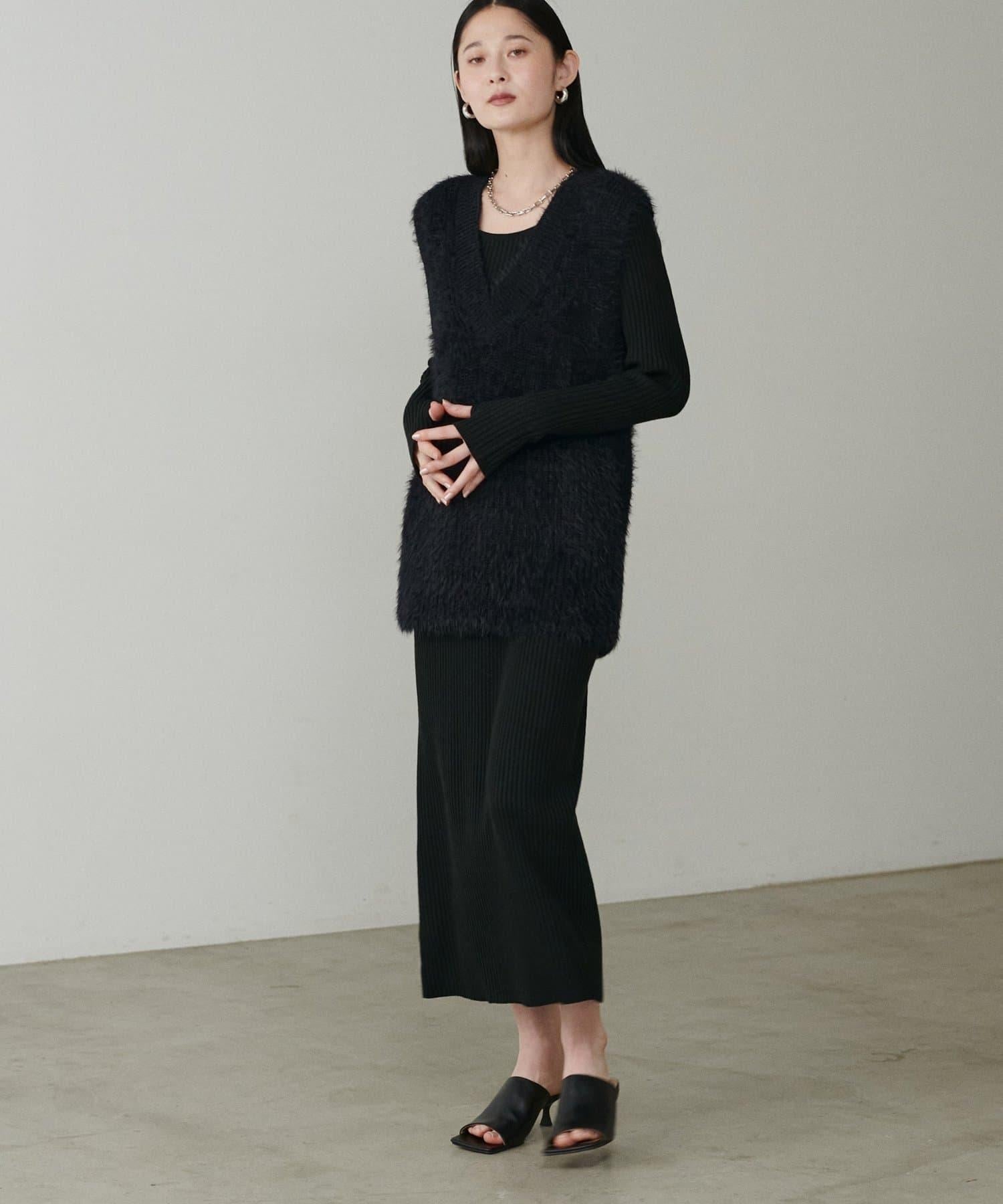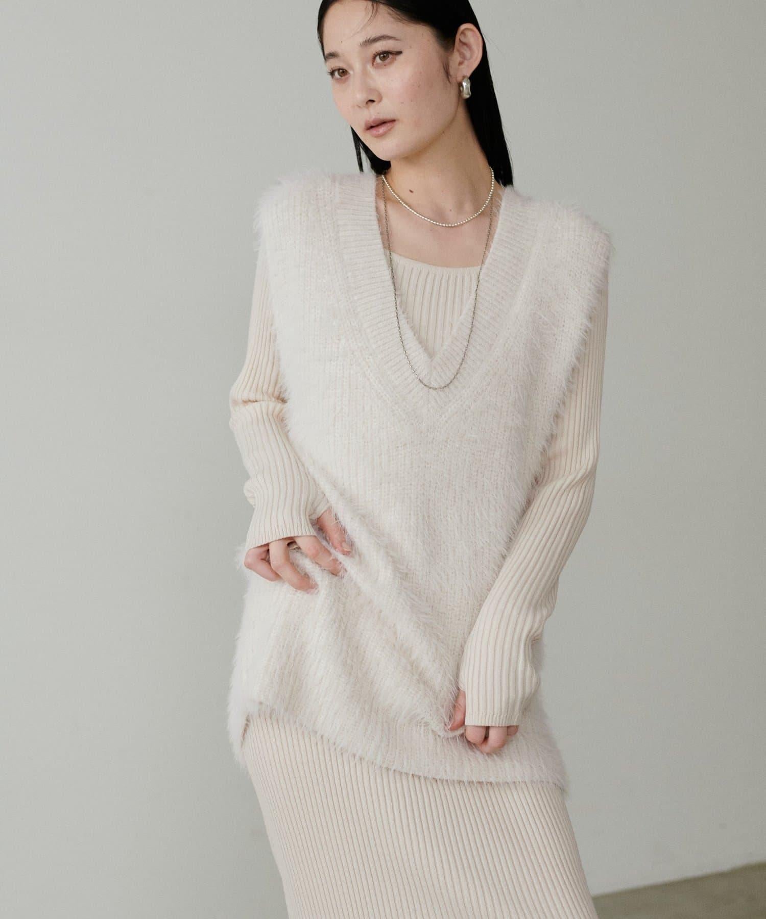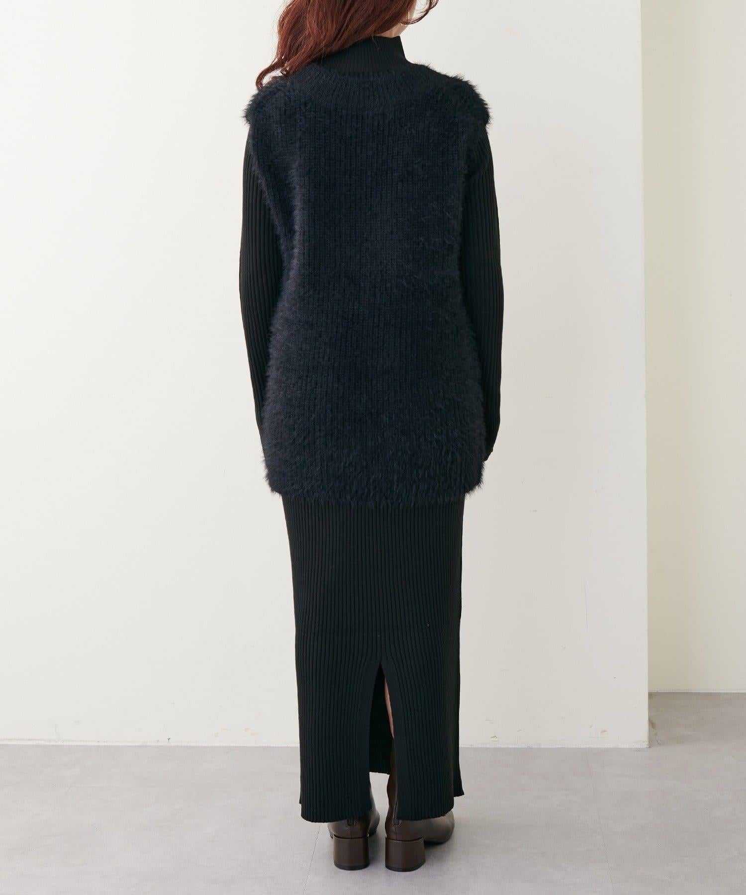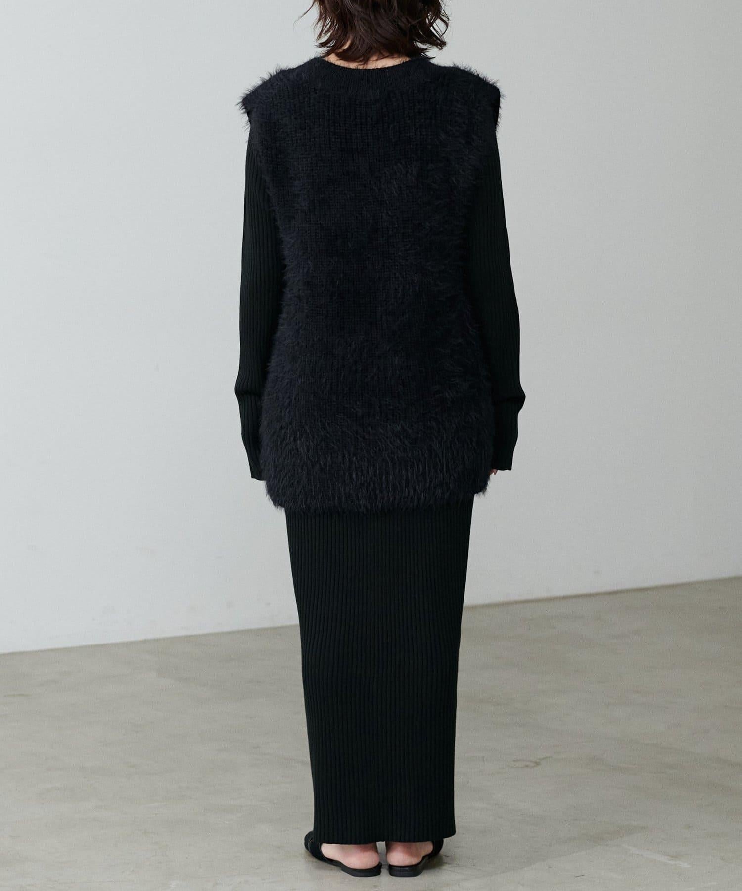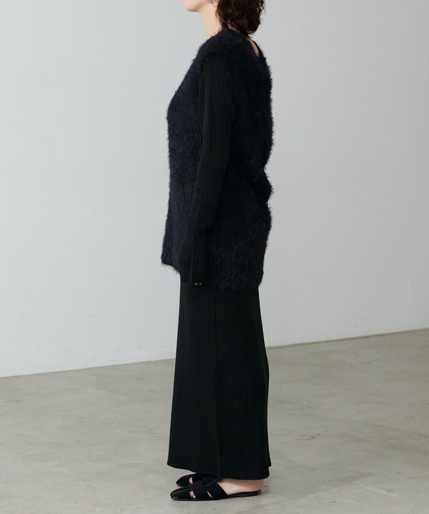 這款單品由一件簡單的羅紋針織連身裙和一件同色羽毛馬甲組成。