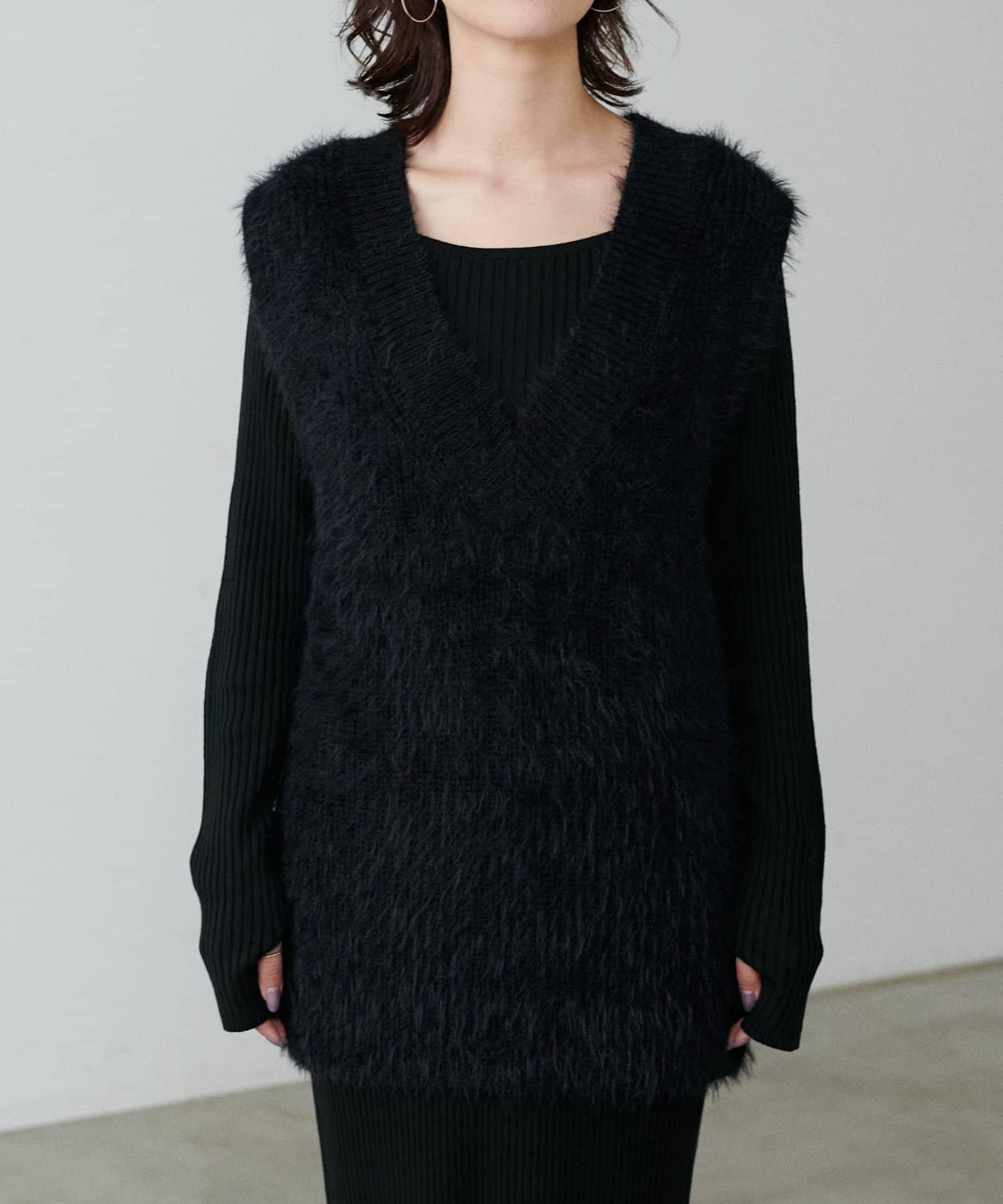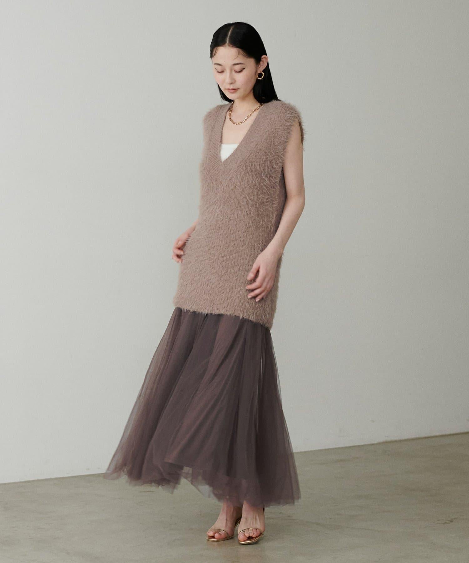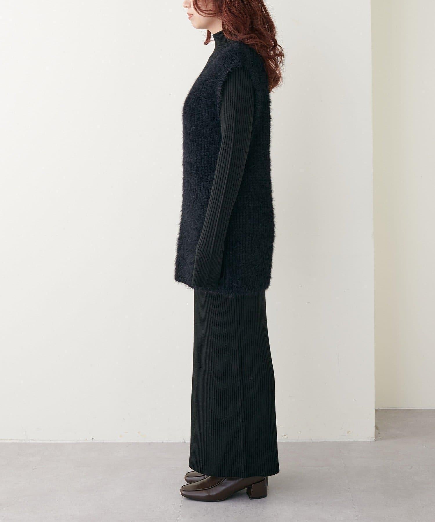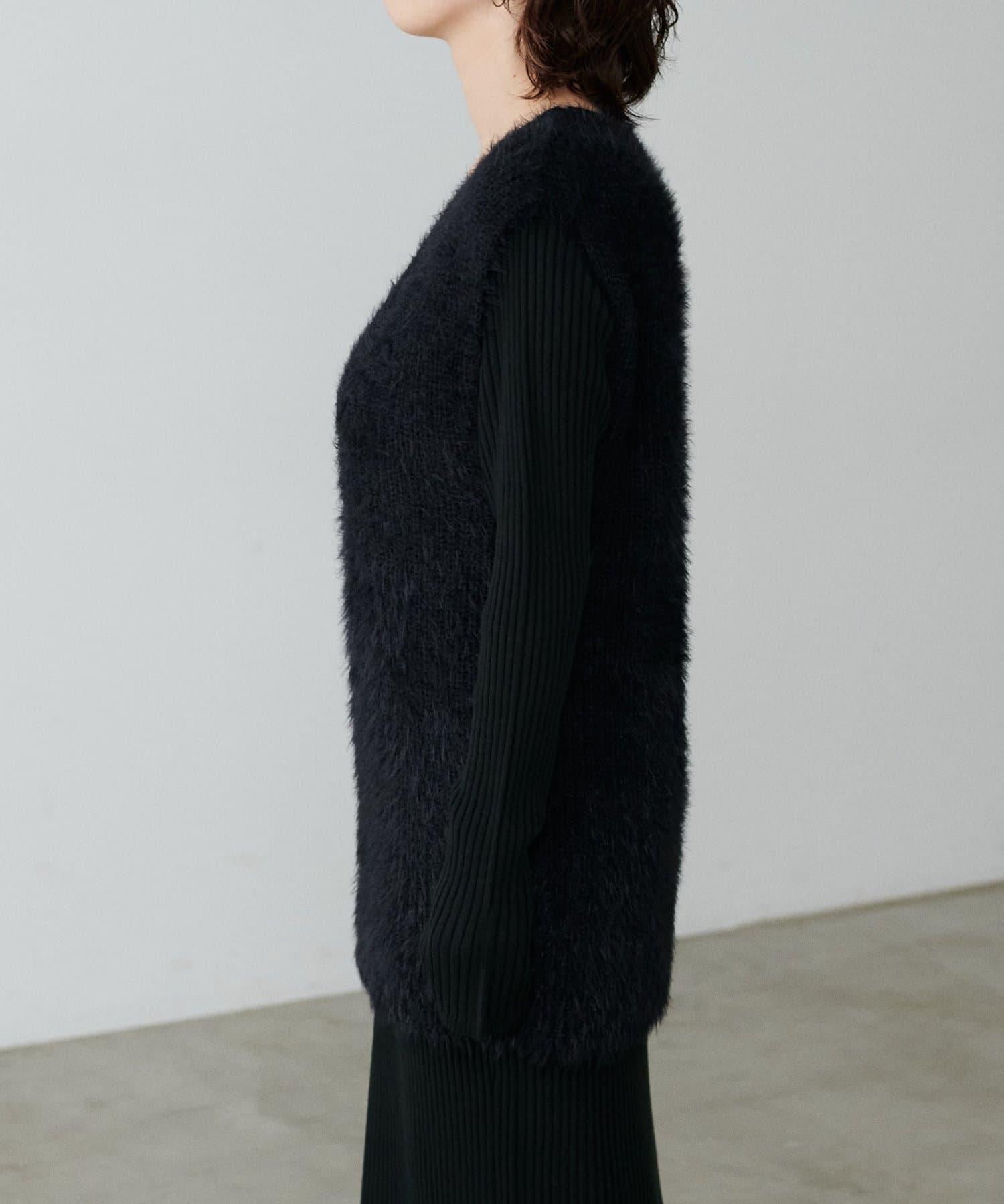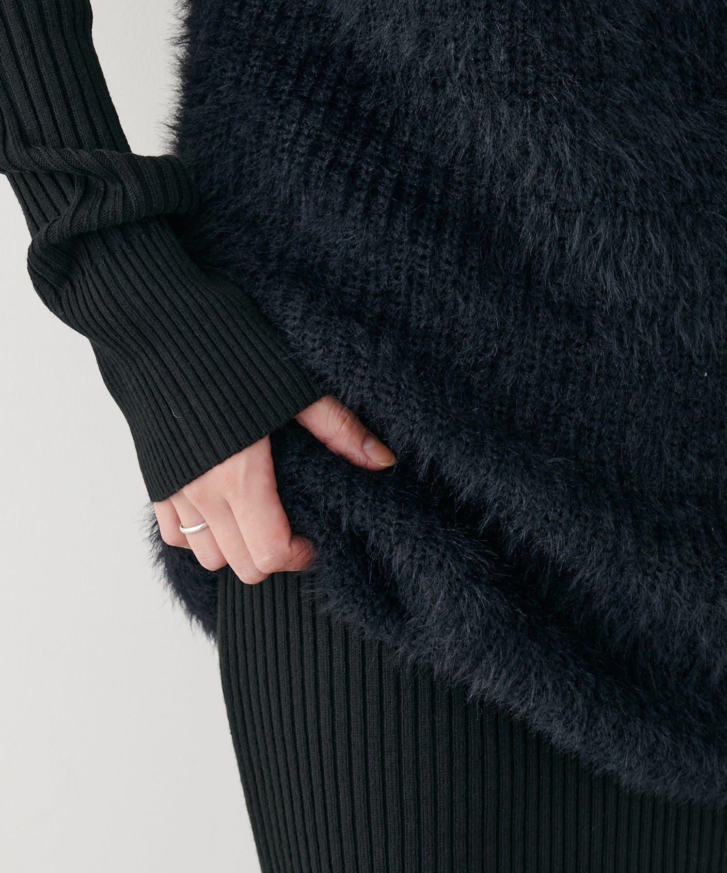 這款單品由一件簡單的羅紋針織連身裙和一件同色羽毛馬甲組成。