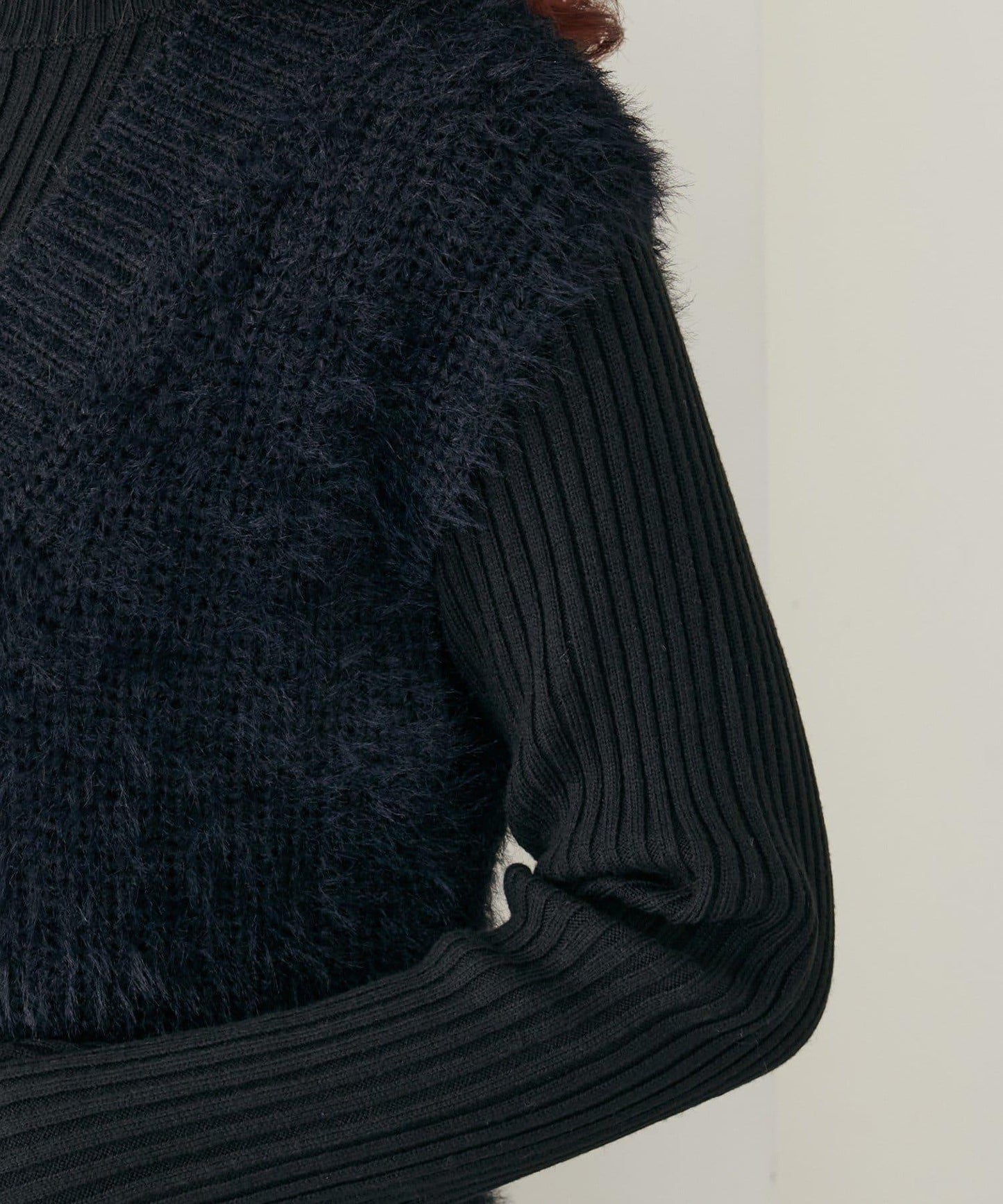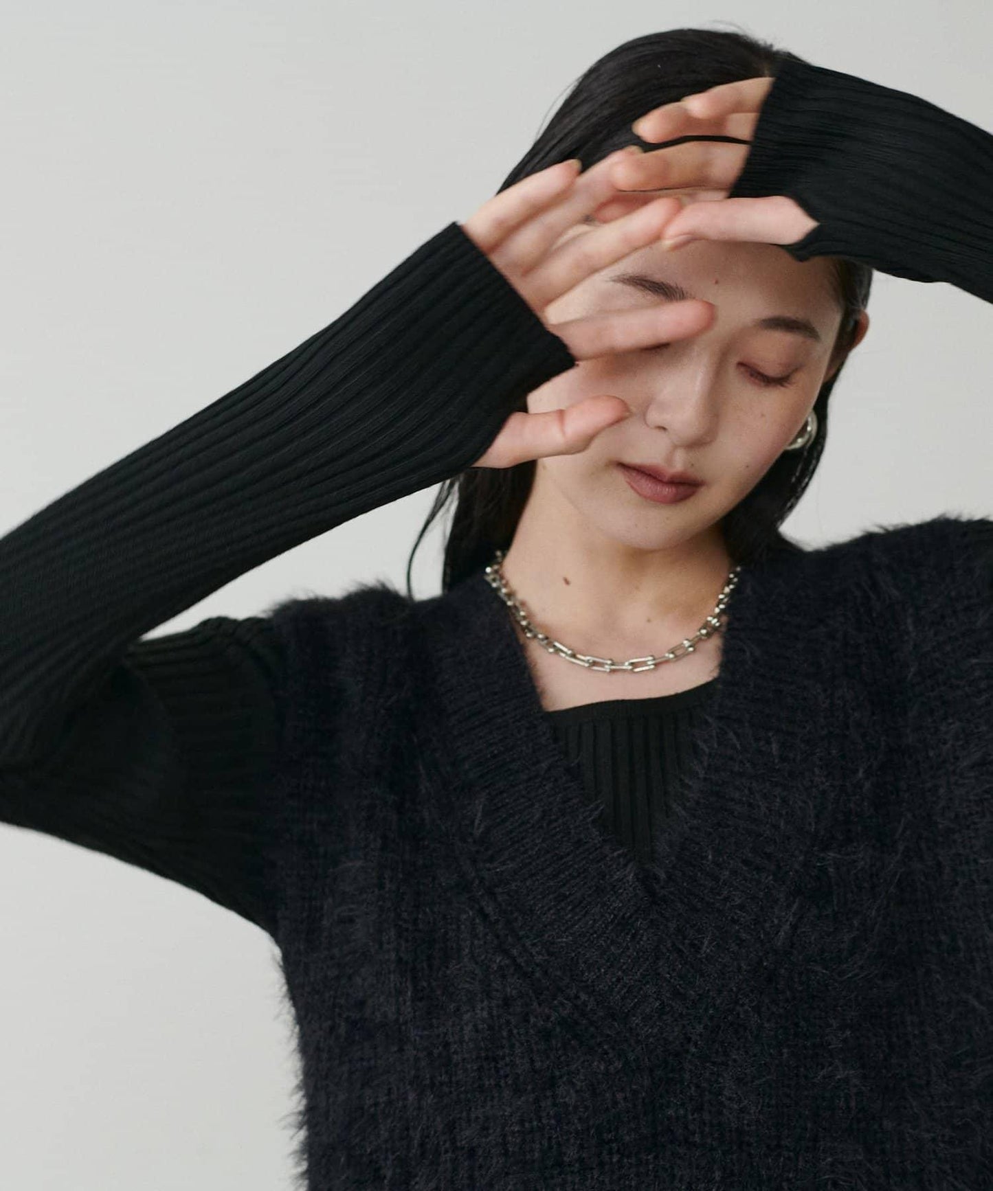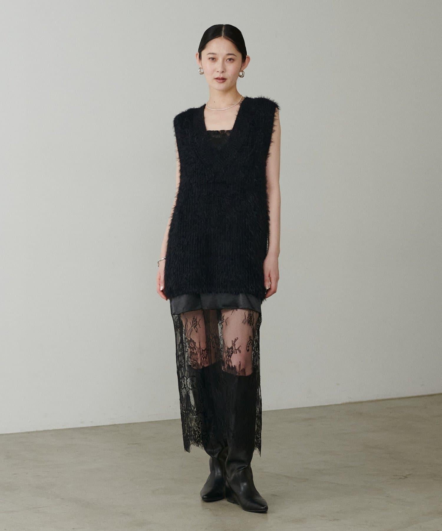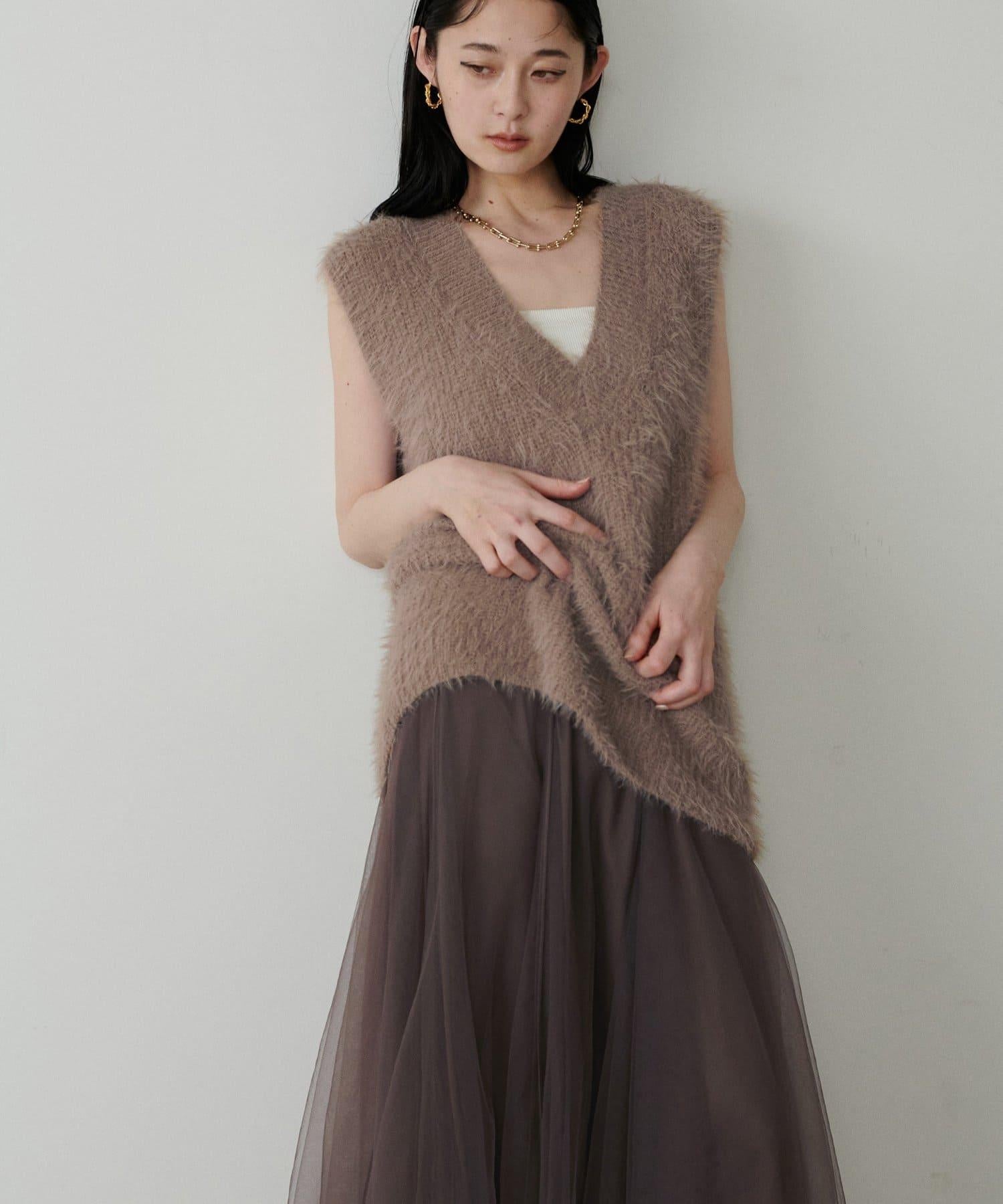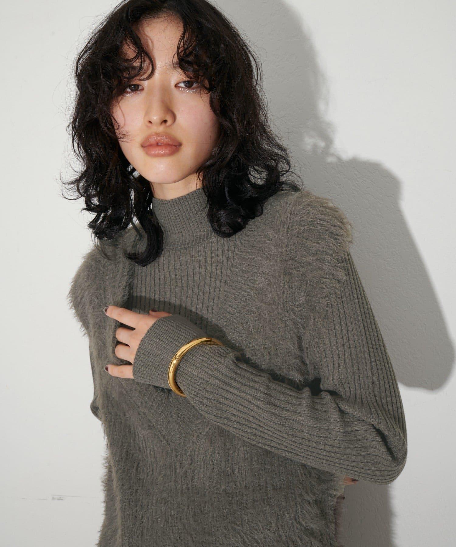 這款單品由一件簡單的羅紋針織連身裙和一件同色羽毛馬甲組成。