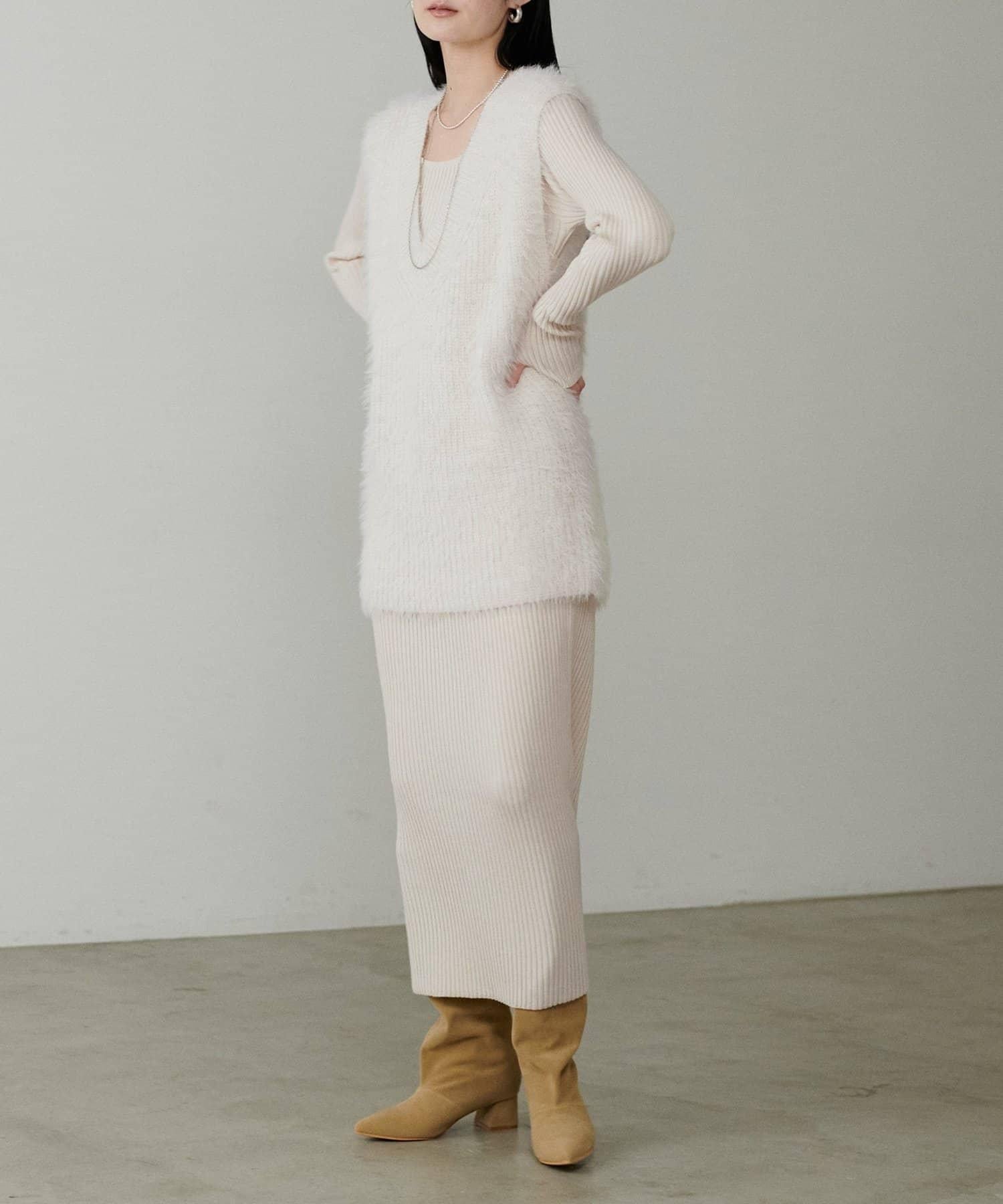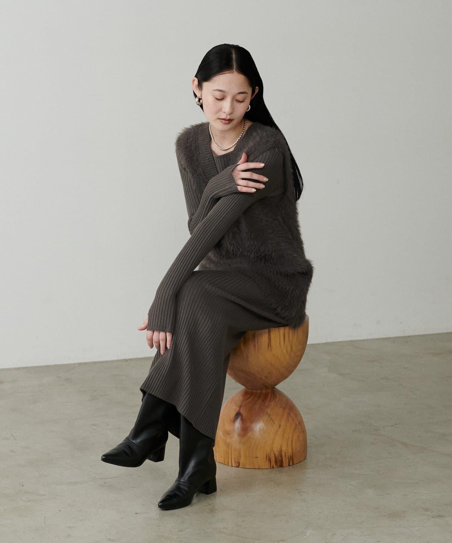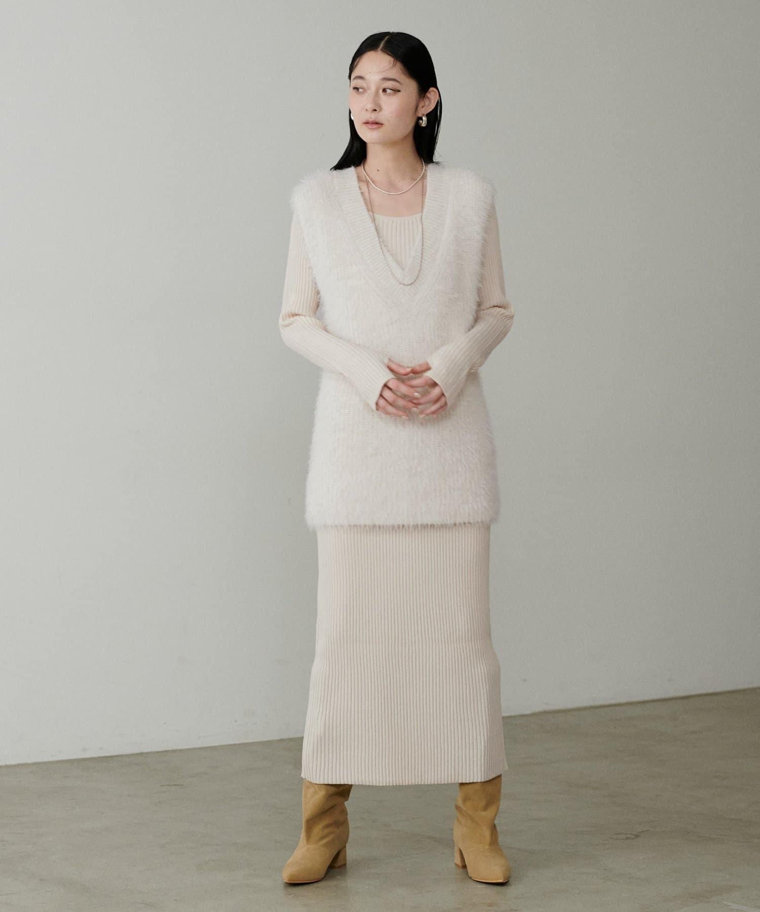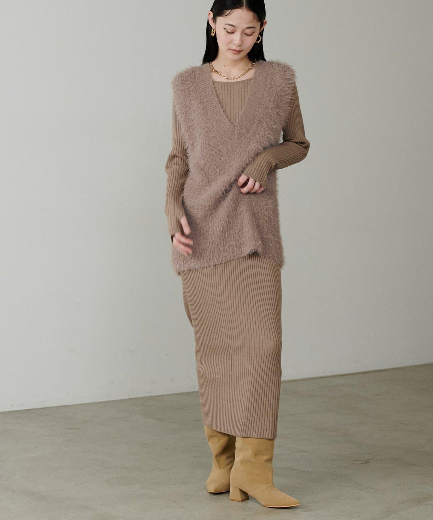可選的條紋針織連衣裙×羽毛馬甲套裝