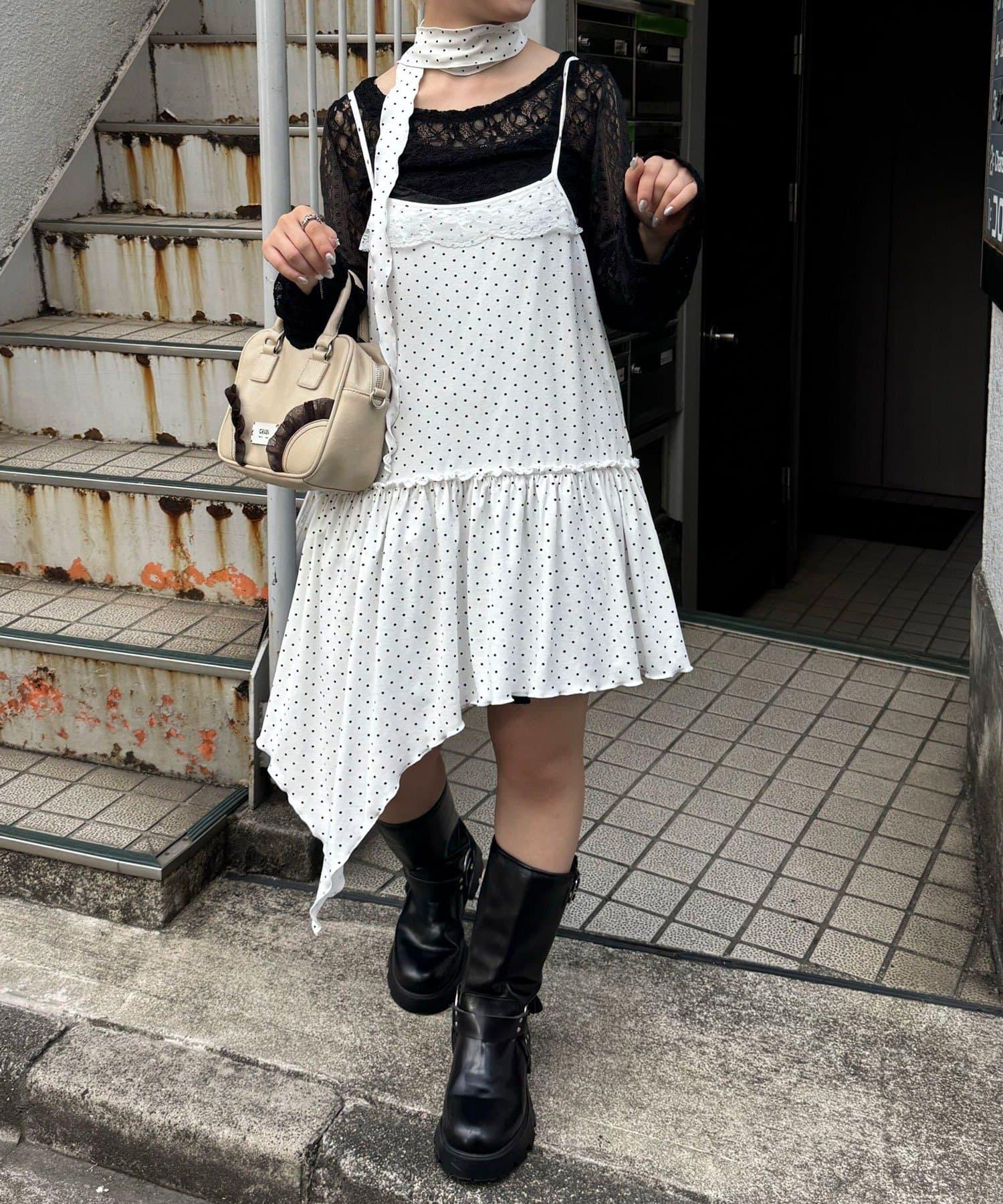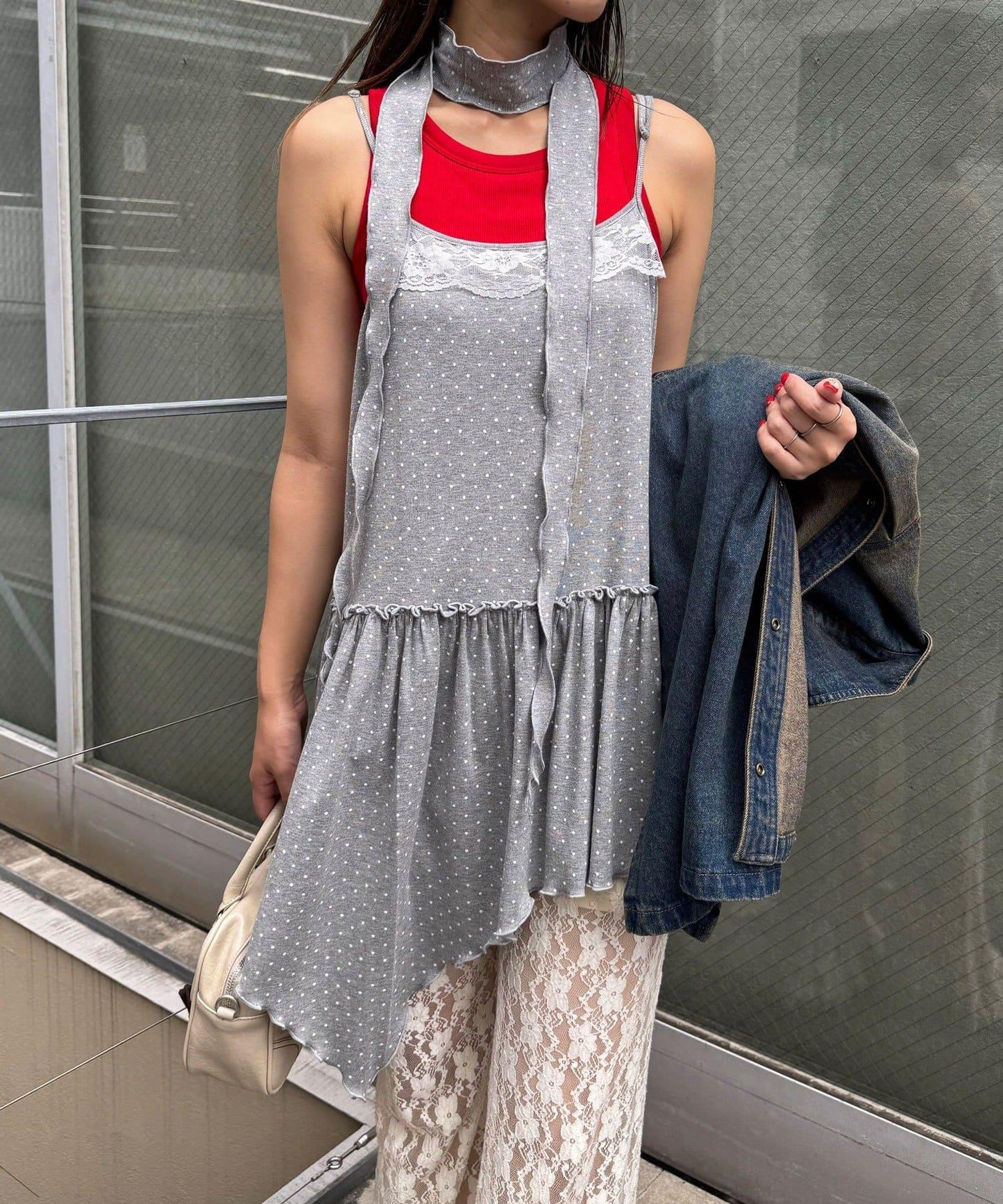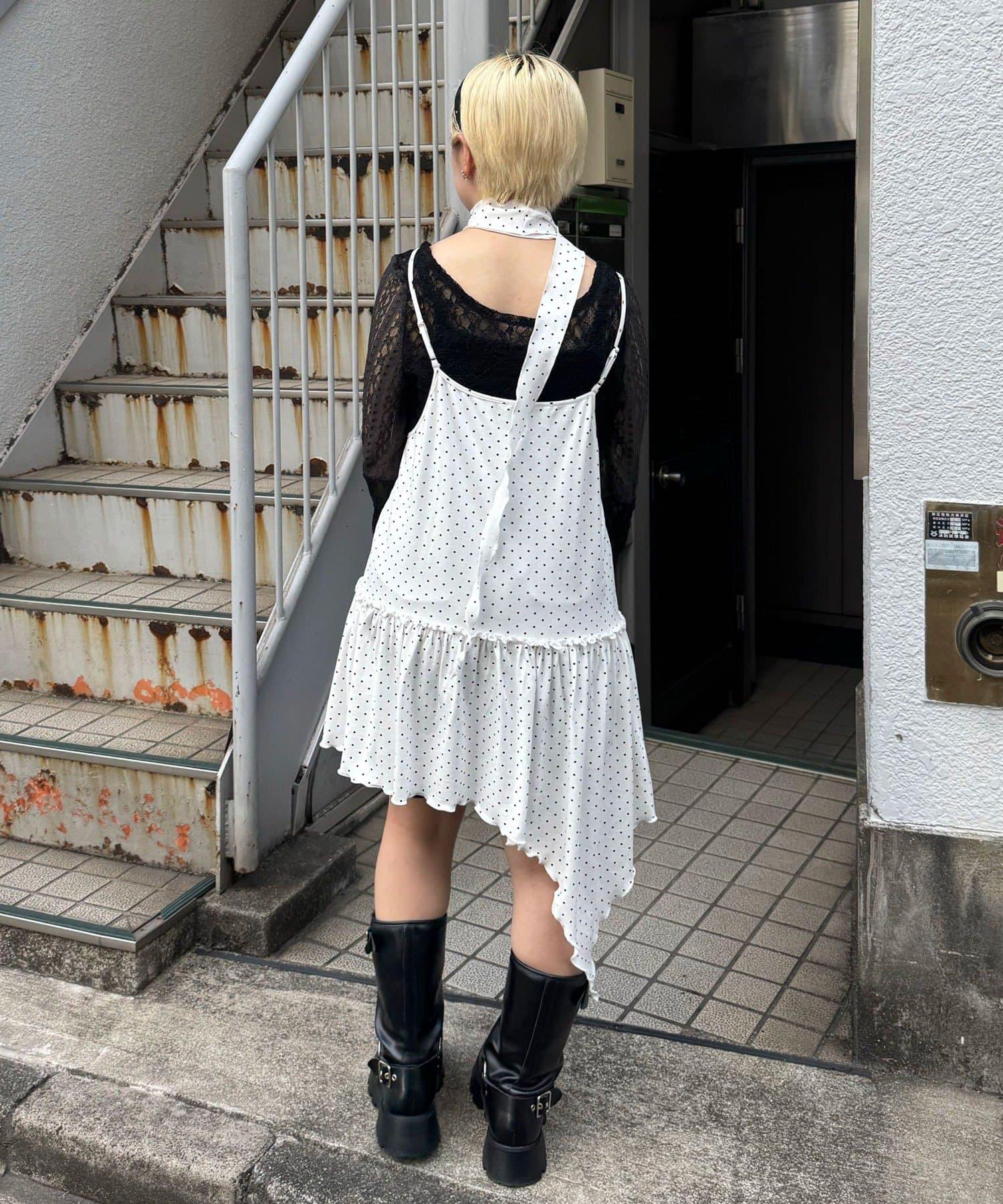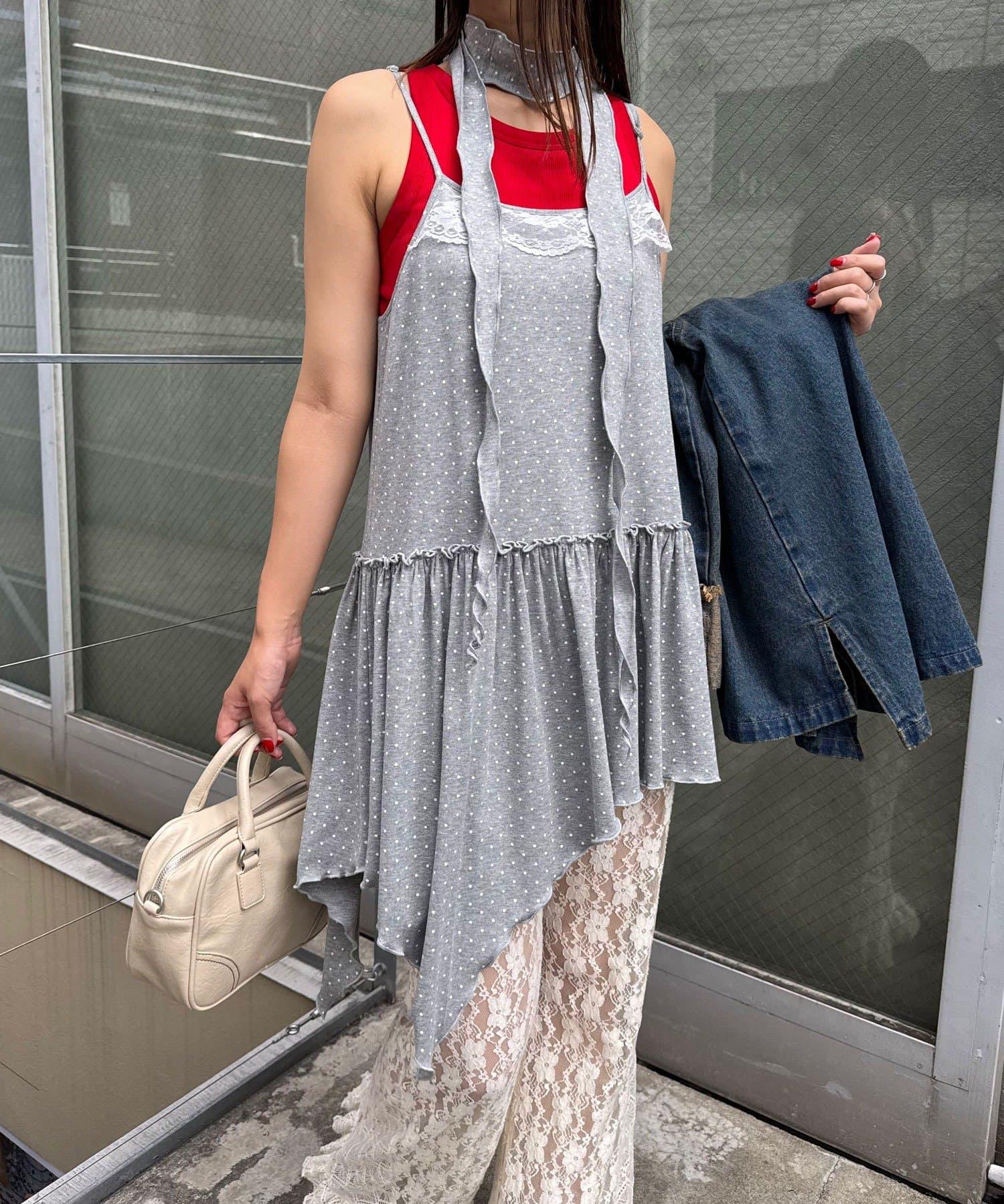 吊帶連身裙,採用蕾絲、圓點、不對稱設計和精巧的細節。