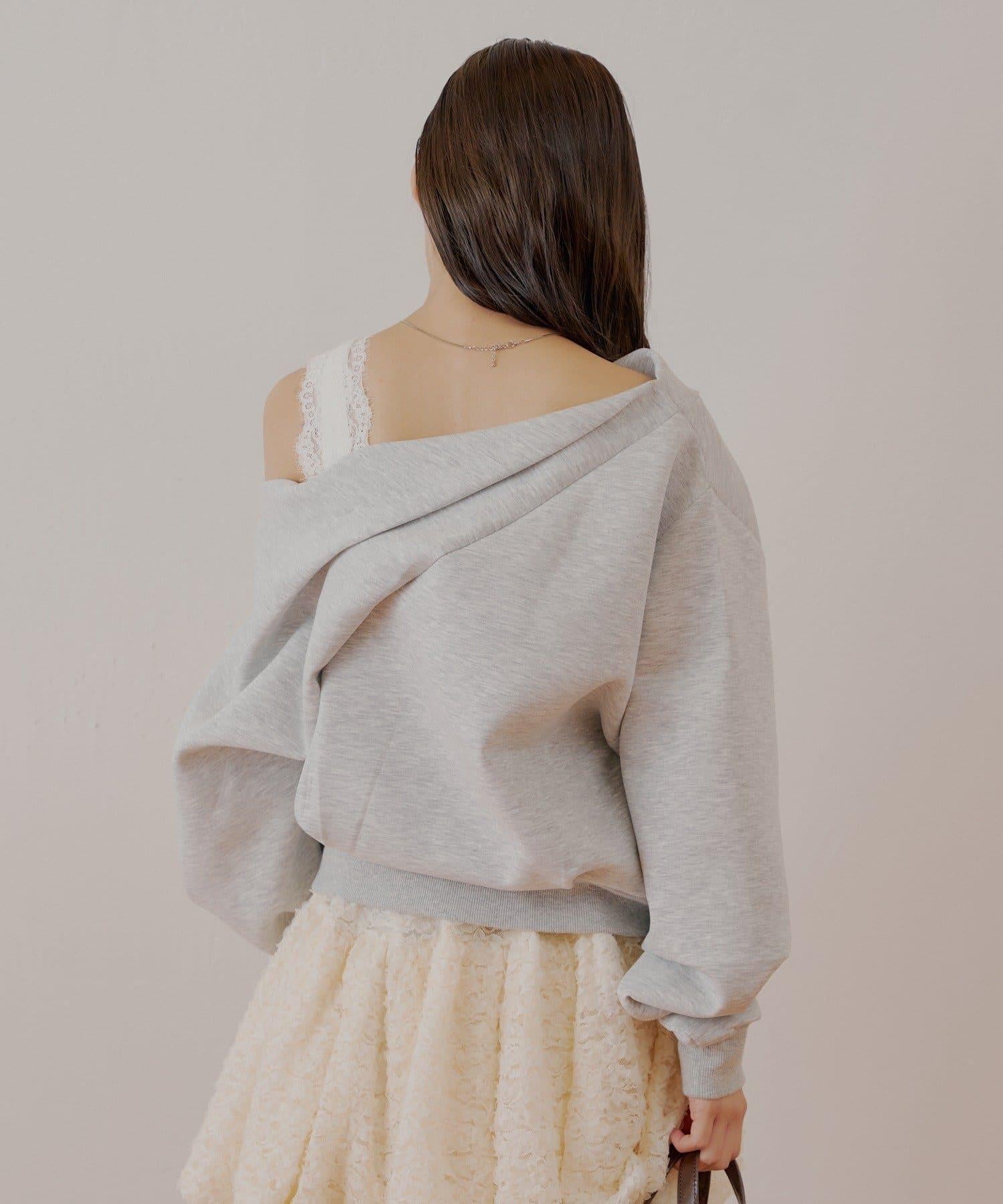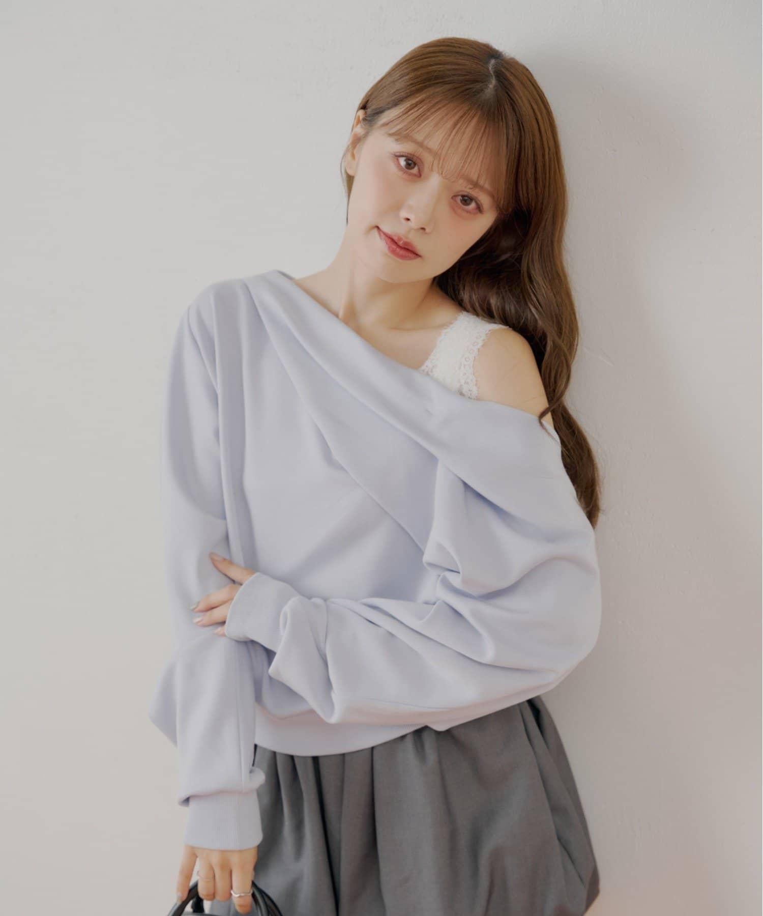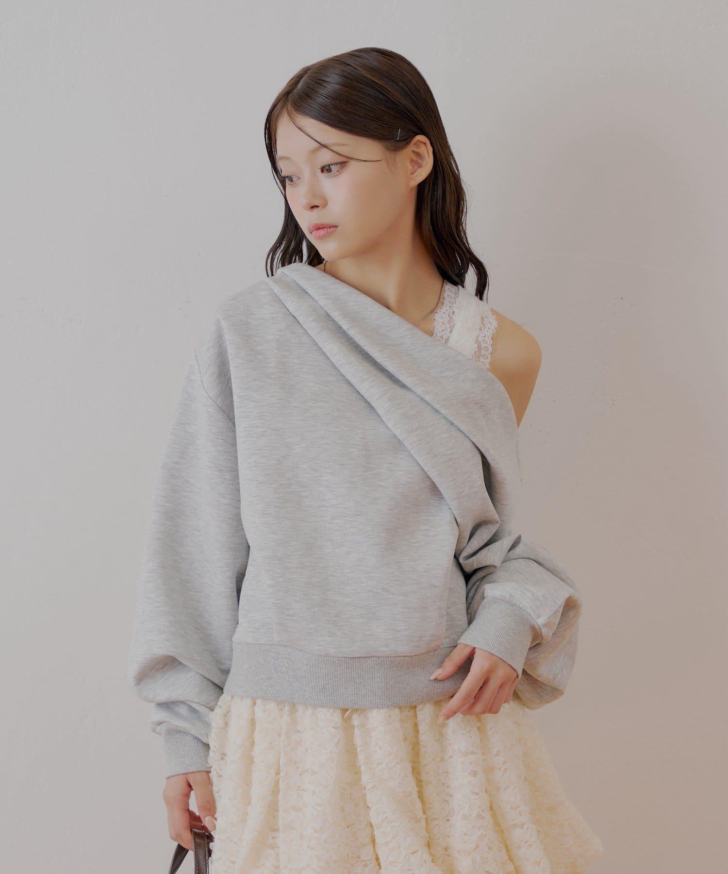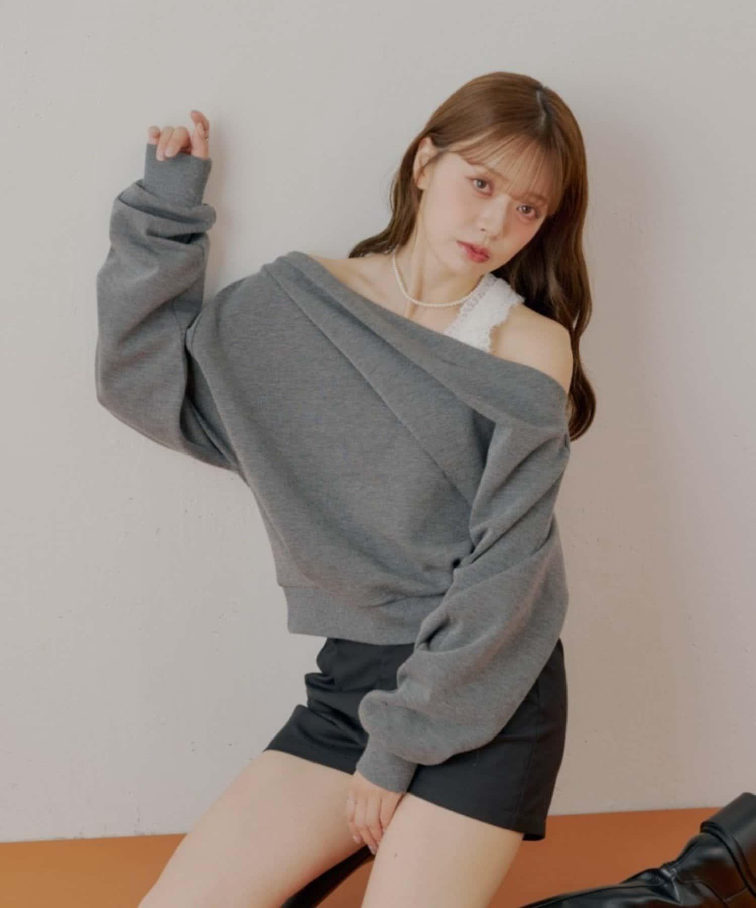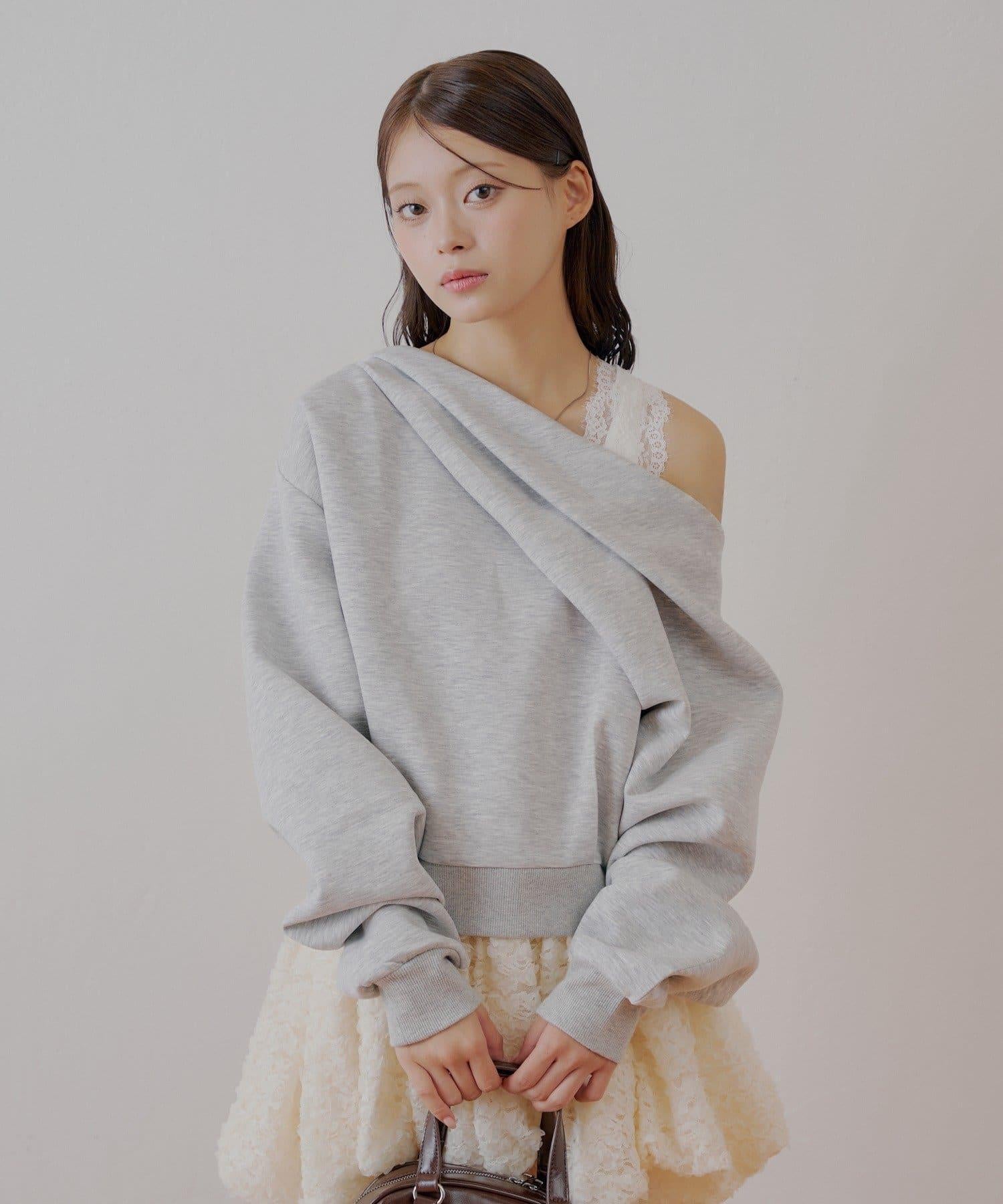 不對稱的領口設計能很好地展現肩部線條,營造出女性的寬鬆感。