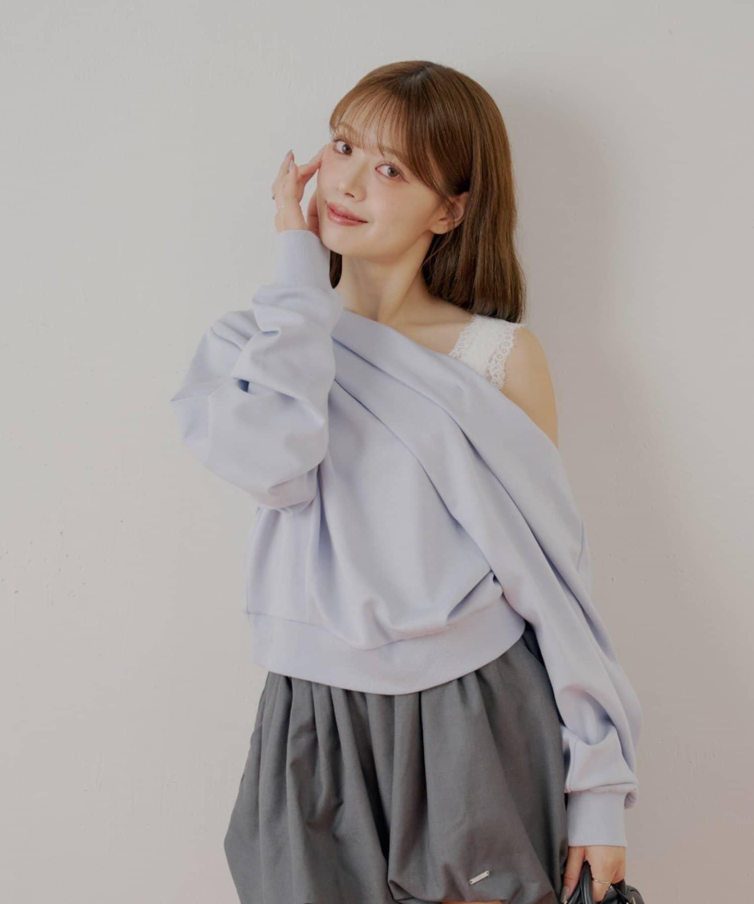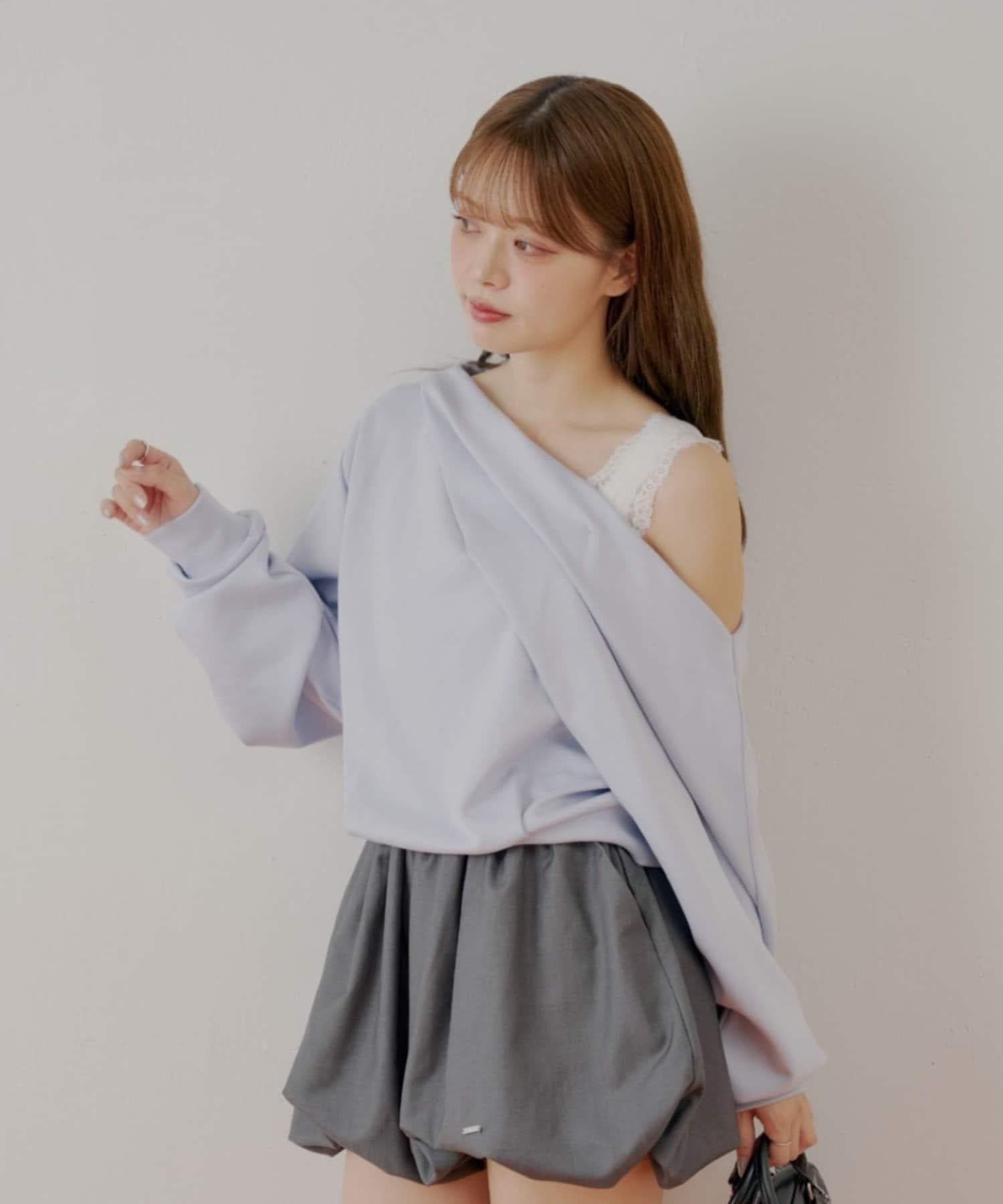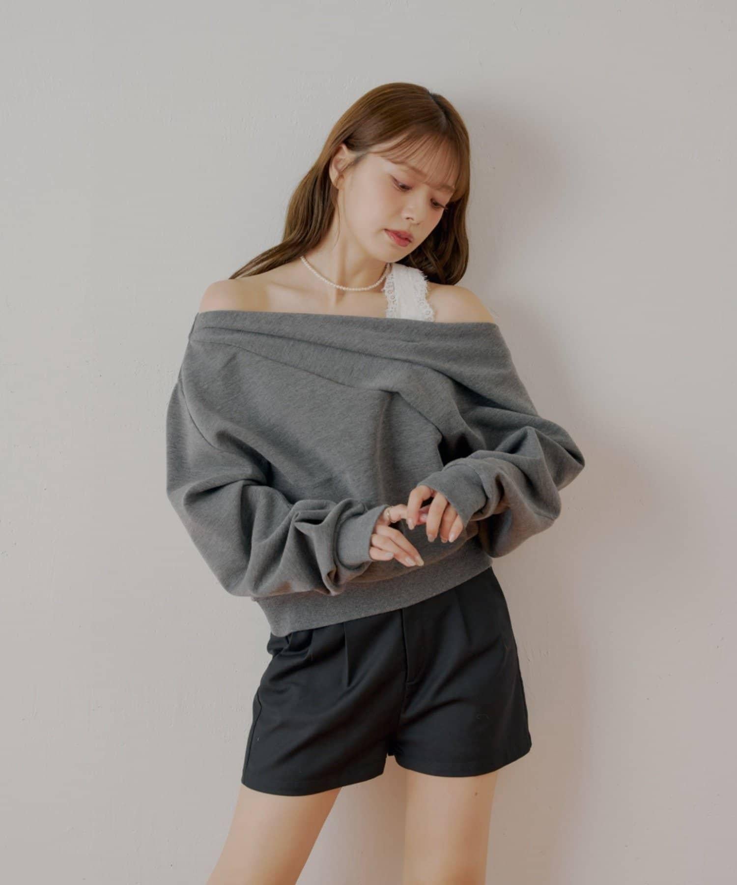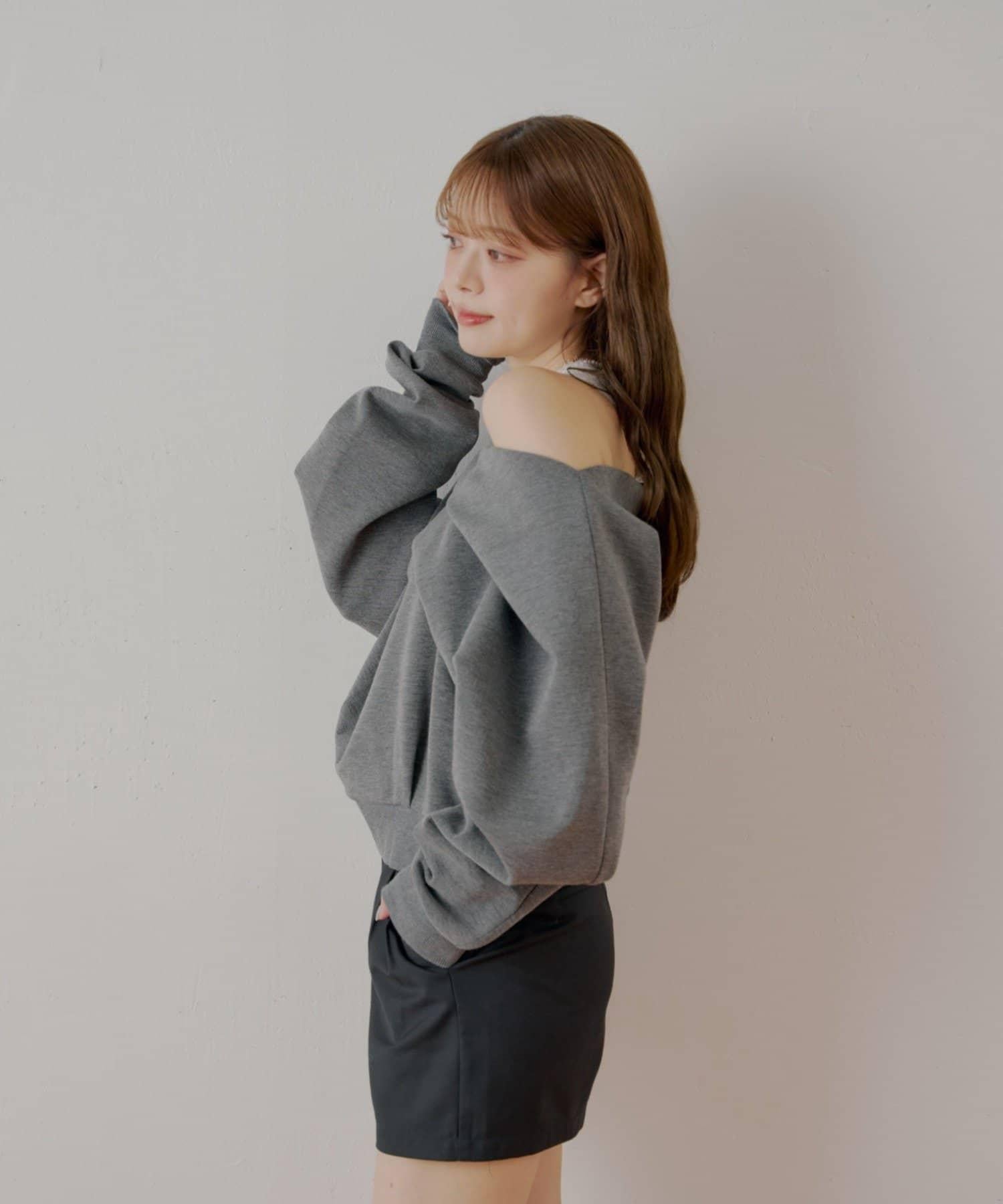 不對稱的領口設計能很好地展現肩部線條,營造出女性的寬鬆感。