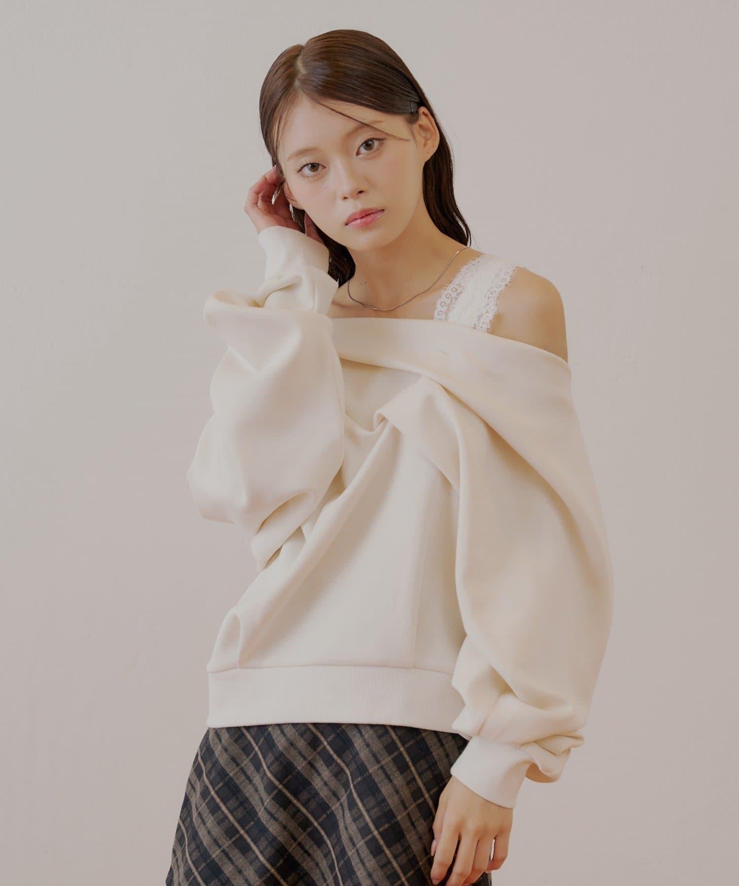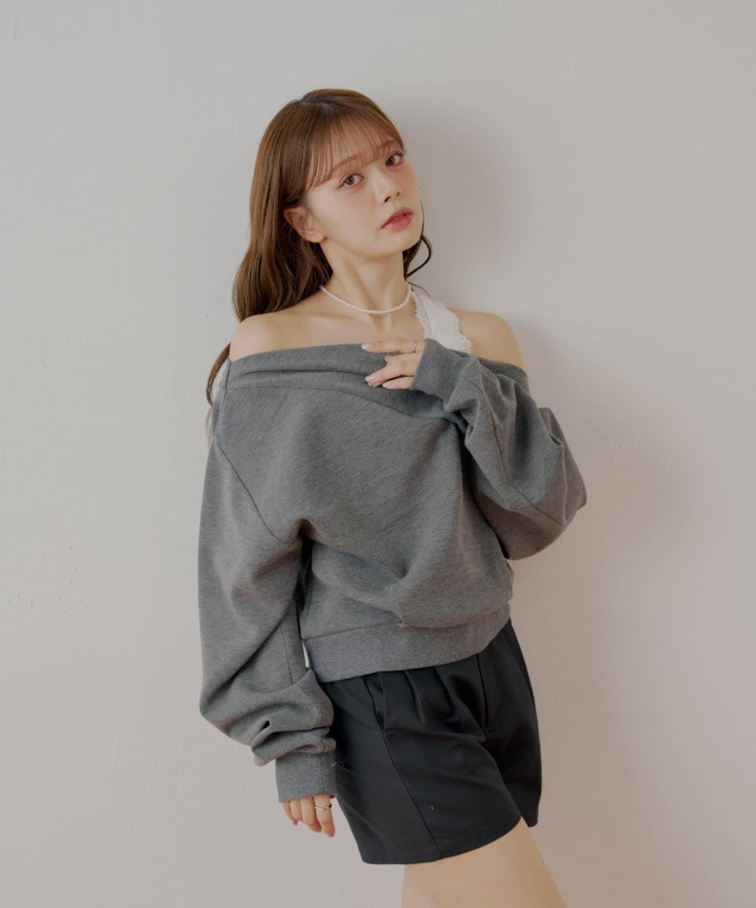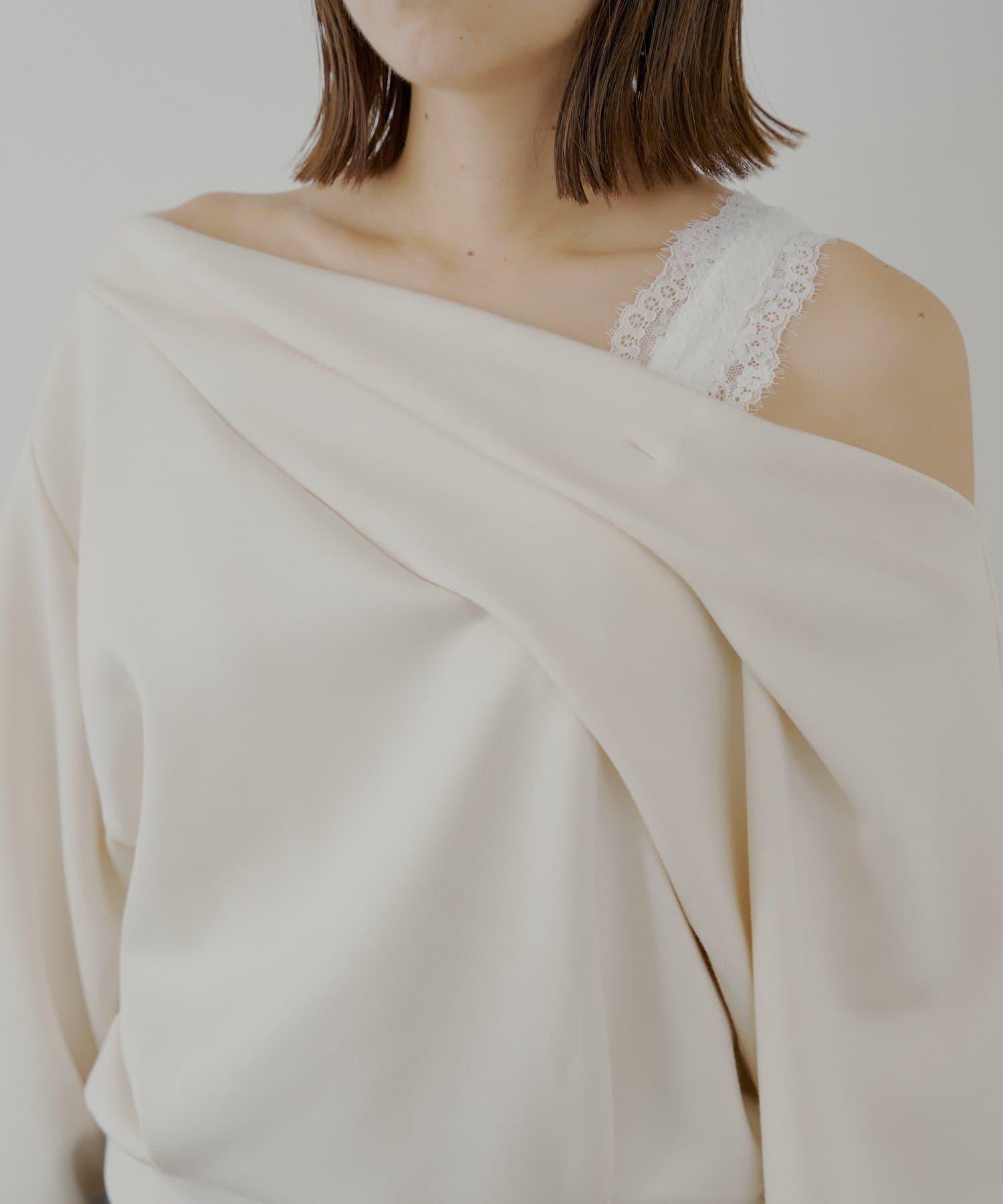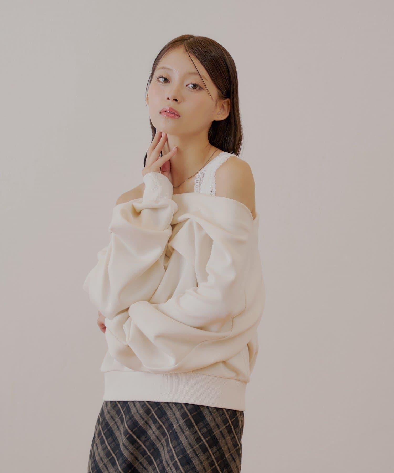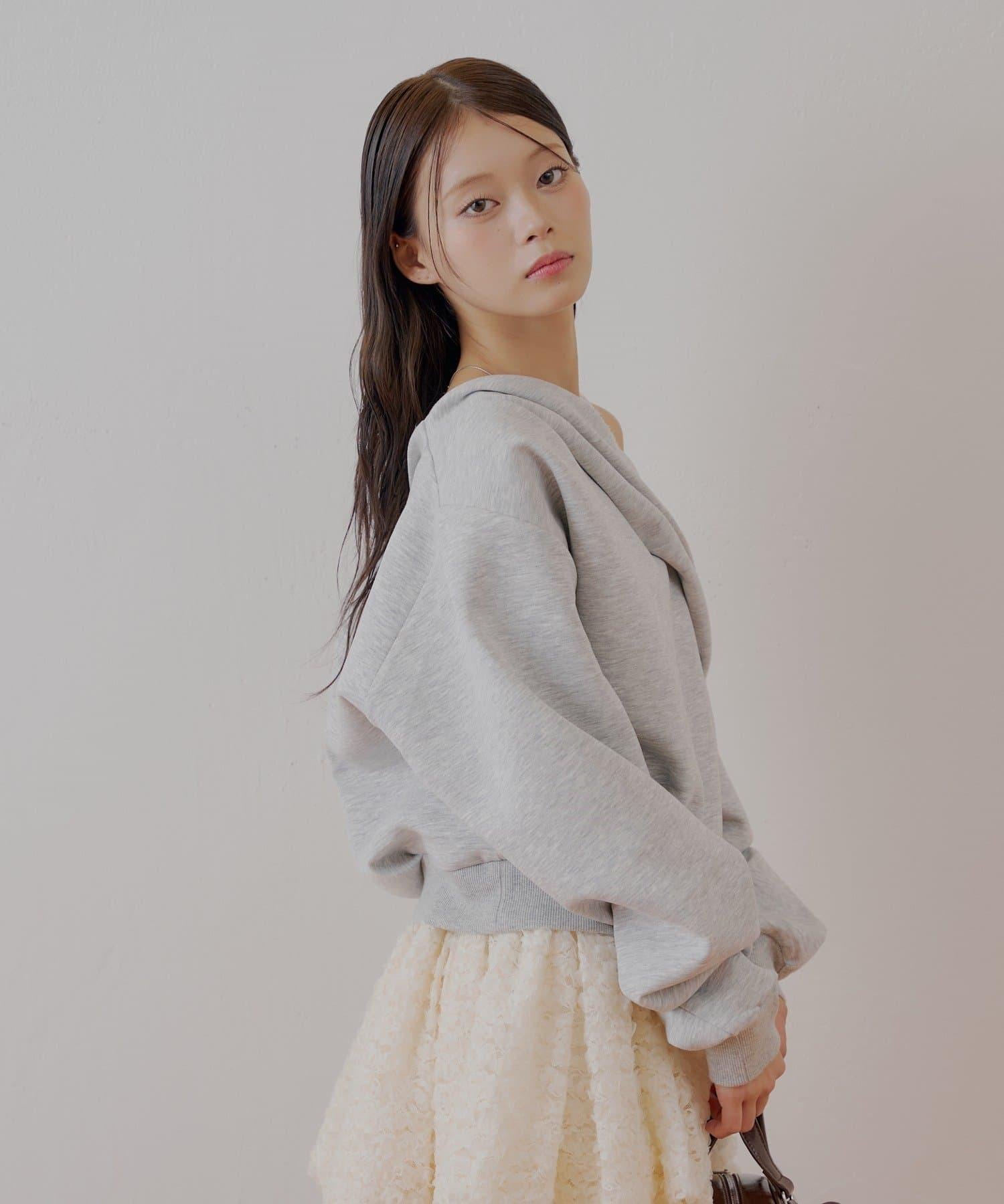 不對稱的領口設計能很好地展現肩部線條,營造出女性的寬鬆感。