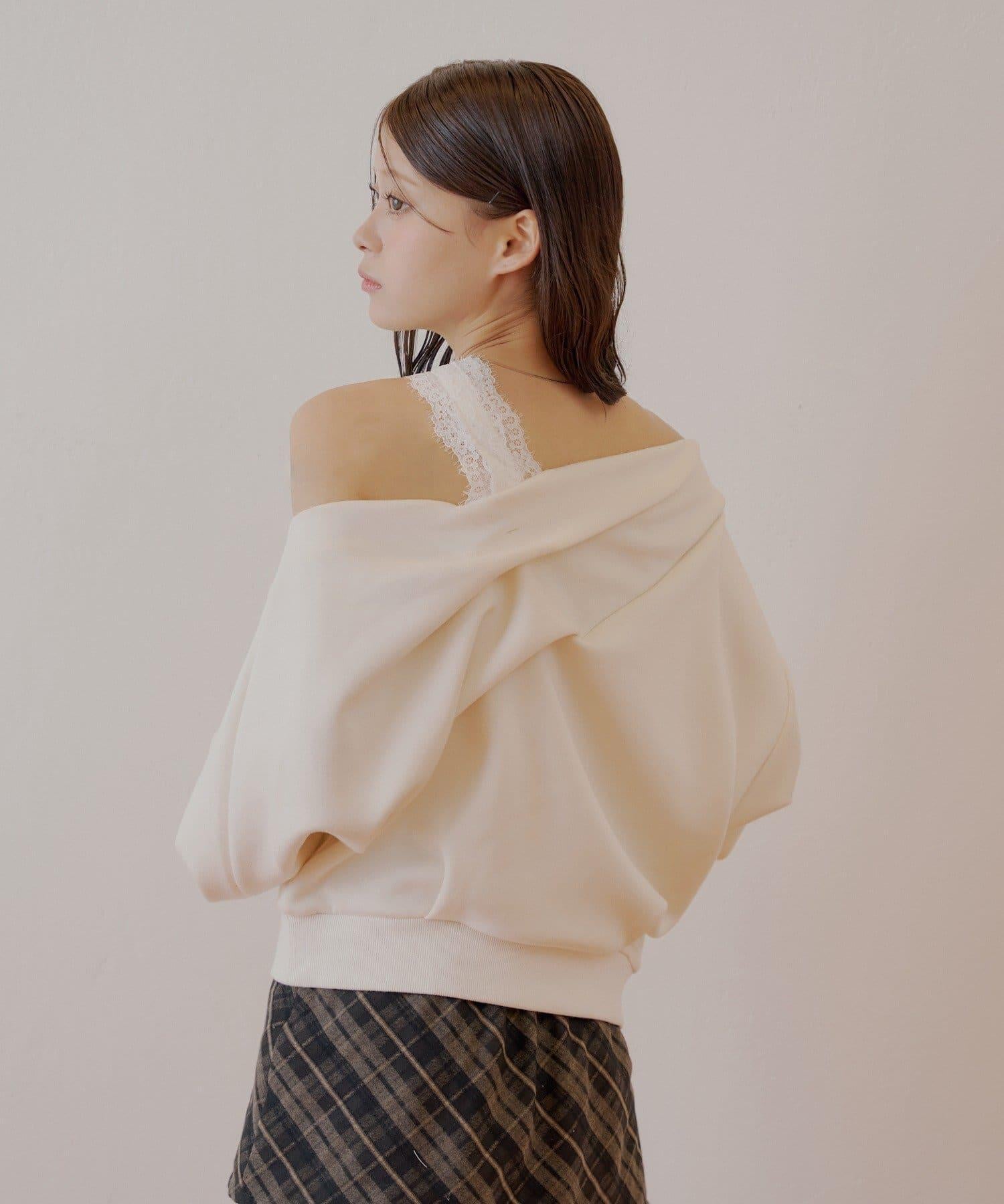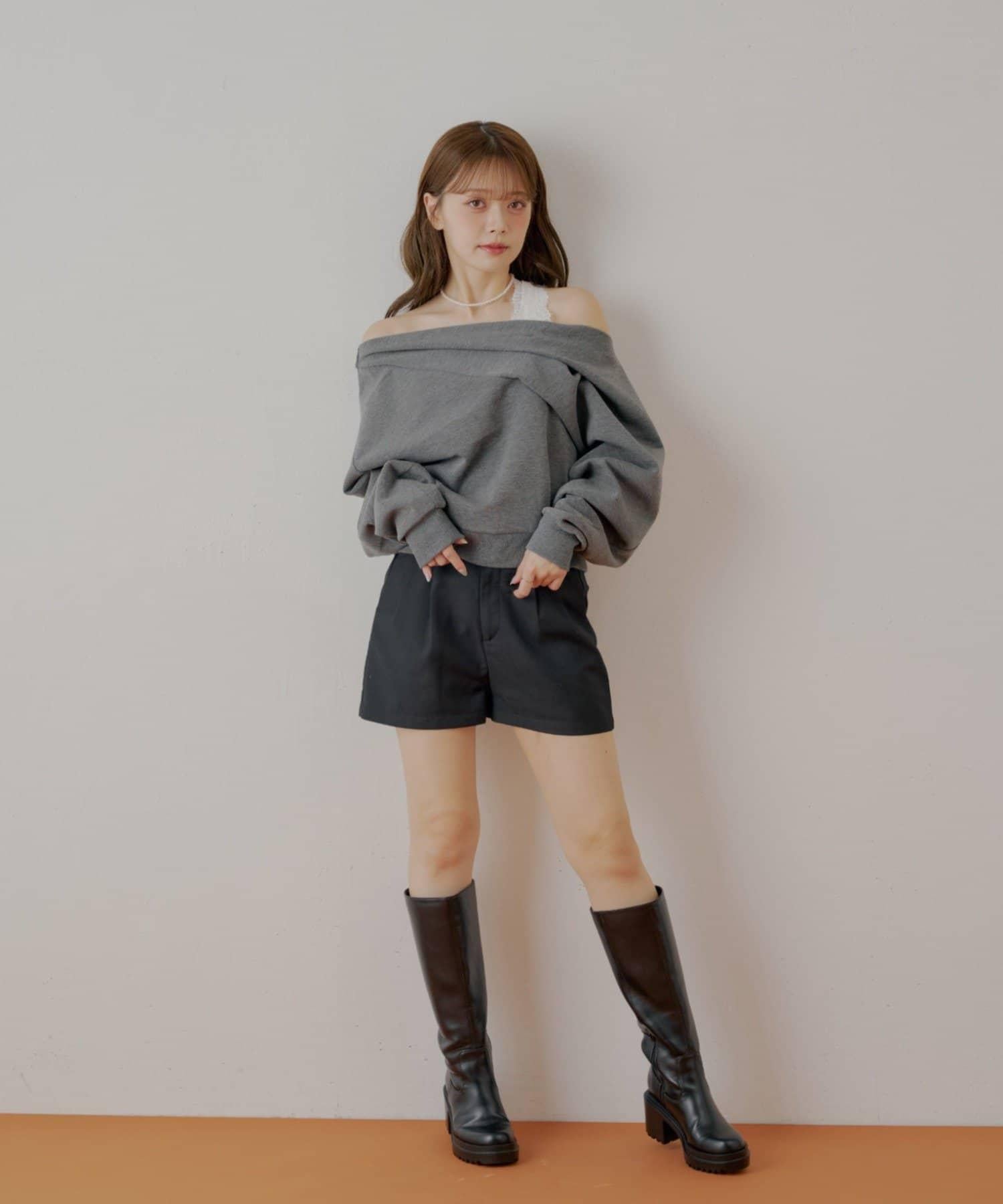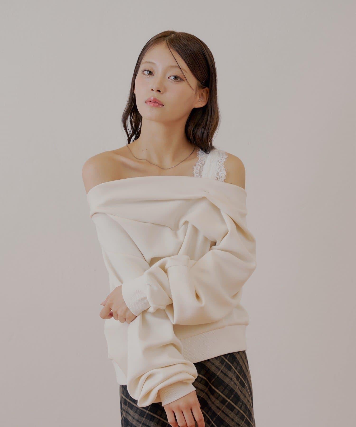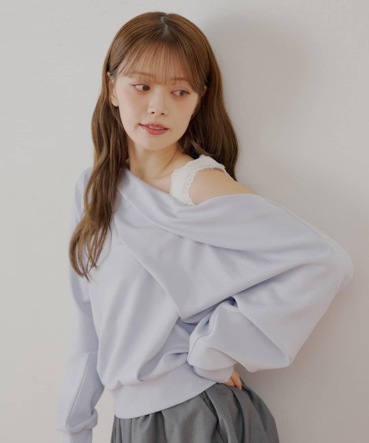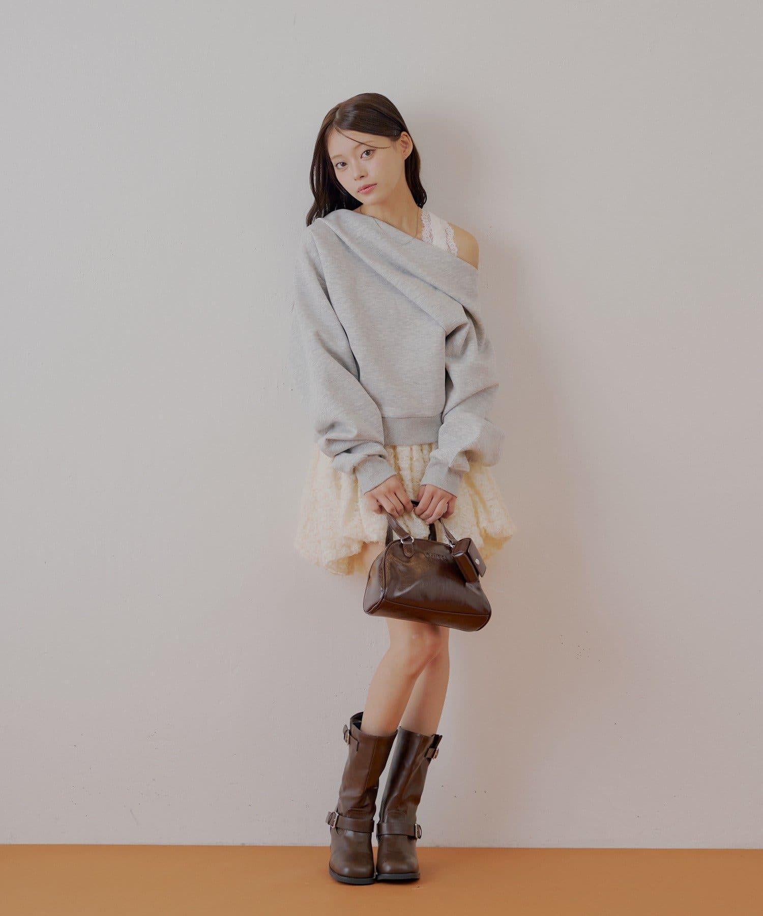 不對稱的領口設計能很好地展現肩部線條,營造出女性的寬鬆感。