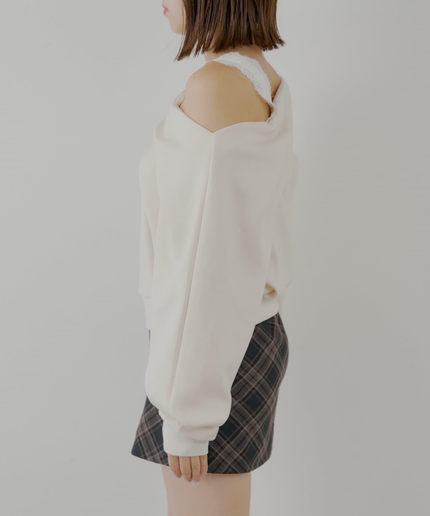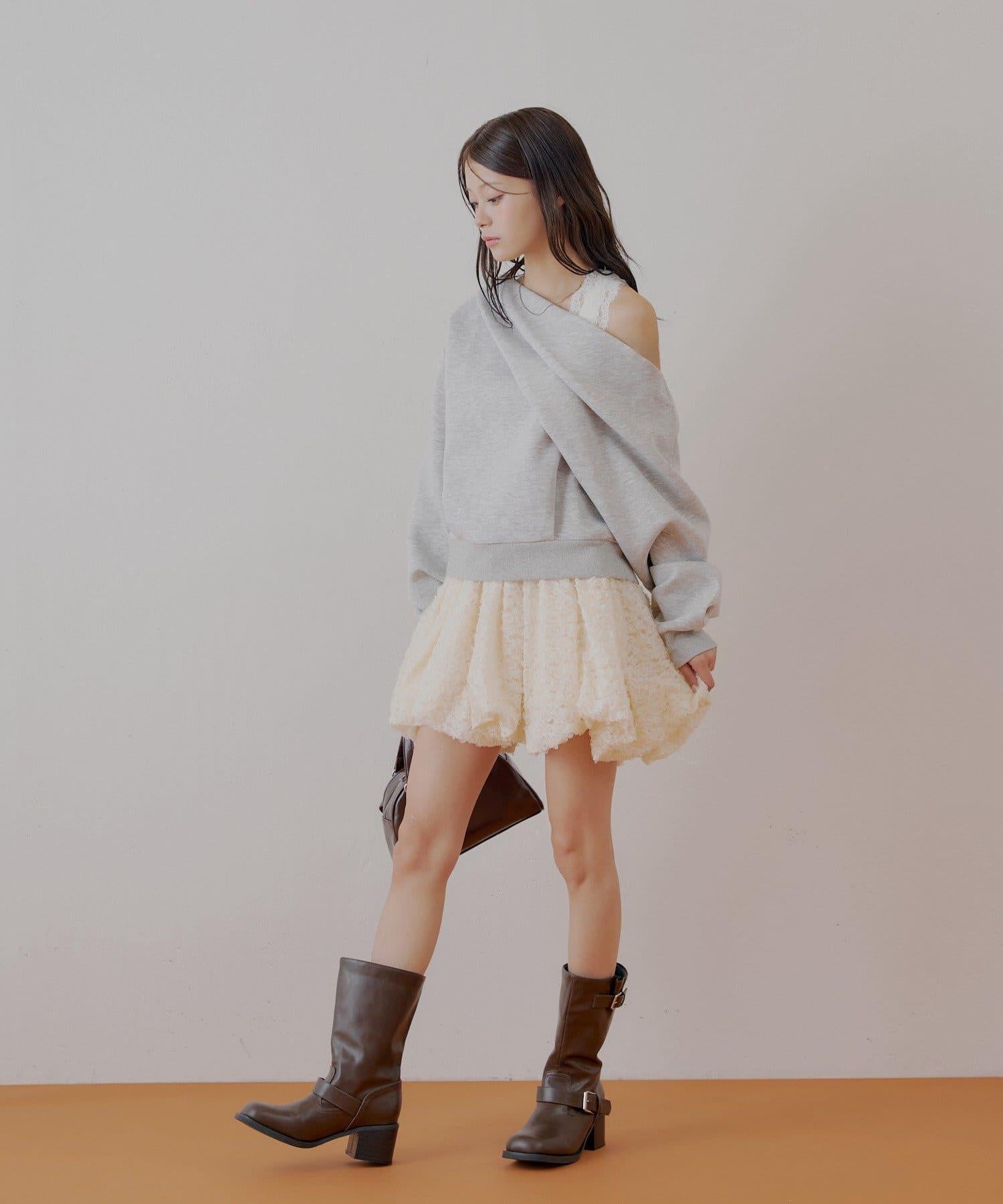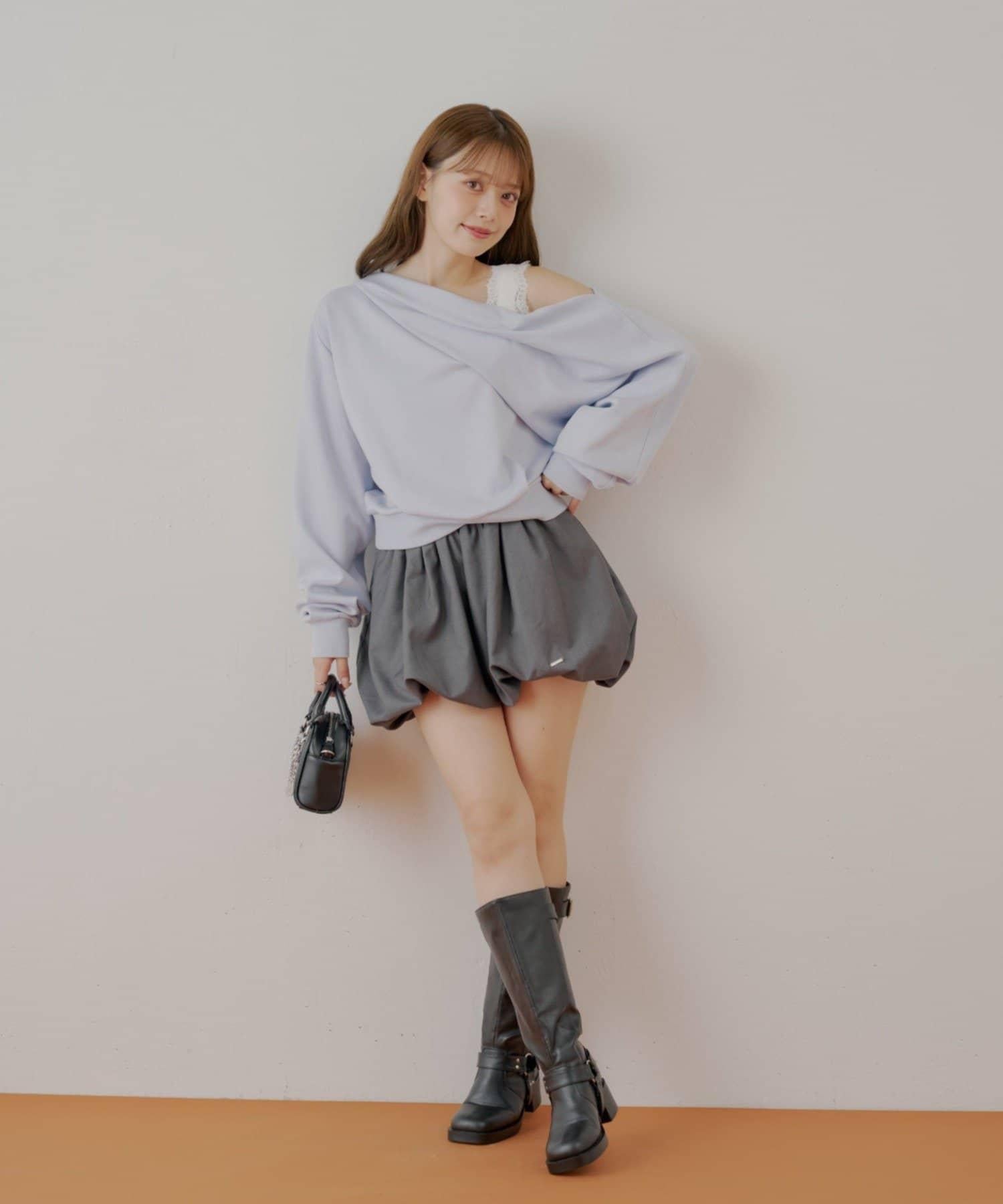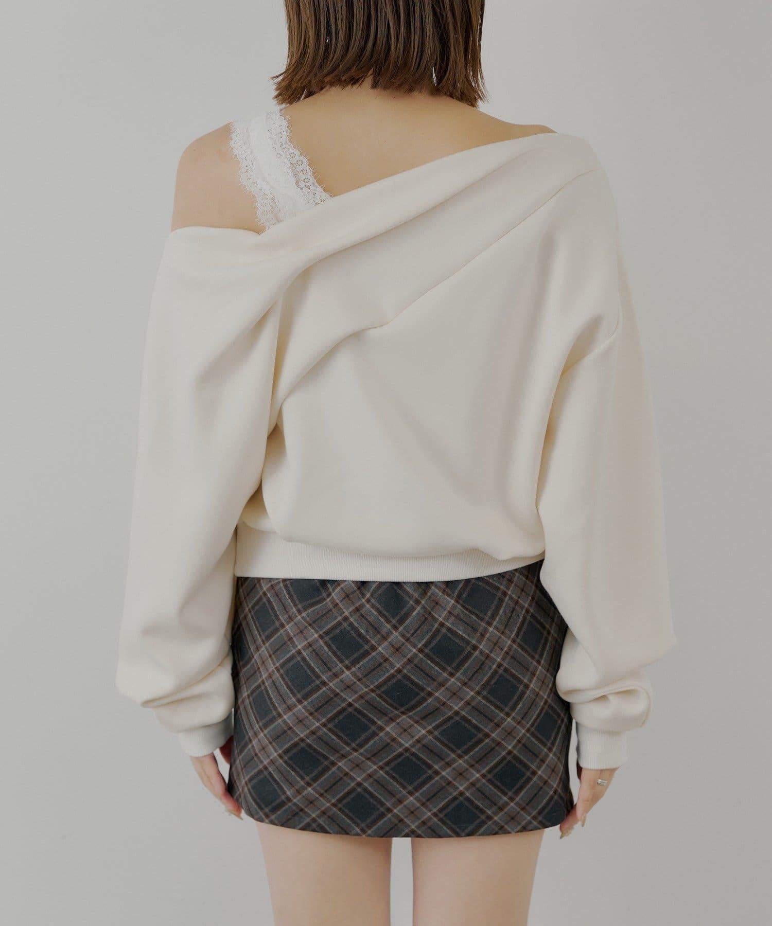 不對稱的領口設計能很好地展現肩部線條,營造出女性的寬鬆感。