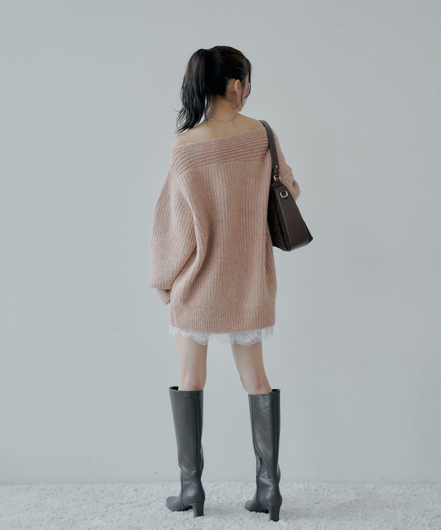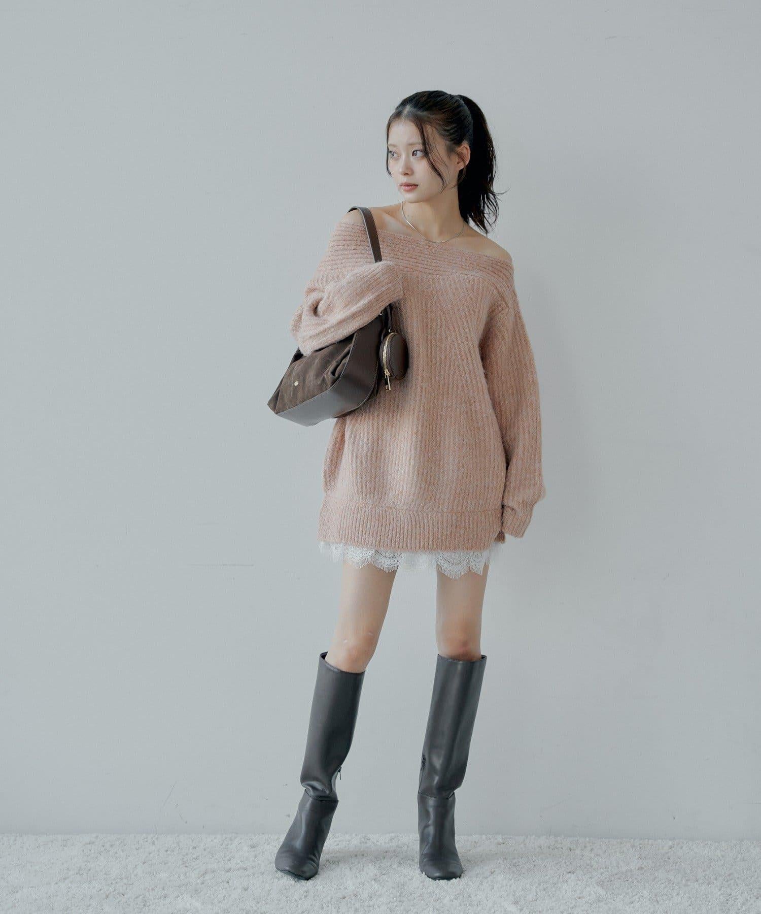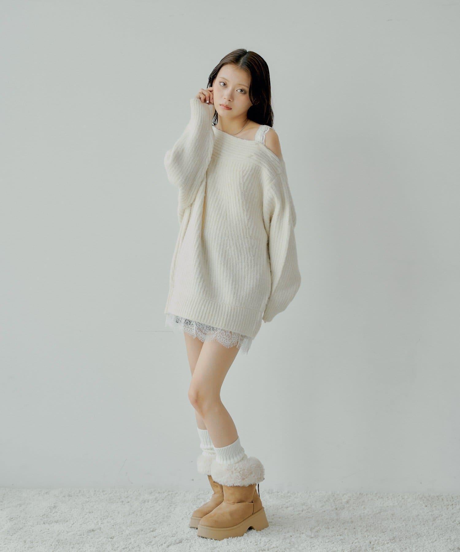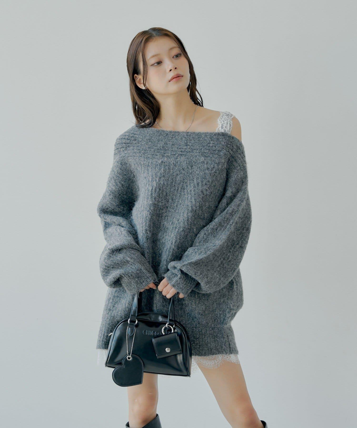 單肩蕾絲針織迷你連衣裙,柔軟舒適的包裹感。