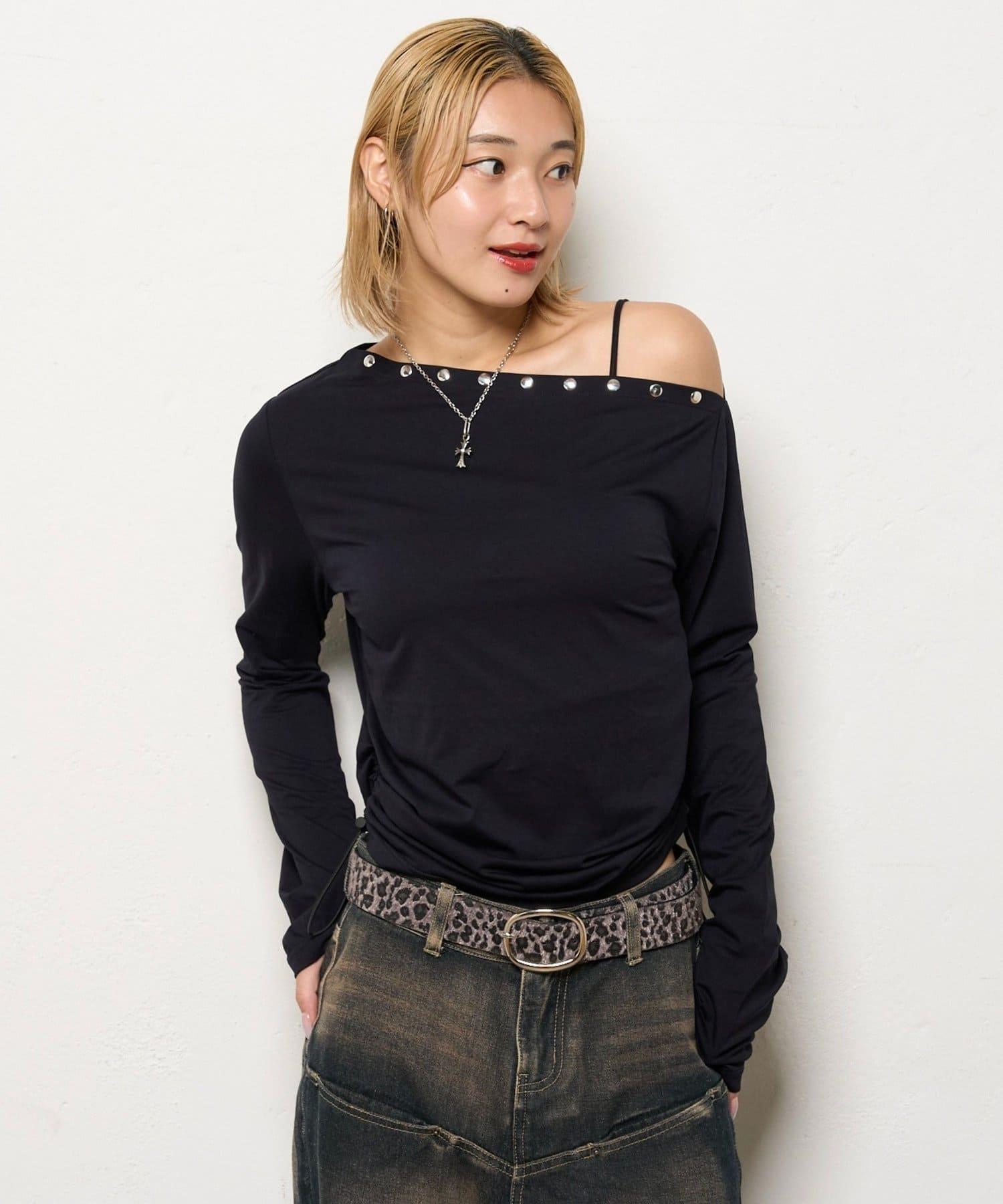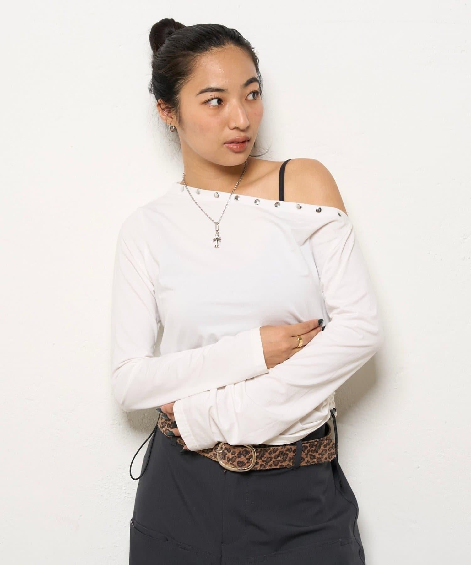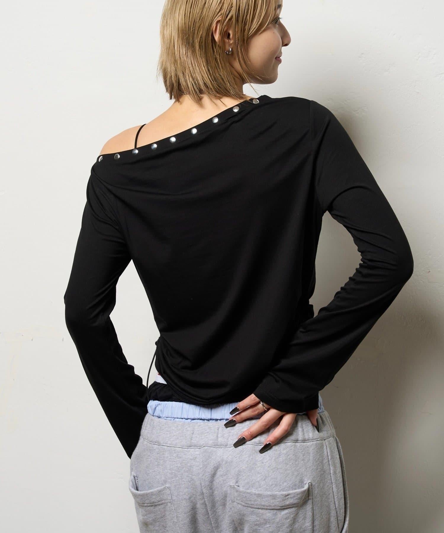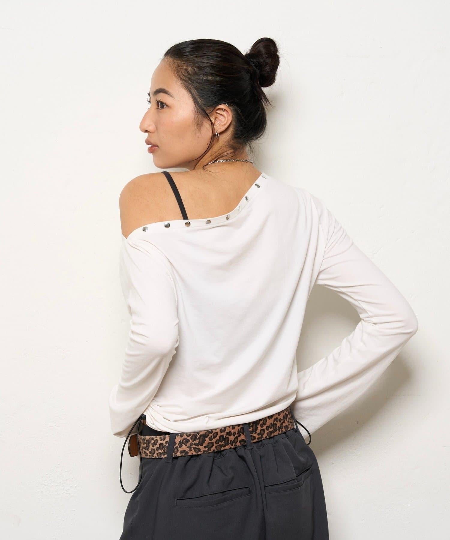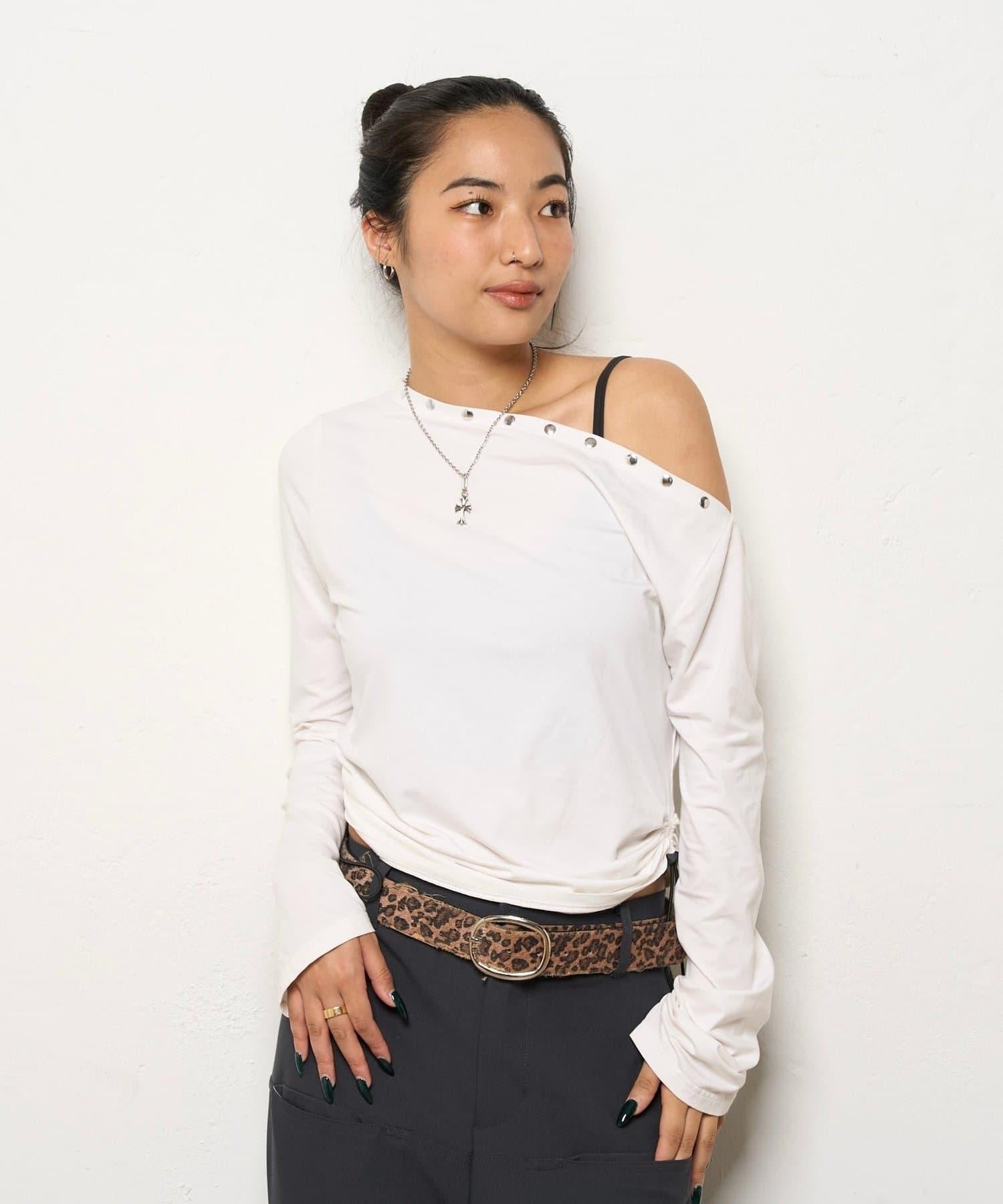 這款上衣採用單肩設計,飾有鉚釘。