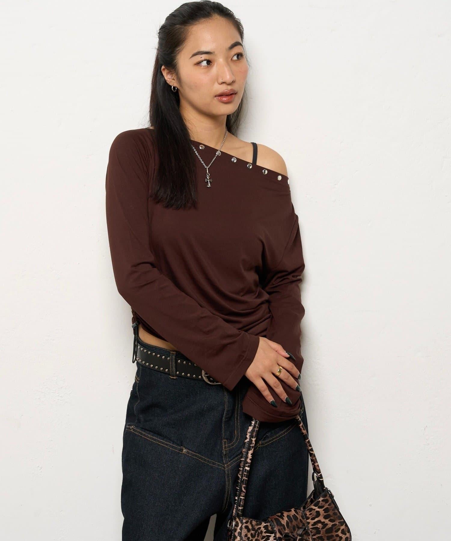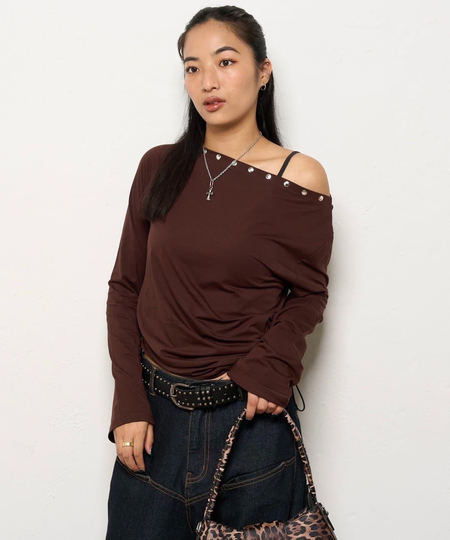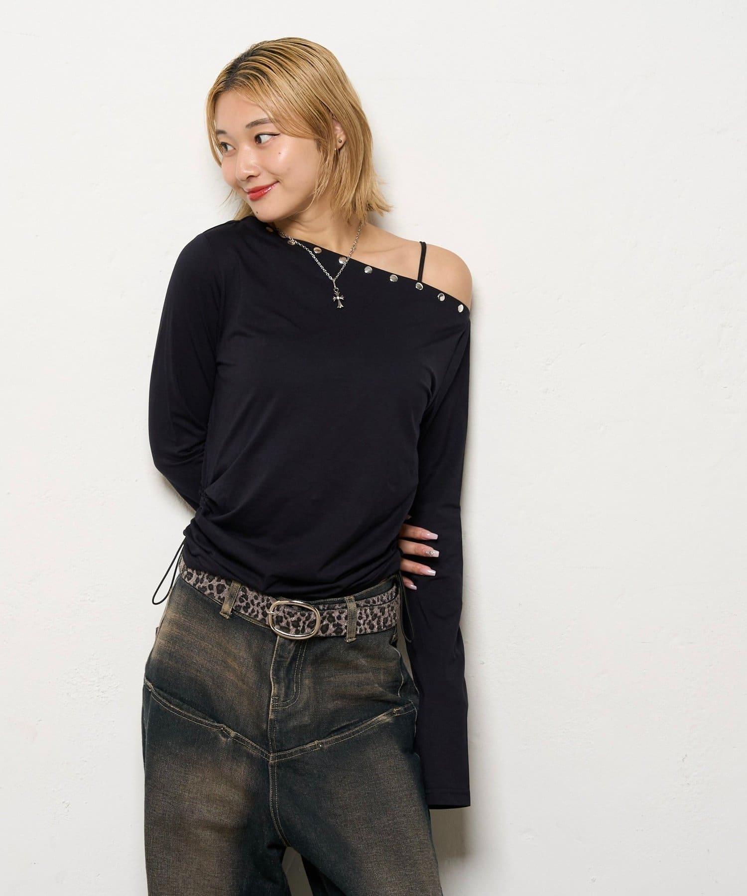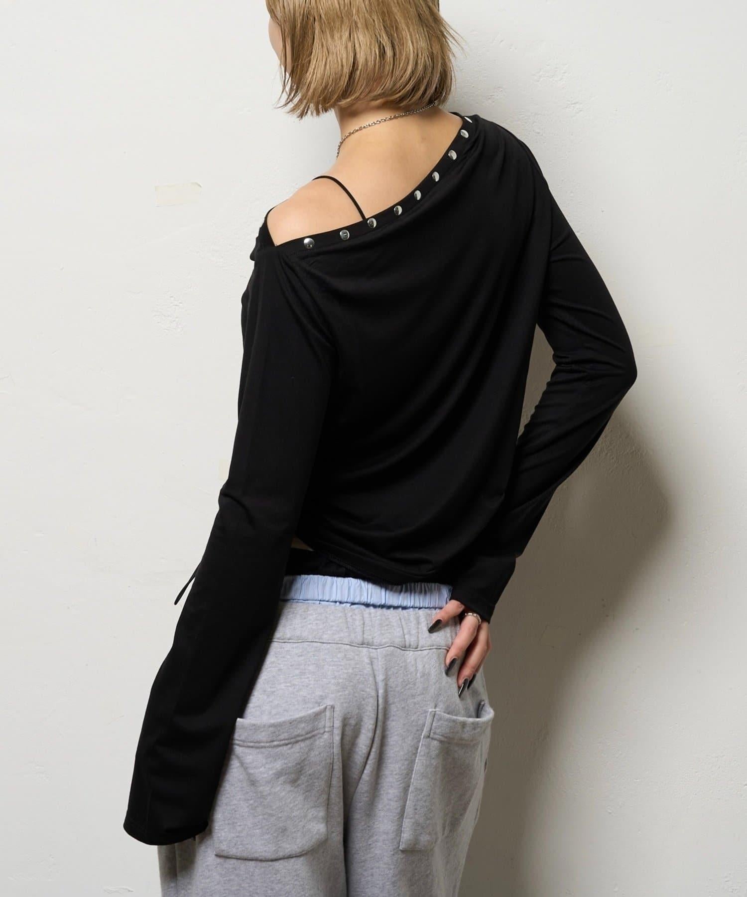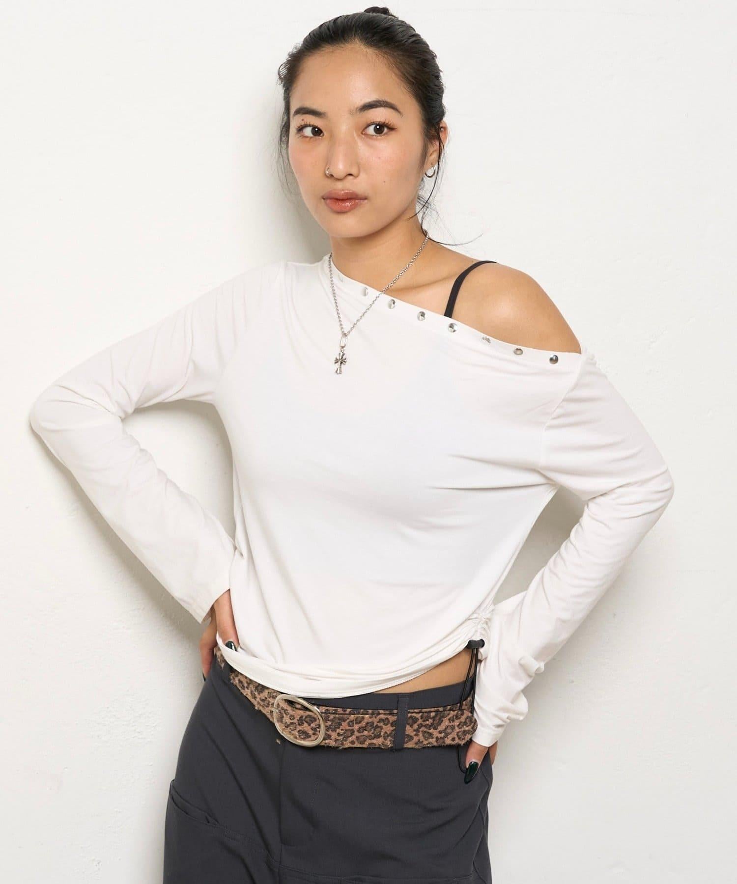 這款上衣採用單肩設計,飾有鉚釘。