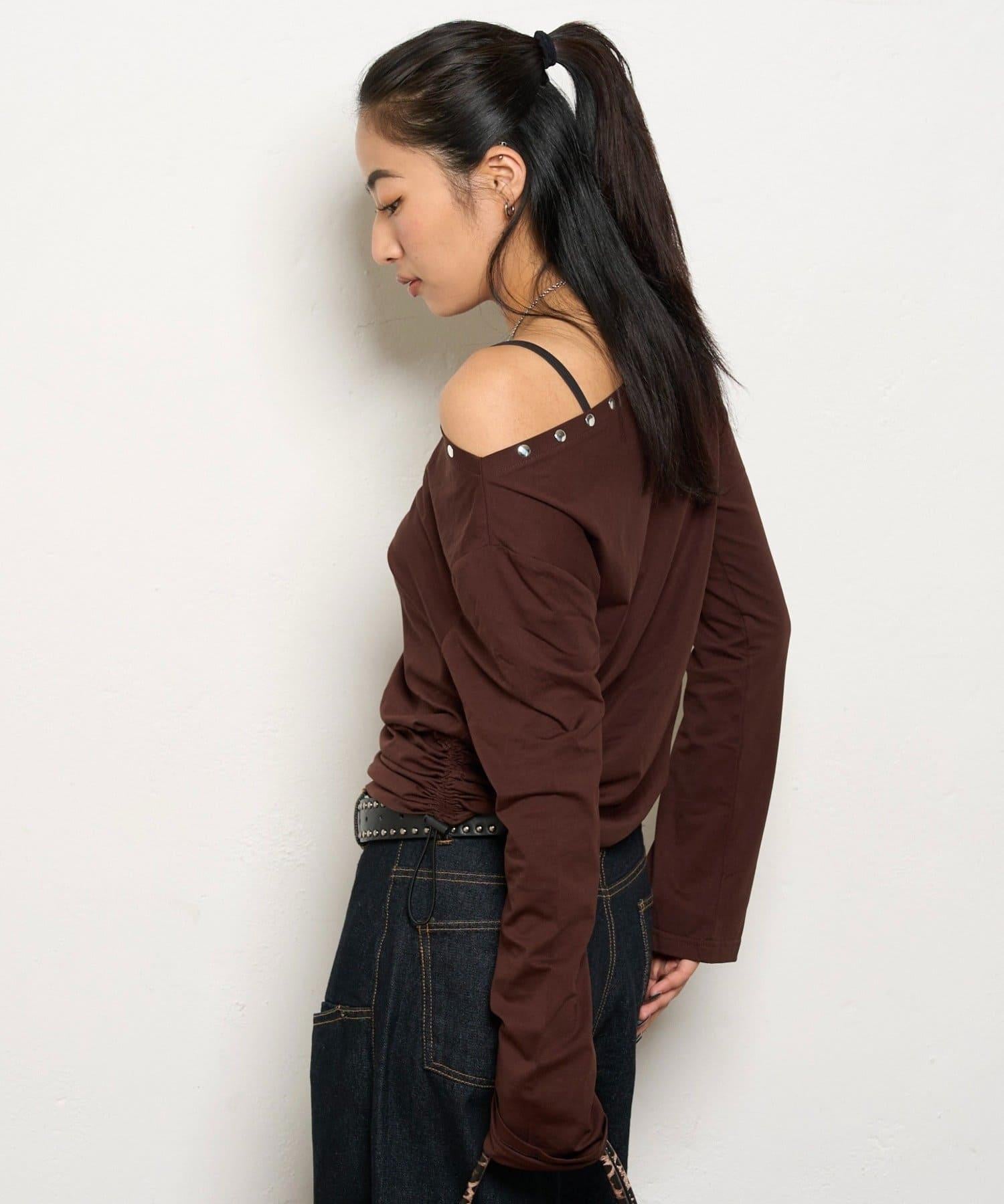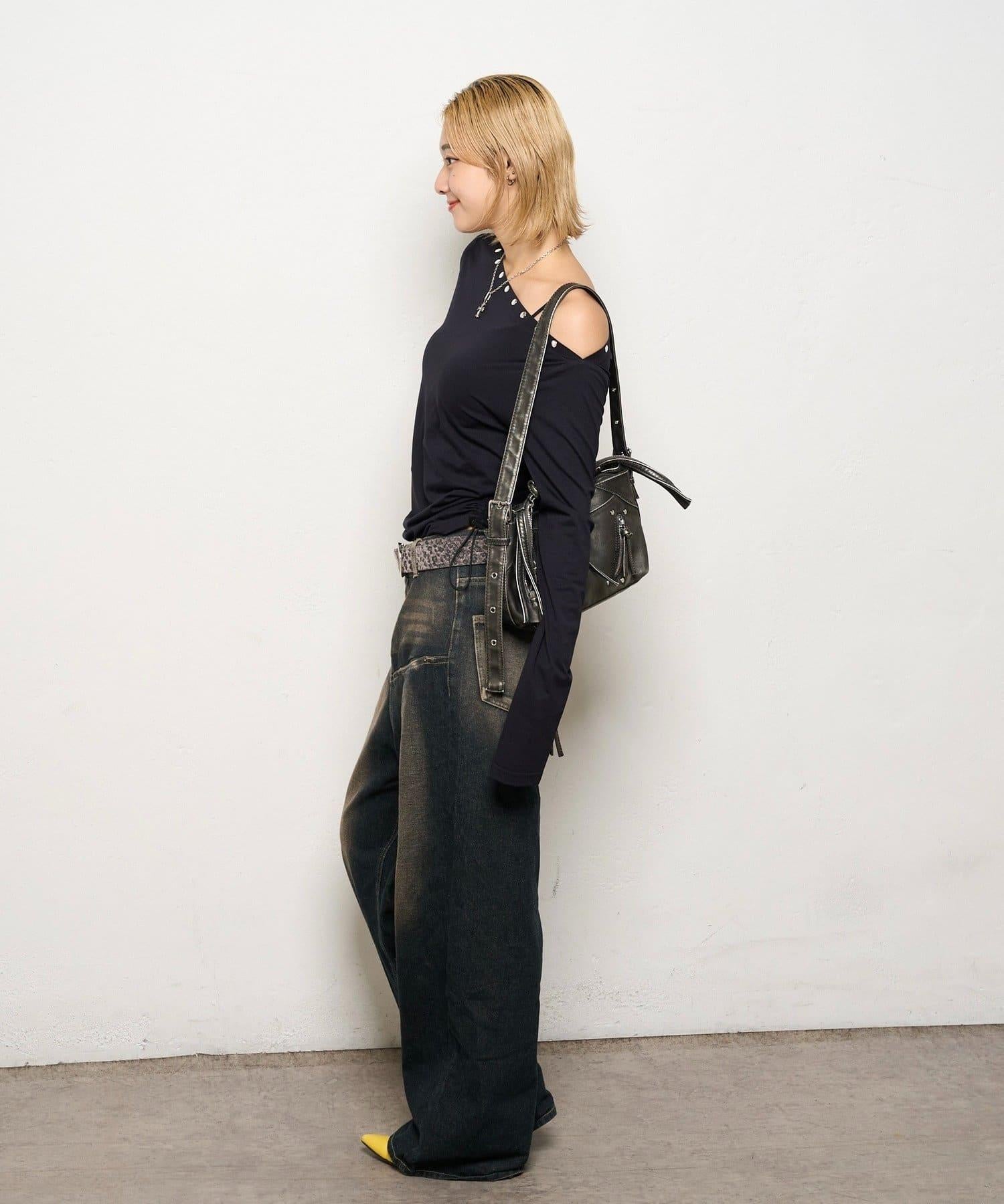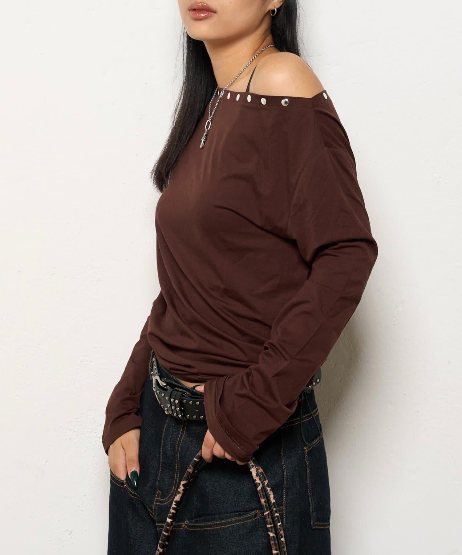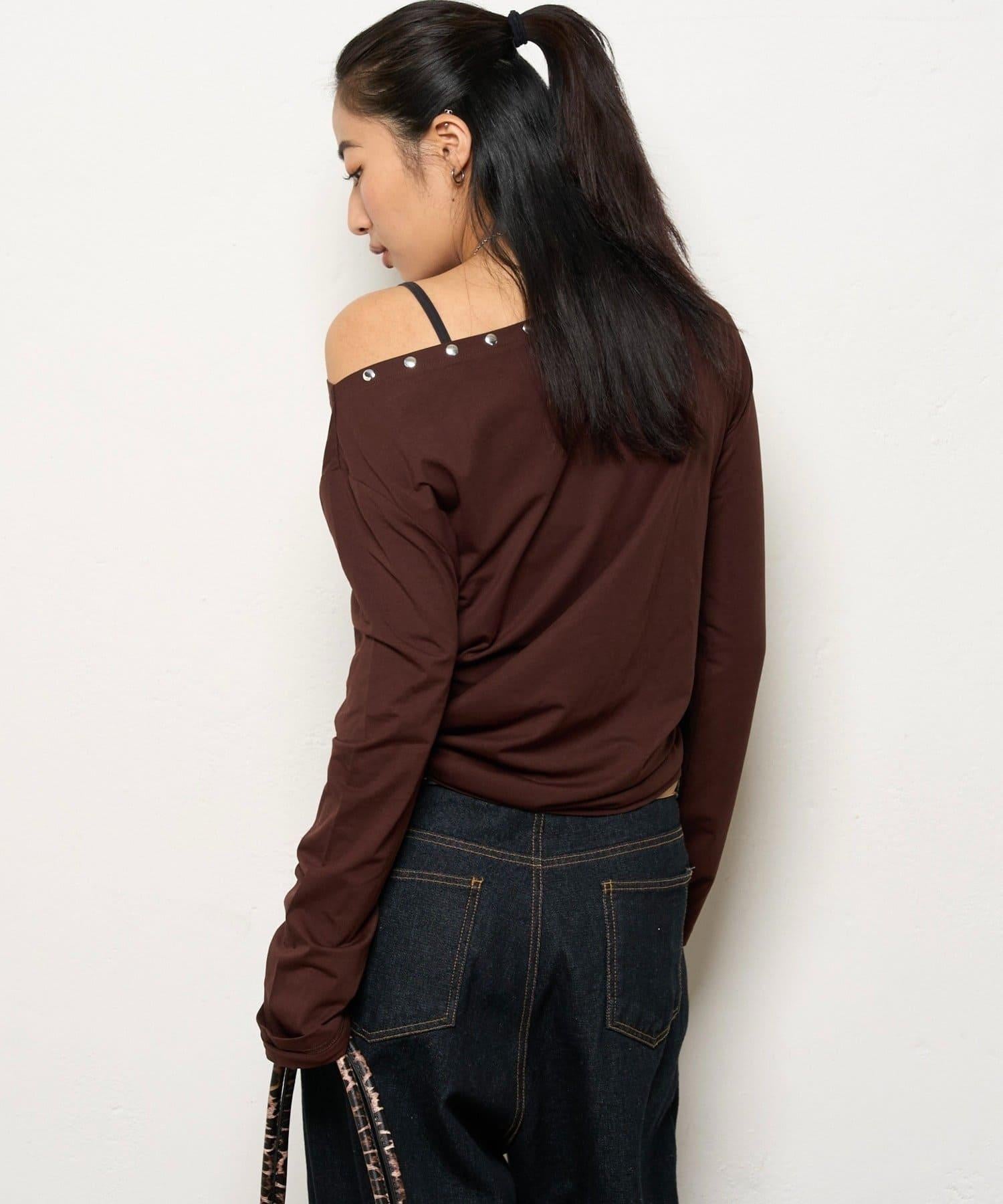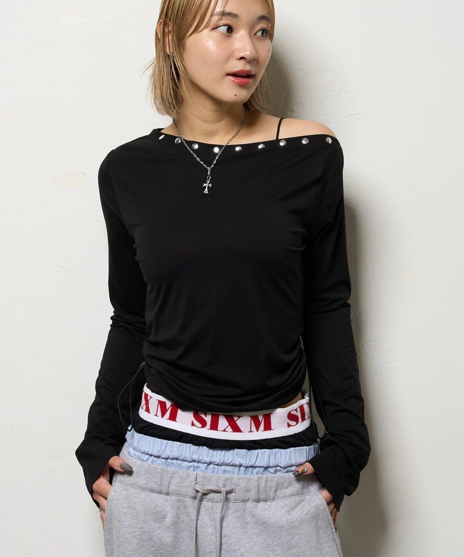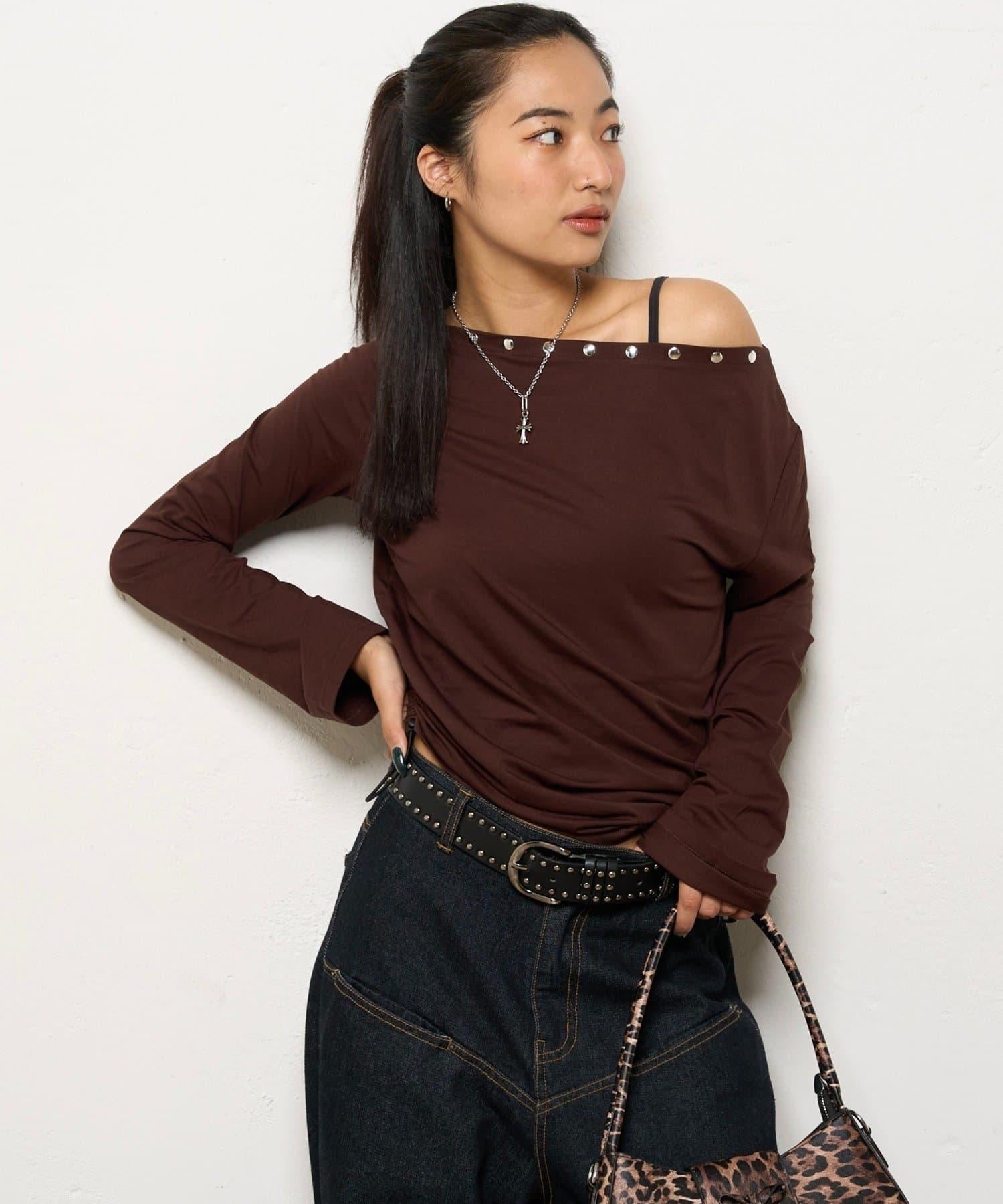 這款上衣採用單肩設計,飾有鉚釘。