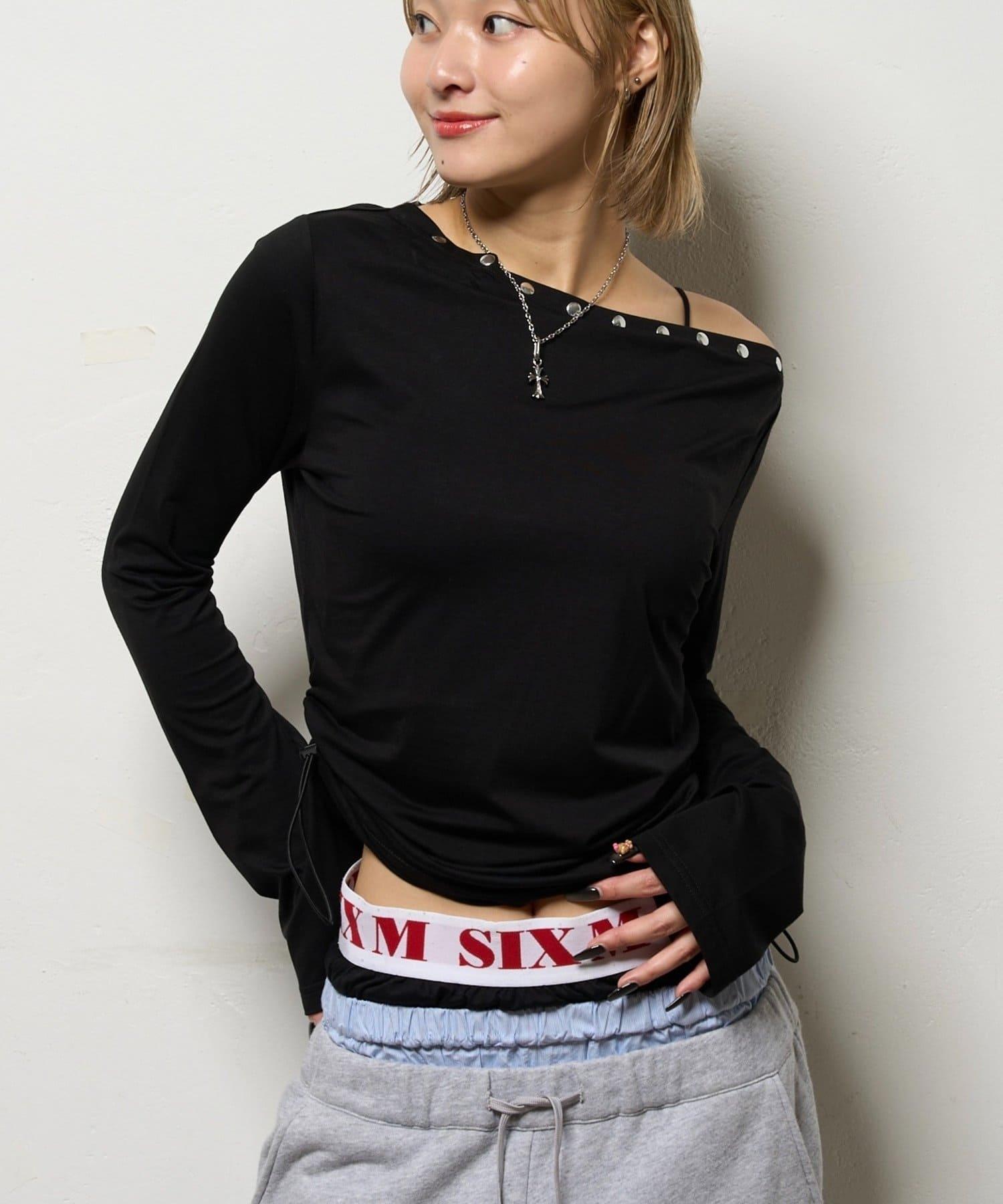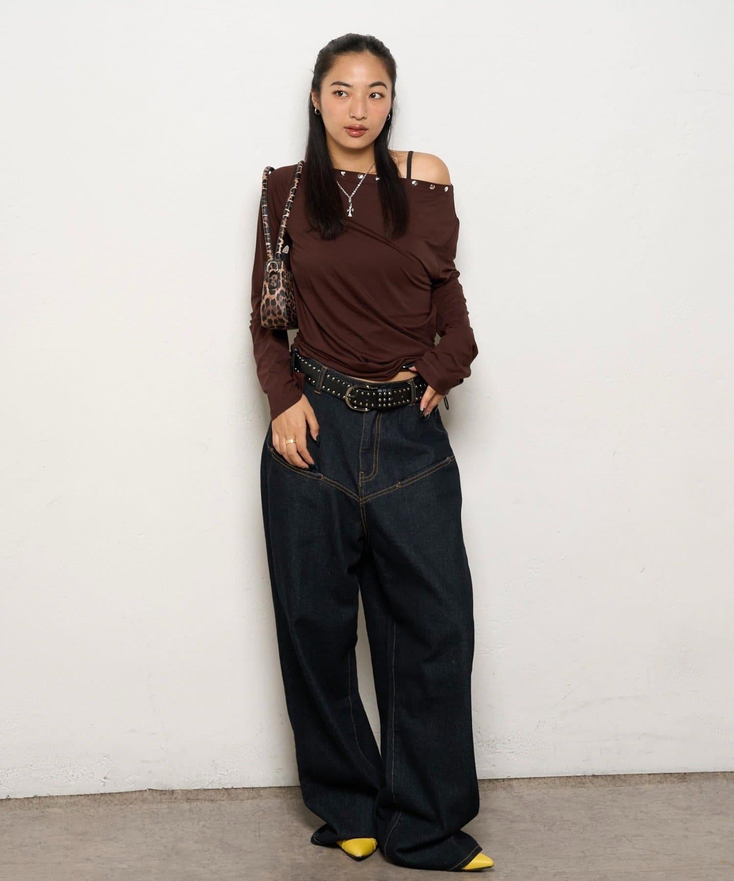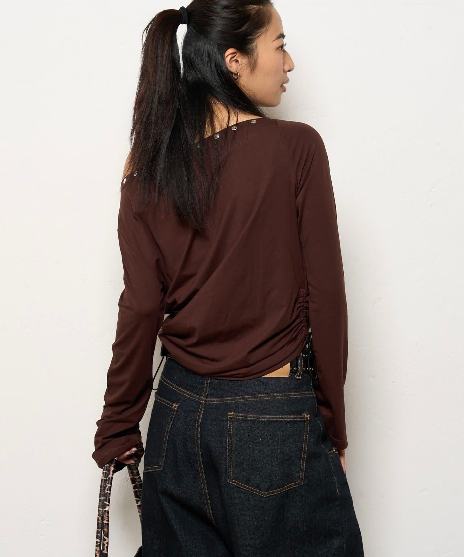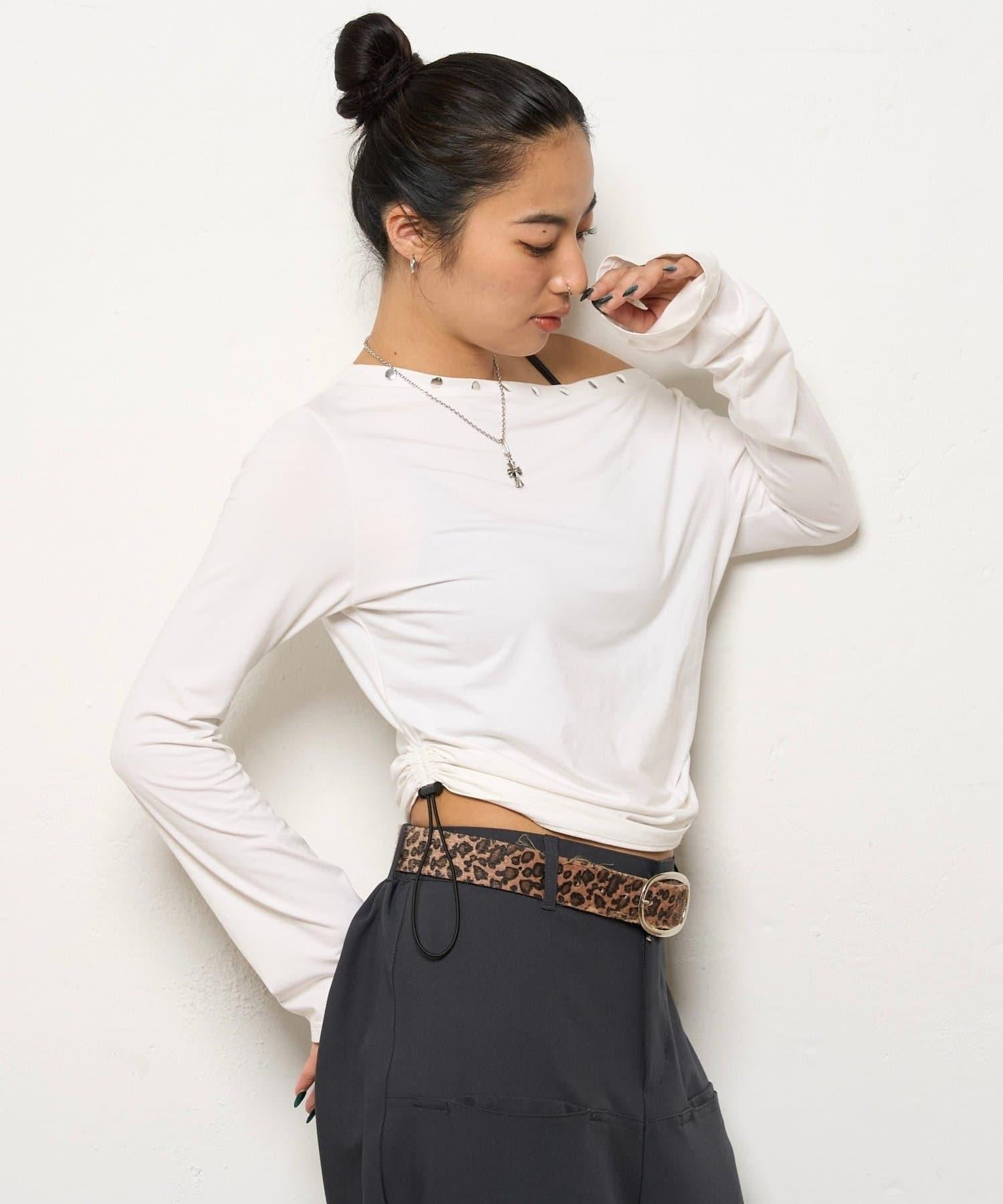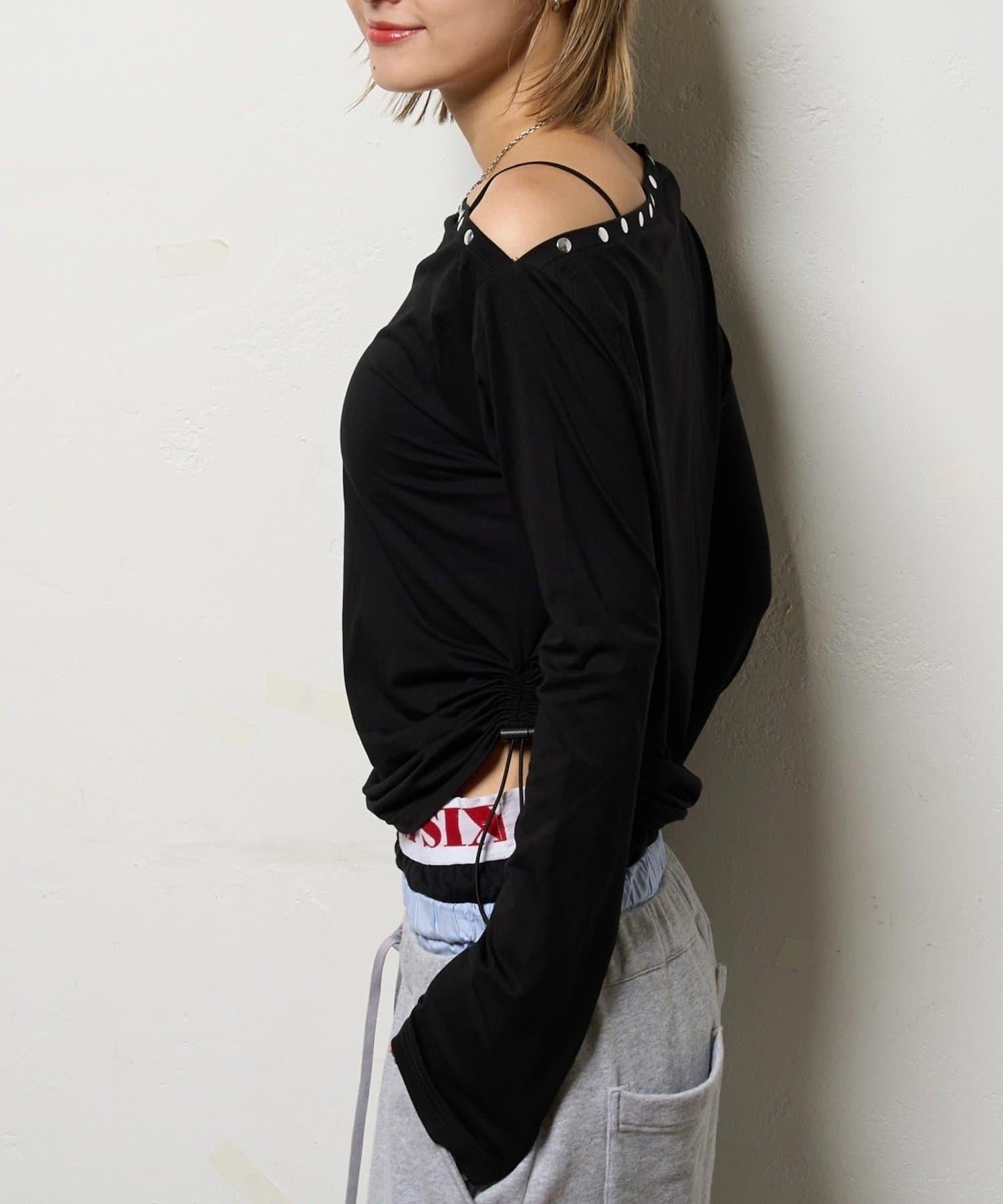 這款上衣採用單肩設計,飾有鉚釘。