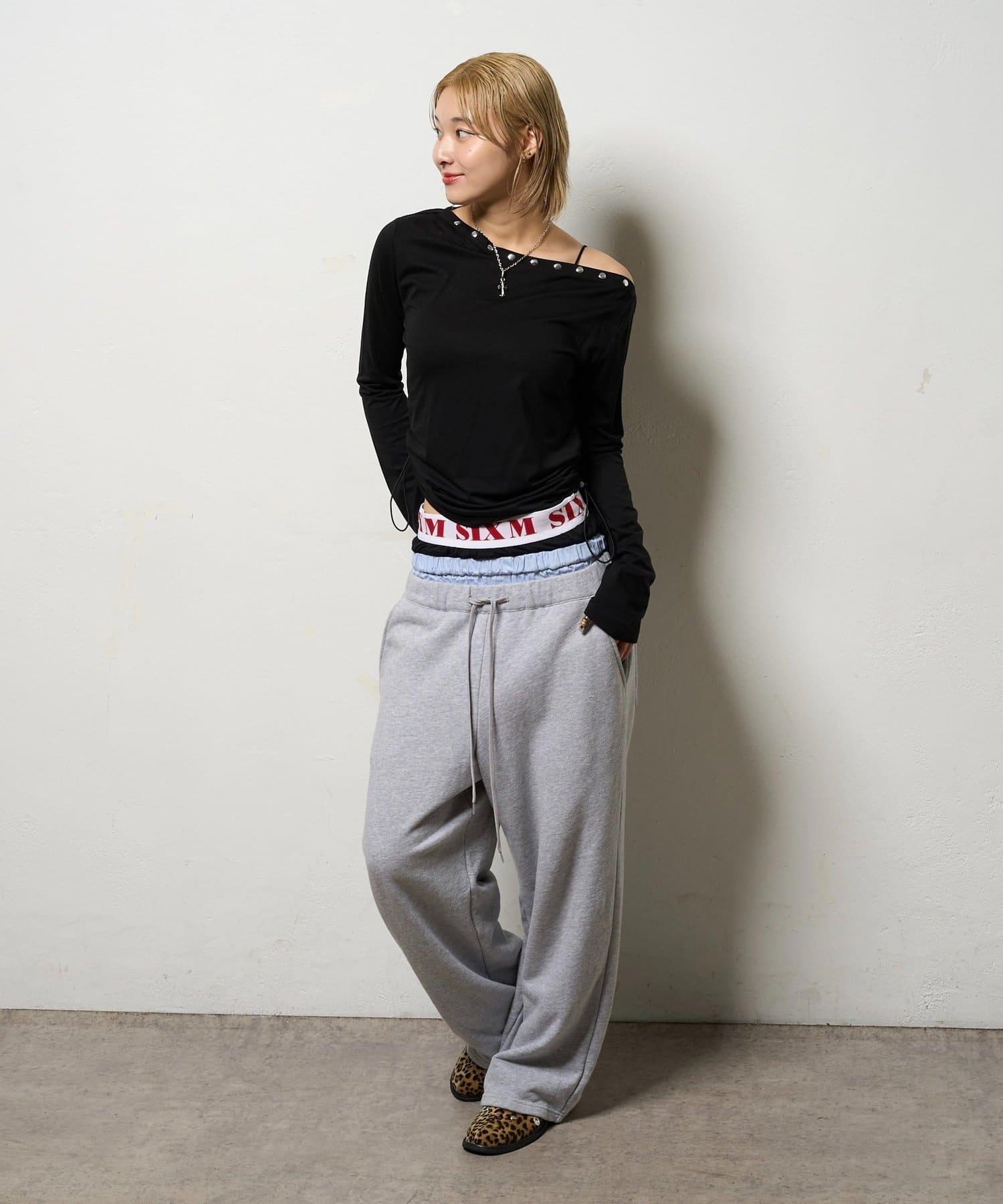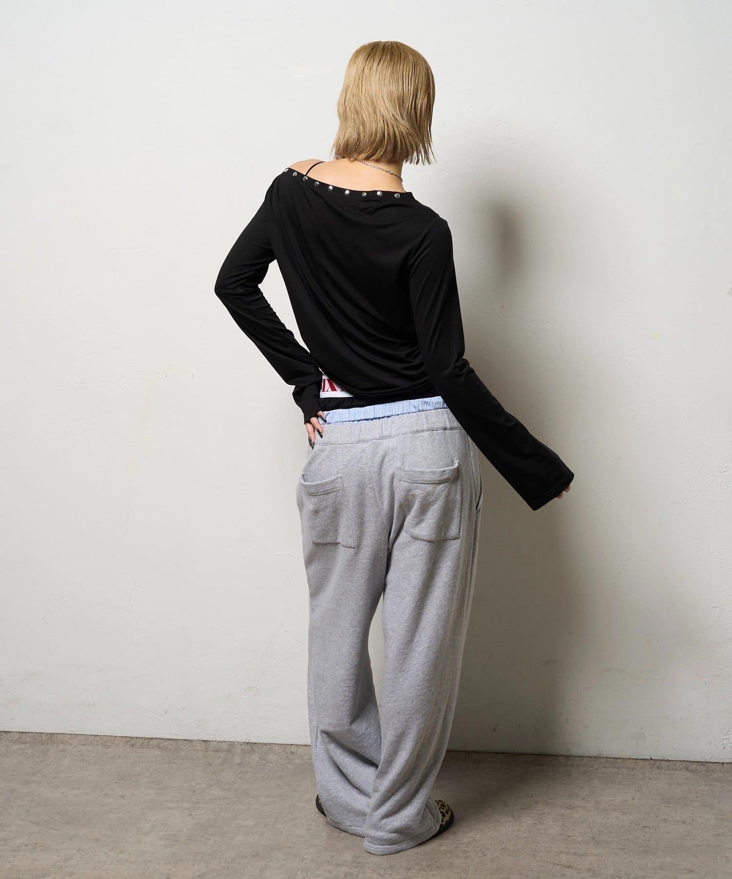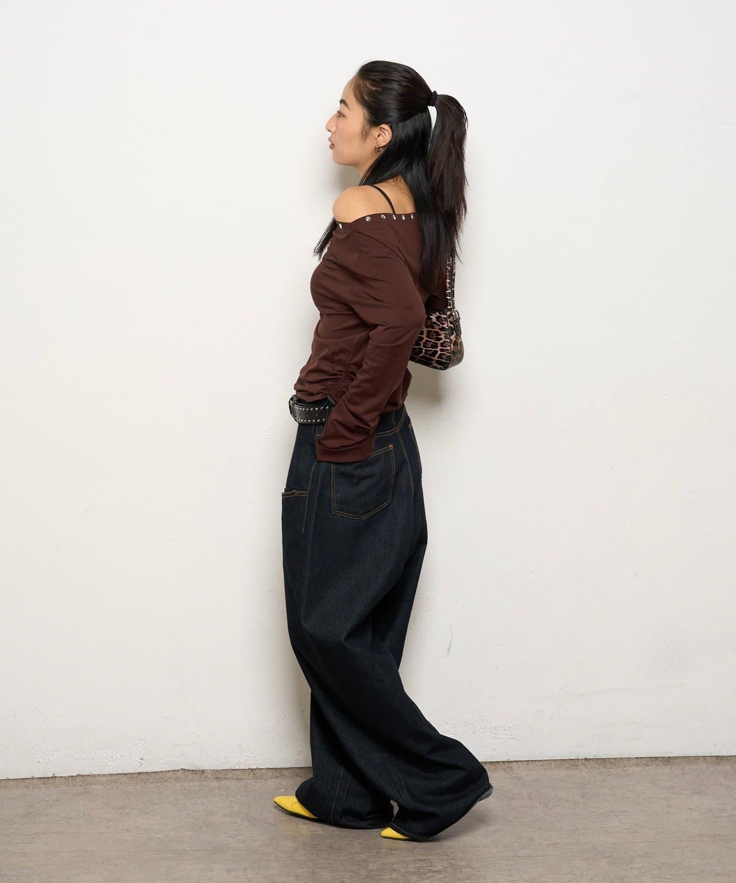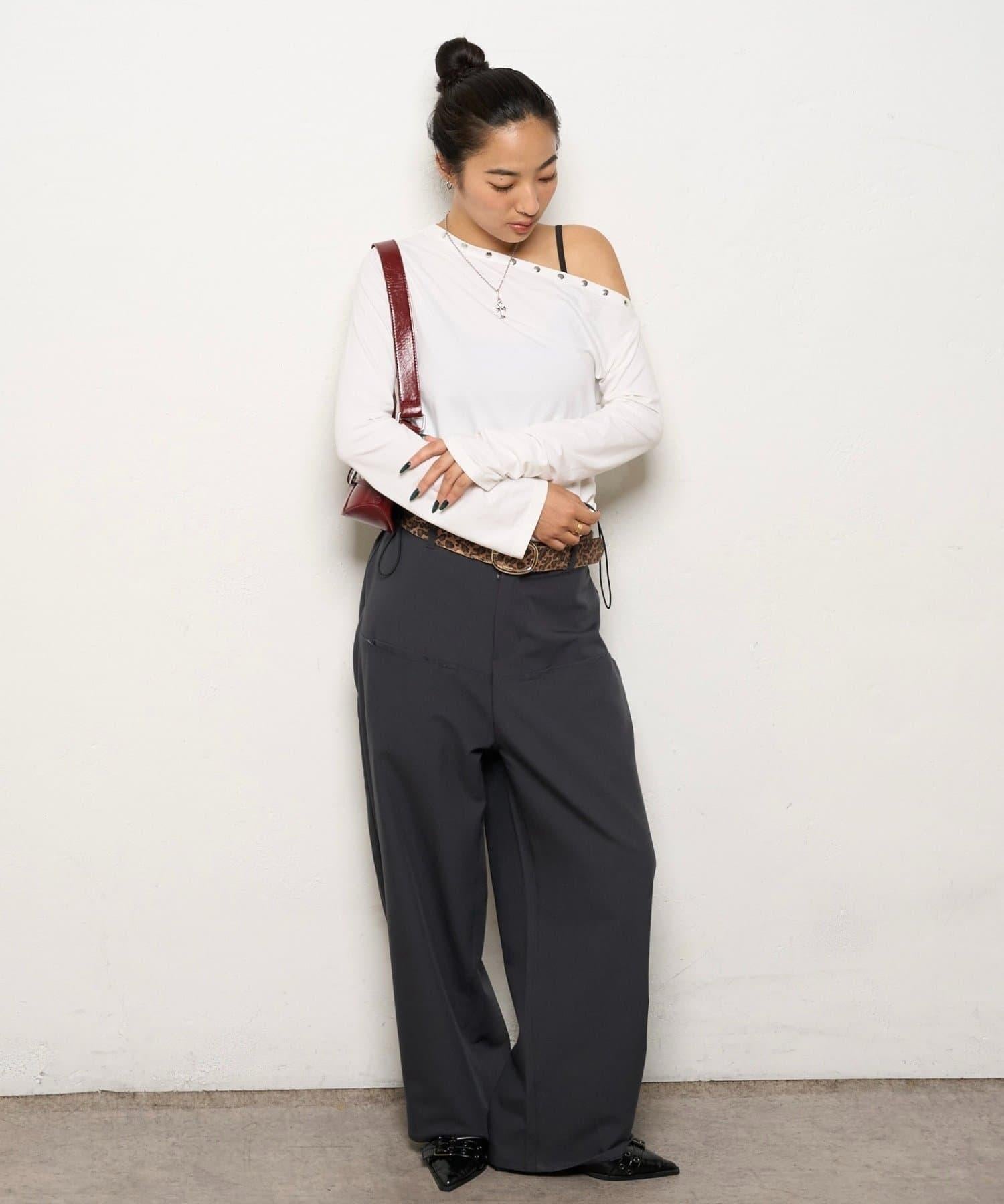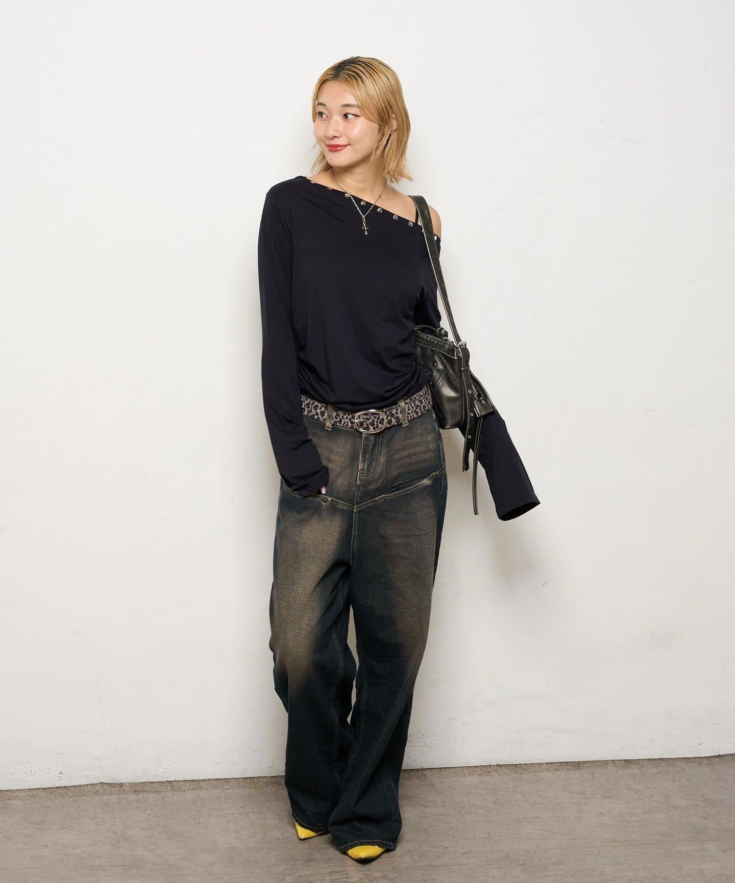 這款上衣採用單肩設計,飾有鉚釘。