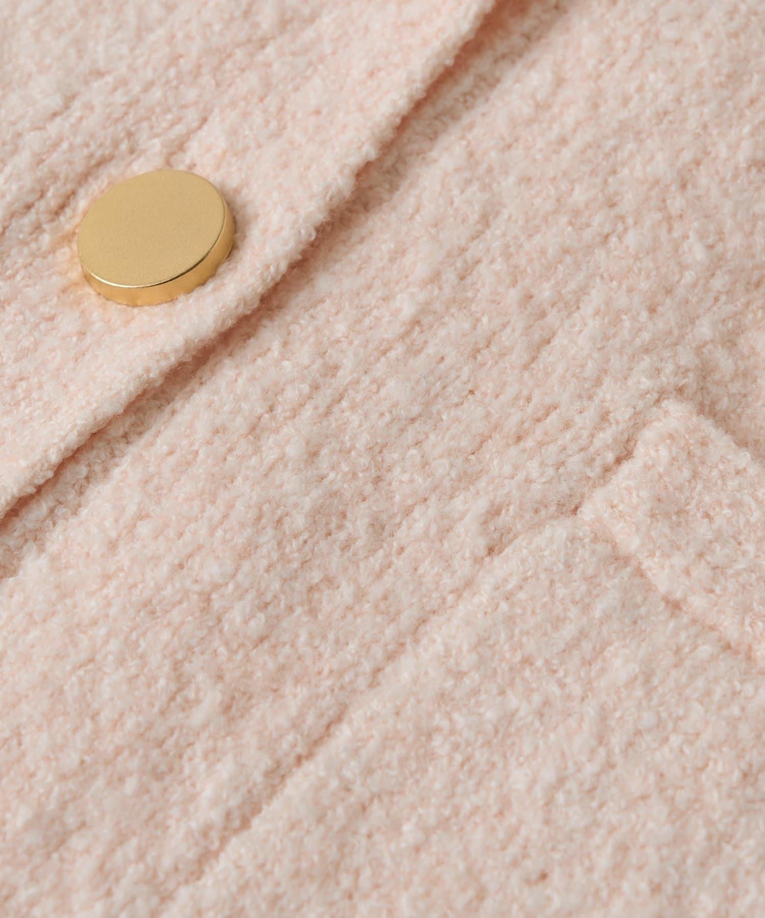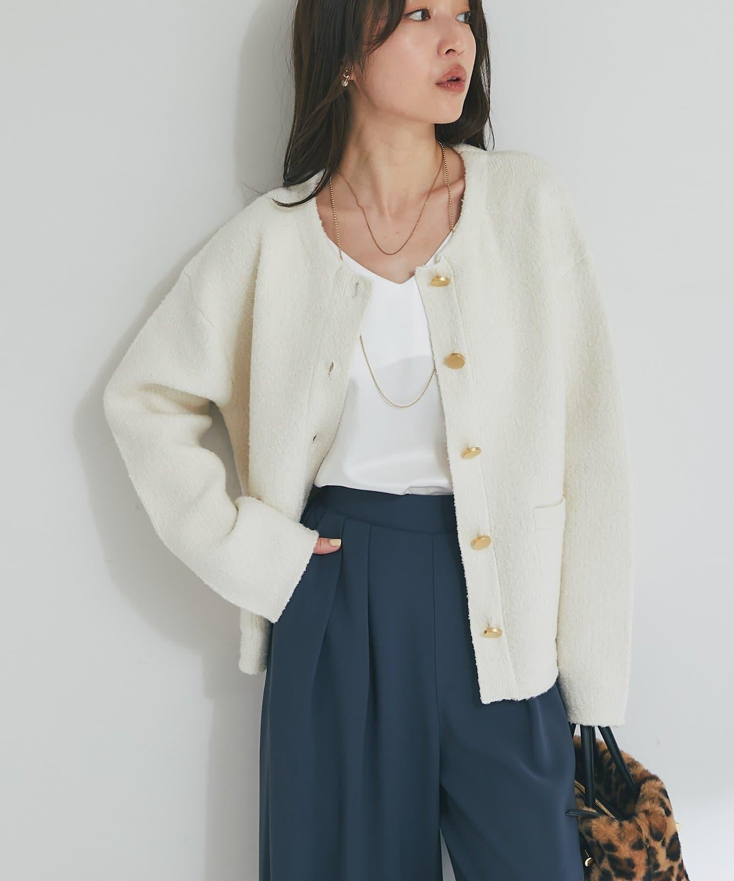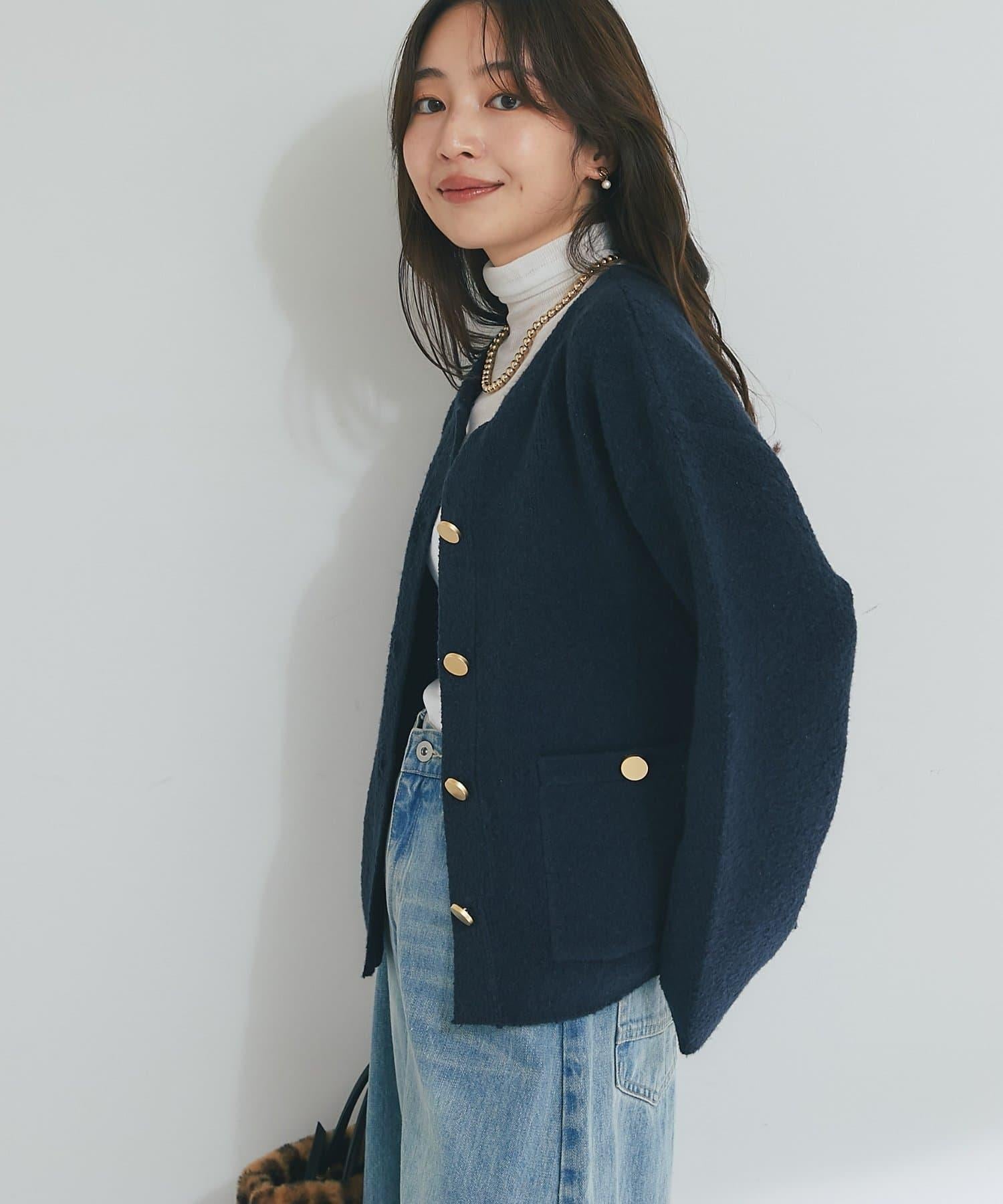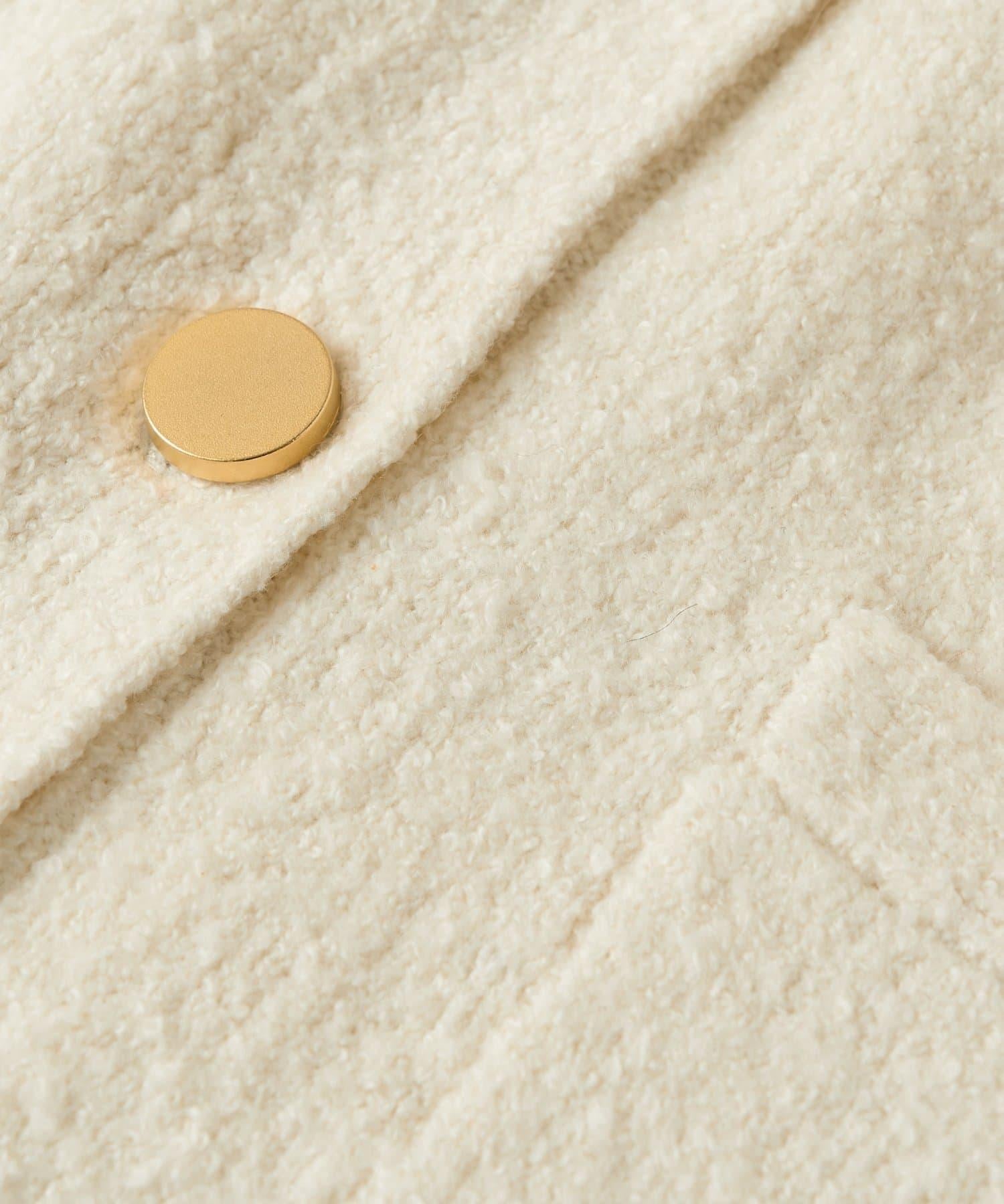 無領設計和金色紐扣給人一種高雅精緻的感覺、