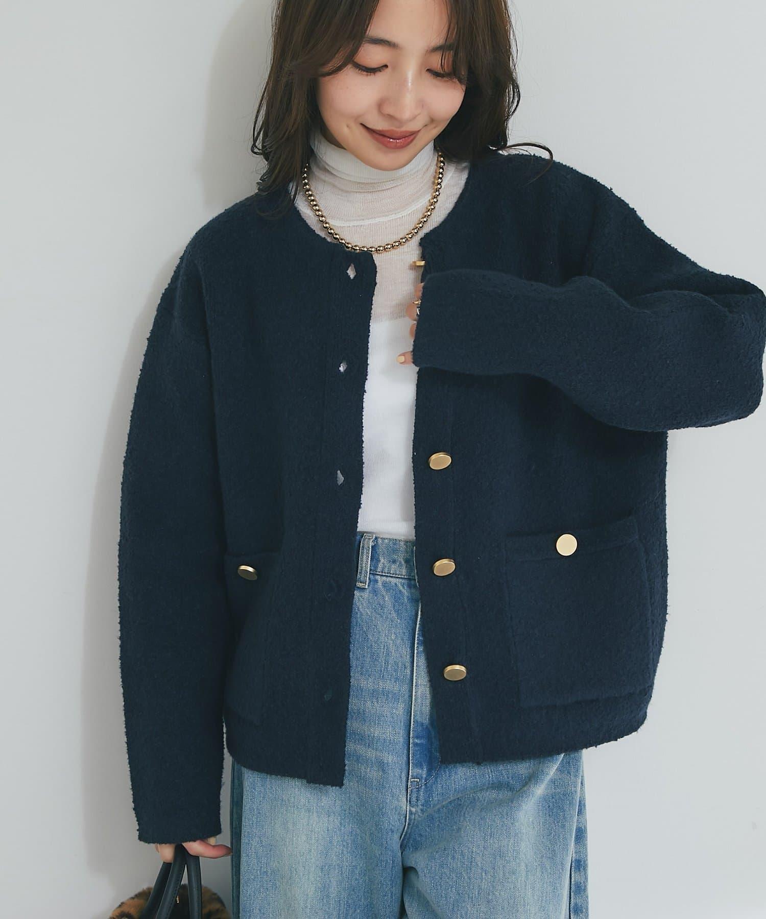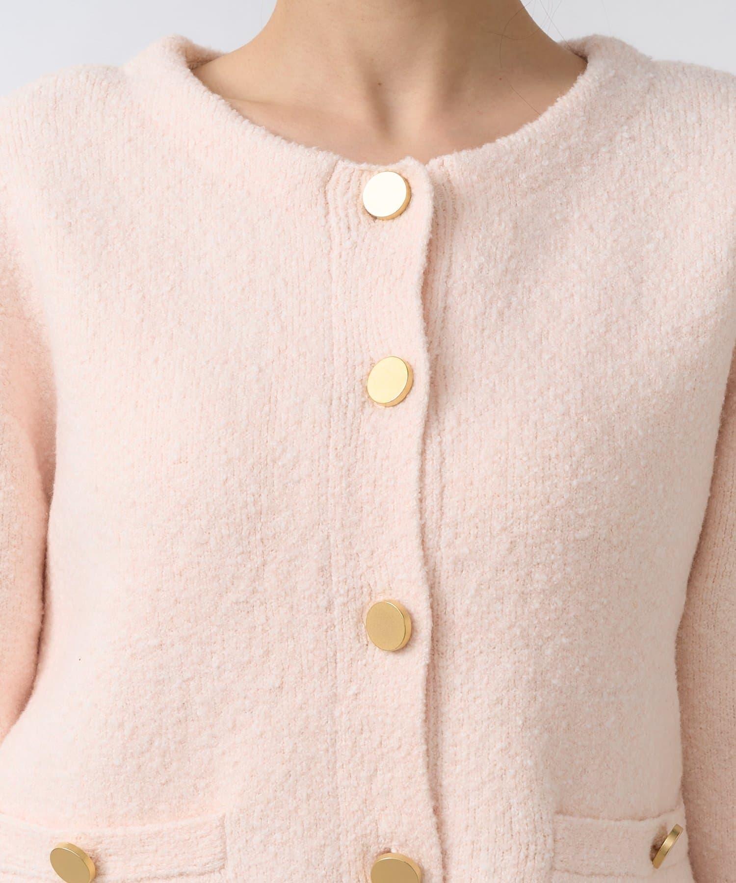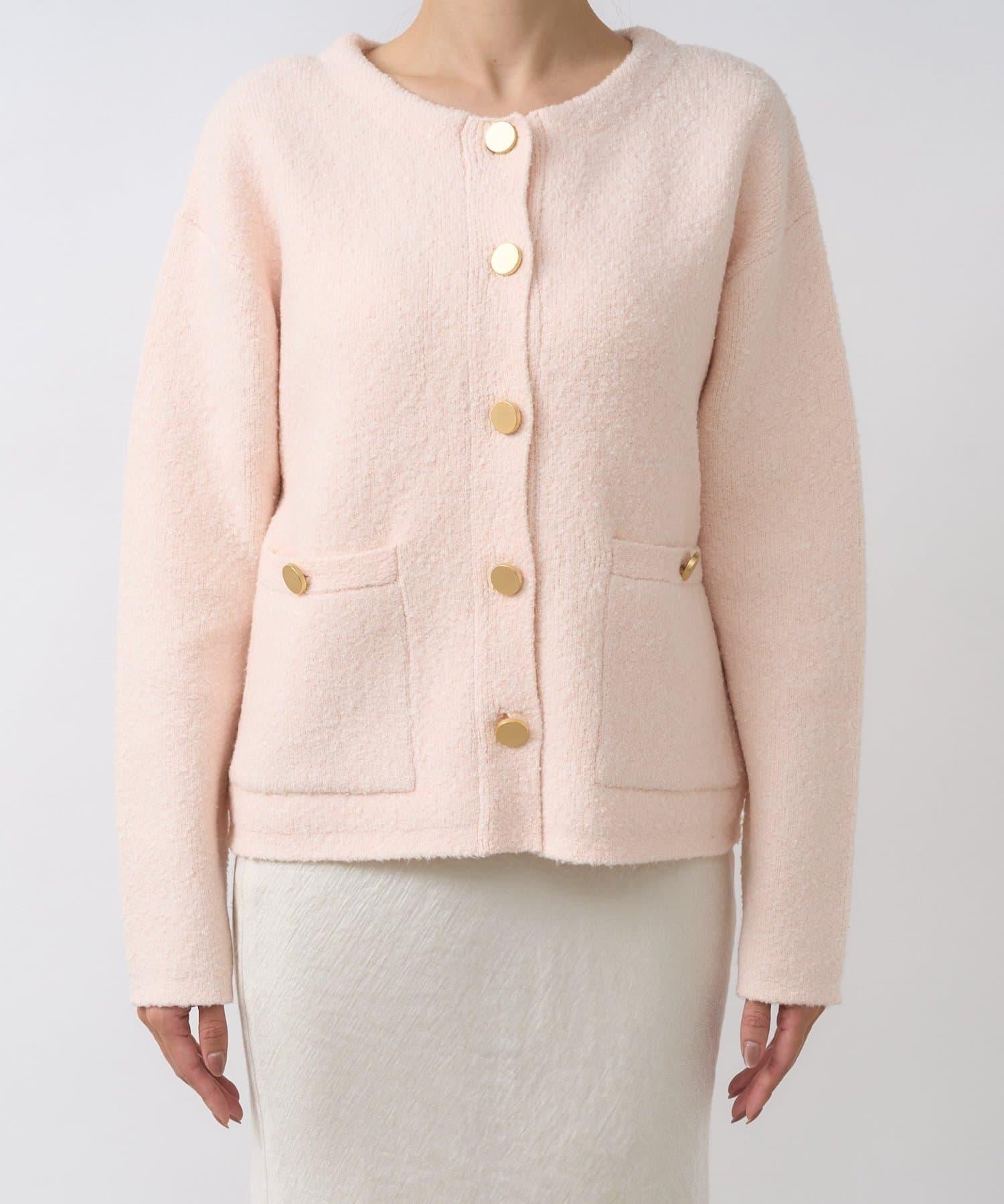 無領設計和金色紐扣給人一種高雅精緻的感覺、