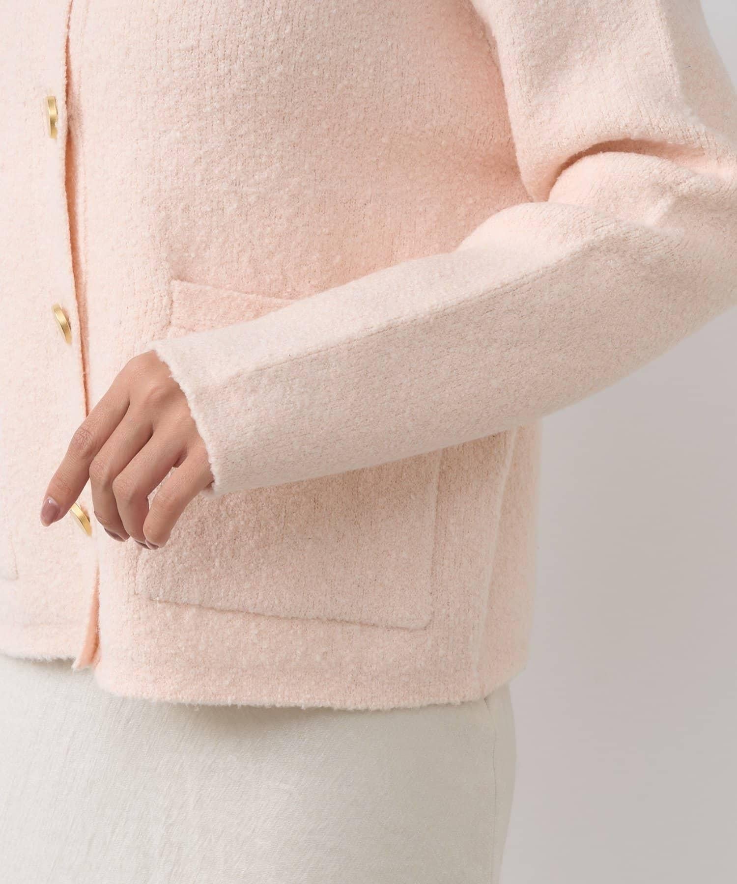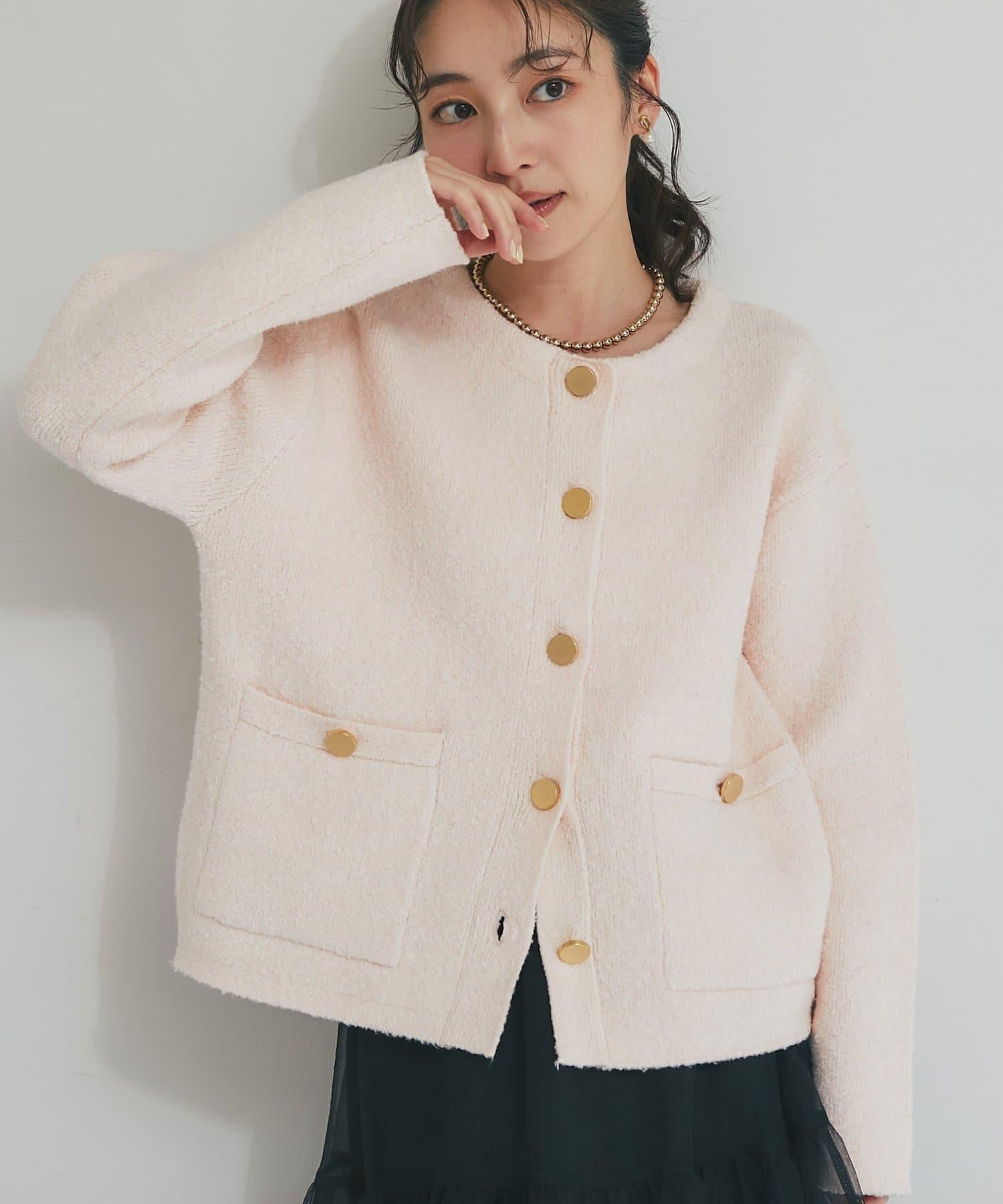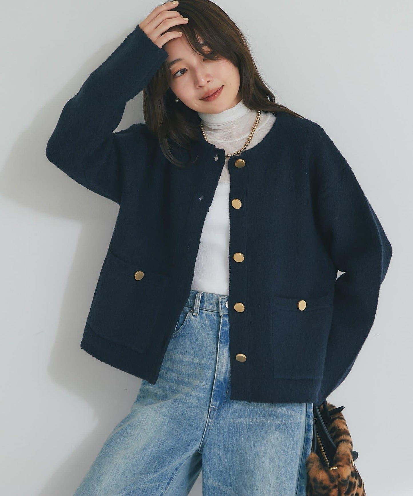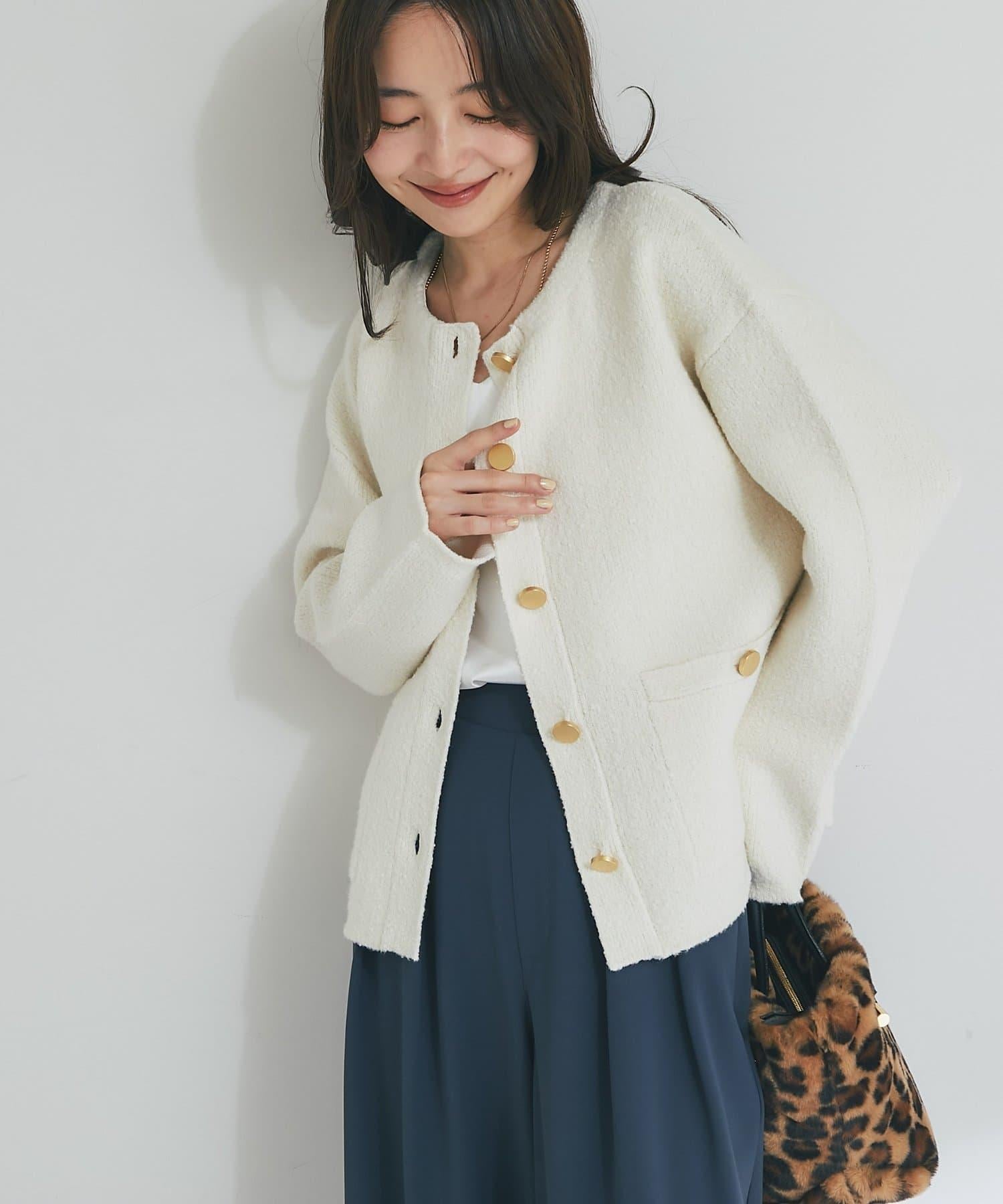 無領設計和金色紐扣給人一種高雅精緻的感覺、