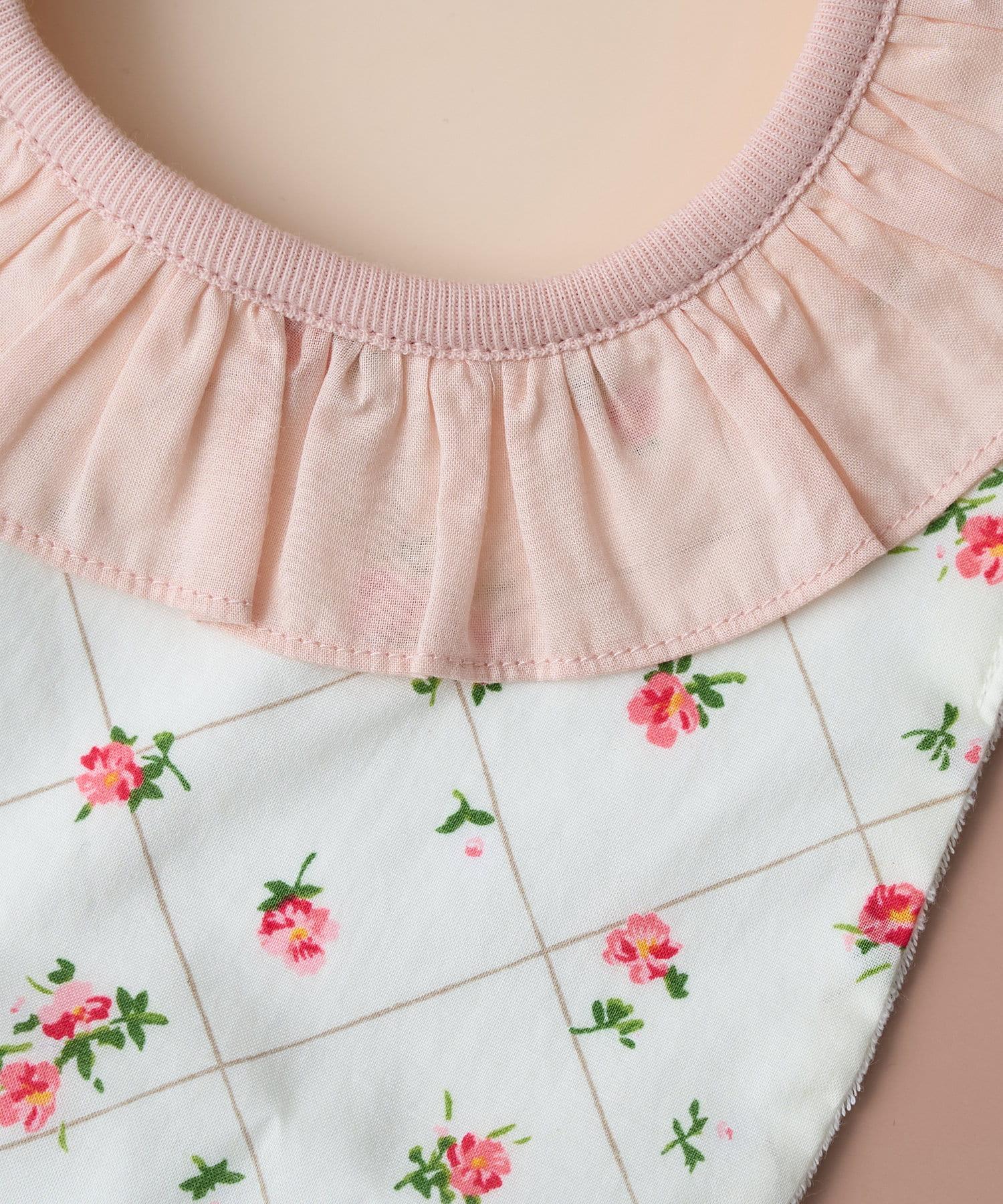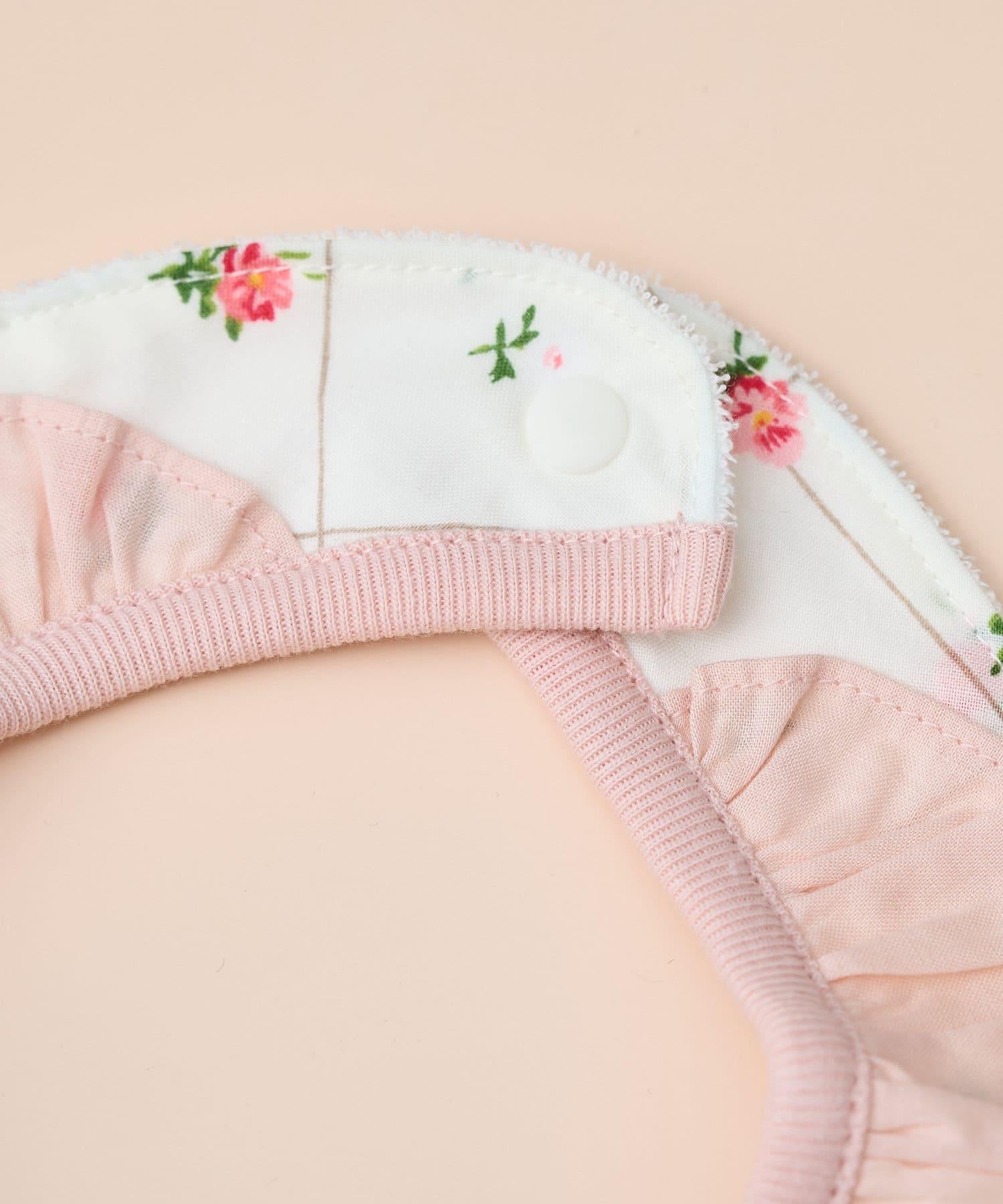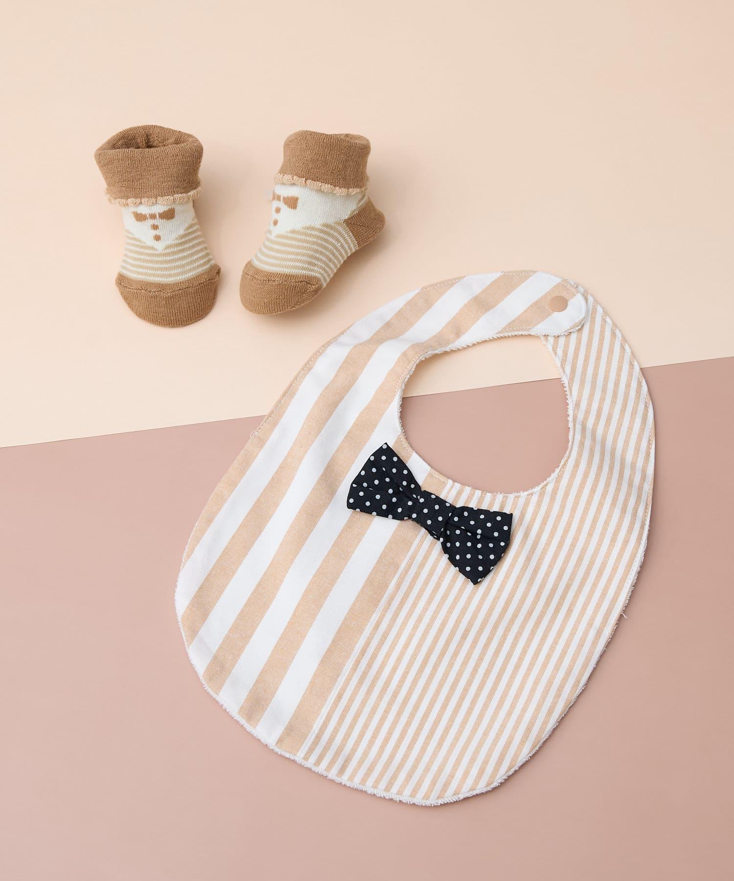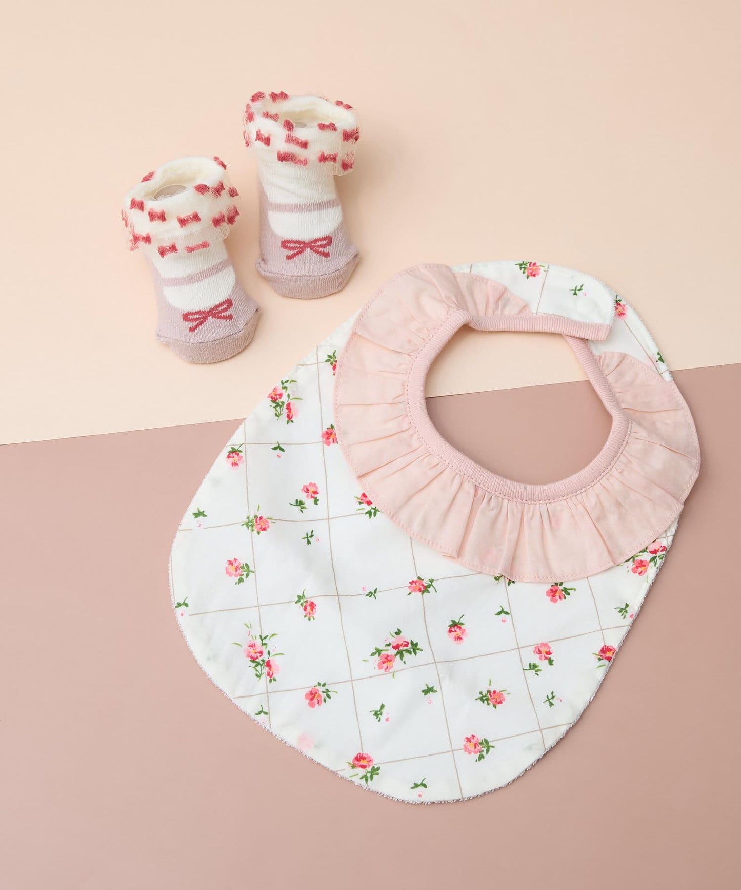 圍嘴上的條紋圖案用絲帶裝飾,花朵圖案用荷葉邊裝飾,增強了寶寶的可愛感。按扣設計方便穿脫。圍兜和襪子可搭配成一套,讓寶寶的裝扮更加可愛。