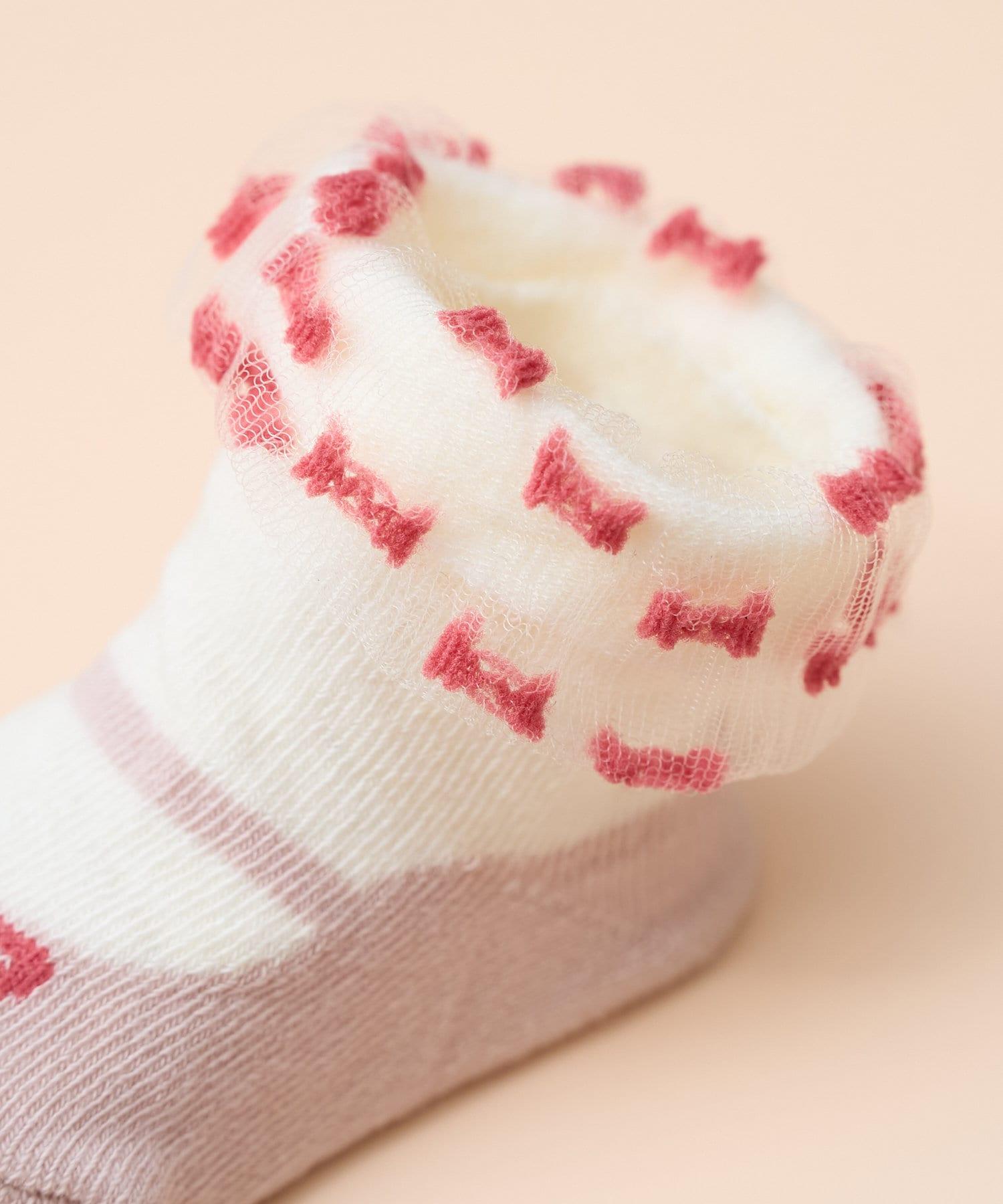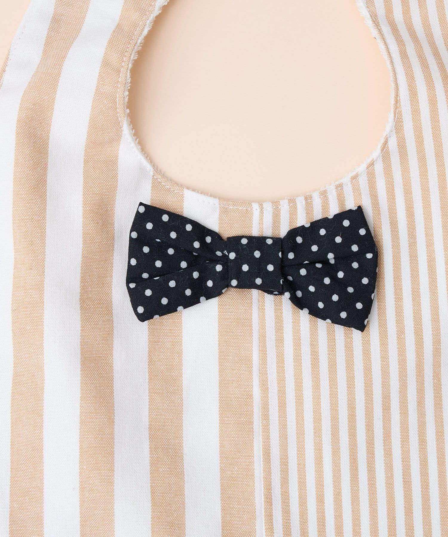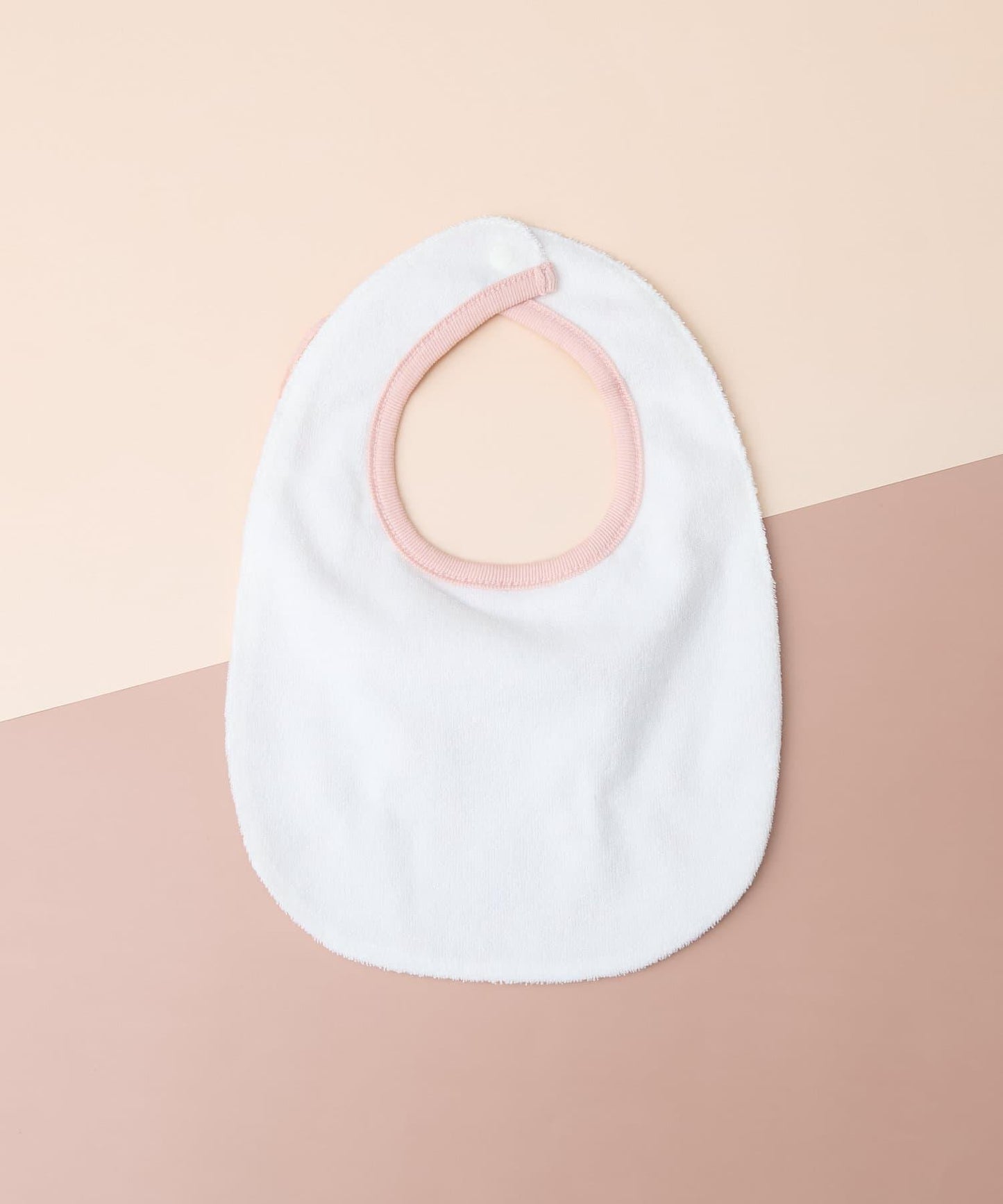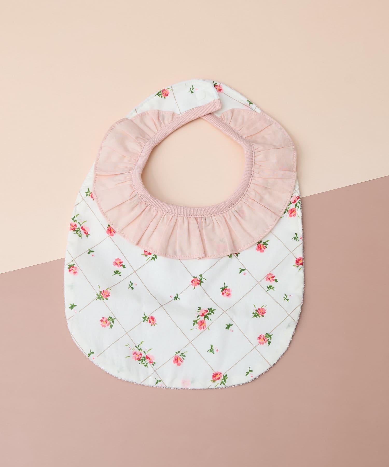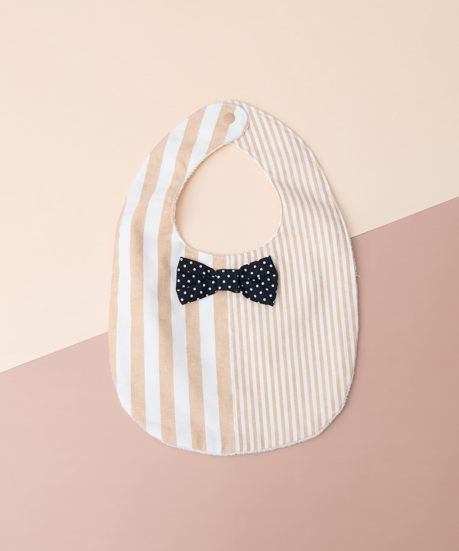 圍嘴上的條紋圖案用絲帶裝飾,花朵圖案用荷葉邊裝飾,增強了寶寶的可愛感。按扣設計方便穿脫。圍兜和襪子可搭配成一套,讓寶寶的裝扮更加可愛。