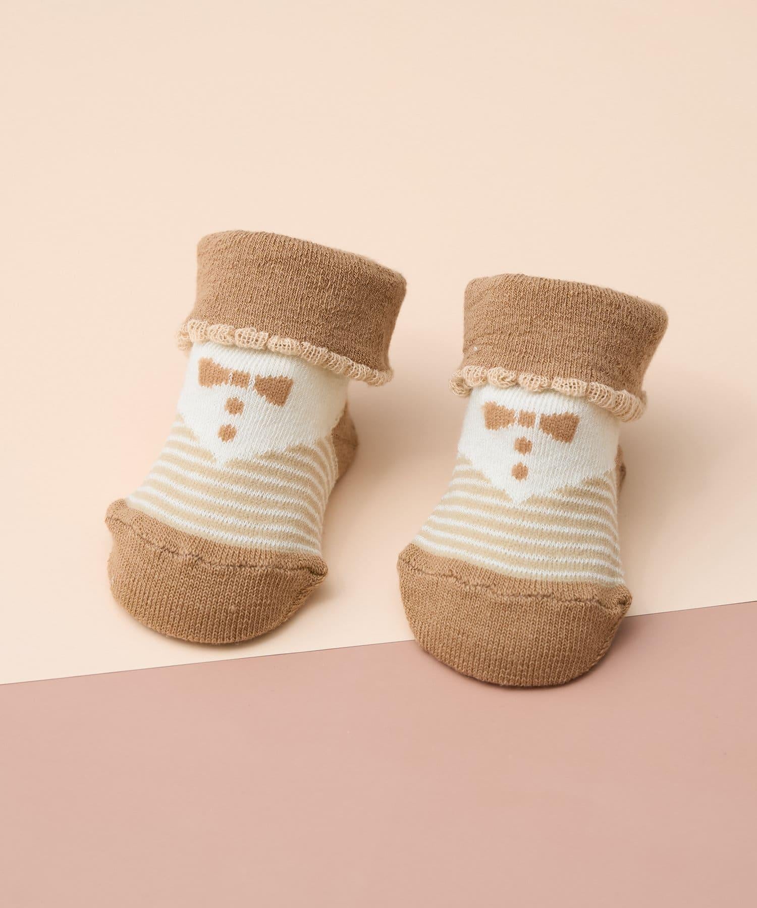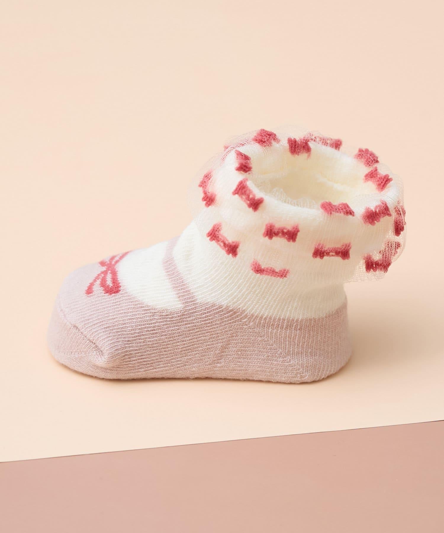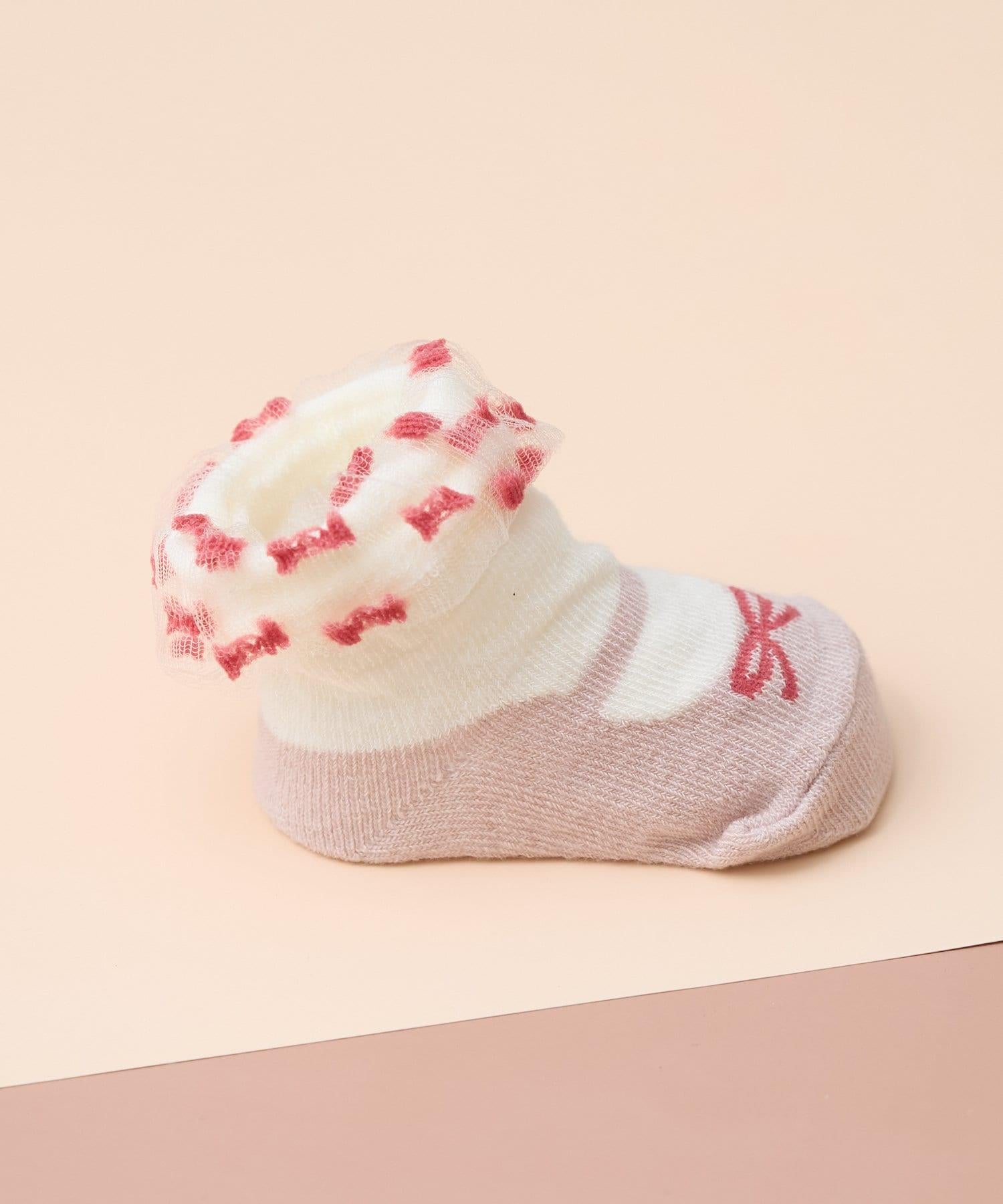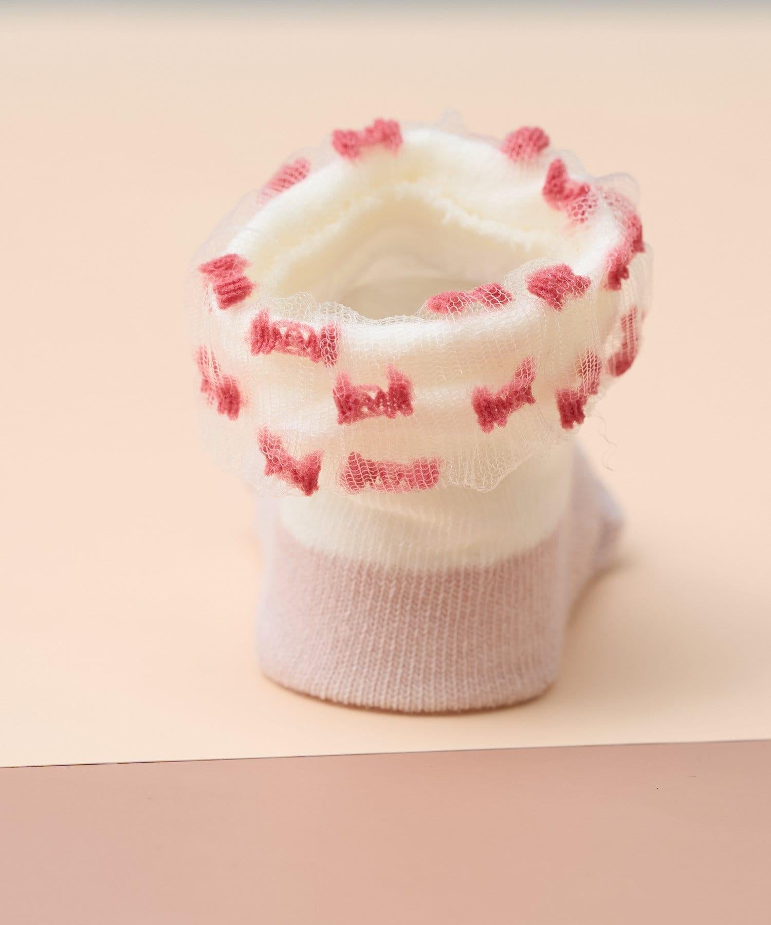 圍嘴上的條紋圖案用絲帶裝飾,花朵圖案用荷葉邊裝飾,增強了寶寶的可愛感。按扣設計方便穿脫。圍兜和襪子可搭配成一套,讓寶寶的裝扮更加可愛。