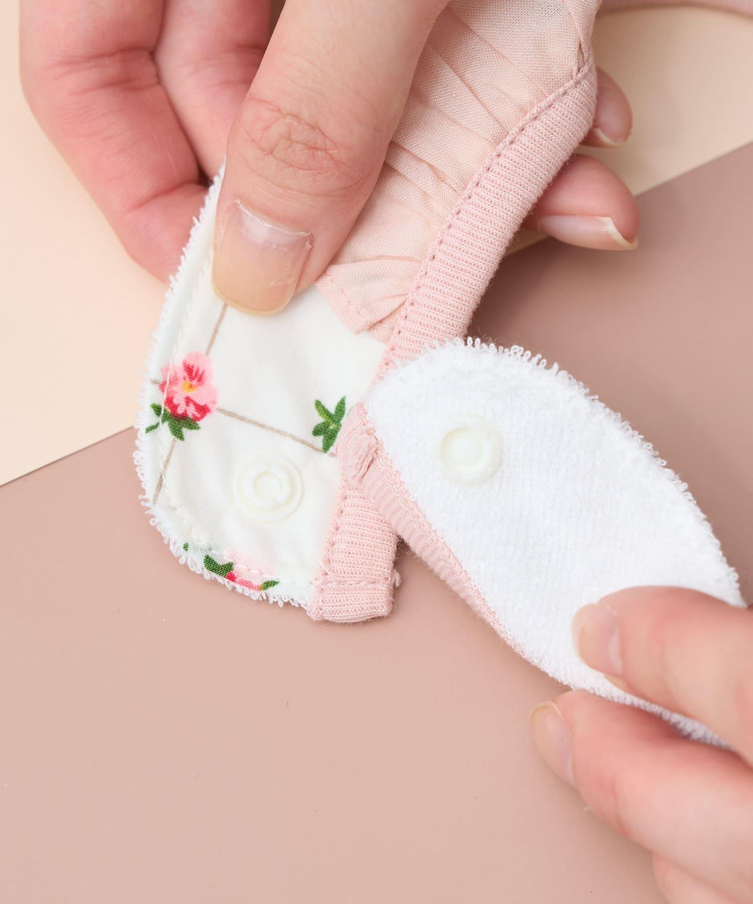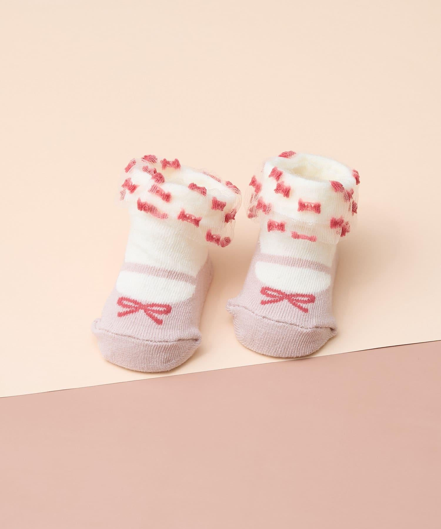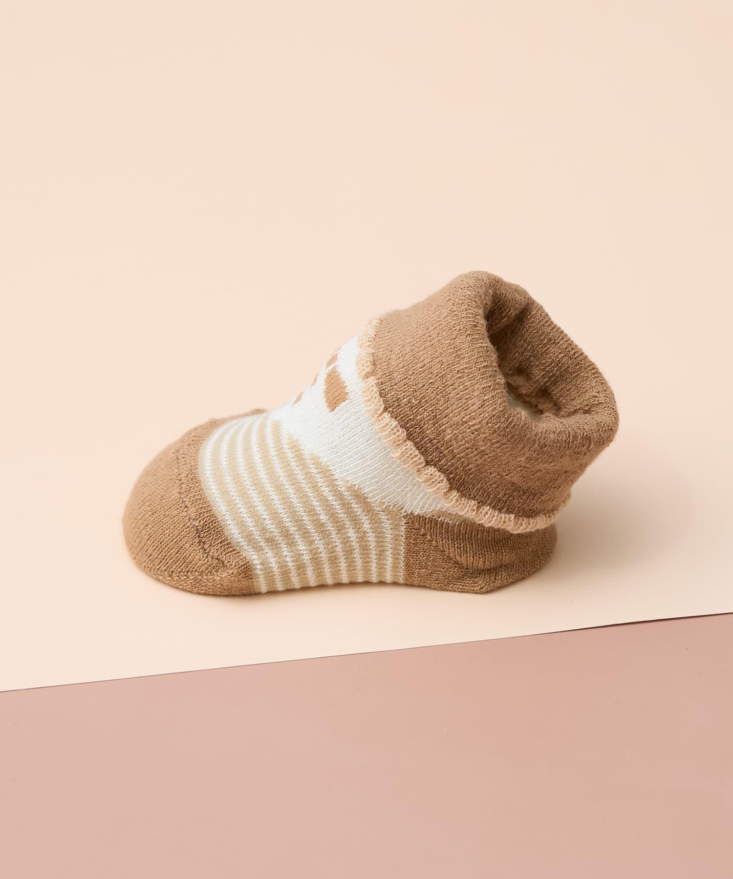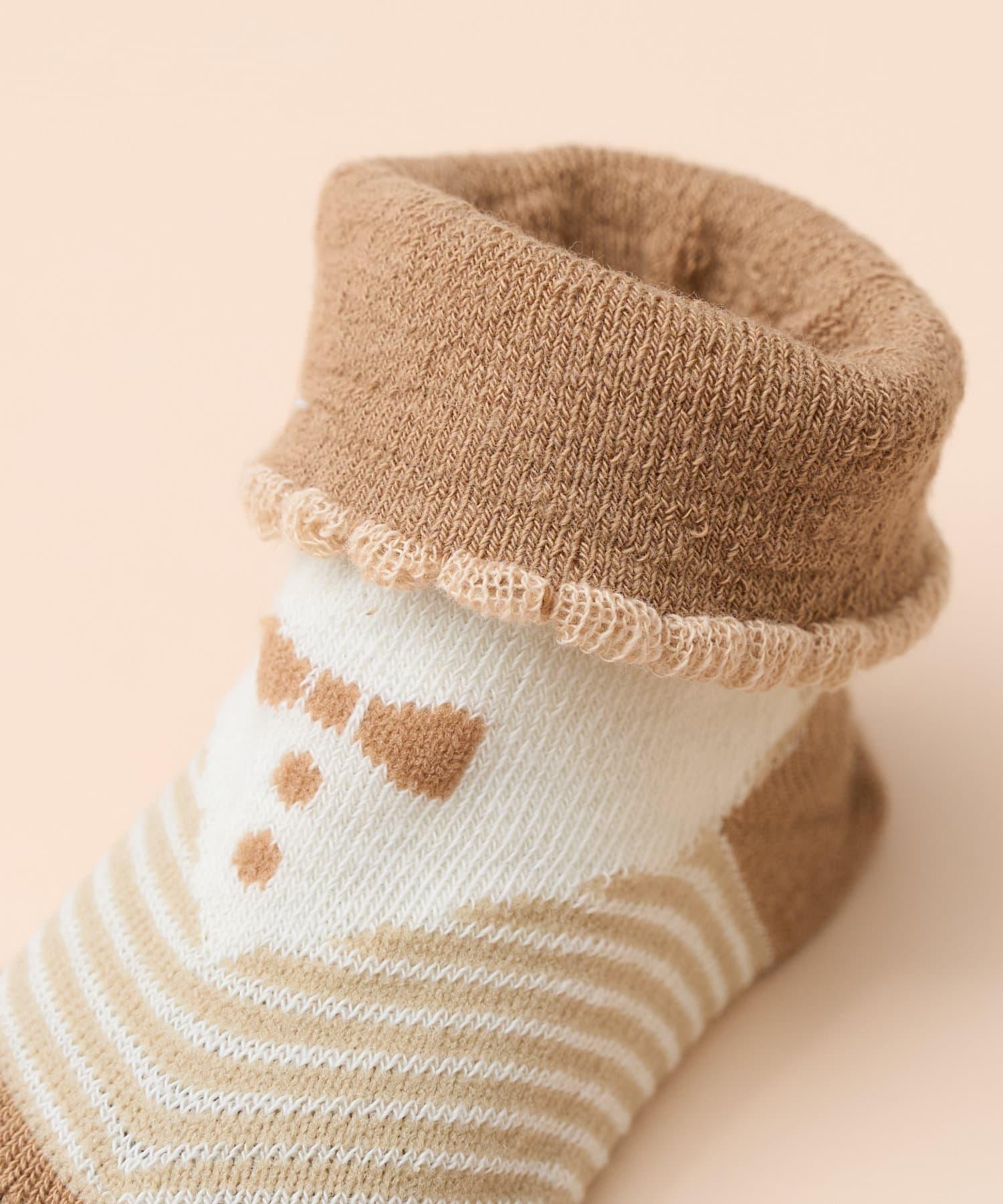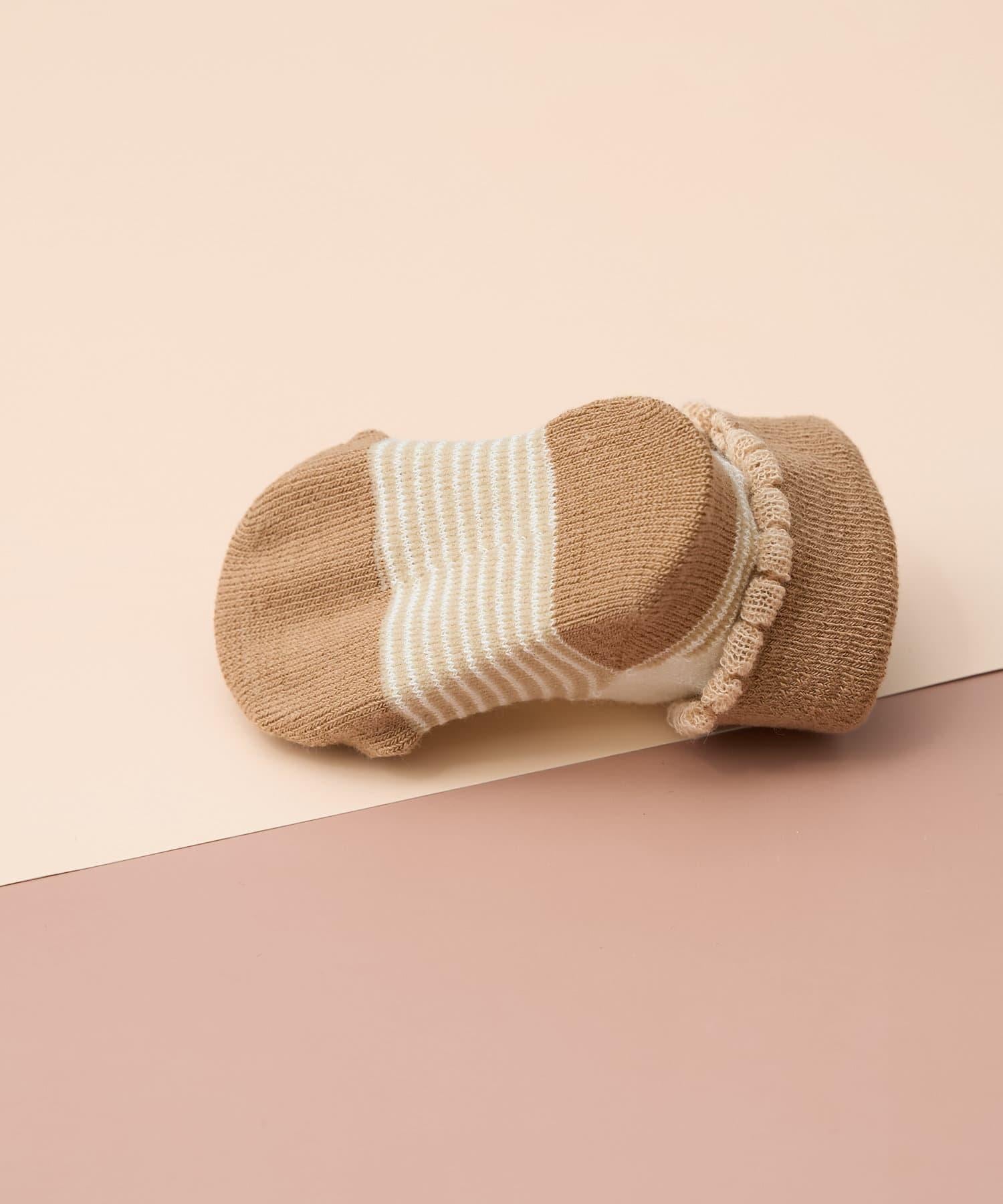 圍嘴上的條紋圖案用絲帶裝飾,花朵圖案用荷葉邊裝飾,增強了寶寶的可愛感。按扣設計方便穿脫。圍兜和襪子可搭配成一套,讓寶寶的裝扮更加可愛。