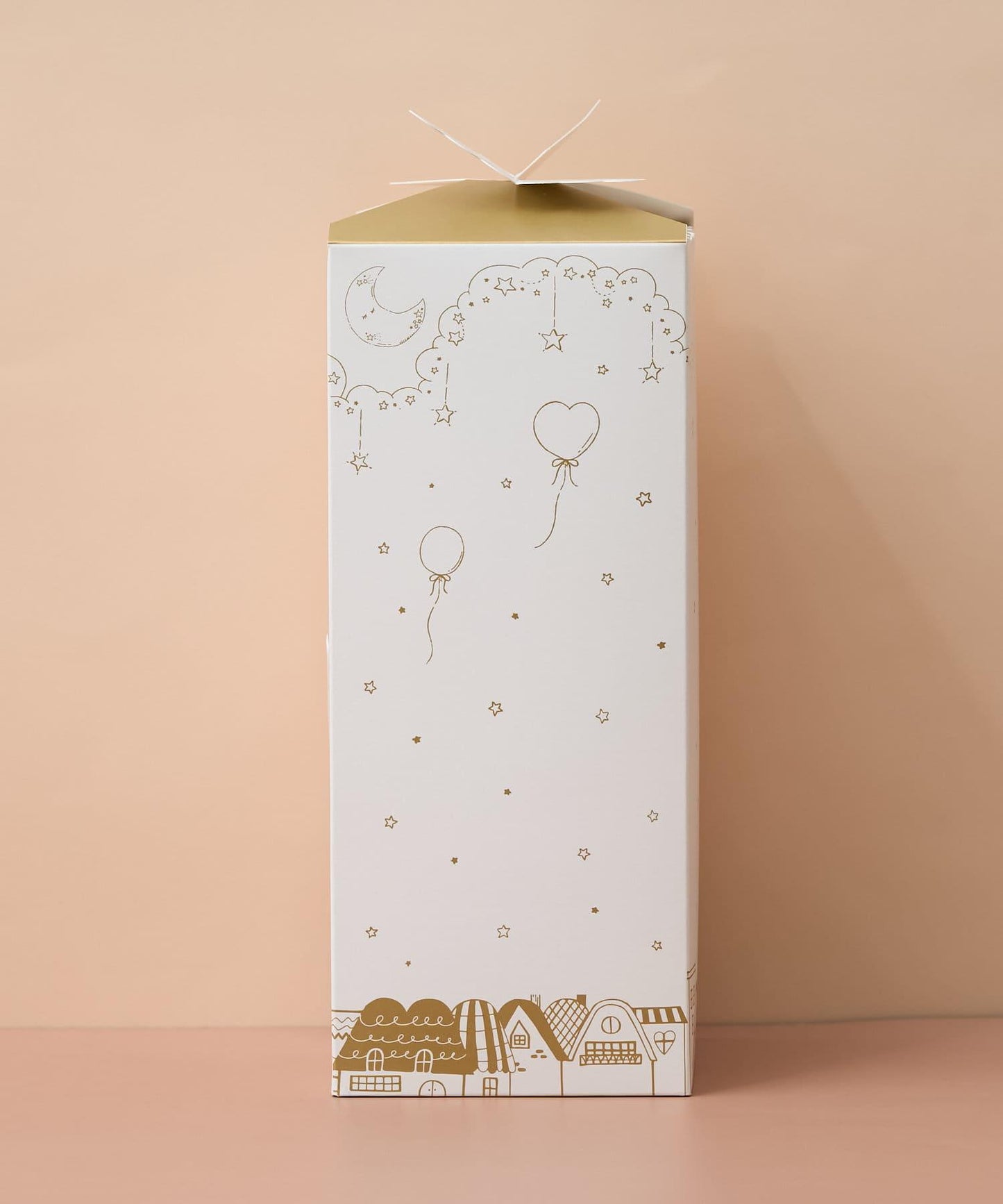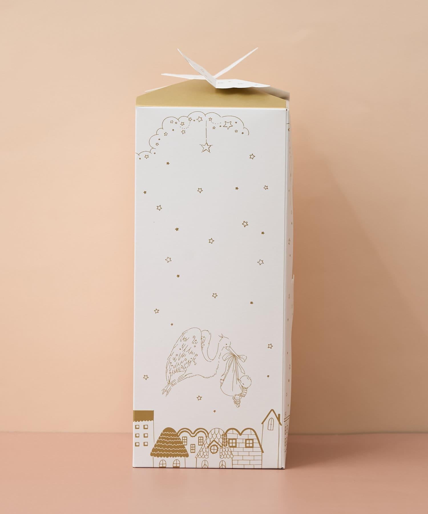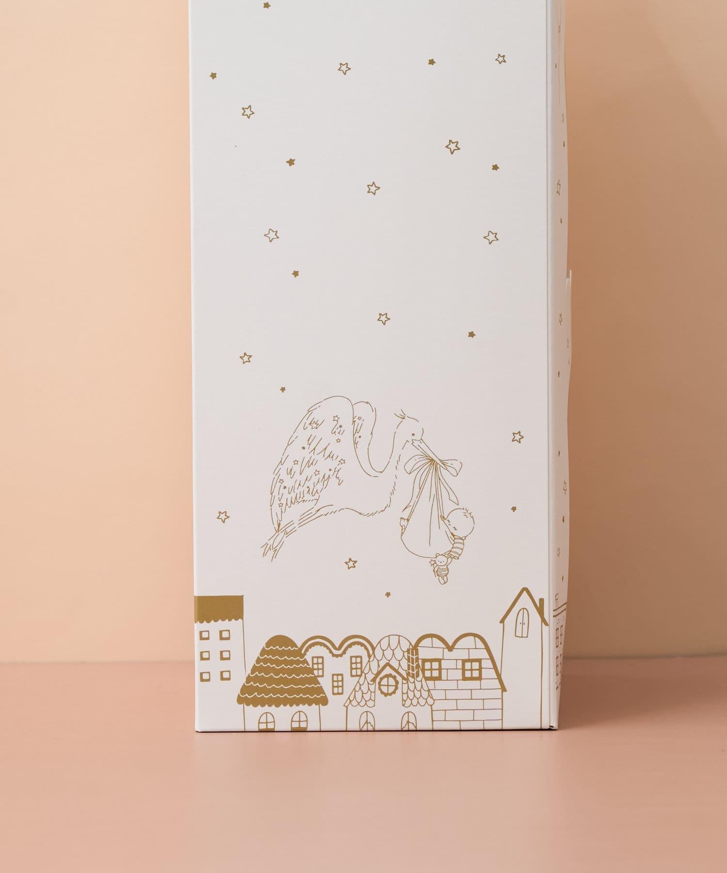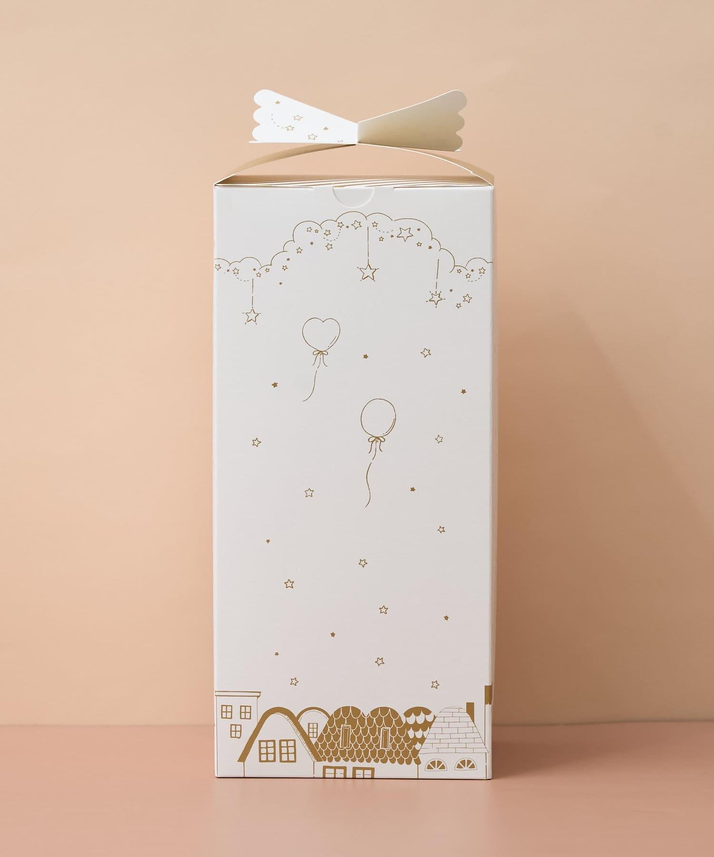 該產品包裝在一個類似蛋糕盒的可愛盒子中,建議作為嬰兒禮物和嬰兒淋浴禮物。