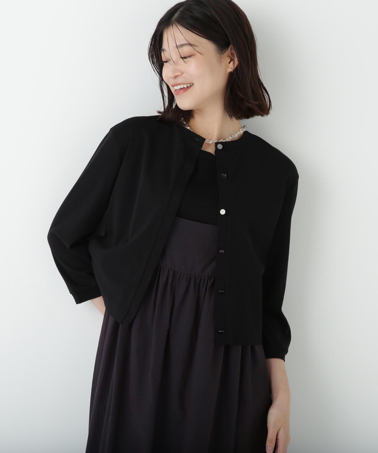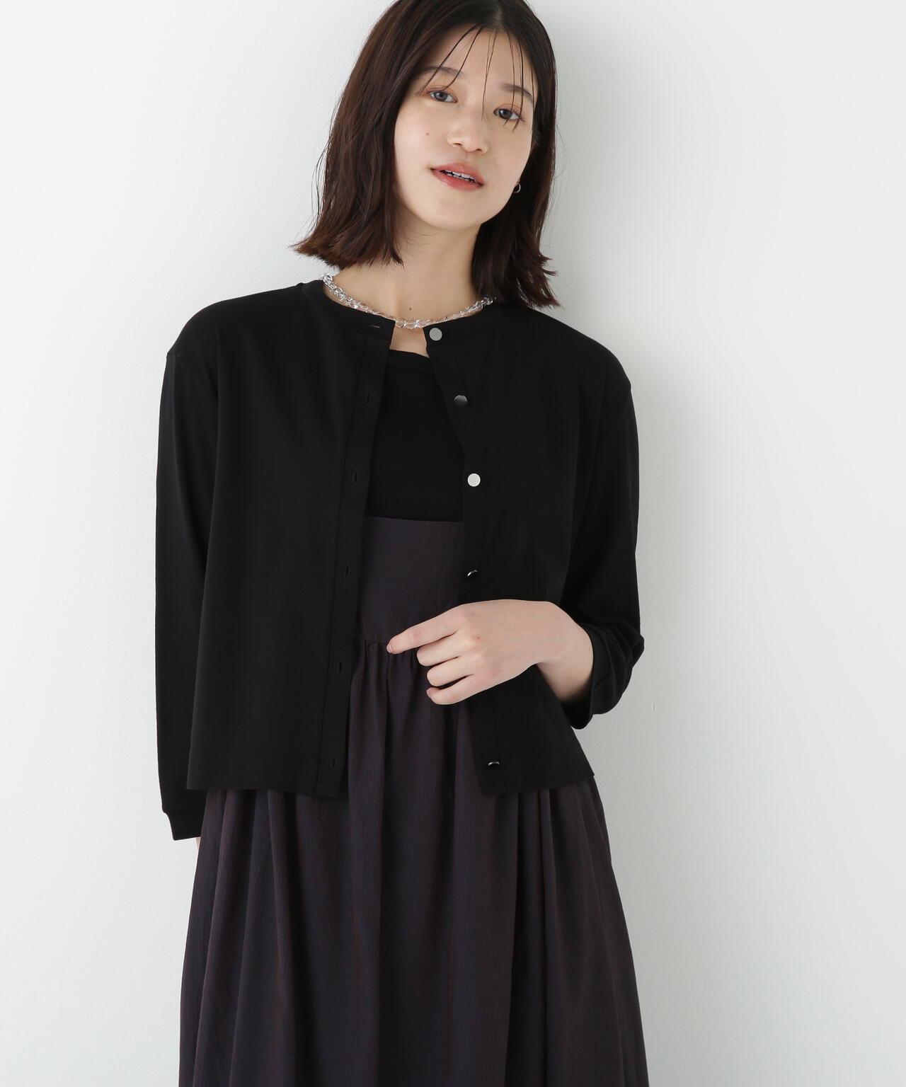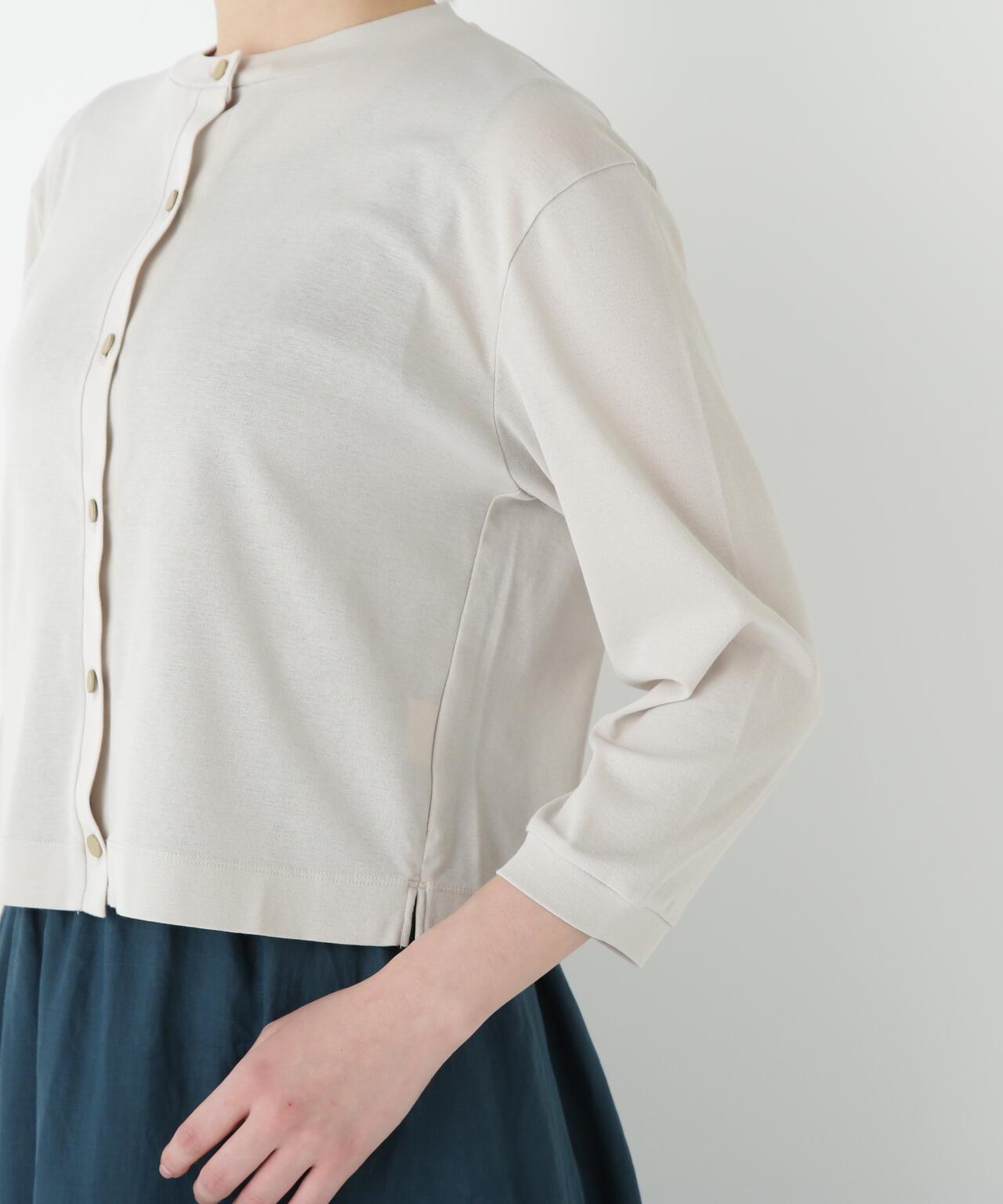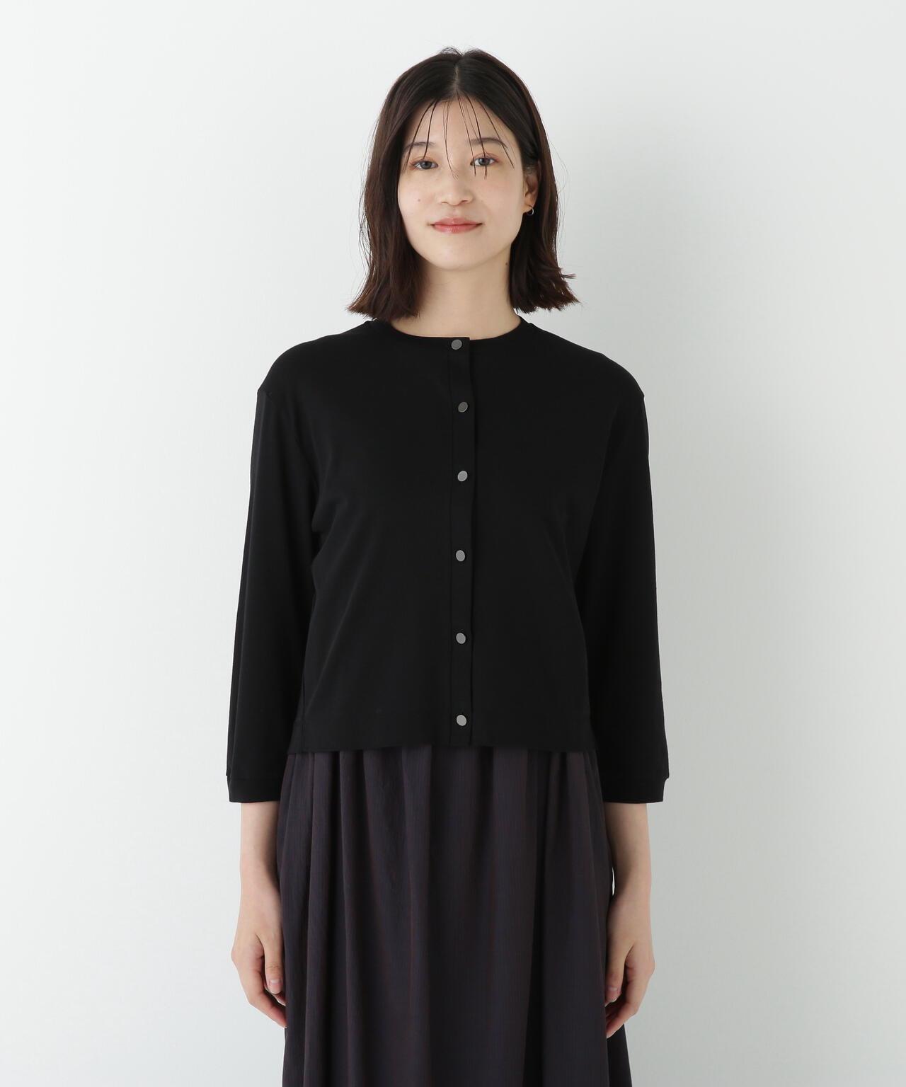 剪裁和縫製簡潔的開衫,適合各種場合 [設計特色] 這款圓領開衫長度較短,7''袖子給人輕盈的印象。金屬裝飾在簡潔的場景中也很實用。面料採用磨毛面料,手感乾爽。面料觸感涼爽,質地輕盈。簡潔的設計適合上班和下班時穿著。扣上紐扣後還可作為套頭衫穿著。此外,還建議將其放在包裡,作為防空調用品。