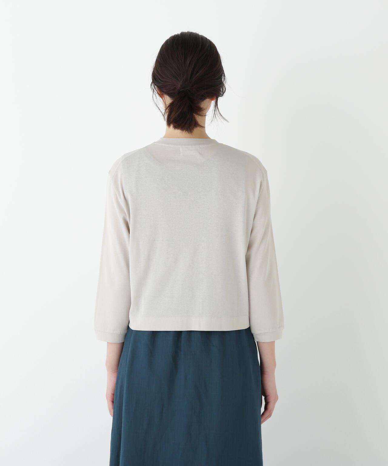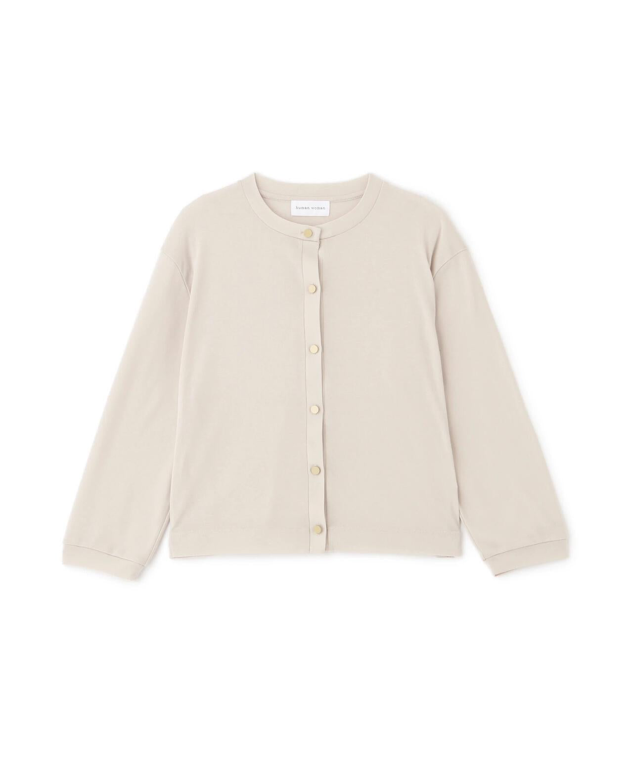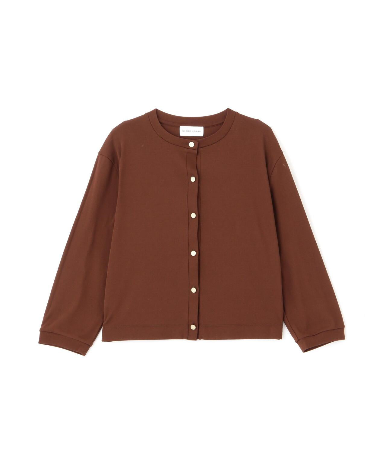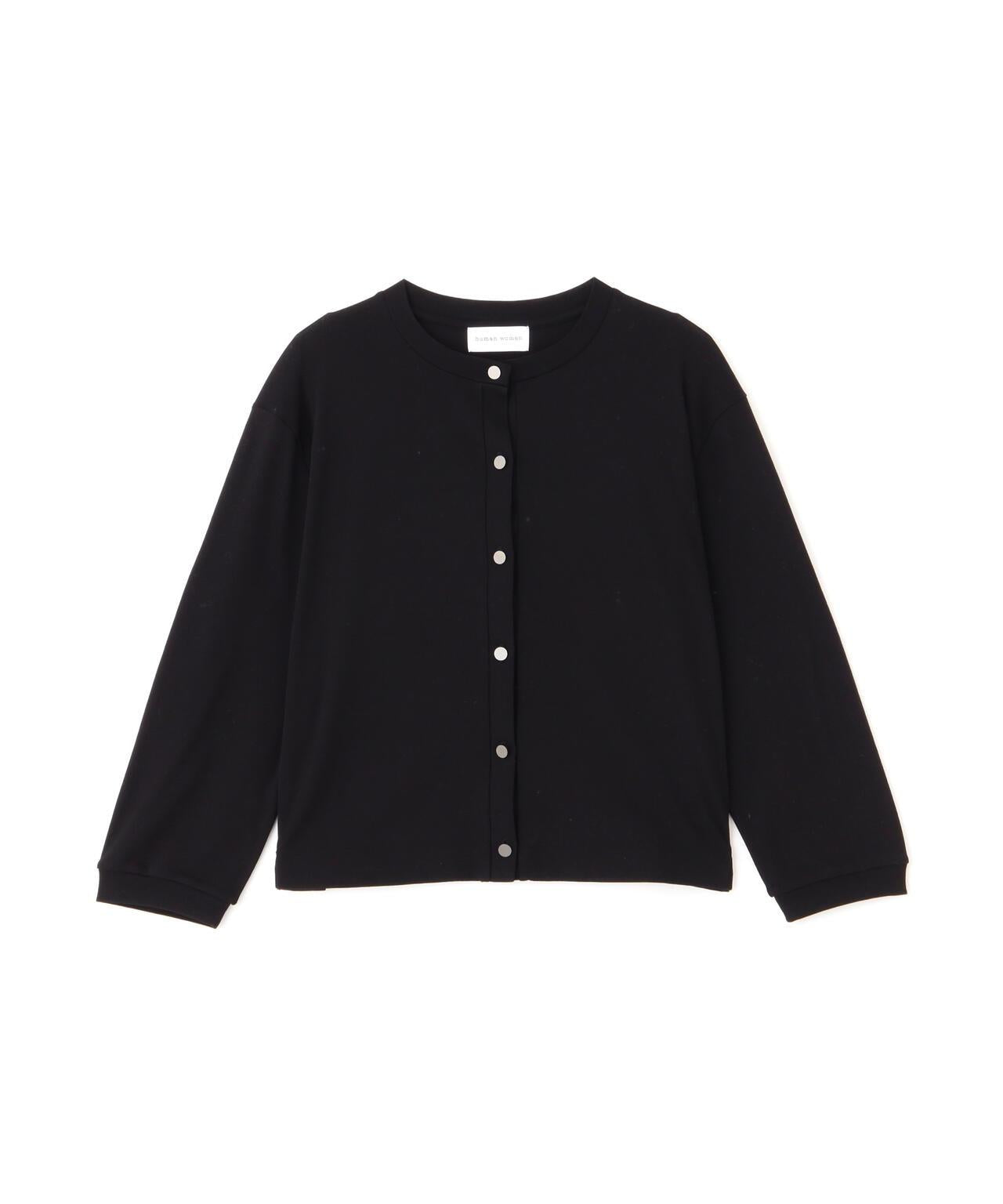 剪裁和縫製簡潔的開衫,適合各種場合 [設計特色] 這款圓領開衫長度較短,7''袖子給人輕盈的印象。金屬裝飾在簡潔的場景中也很實用。面料採用磨毛面料,手感乾爽。面料觸感涼爽,質地輕盈。簡潔的設計適合上班和下班時穿著。扣上紐扣後還可作為套頭衫穿著。此外,還建議將其放在包裡,作為防空調用品。