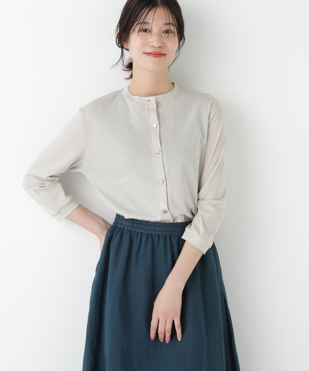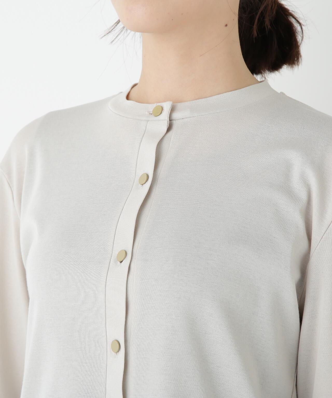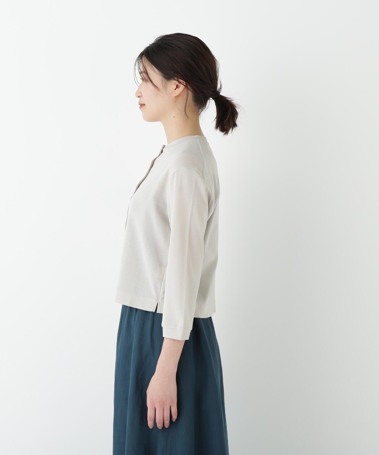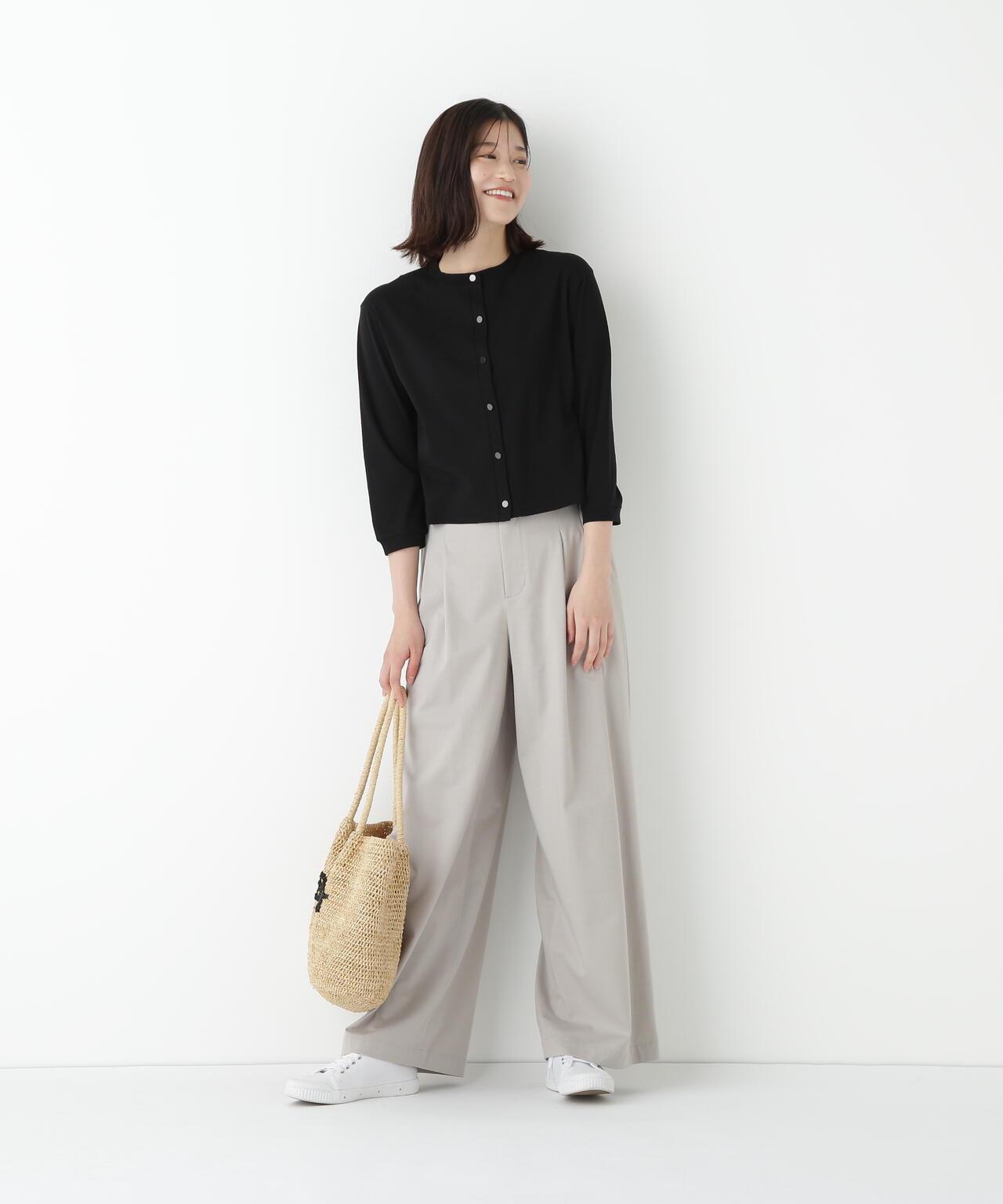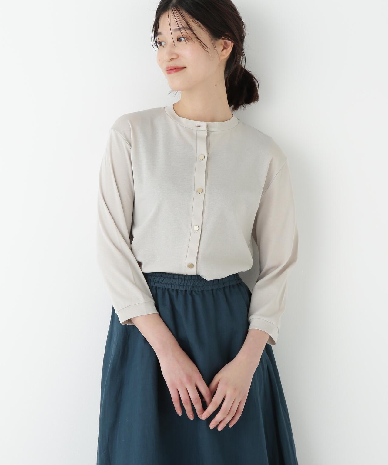 剪裁和縫製簡潔的開衫,適合各種場合 [設計特色] 這款圓領開衫長度較短,7''袖子給人輕盈的印象。金屬裝飾在簡潔的場景中也很實用。面料採用磨毛面料,手感乾爽。面料觸感涼爽,質地輕盈。簡潔的設計適合上班和下班時穿著。扣上紐扣後還可作為套頭衫穿著。此外,還建議將其放在包裡,作為防空調用品。