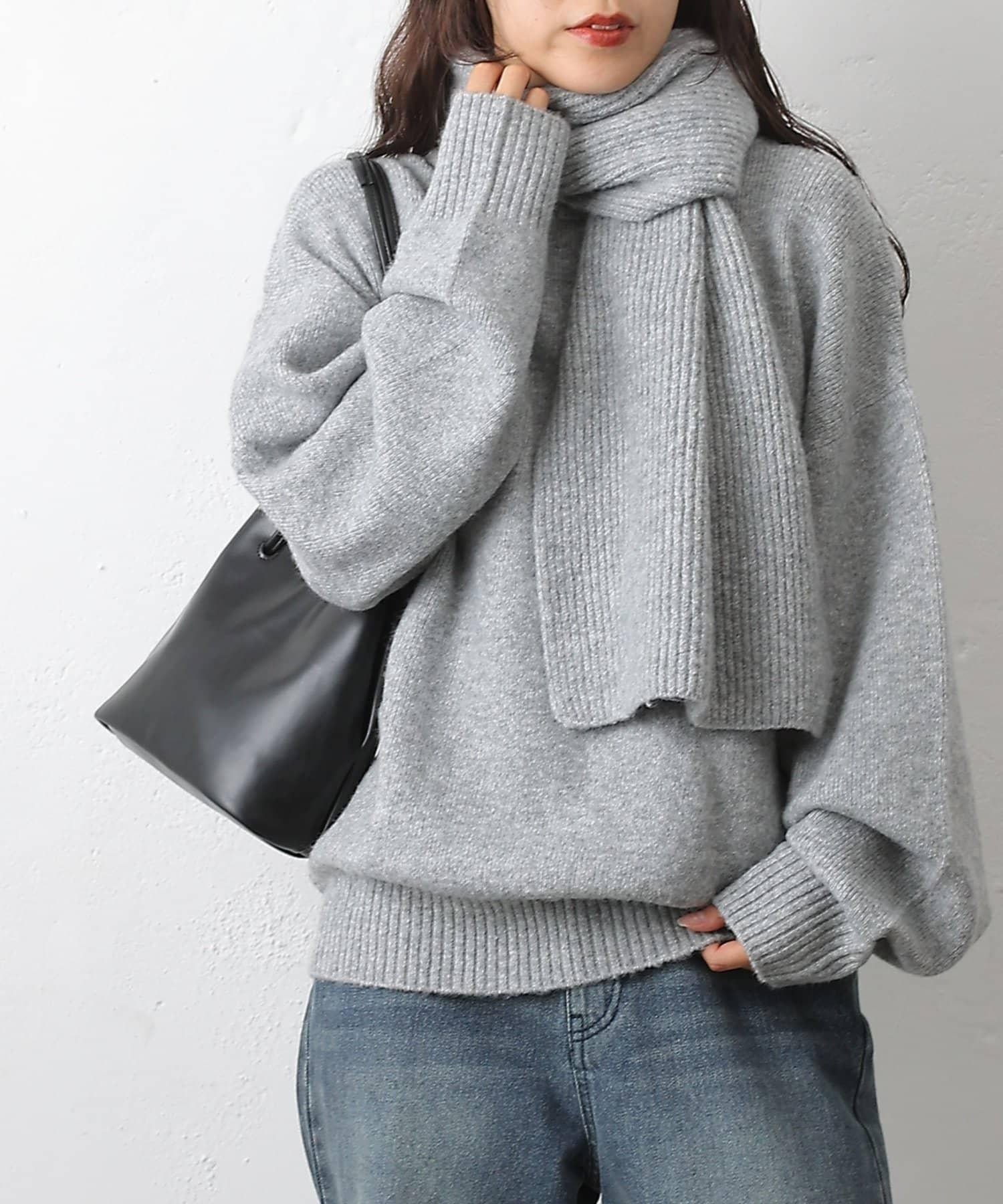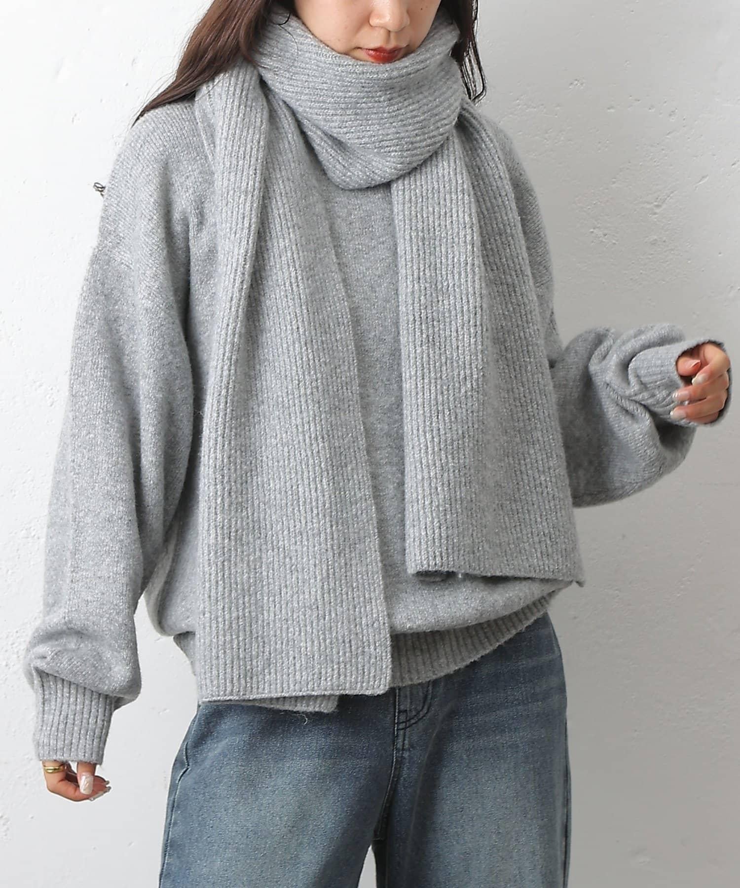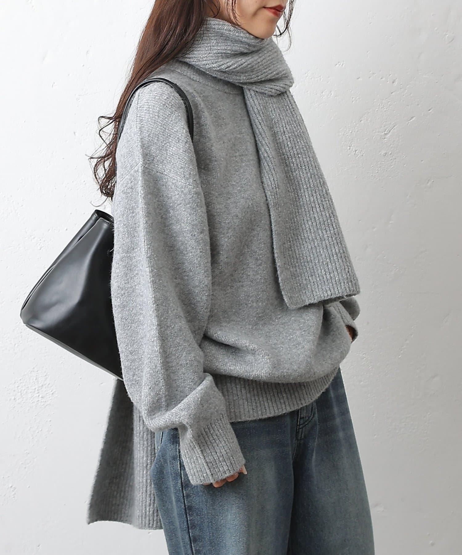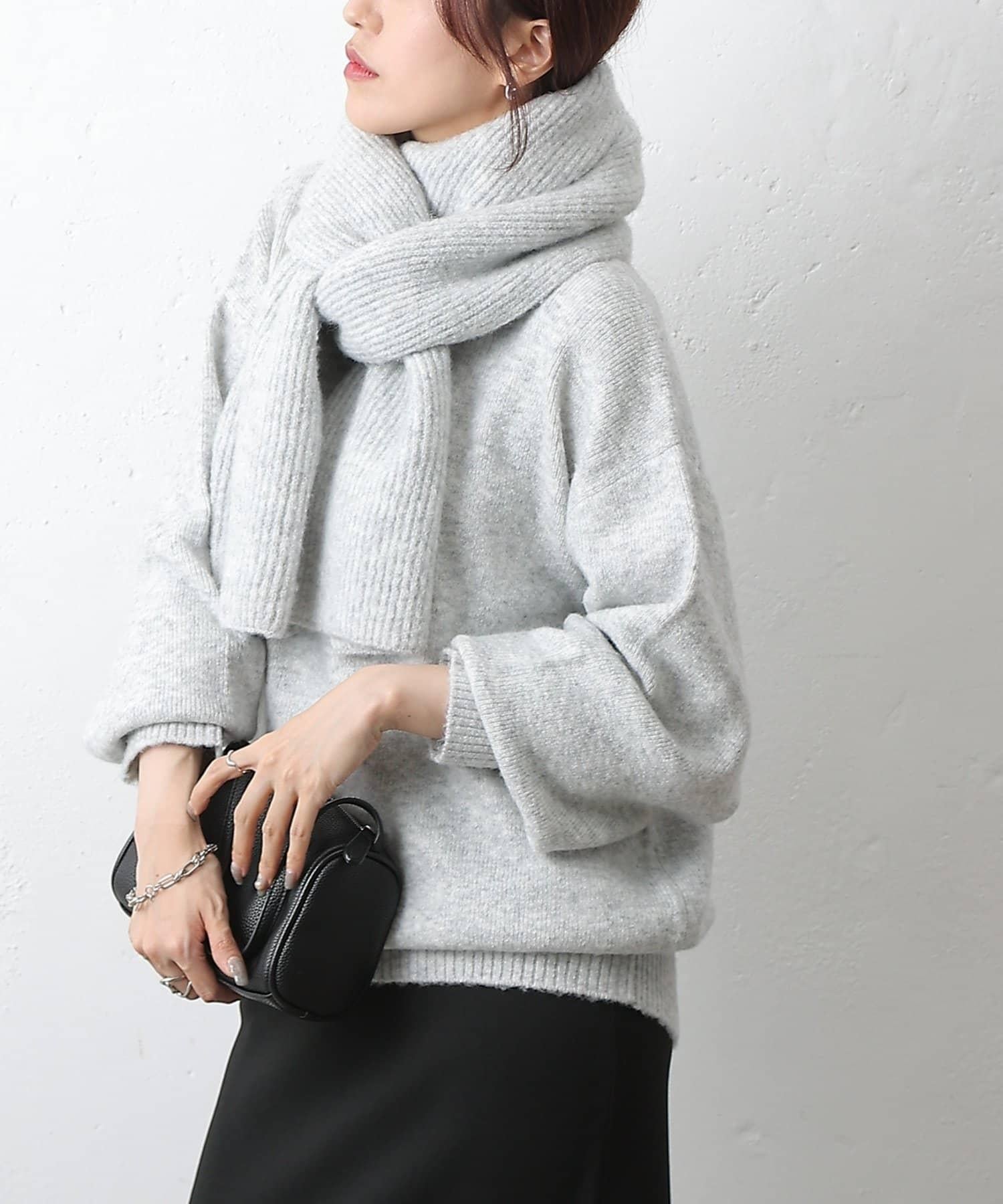 該套裝包括一件圓領針織衫和一條同色圍巾。