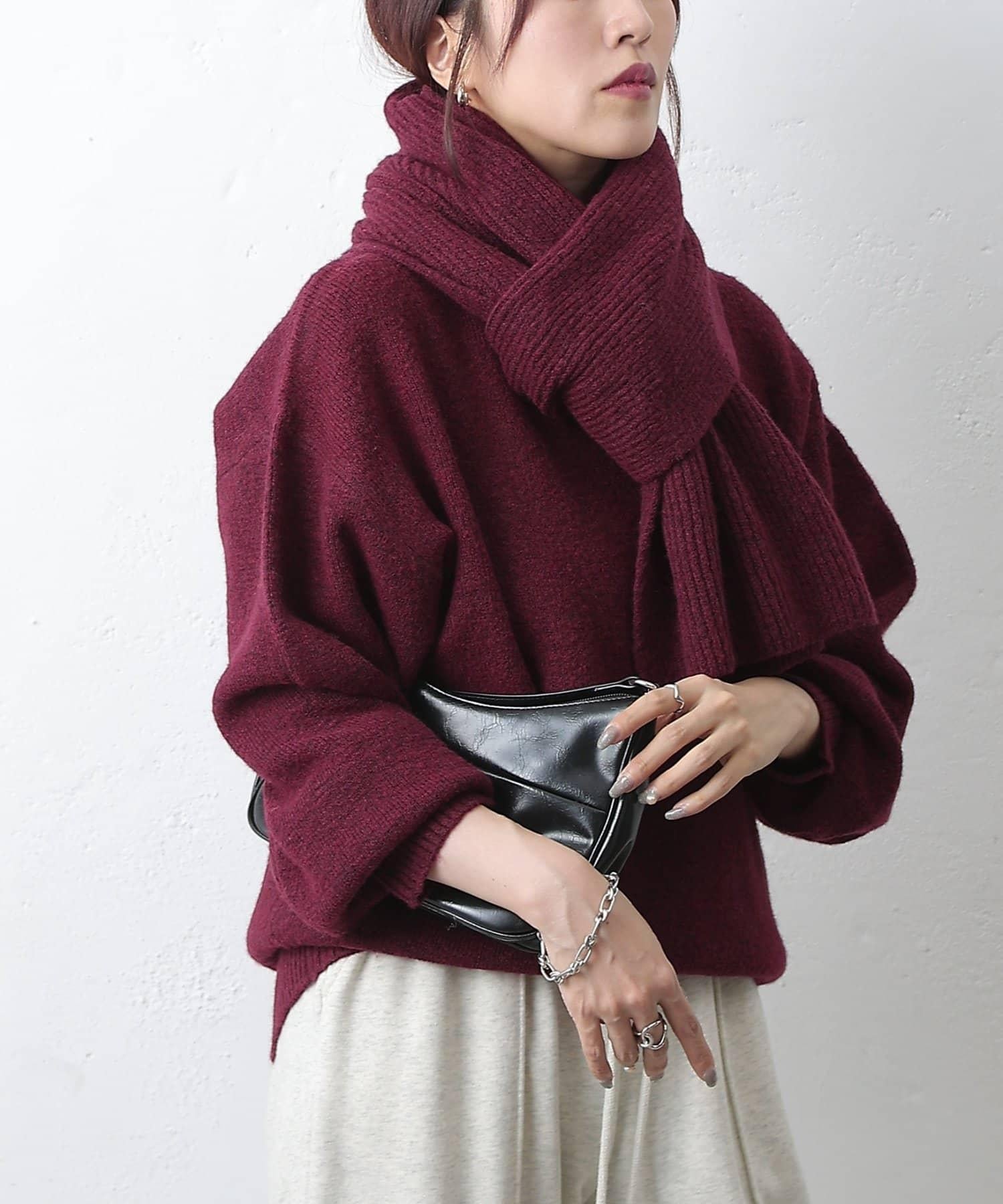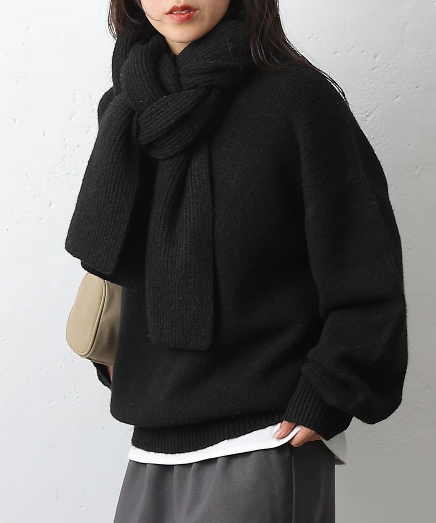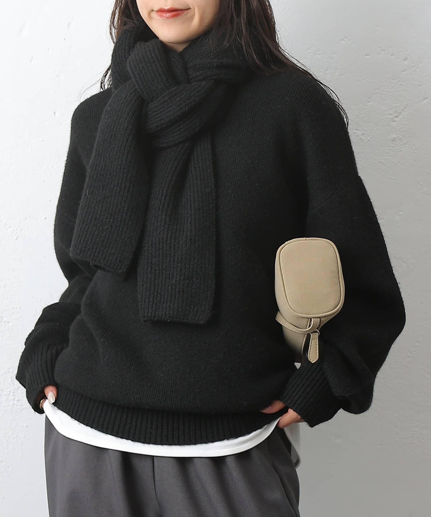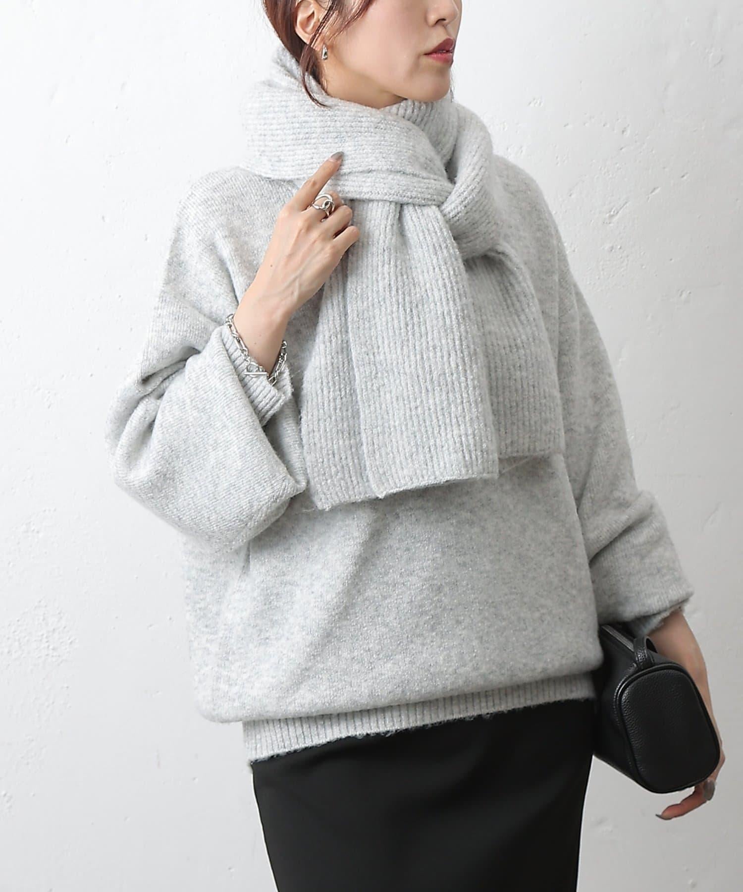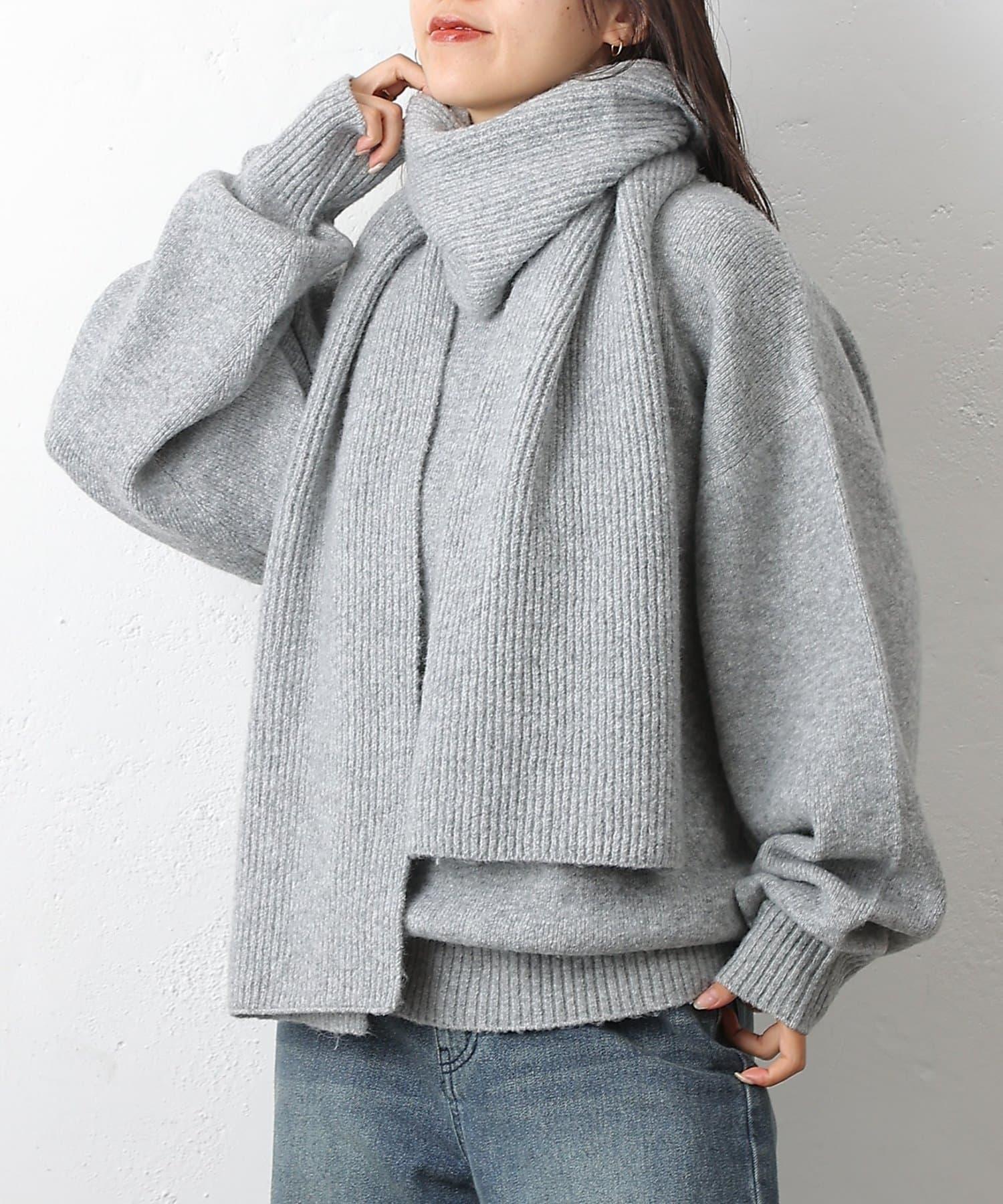 該套裝包括一件圓領針織衫和一條同色圍巾。