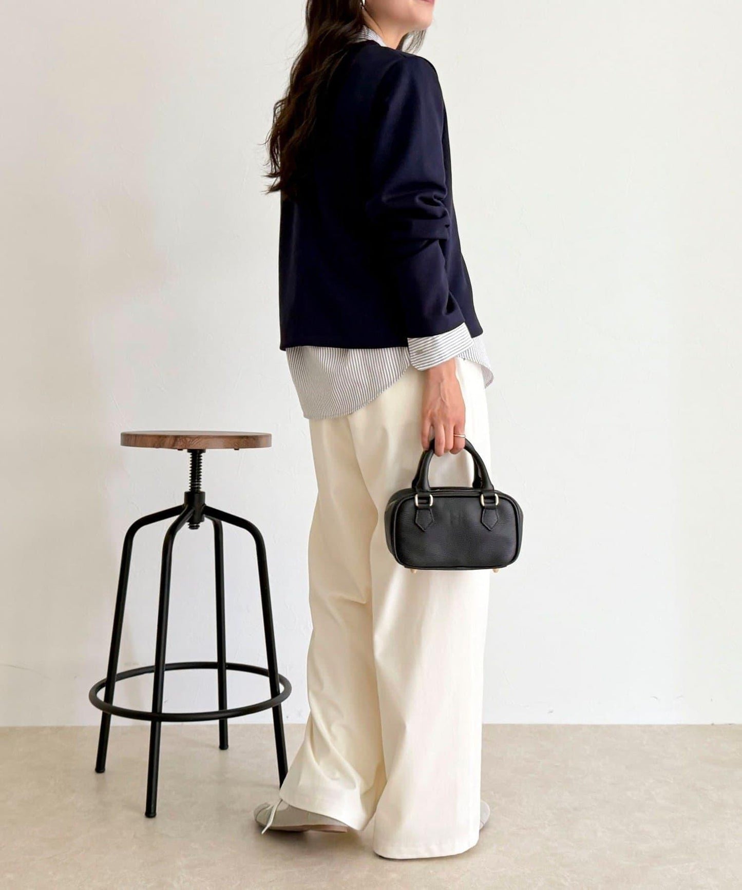 身高 156cm 的工作人員(穿 38 號):長度約在腰部,易於與褲子和裙子搭配。