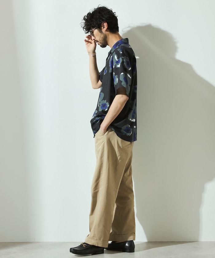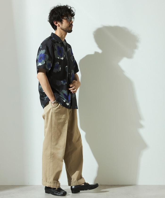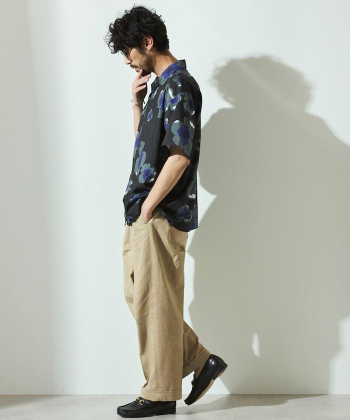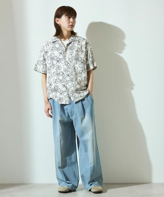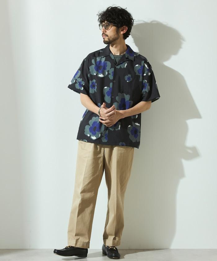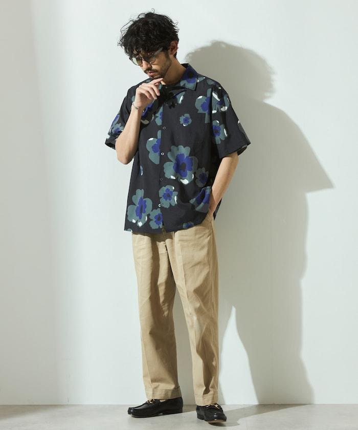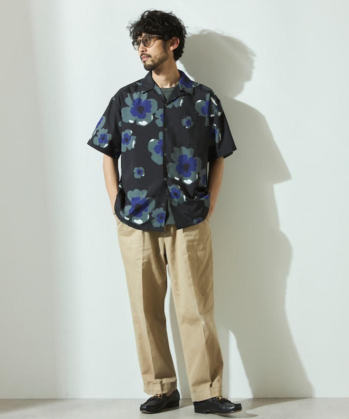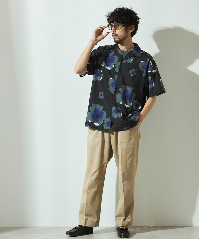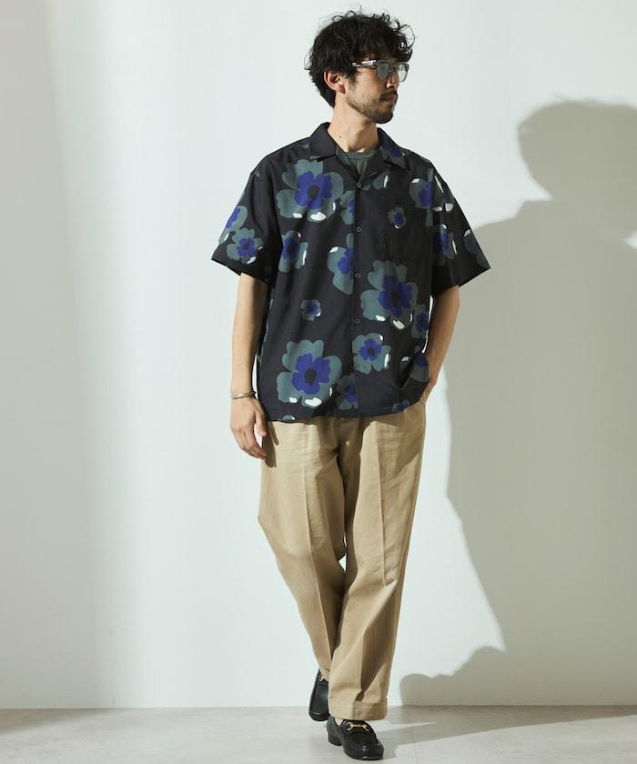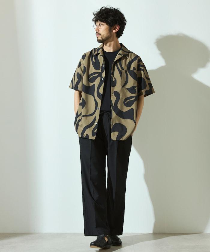 由於它是一款基本廓形的開領襯衫,因此是一款百搭性很強的單品,很容易與現有的下裝搭配。由於採用全圖案設計,只需搭配牛仔褲或寬鬆長褲即可完成造型。當然,這款單品也可以收口穿著,但作為梭織服裝也很實用,很容易搭配出協調的造型。此外,還建議搭配相同花紋的短褲,營造出套裝風格。