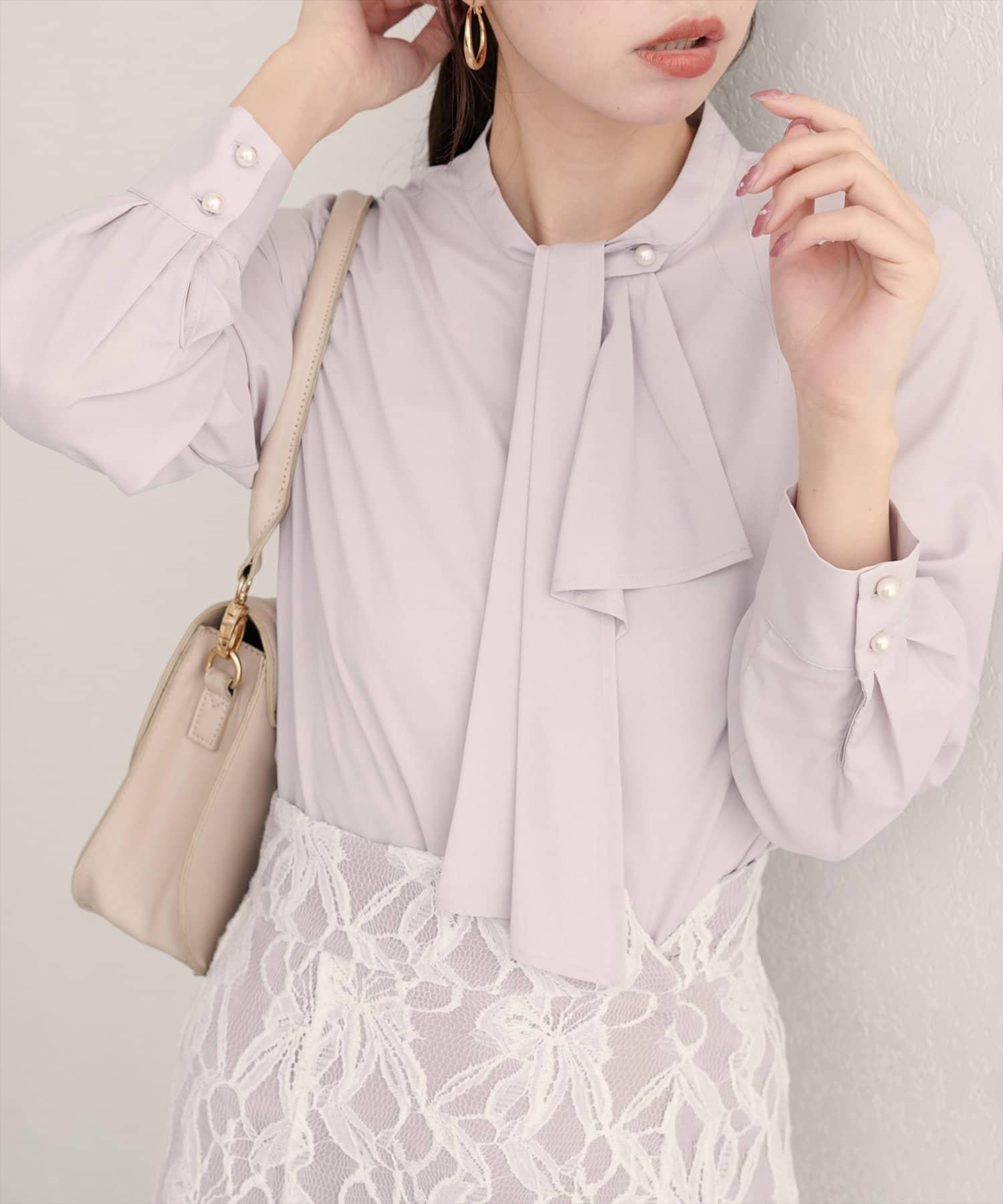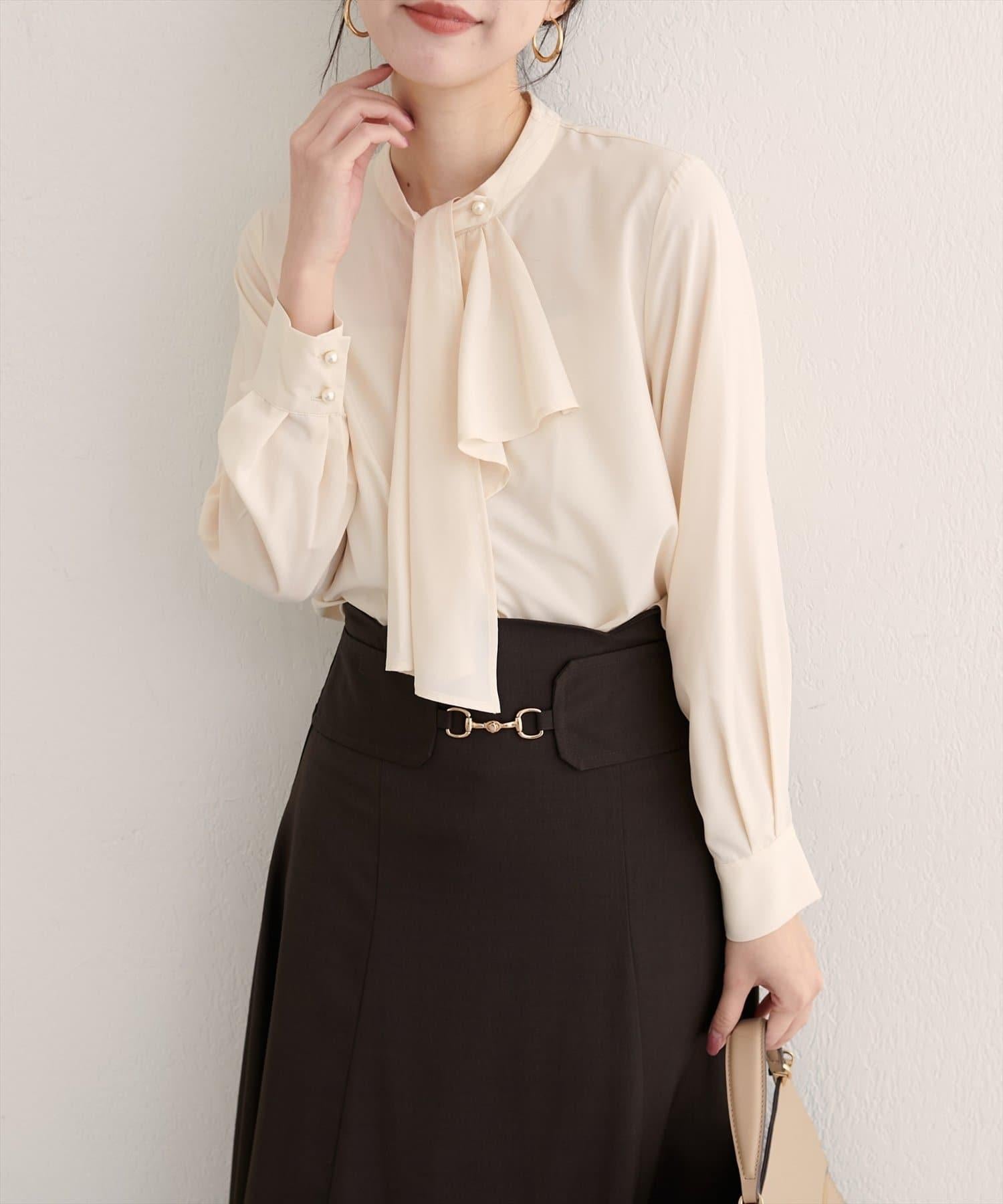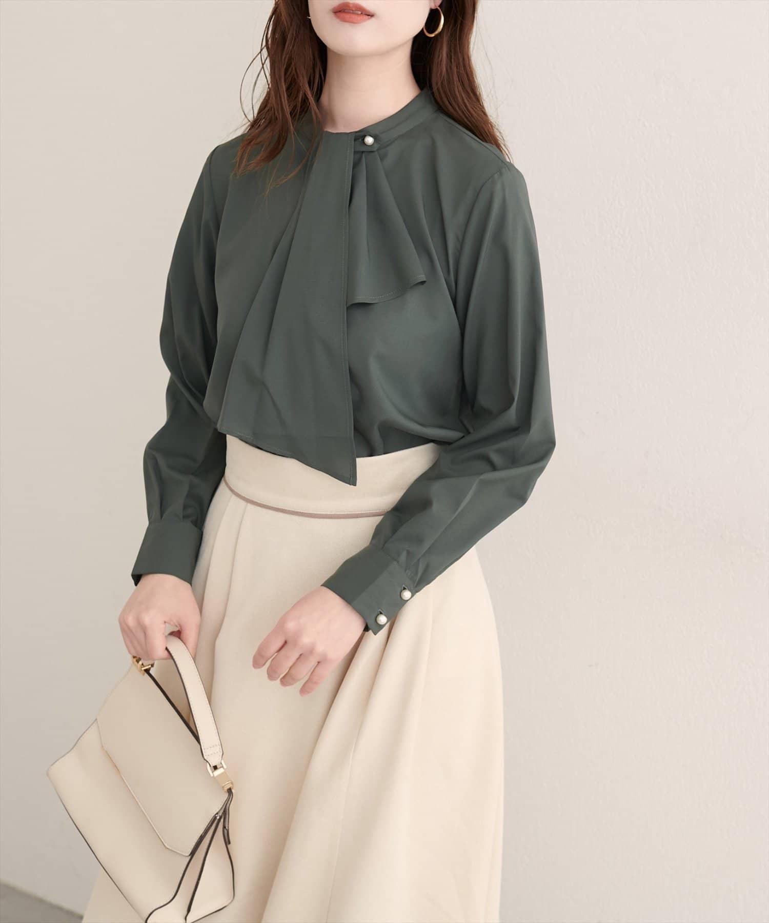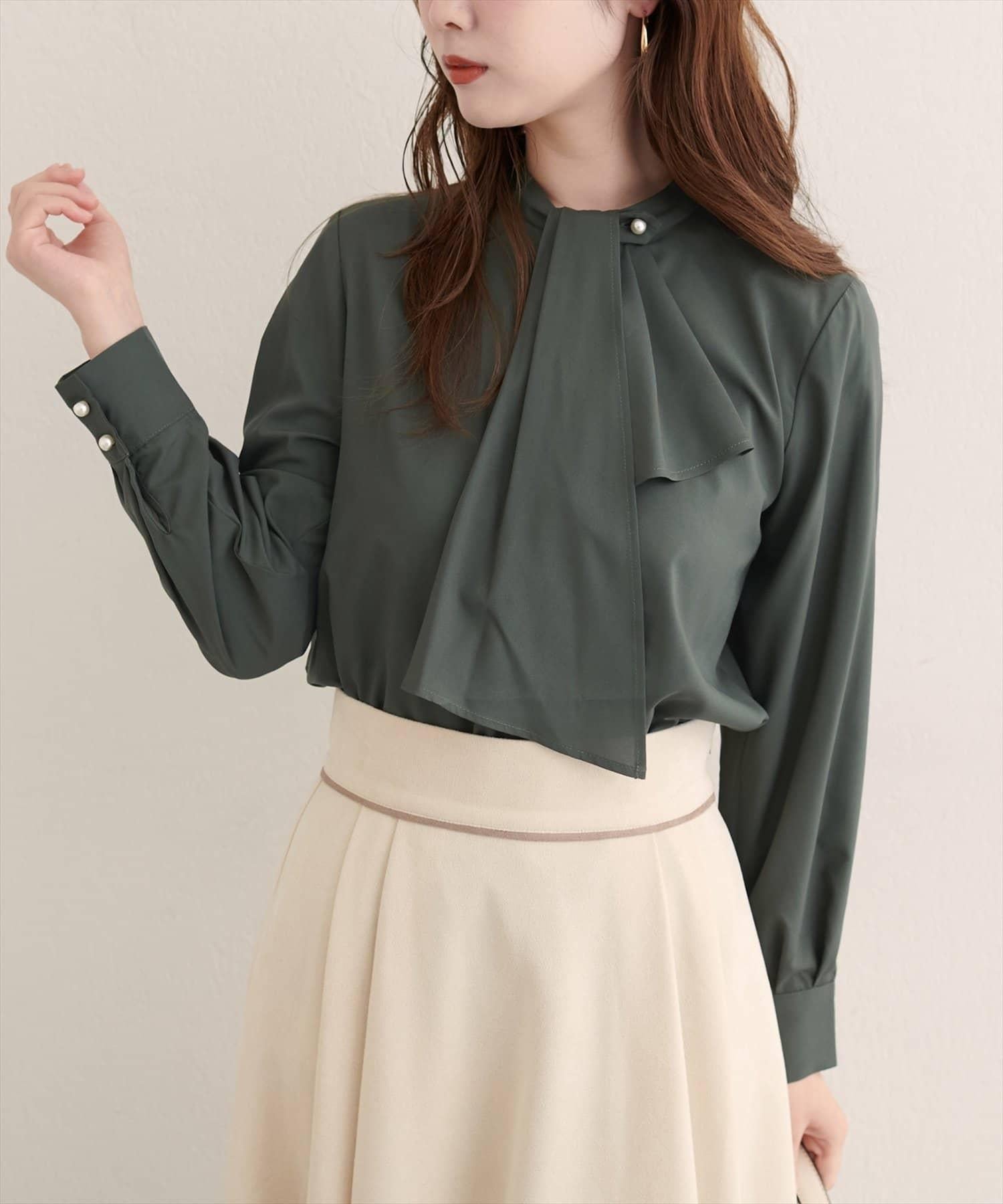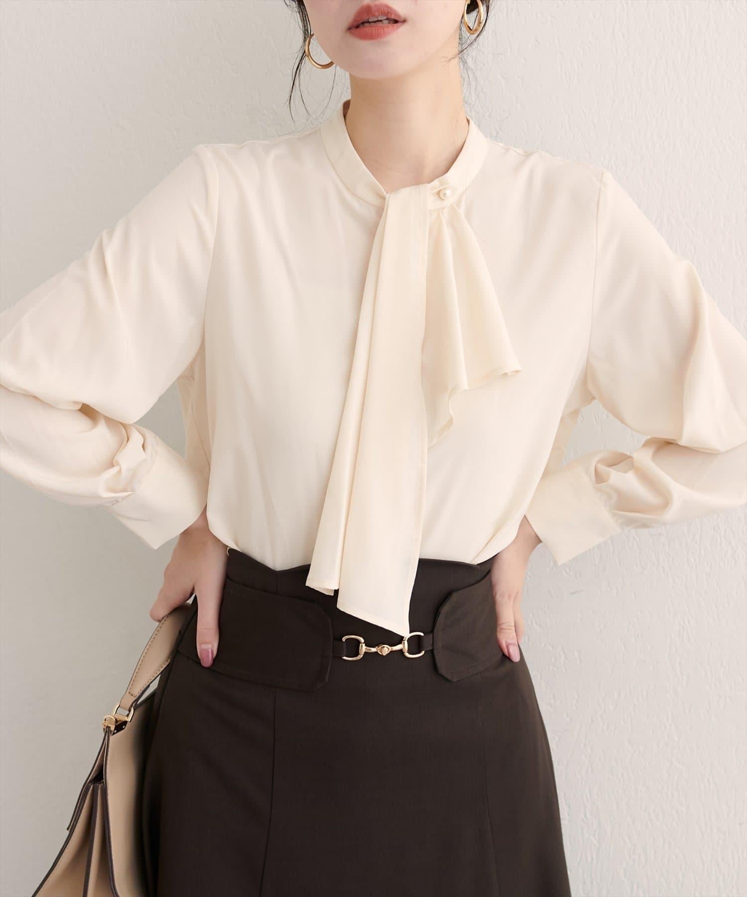 這款優雅的上衣採用垂墜式圍巾繫帶設計。